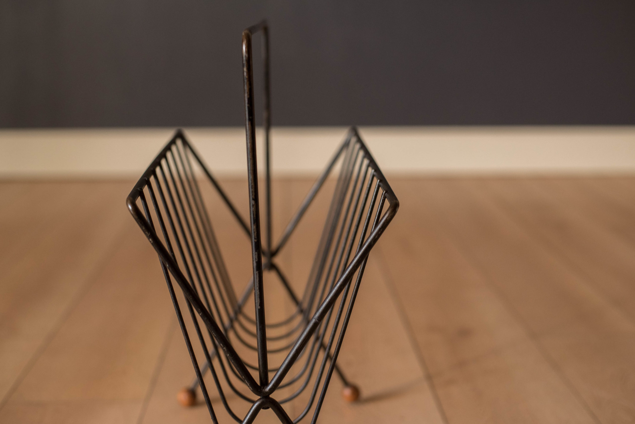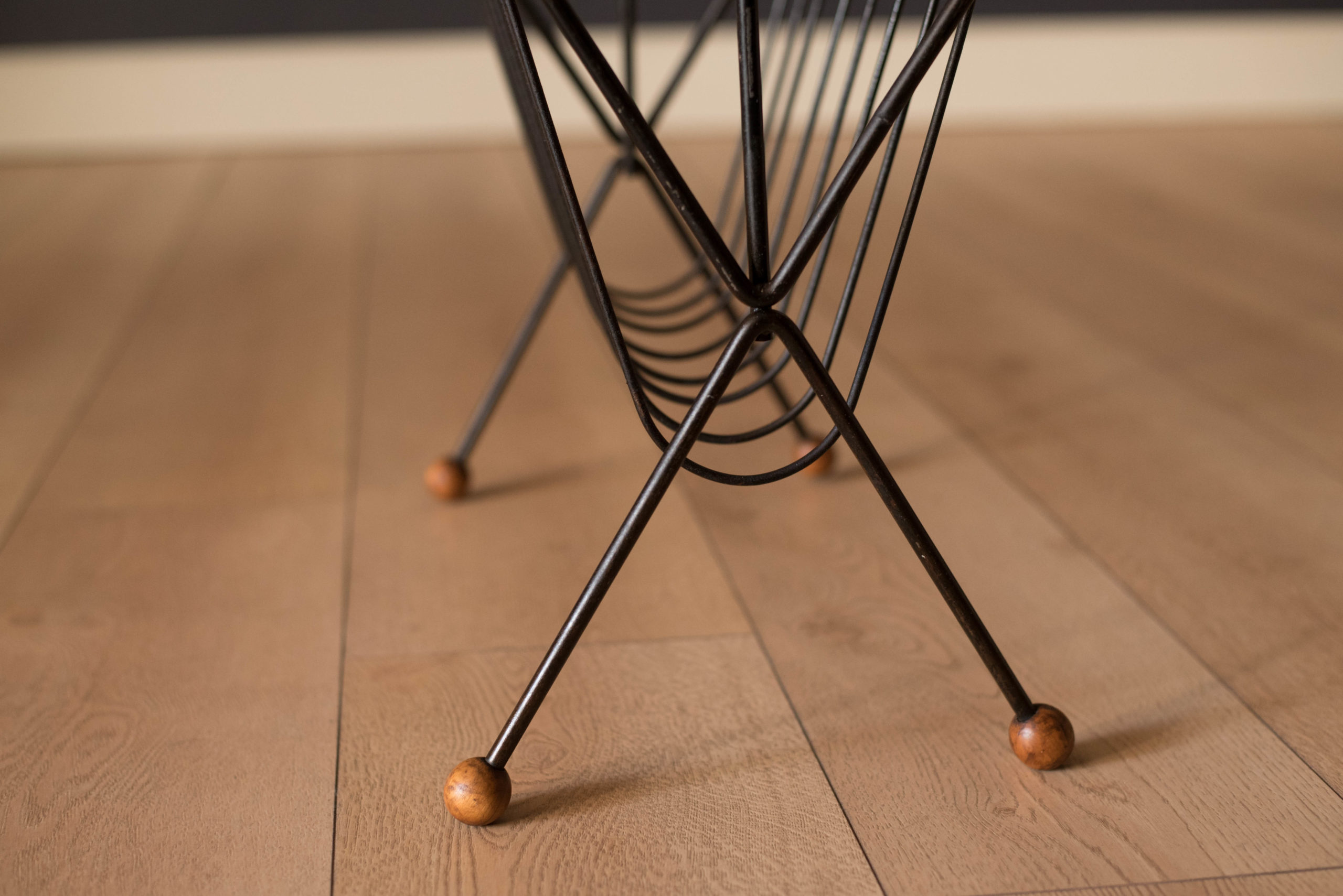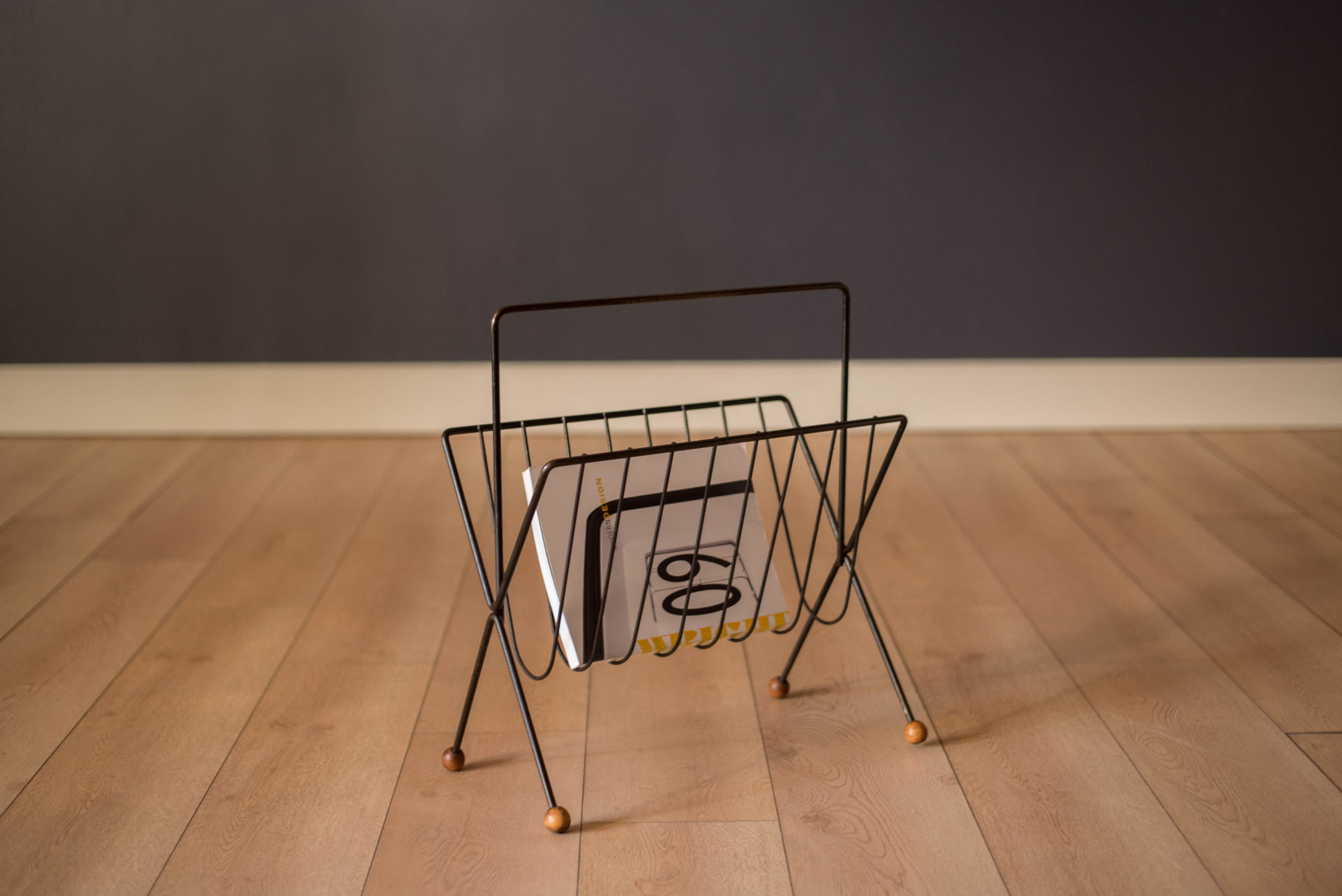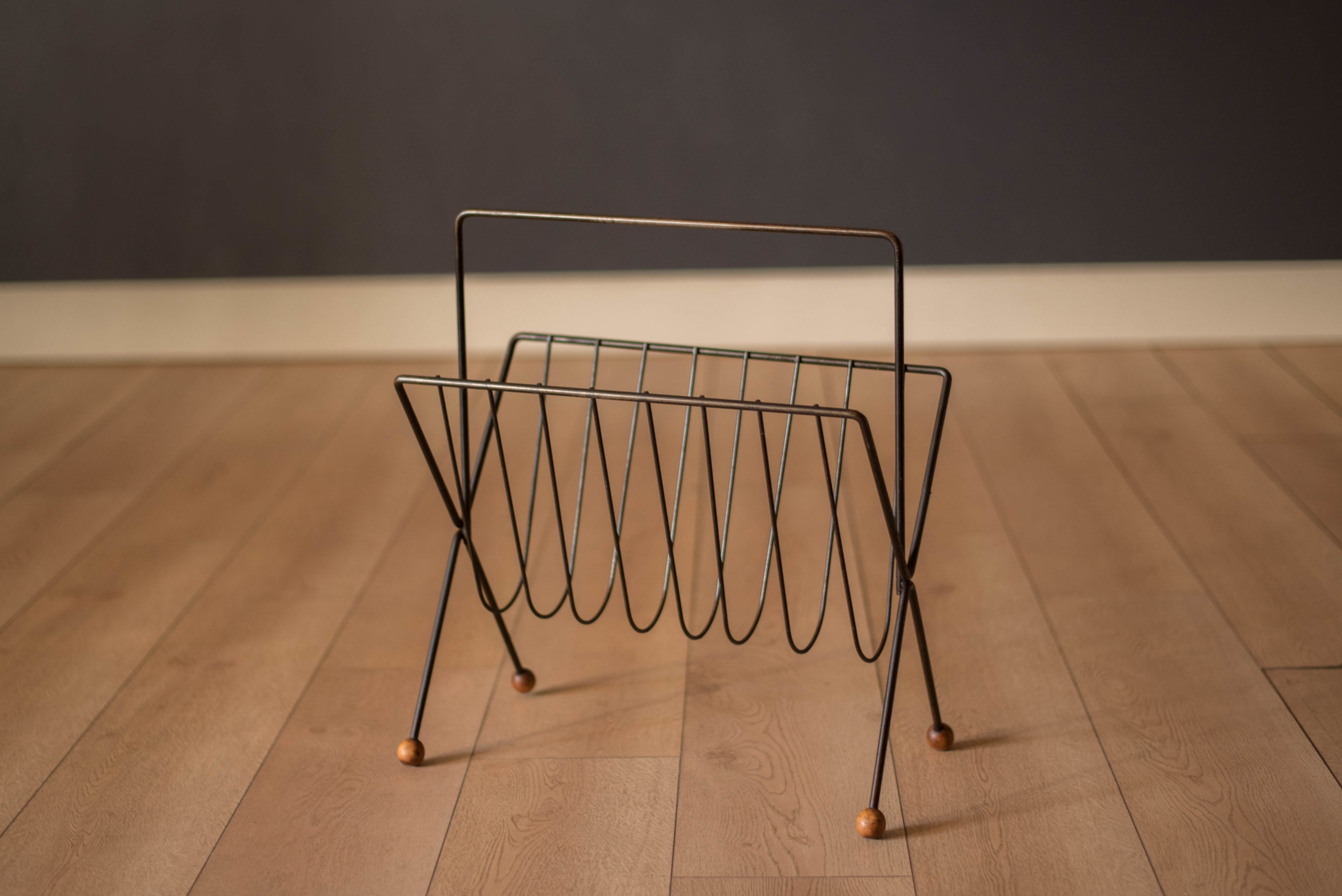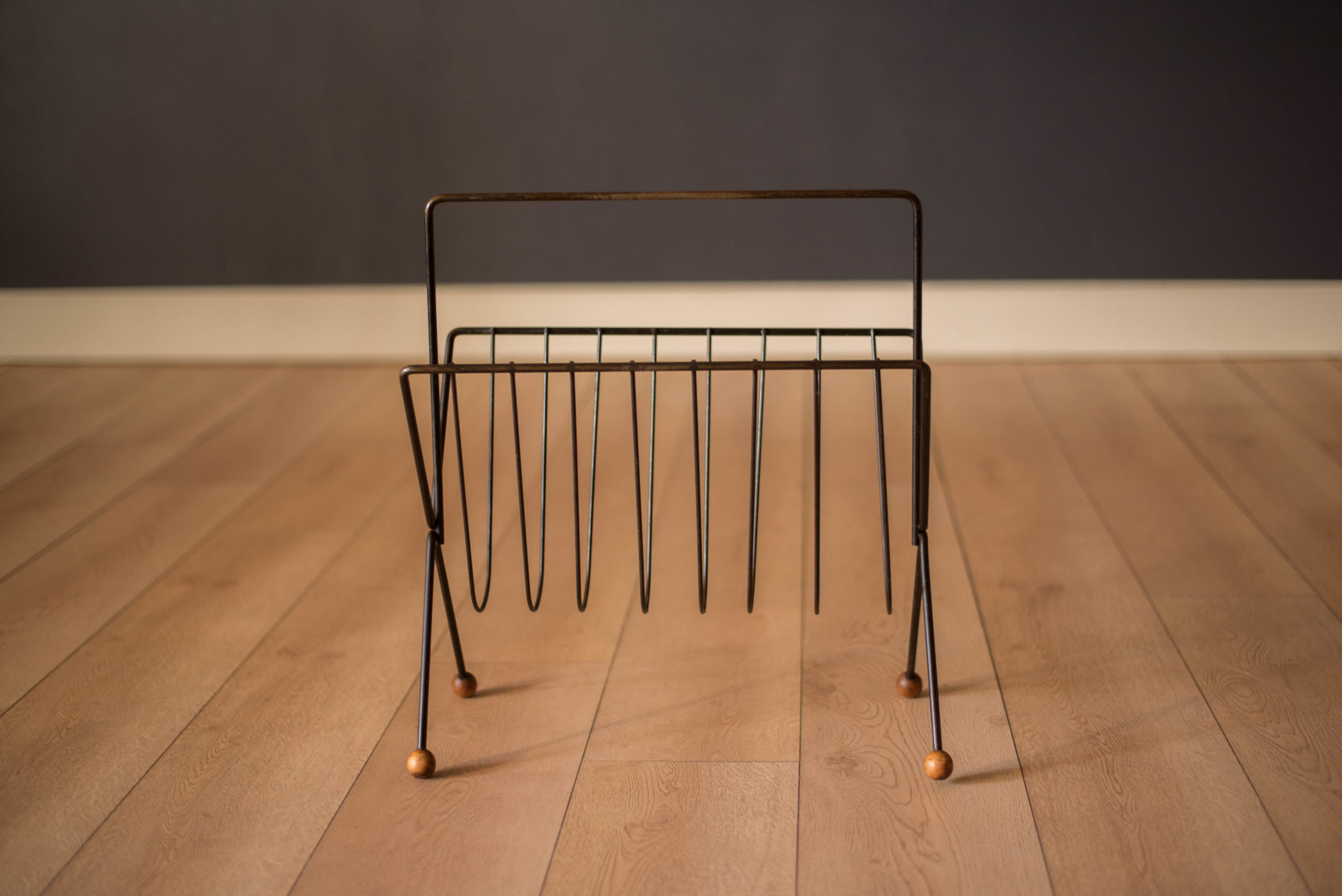 Vintage magazine rack stand designed by Tony Paul circa 1950’s. This unique home decor piece is made of bent iron and is accessorized with protective wooden ball feet.