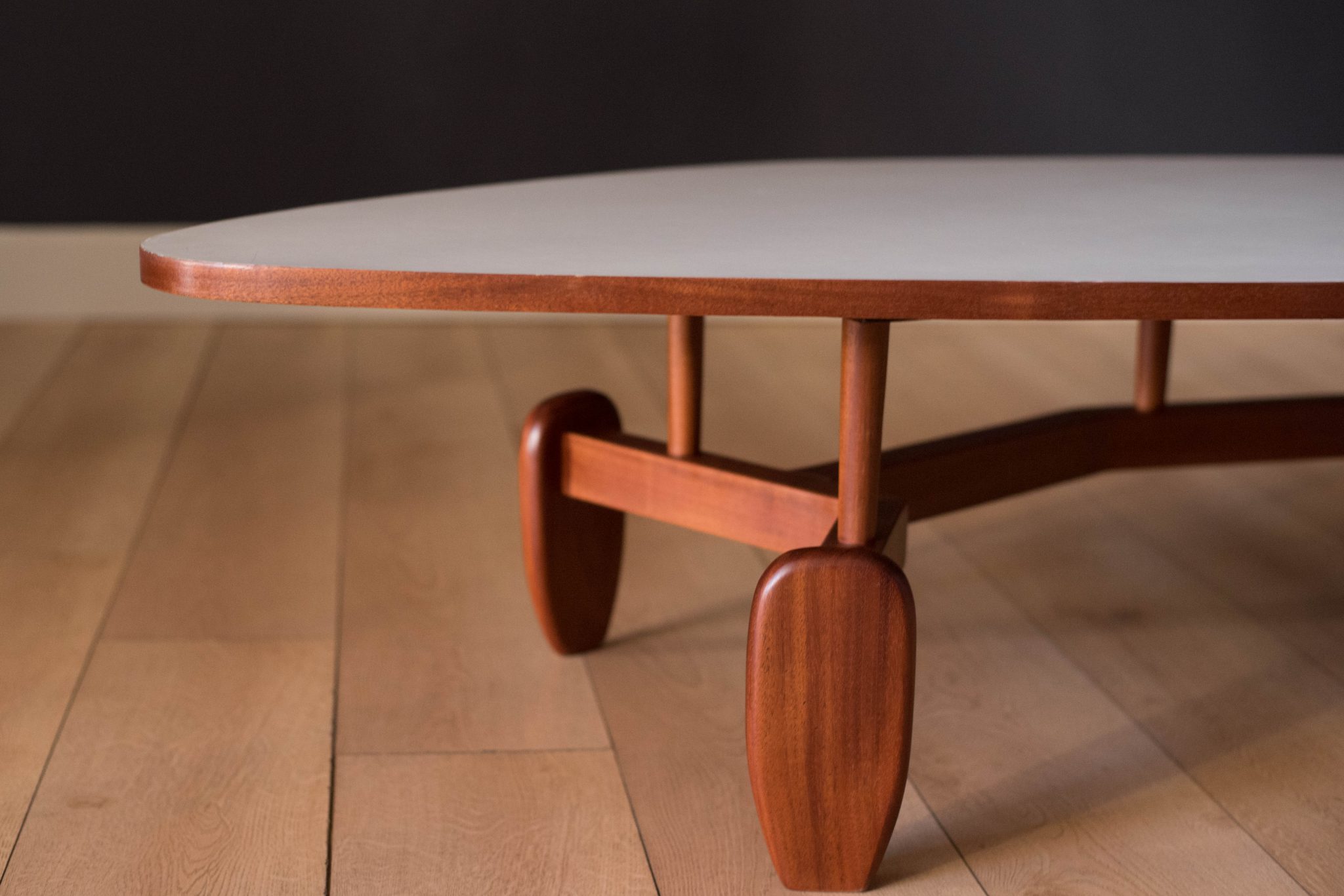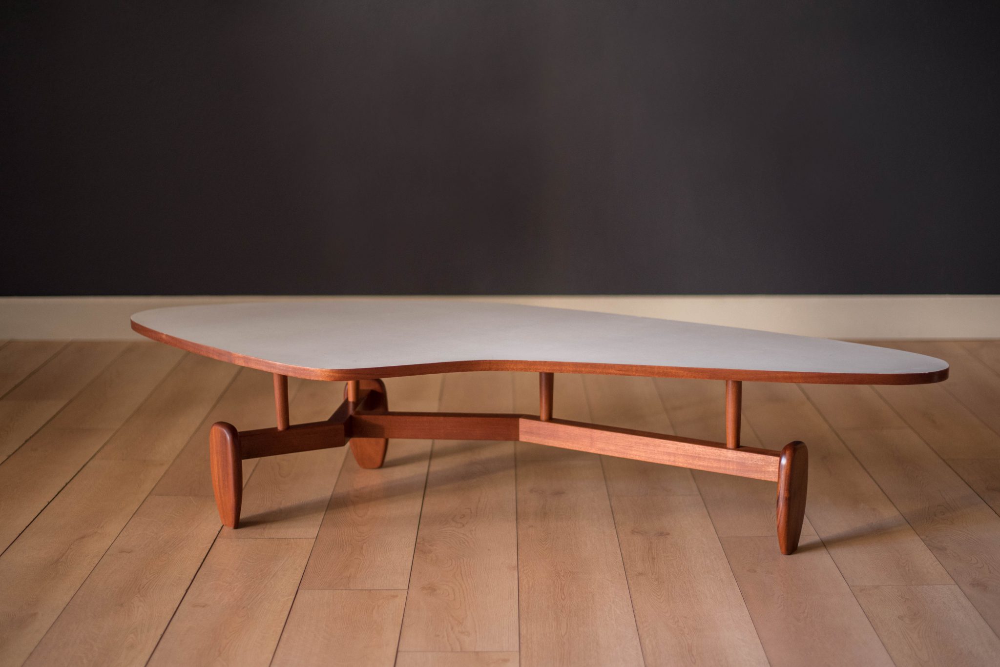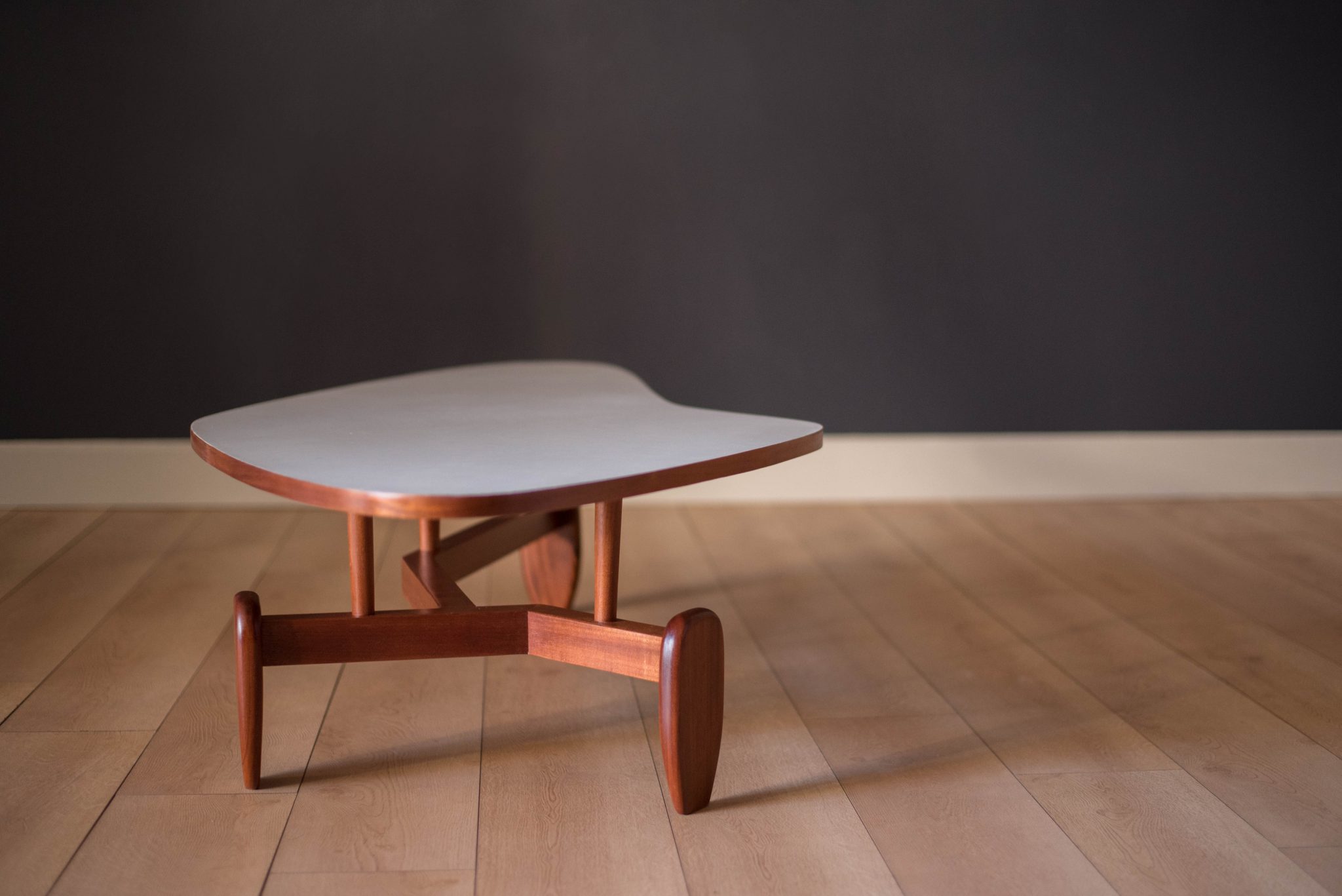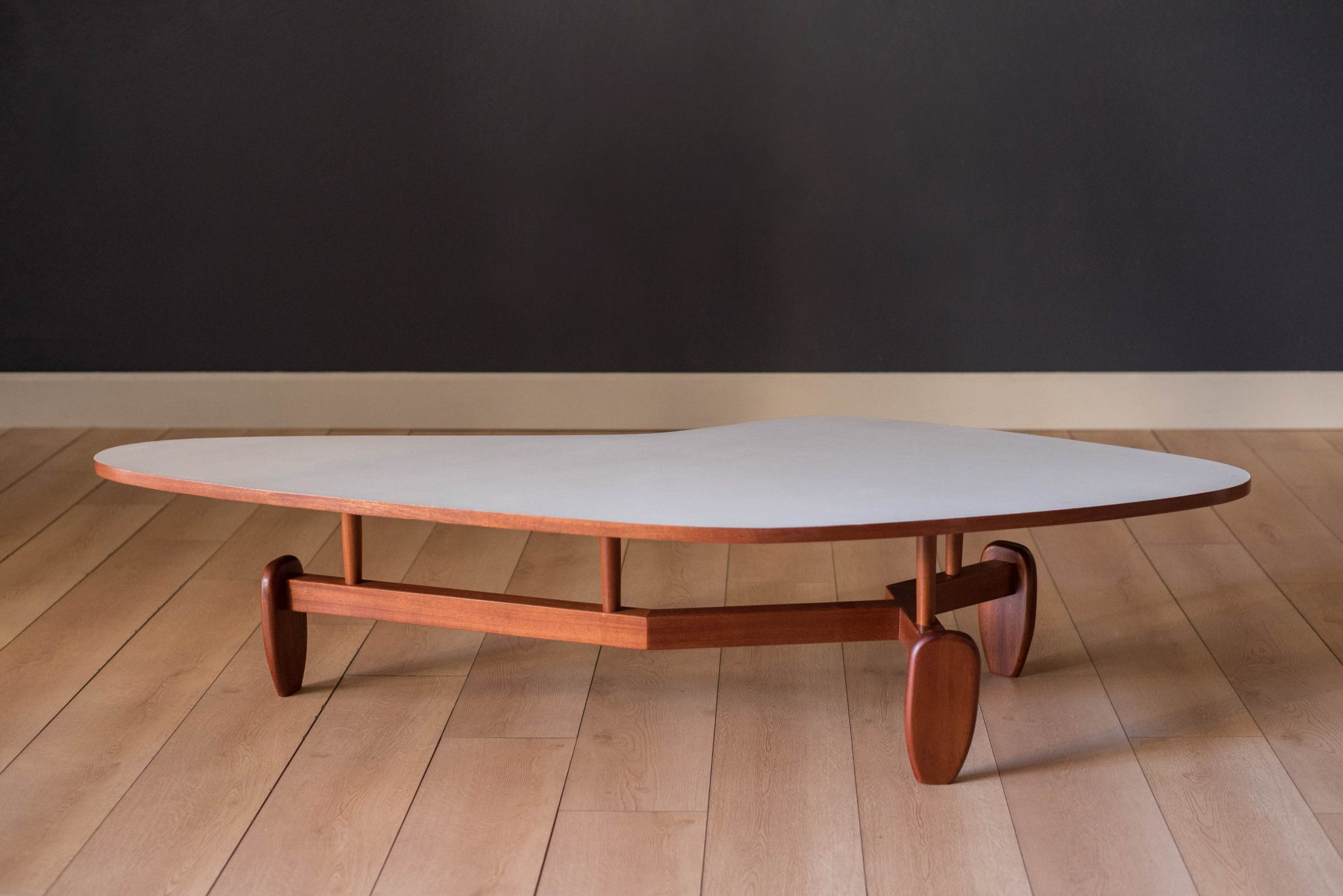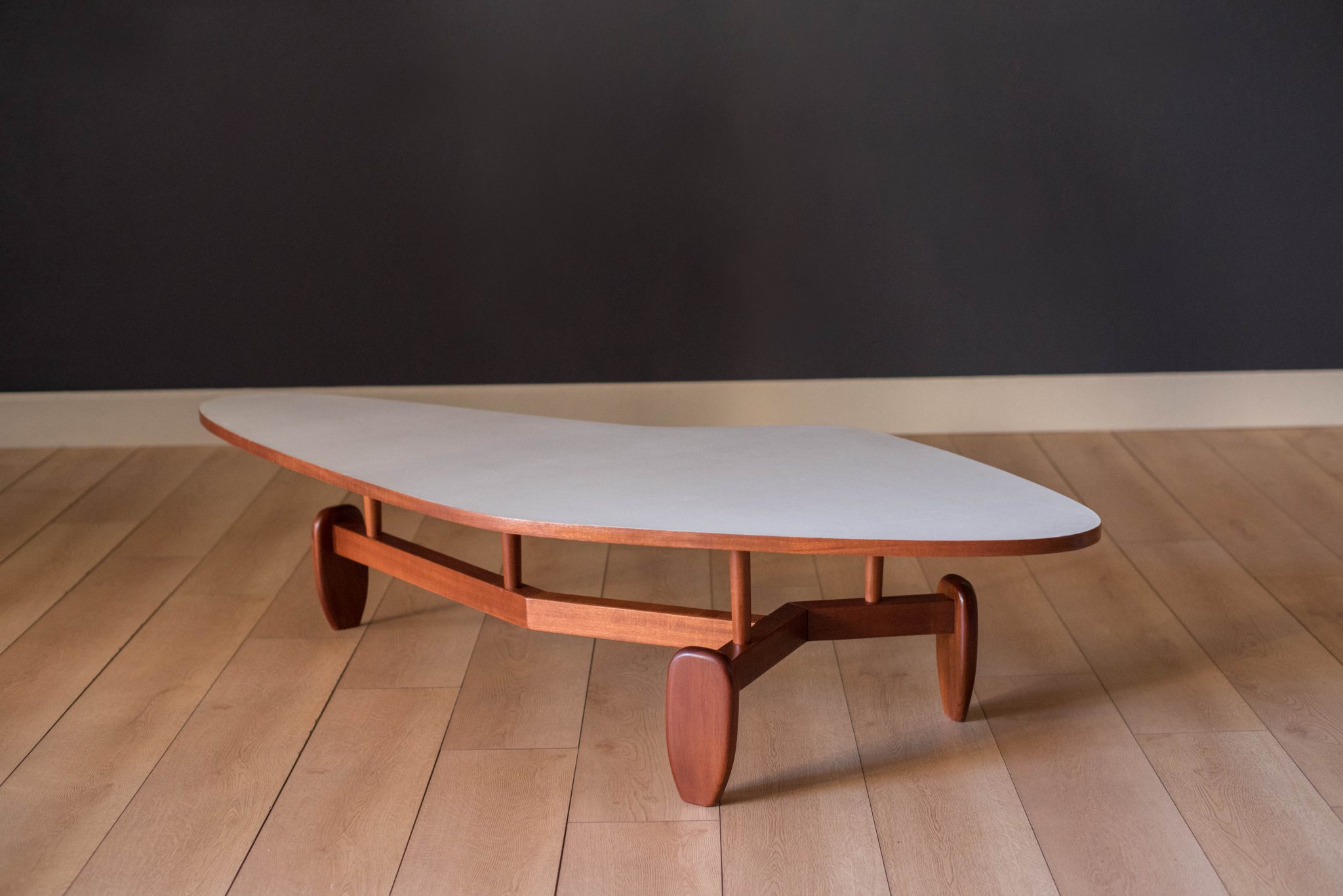 Vintage ‘outrigger’ coffee table designed by John Keal for Brown Saltman of California, circa 1950s. This conversation piece has a easy to maintain white laminate boomerang top with contrasting mahogany trim. Structural solid mahogany floating base displays well from all angles.