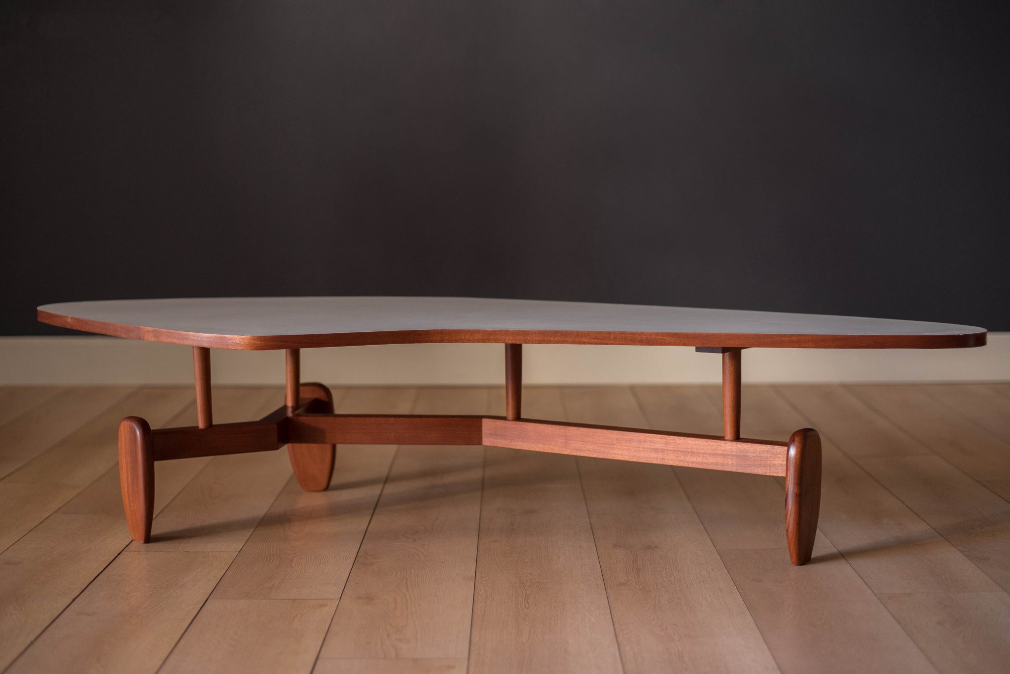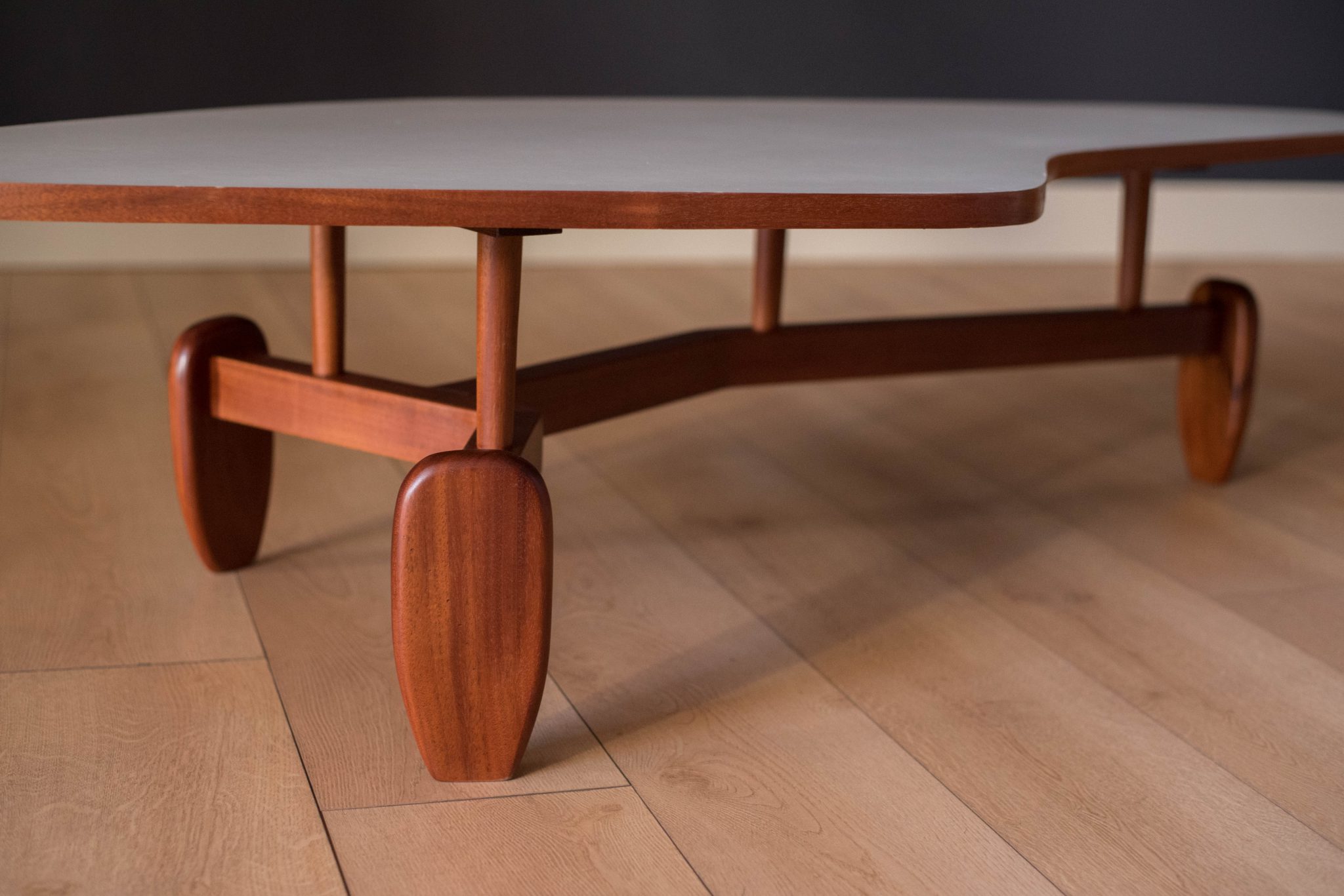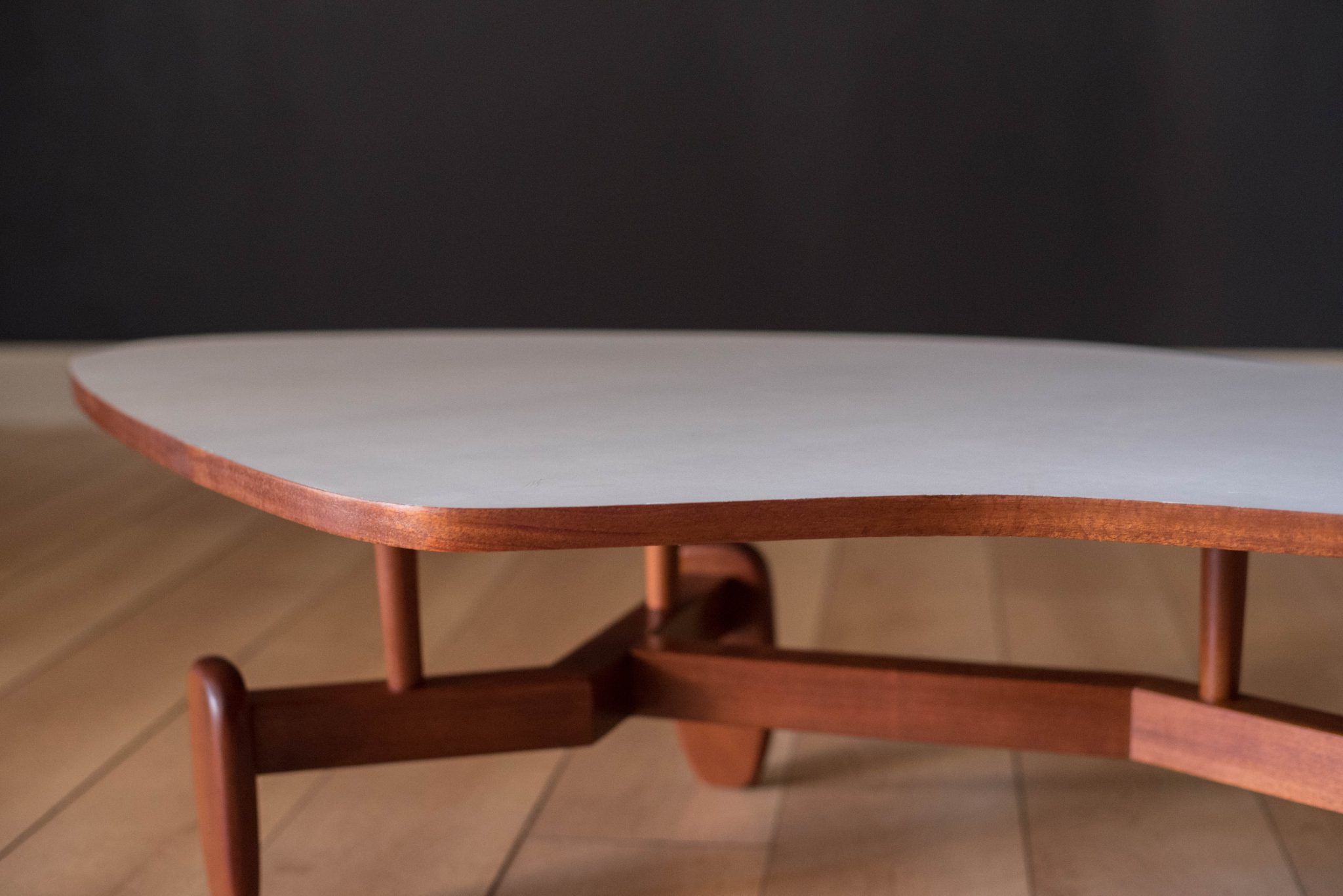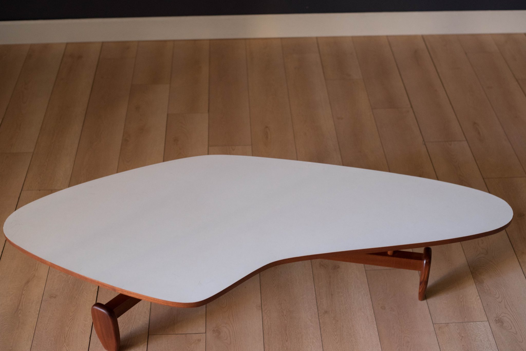 Vintage ‘outrigger’ coffee table designed by John Keal for Brown Saltman of California, circa 1950s. This conversation piece has a easy to maintain white laminate boomerang top with contrasting mahogany trim. Structural solid mahogany floating base displays well from all angles.