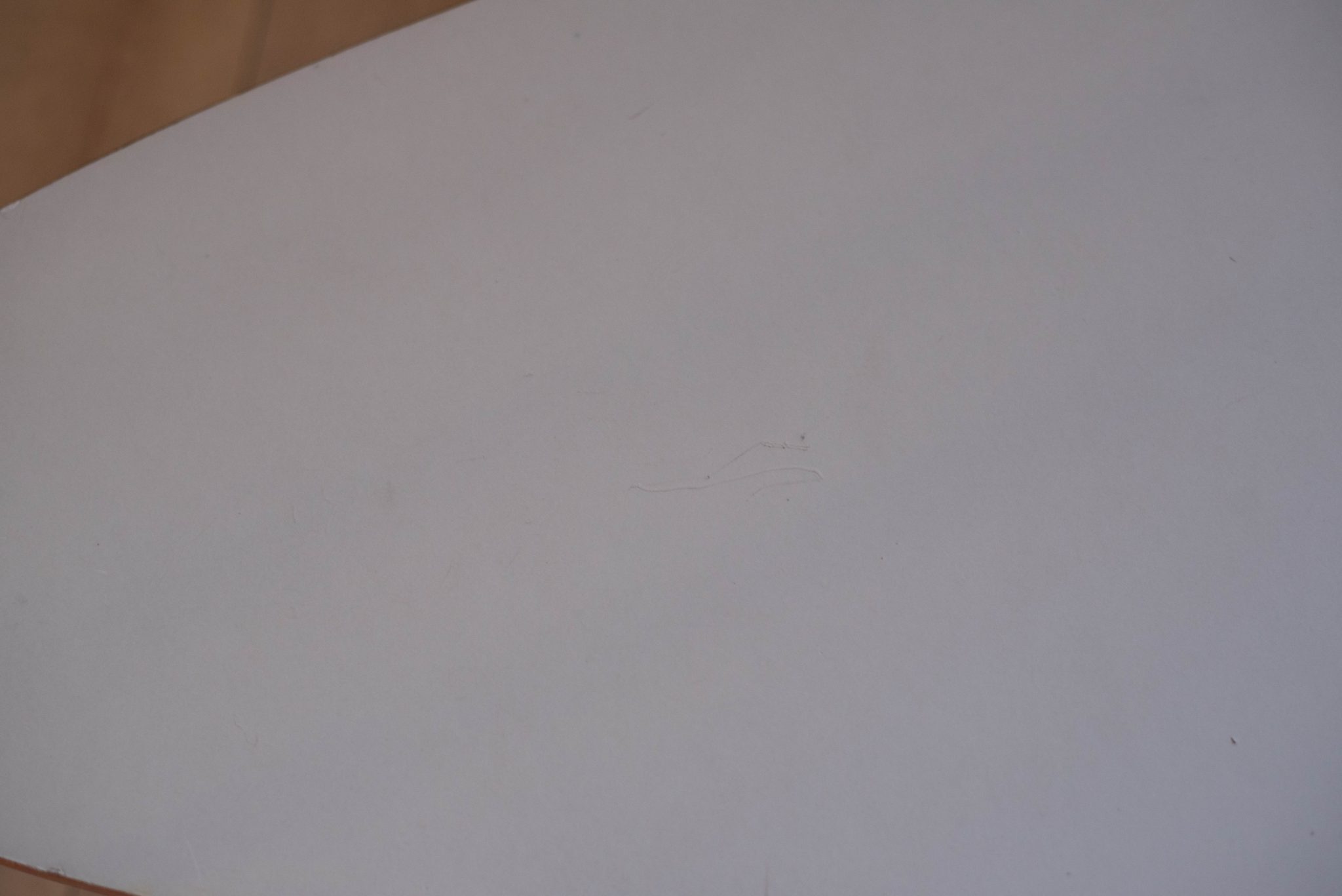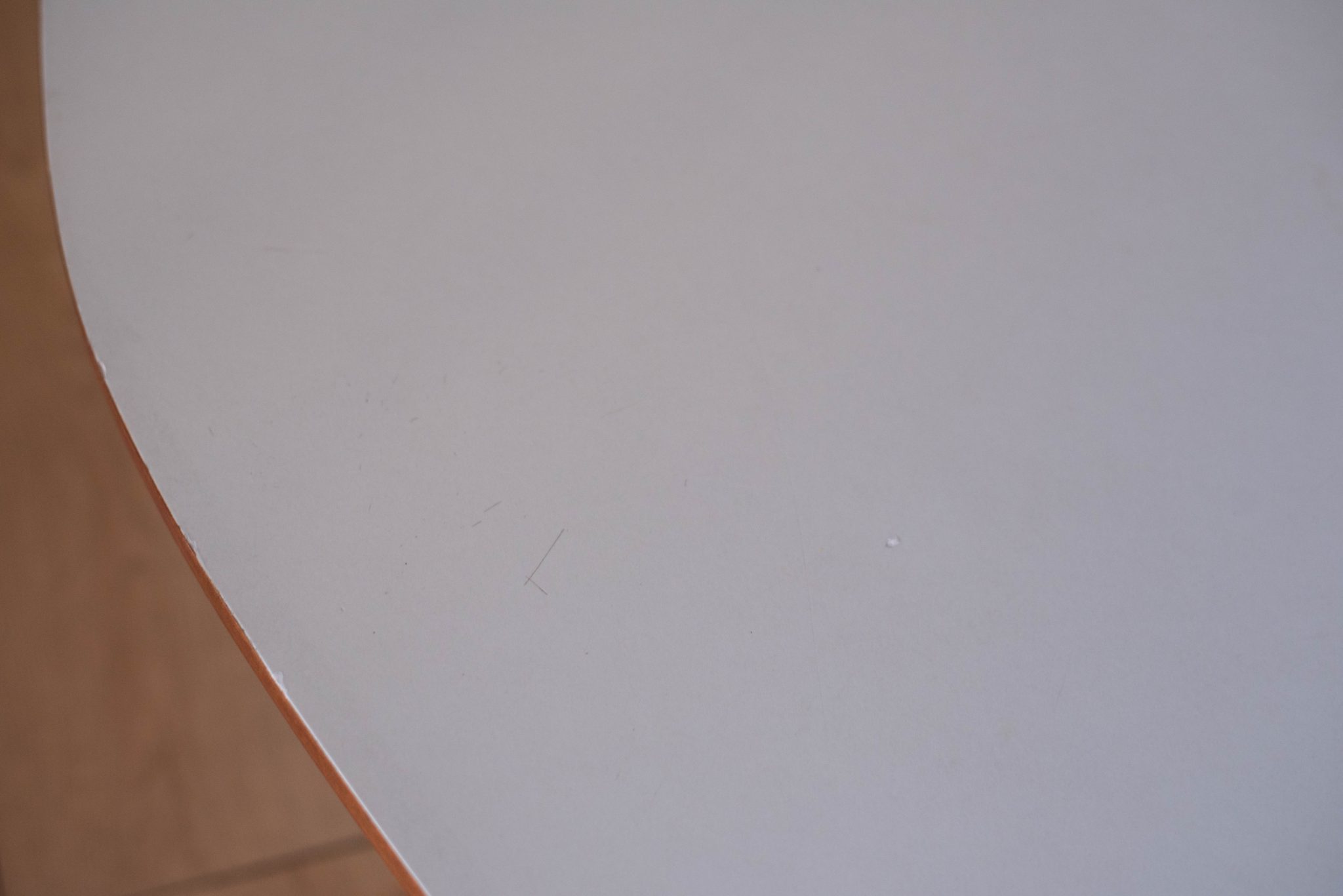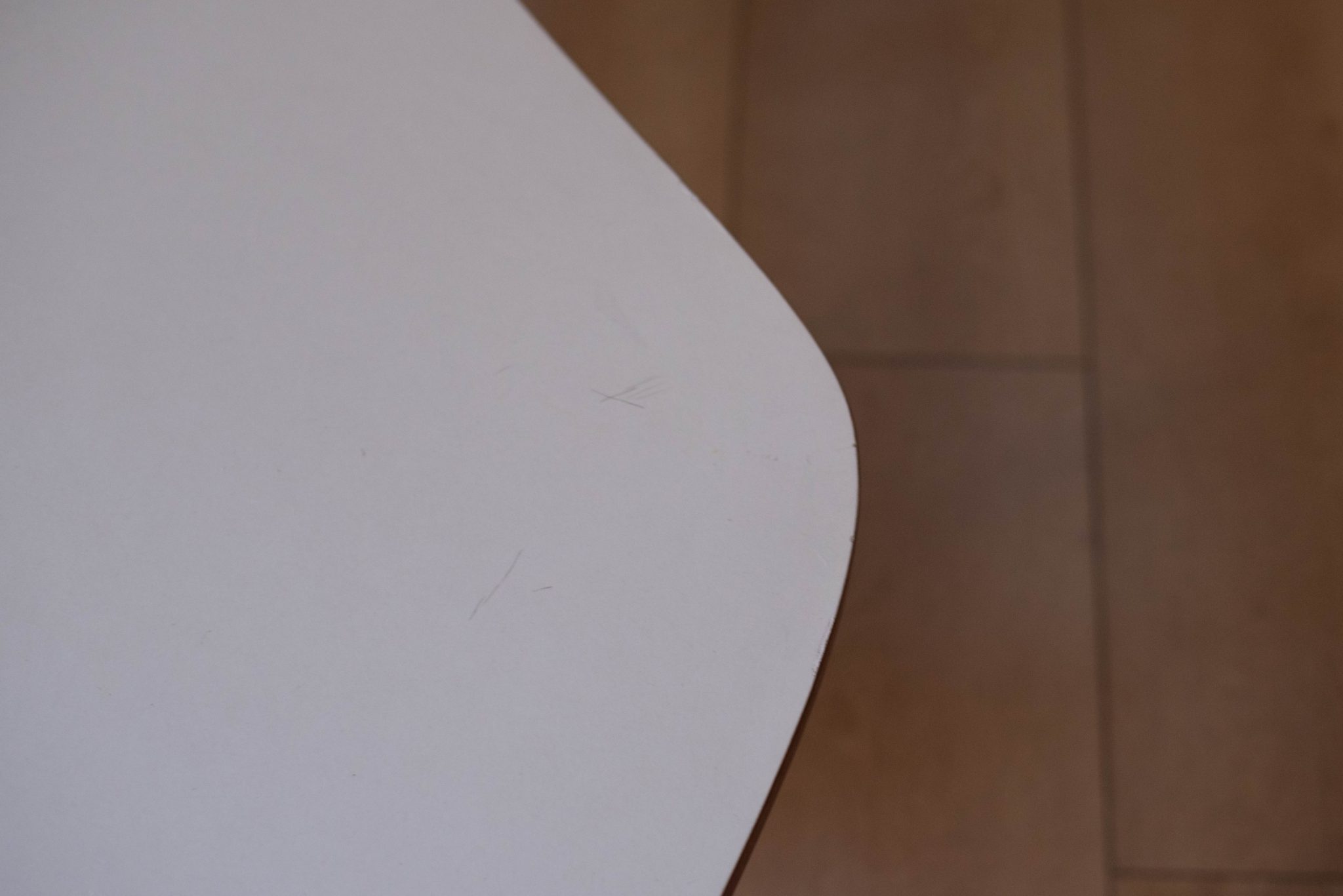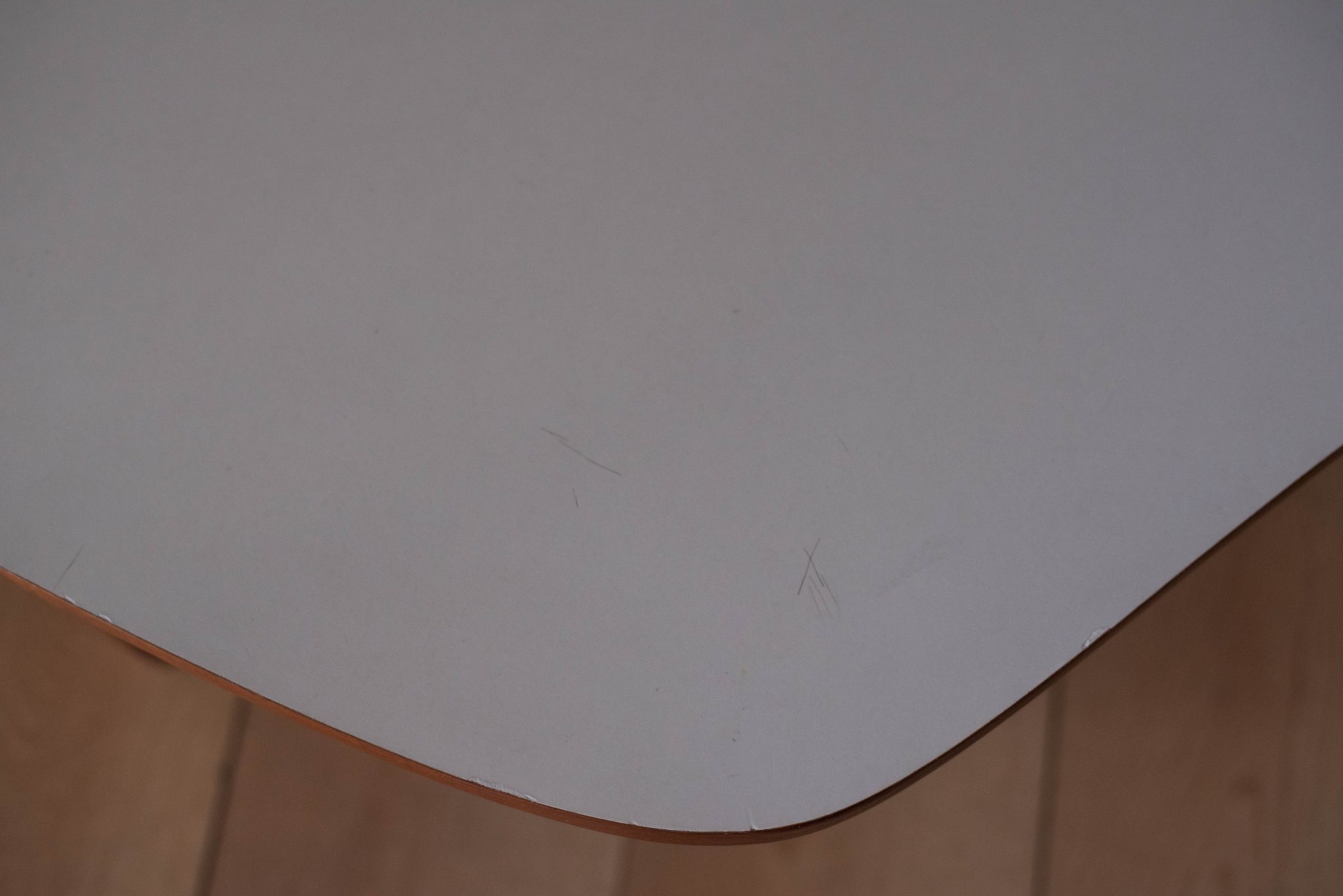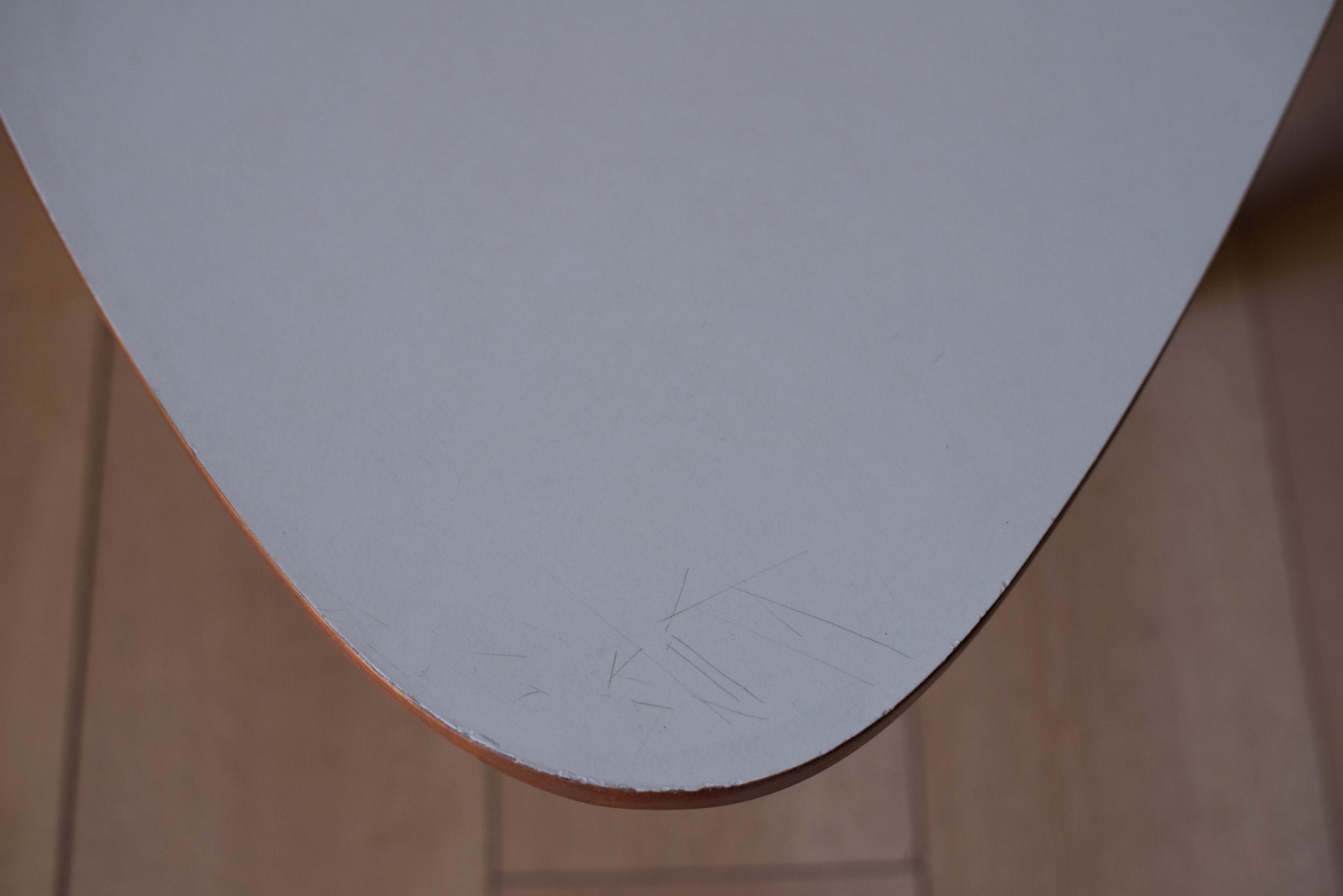 Vintage ‘outrigger’ coffee table designed by John Keal for Brown Saltman of California, circa 1950s. This conversation piece has a easy to maintain white laminate boomerang top with contrasting mahogany trim. Structural solid mahogany floating base displays well from all angles.