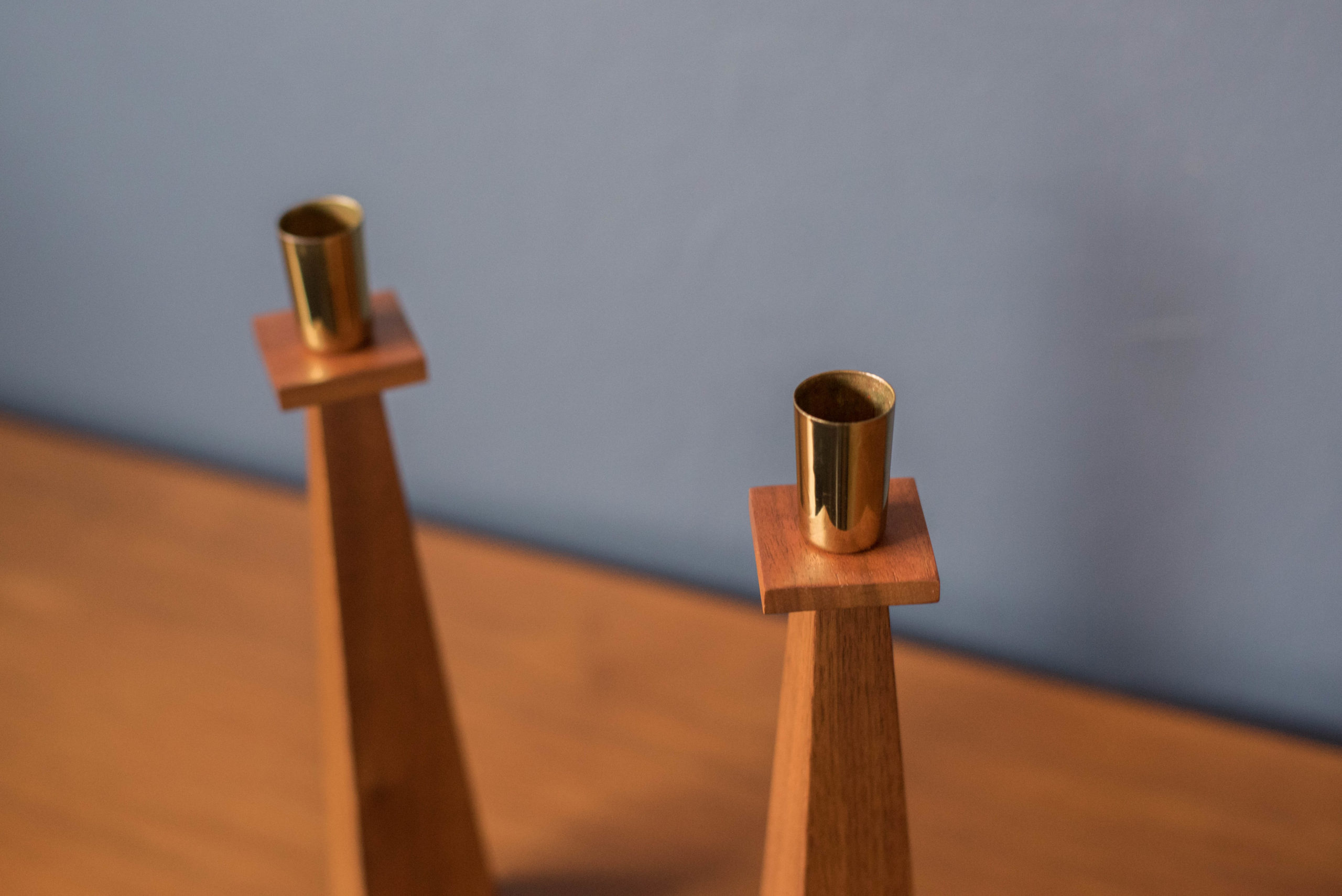 Mid-Century Modern Pair of Sculptural Walnut and Brass Candlestick Holders