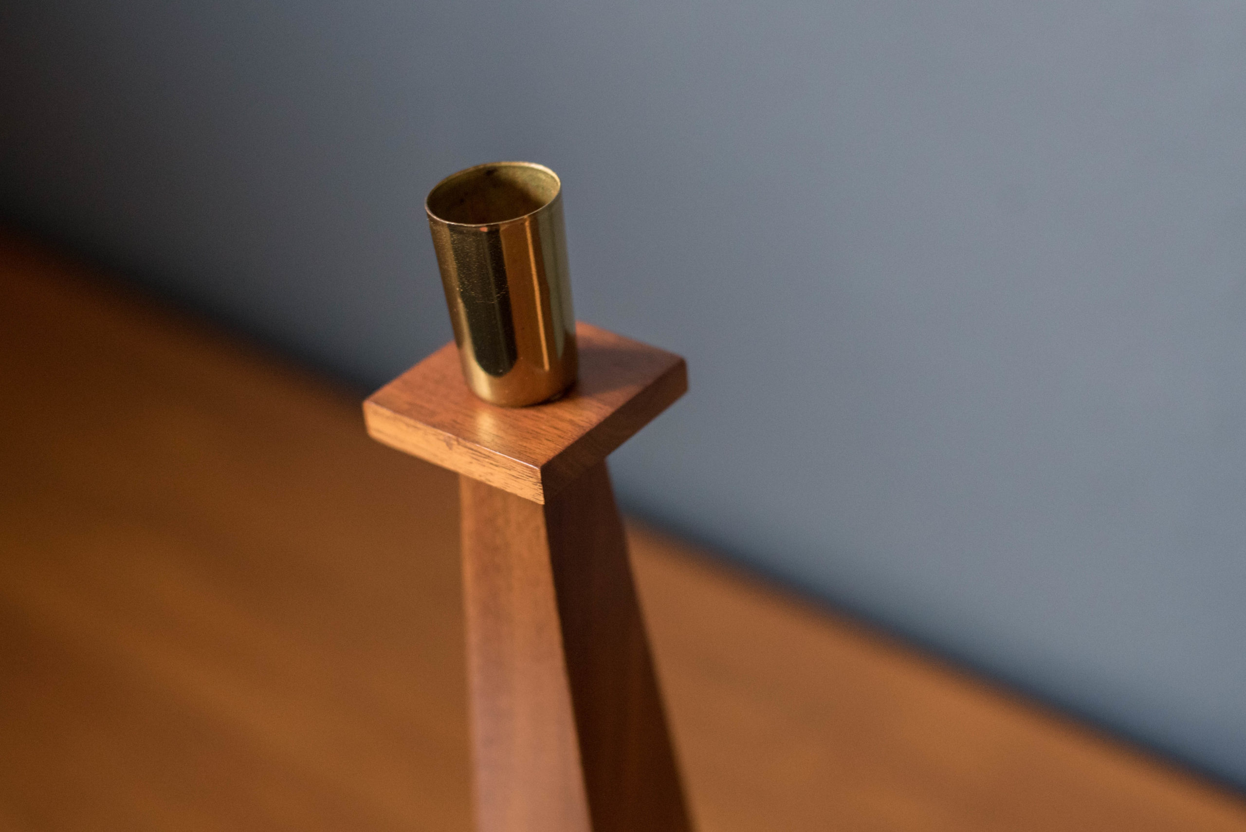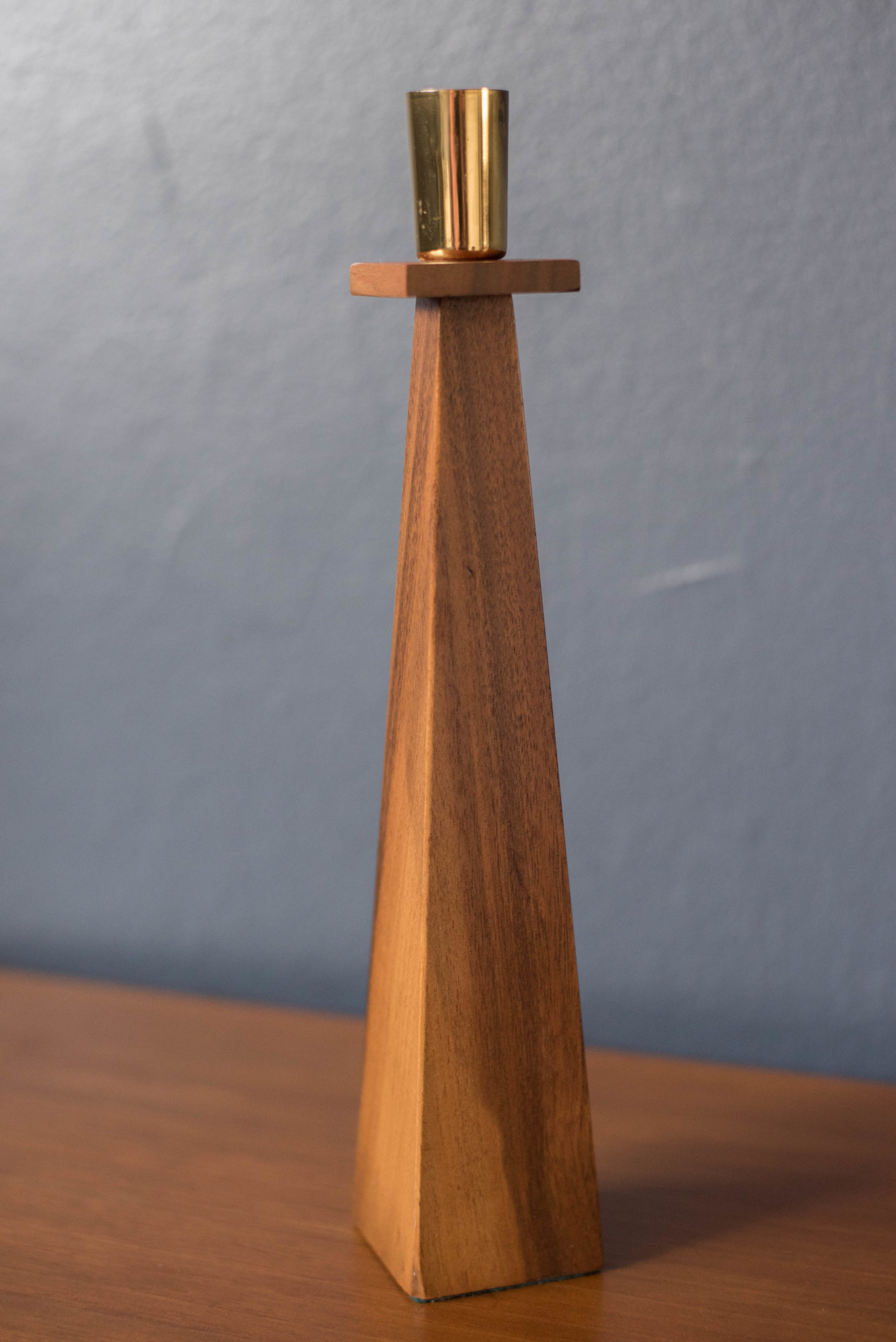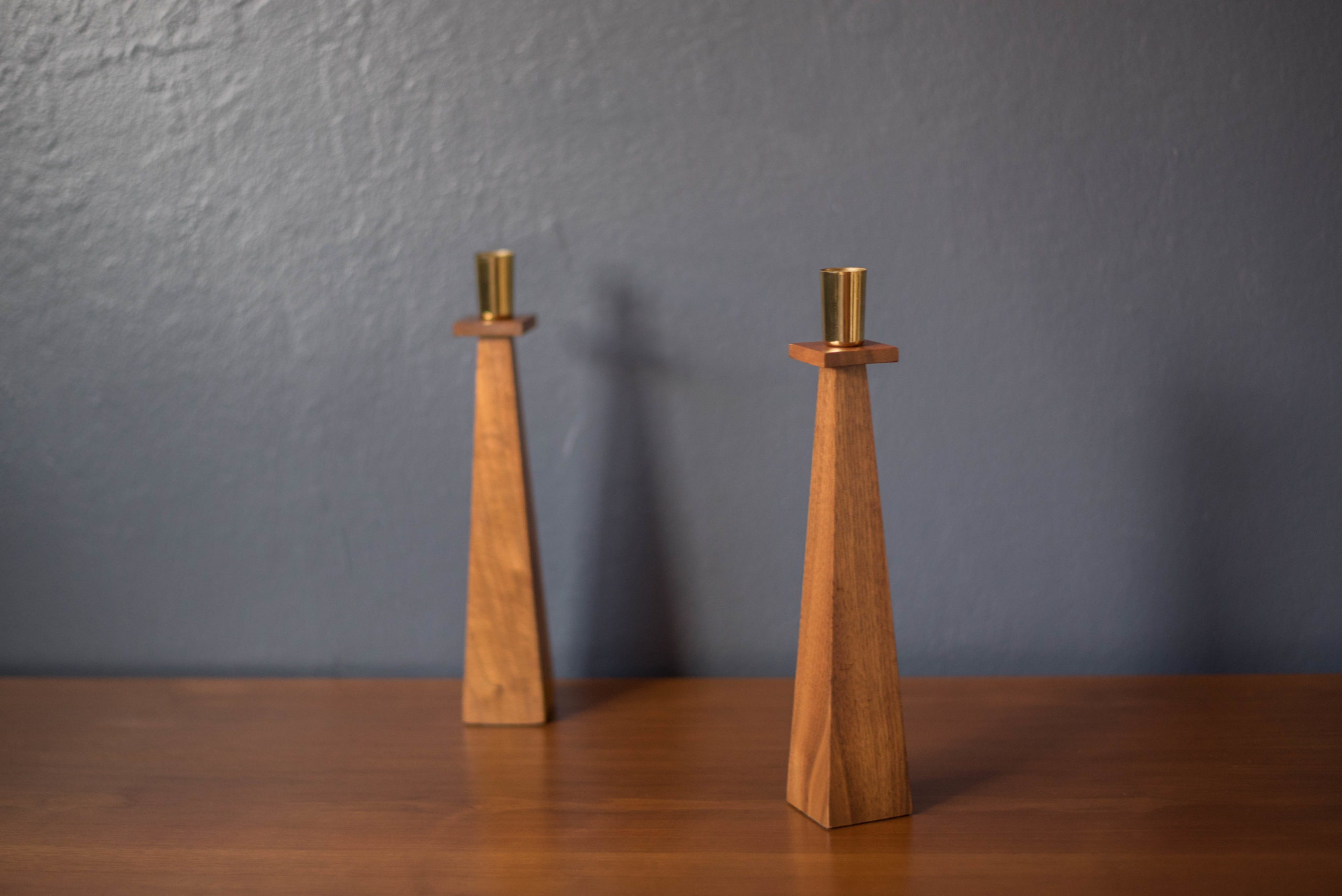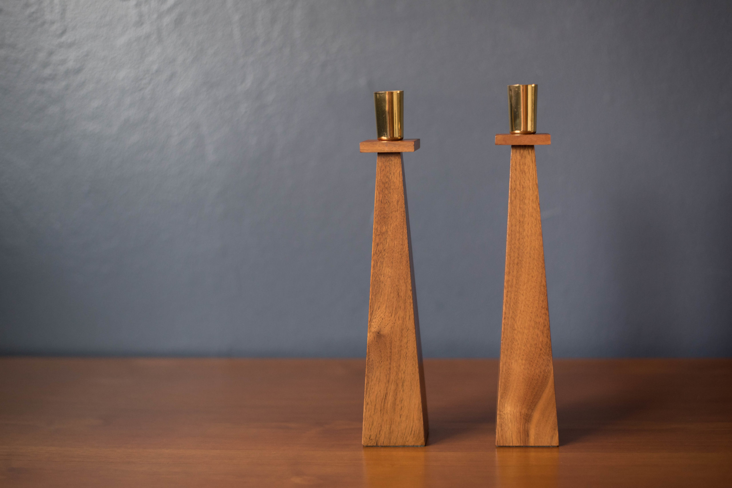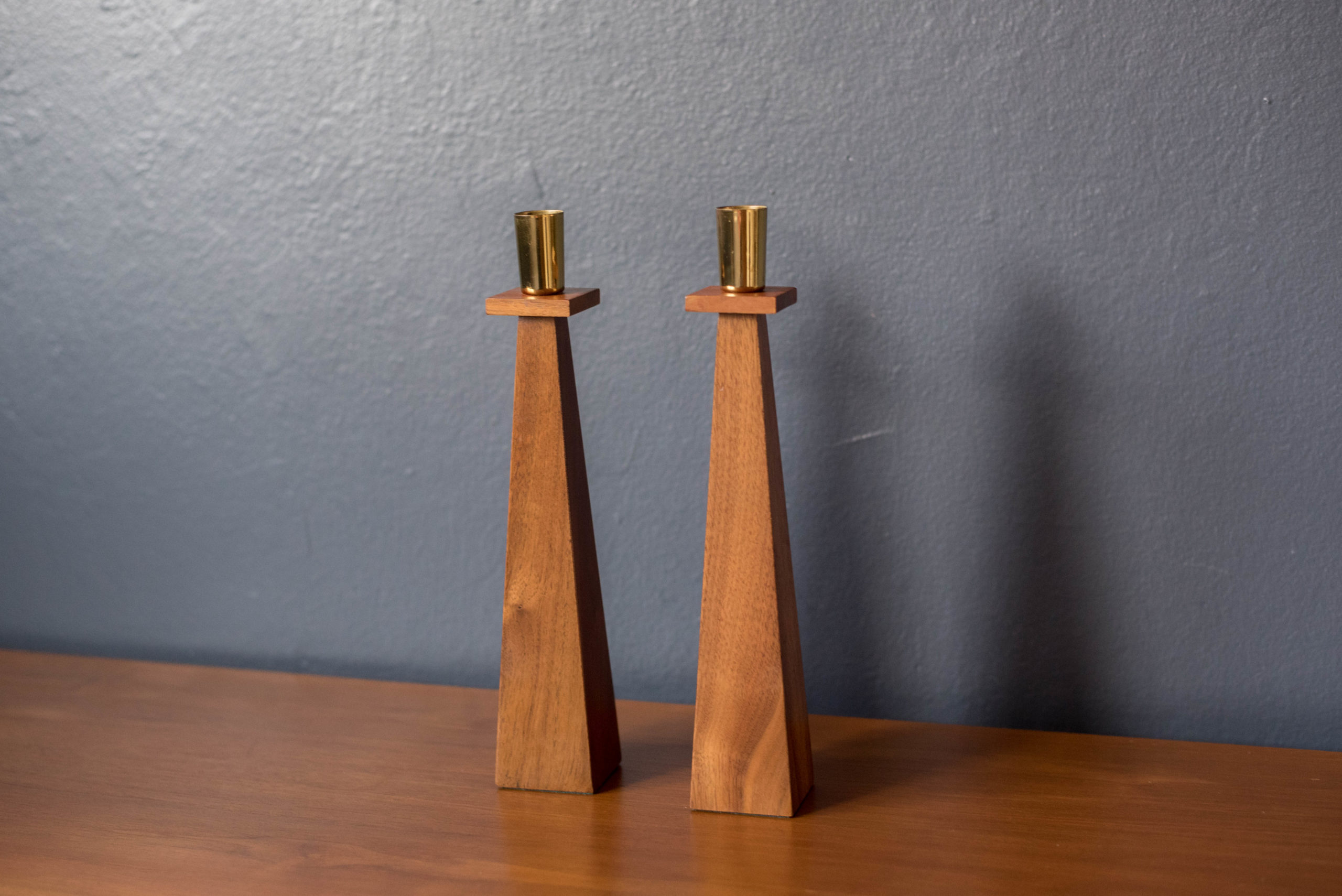 Pair of vintage sculptural candleholders in walnut made by Kustom Kraft circa 1960’s. This unique set fits 3/4″ taper candles accented in brass. Price is for the pair. Complements any Danish modern decor or contemporary space.