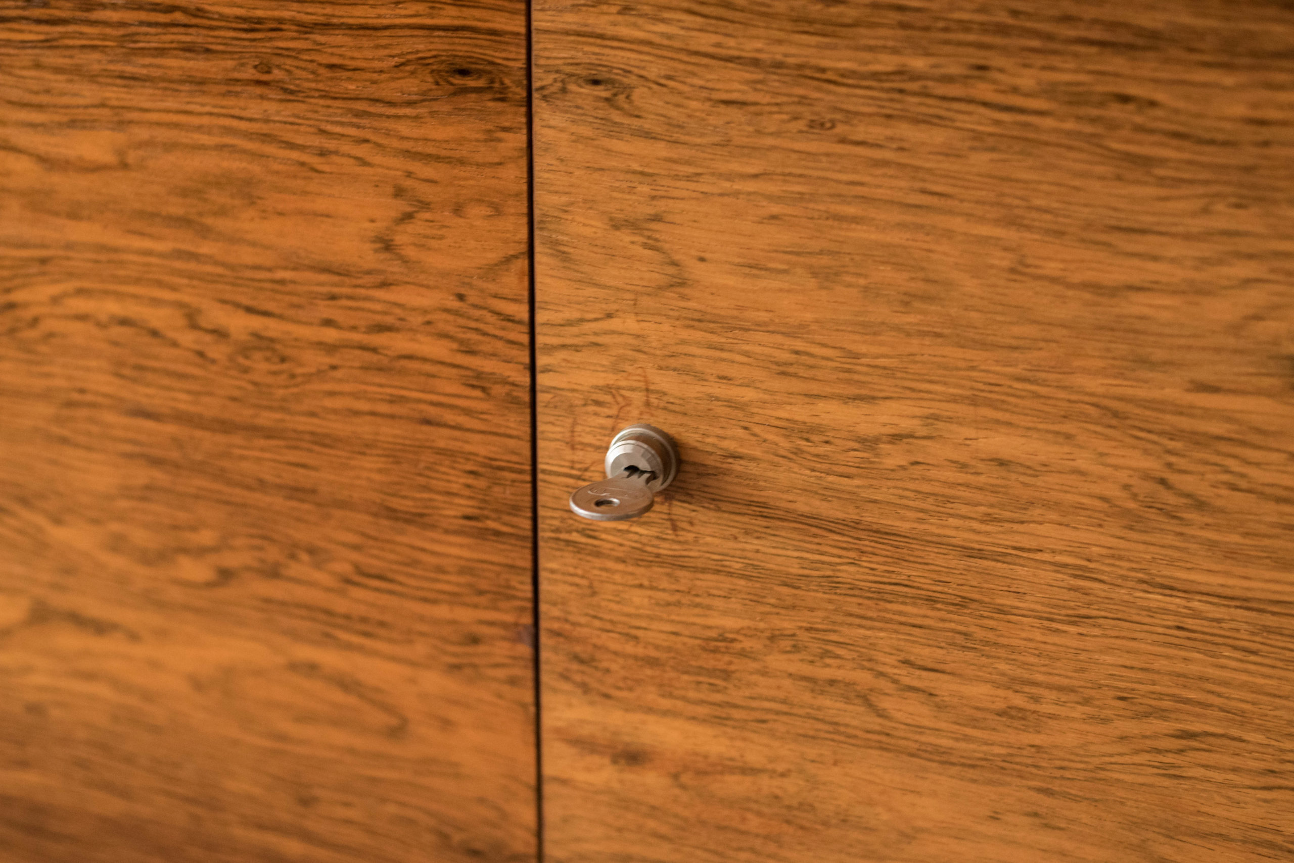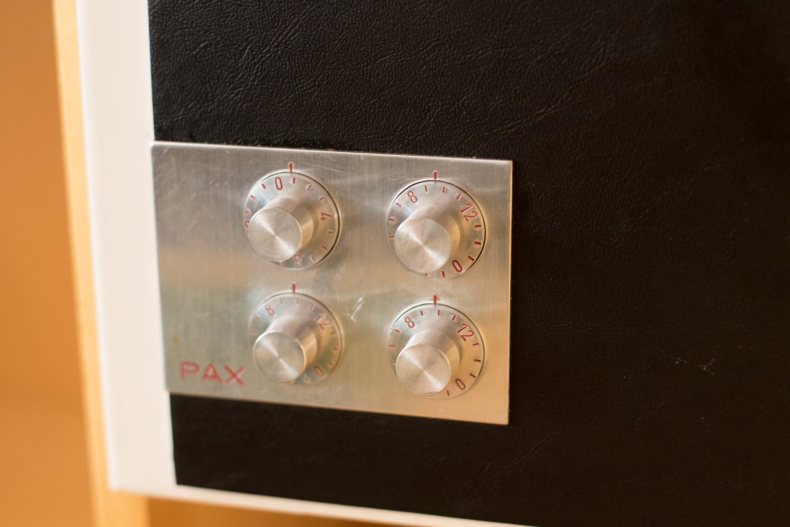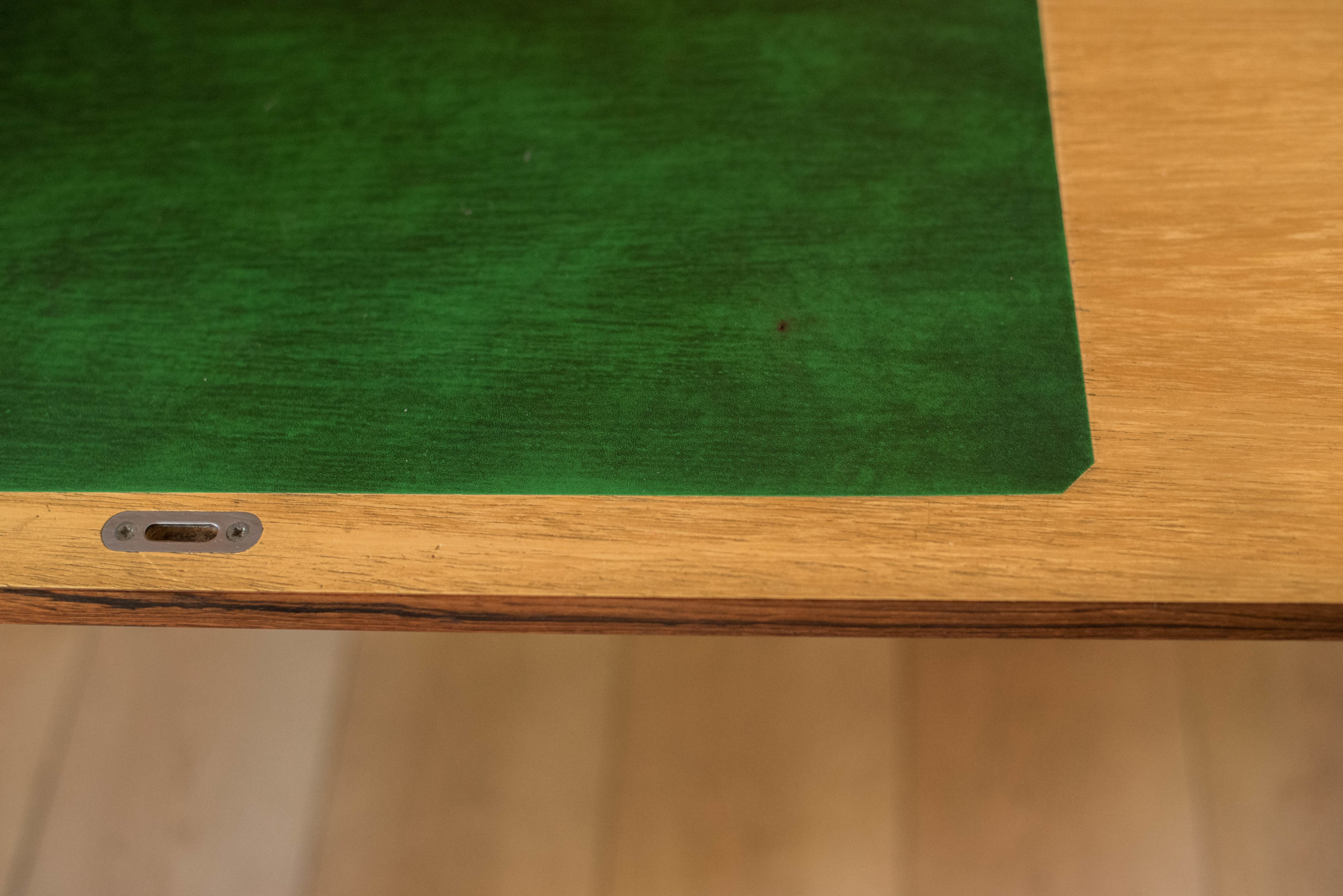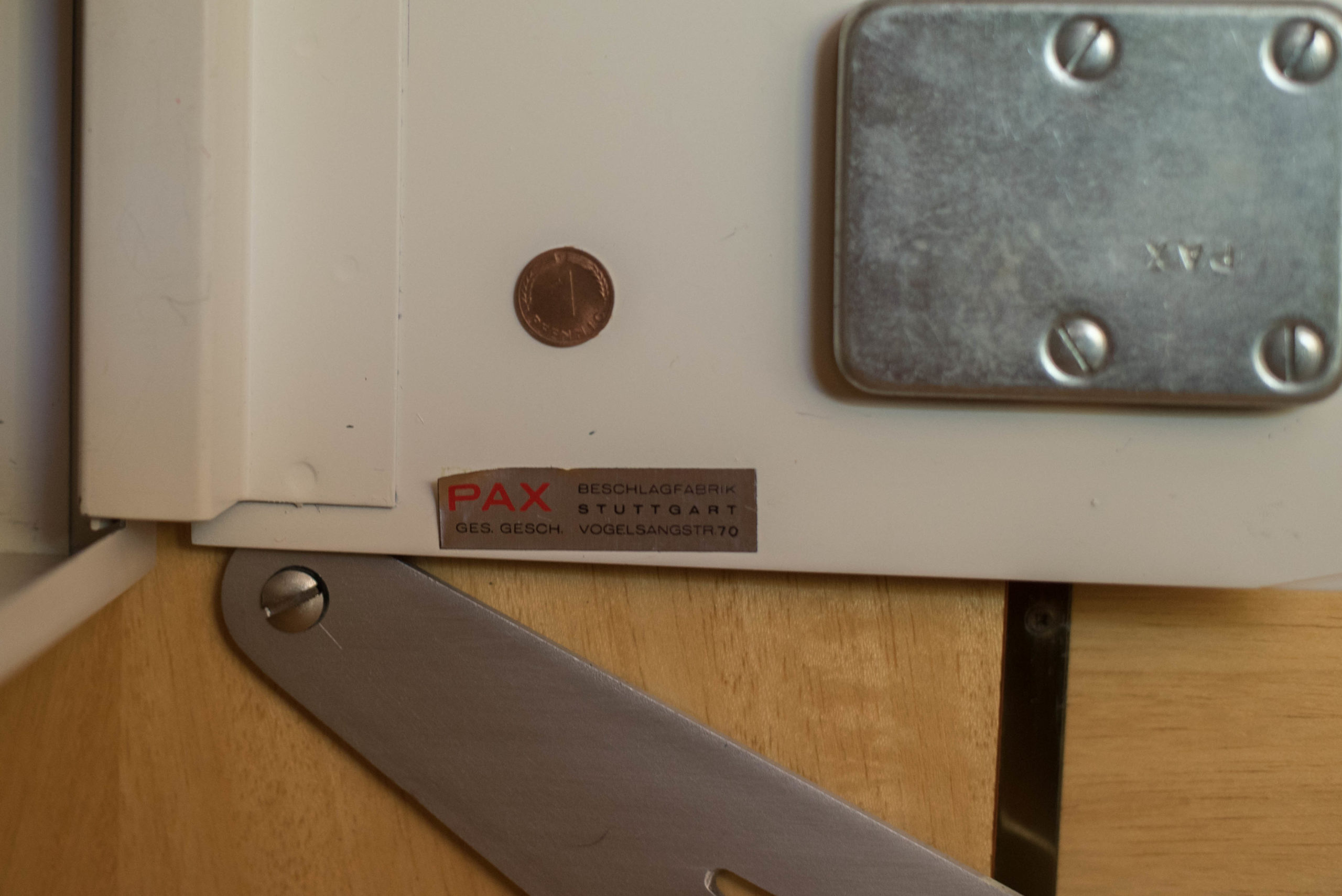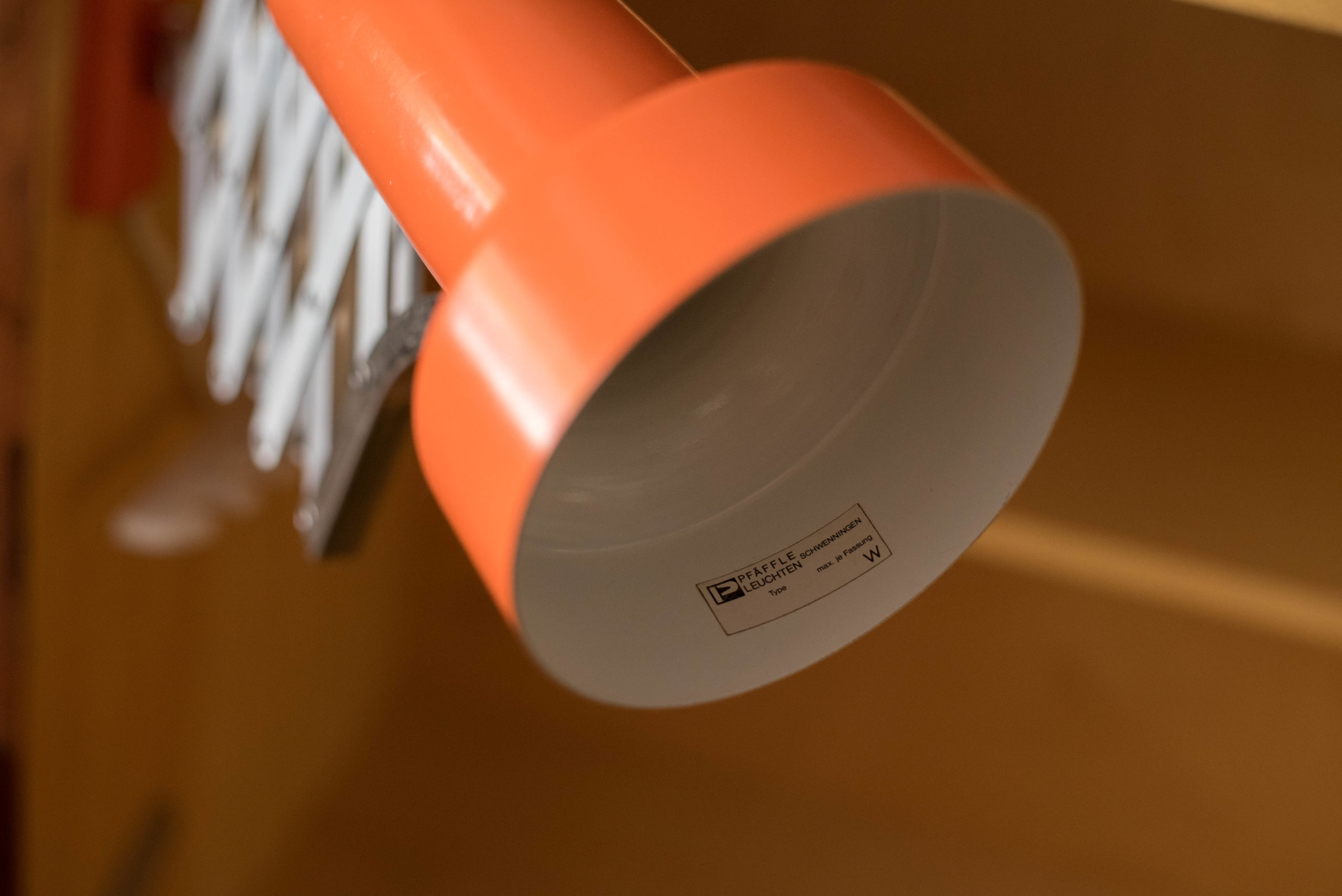 Vintage office secretary cabinet desk in rosewood, made in Germany, circa 1960s. This clever piece folds out into a workspace desktop that offers plenty of storage equipped with adjustable shelving and four drawers. The interior of the desk also provides a security safe lock box, a green leather writing pad, and an adjustable orange task lamp made by Pfäffle Leuchten Schwenningen. The swing out doors are secured with two metal extension legs when the desk is open. Locking key included.