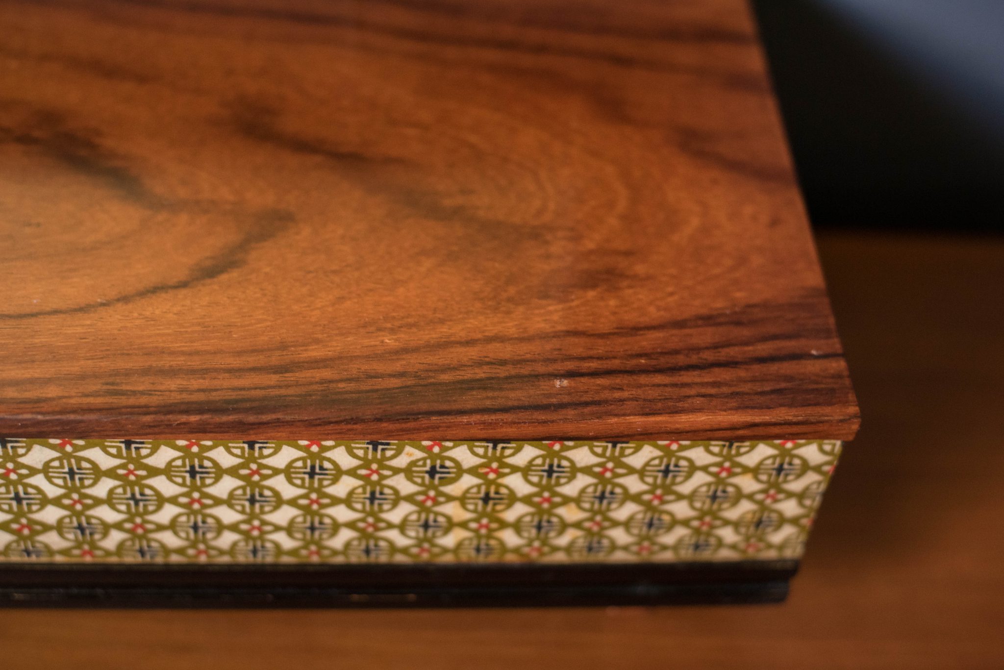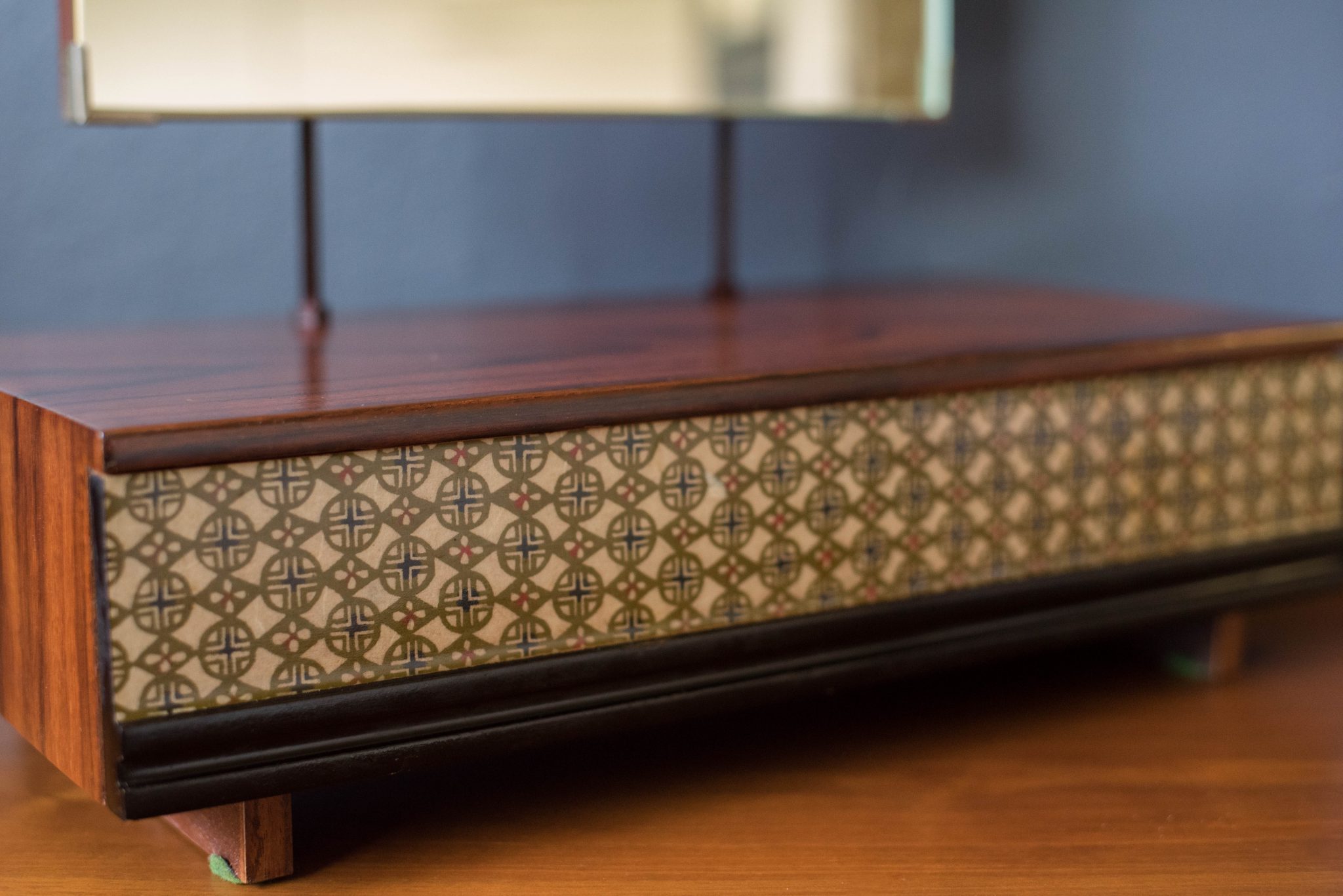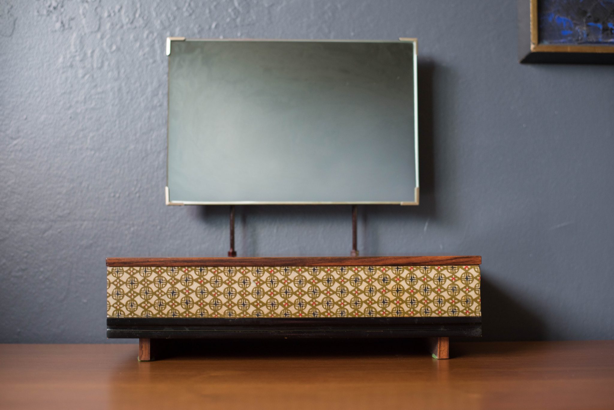 Vintage jewelry box with mirror in rosewood circa 1970s. This unique piece includes one drawer with a lacquered pattern finish.
