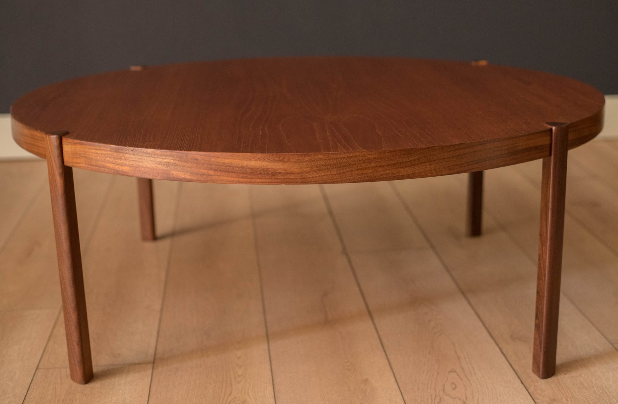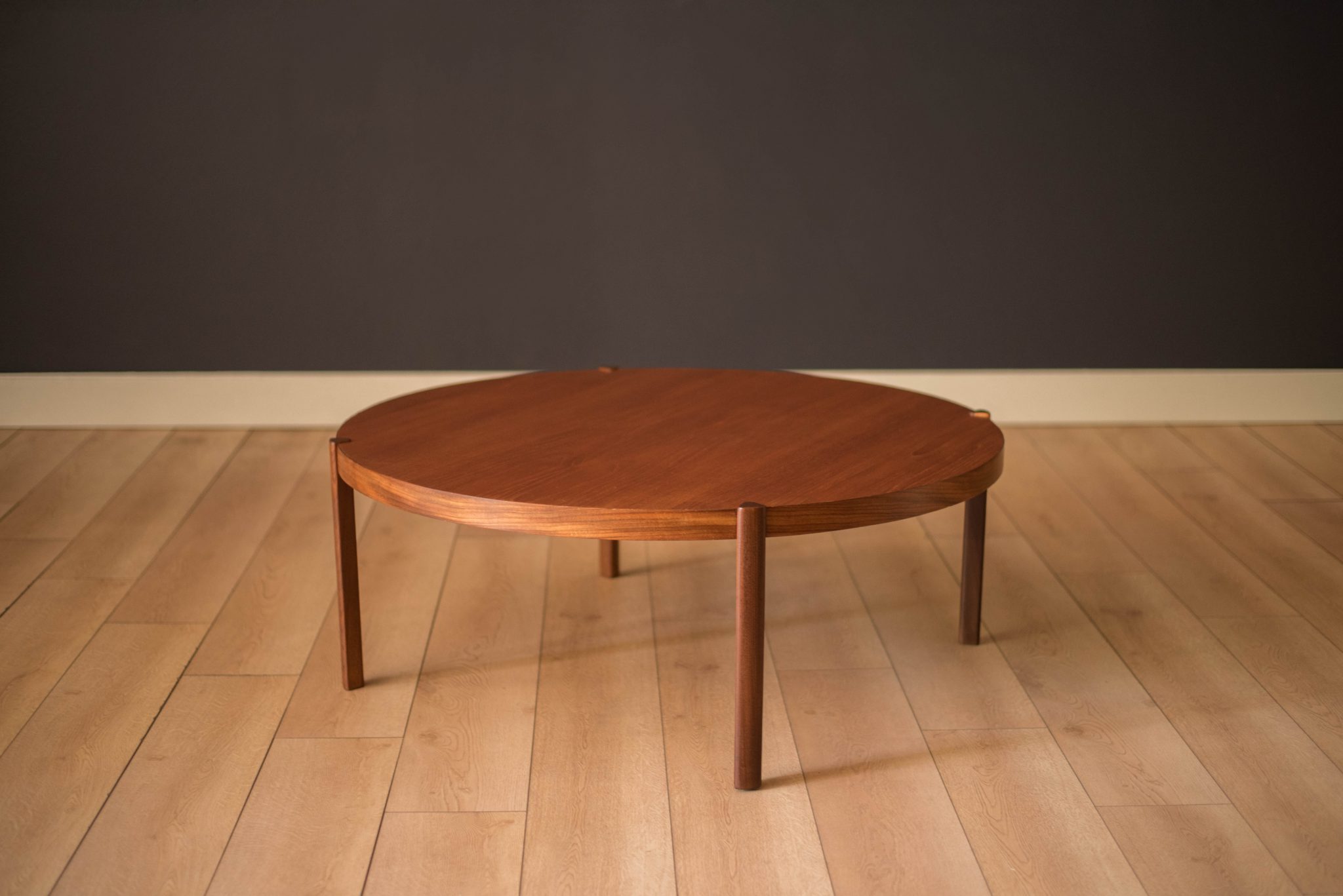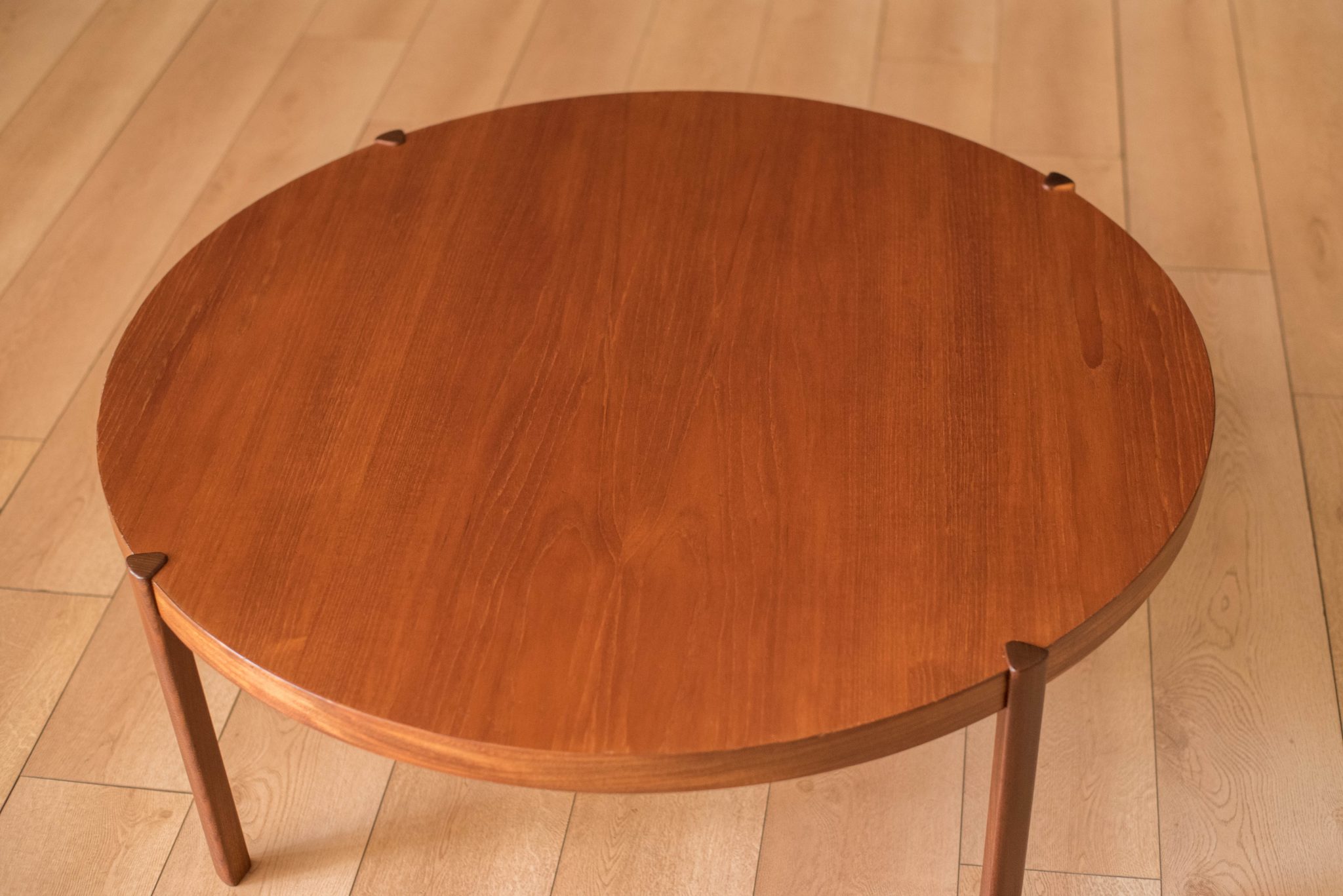 Vintage round coffee table in teak by Hans Olsen, Denmark circa 1960’s. This timeless and simple design features warm teak grains that sits at a low profile. Supporting angular legs are crafted in a contasting teak afromasia.