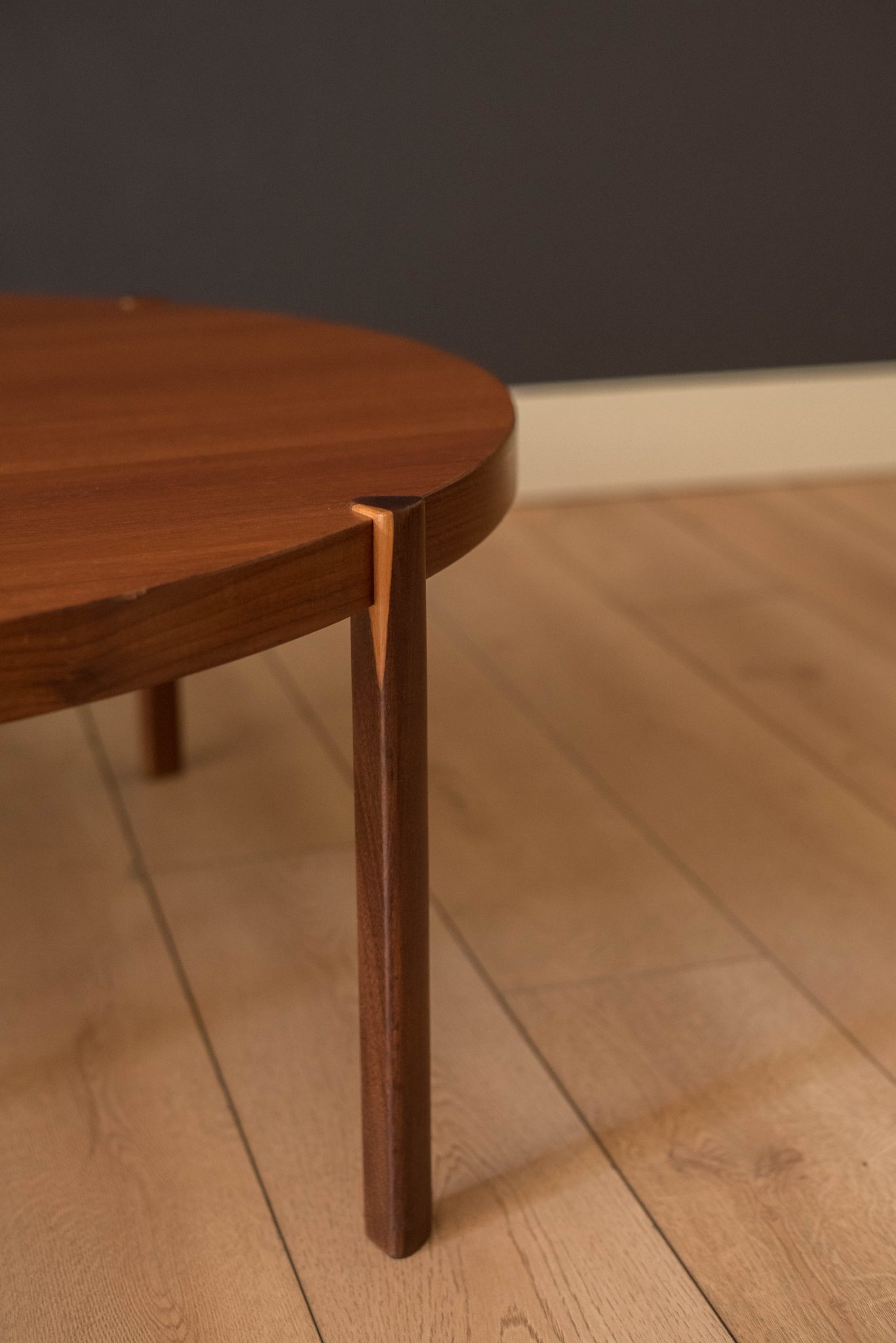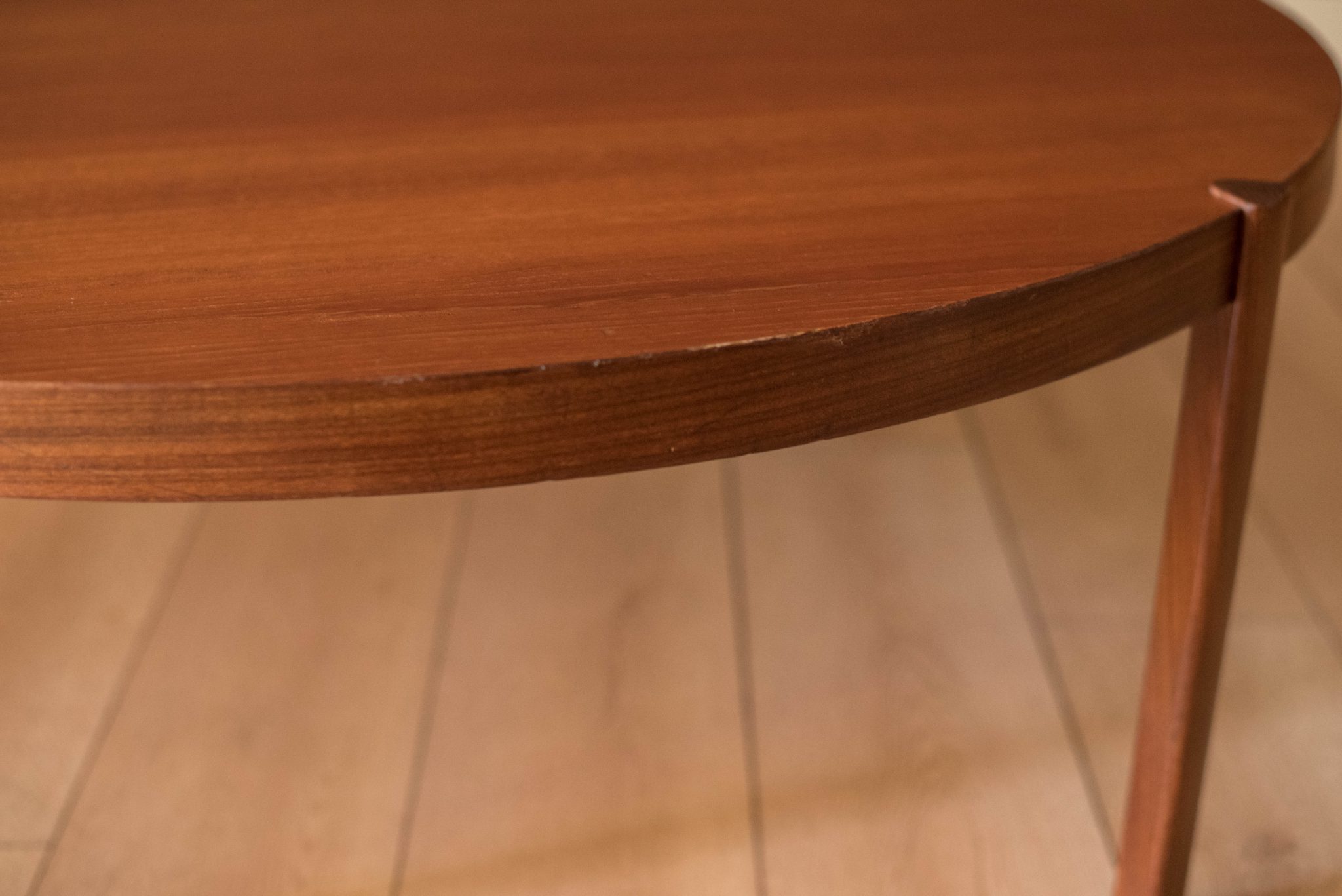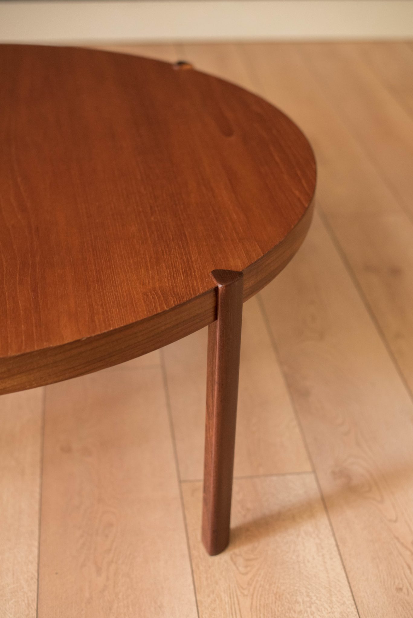 Vintage round coffee table in teak by Hans Olsen, Denmark circa 1960’s. This timeless and simple design features warm teak grains that sits at a low profile. Supporting angular legs are crafted in a contasting teak afromasia.