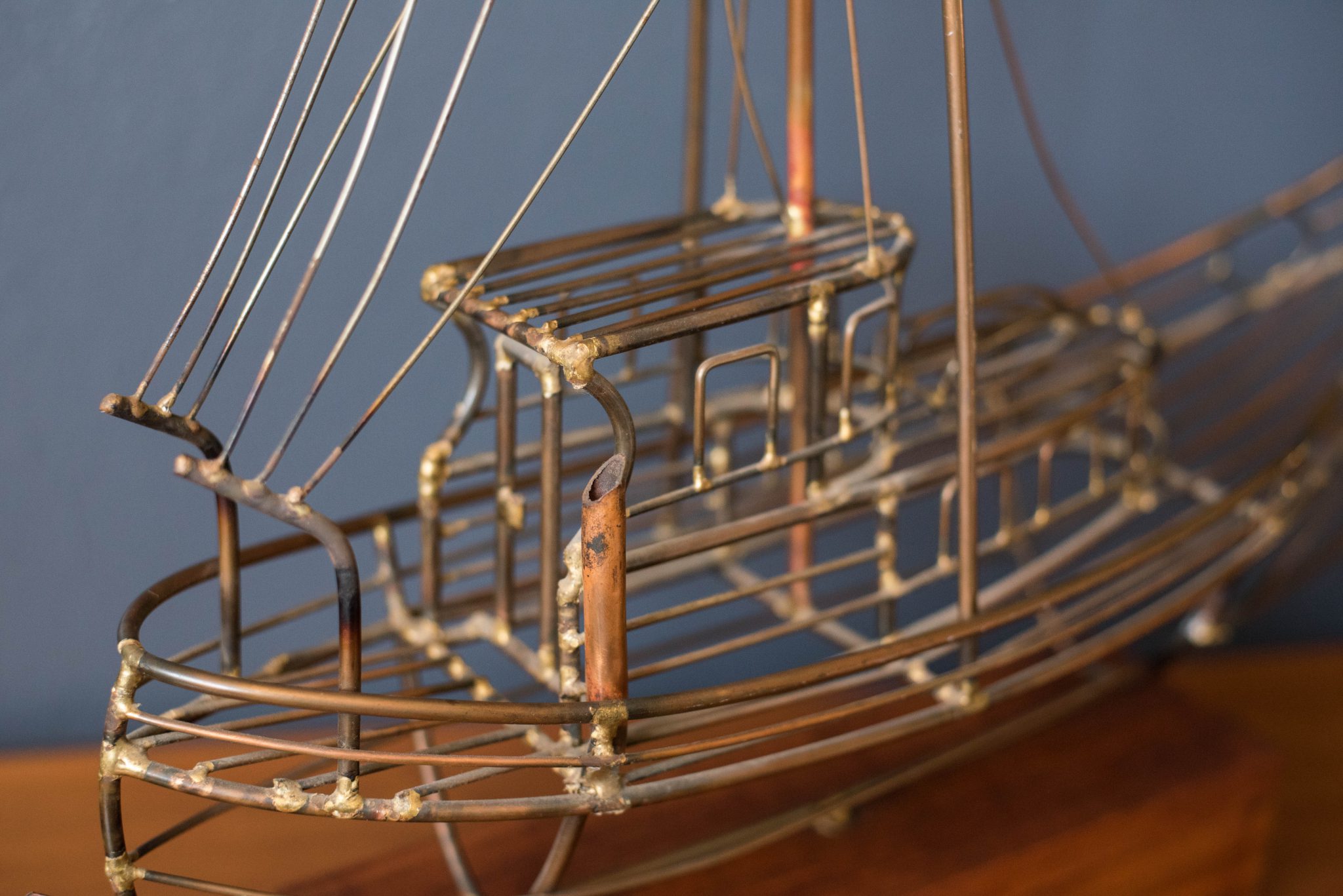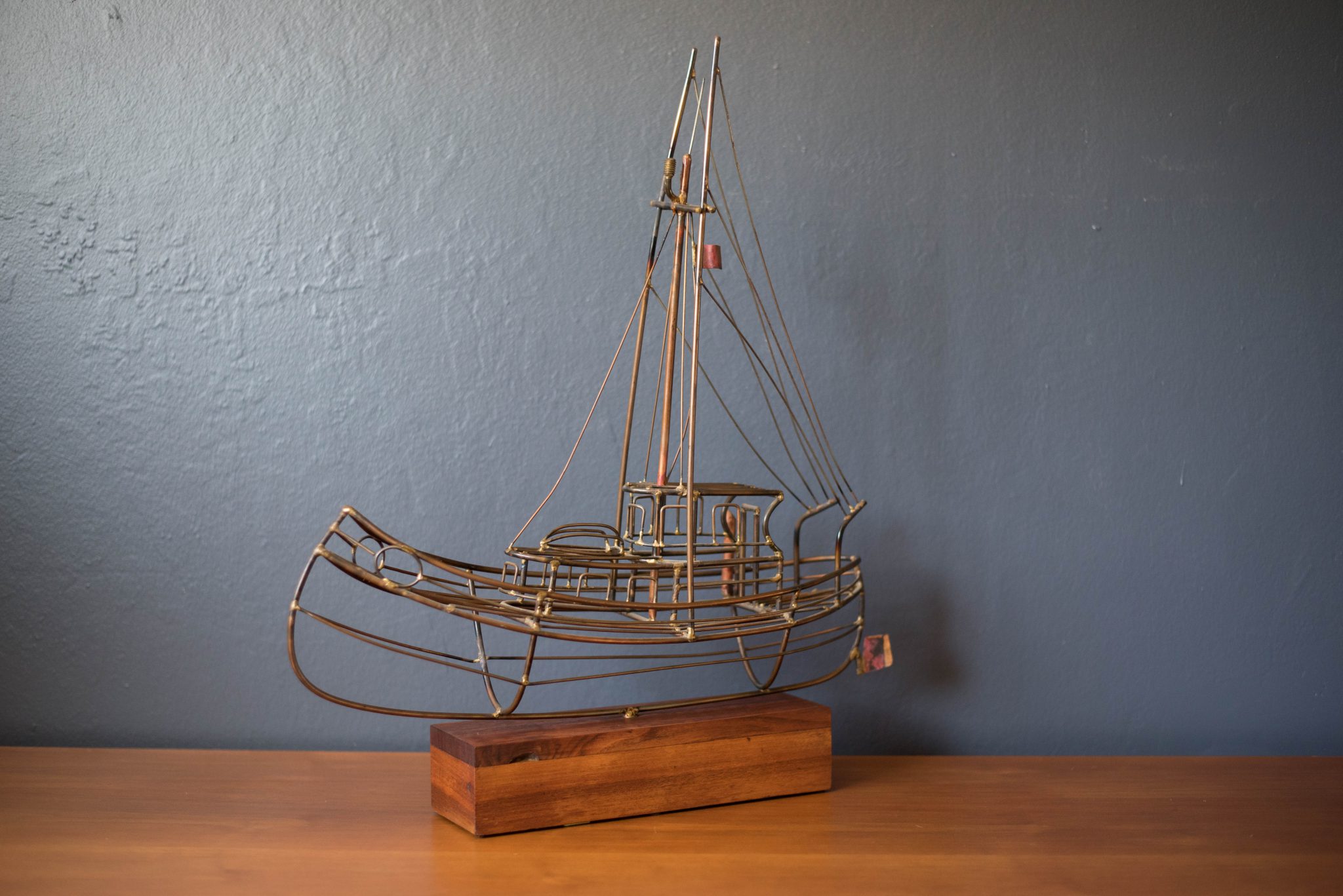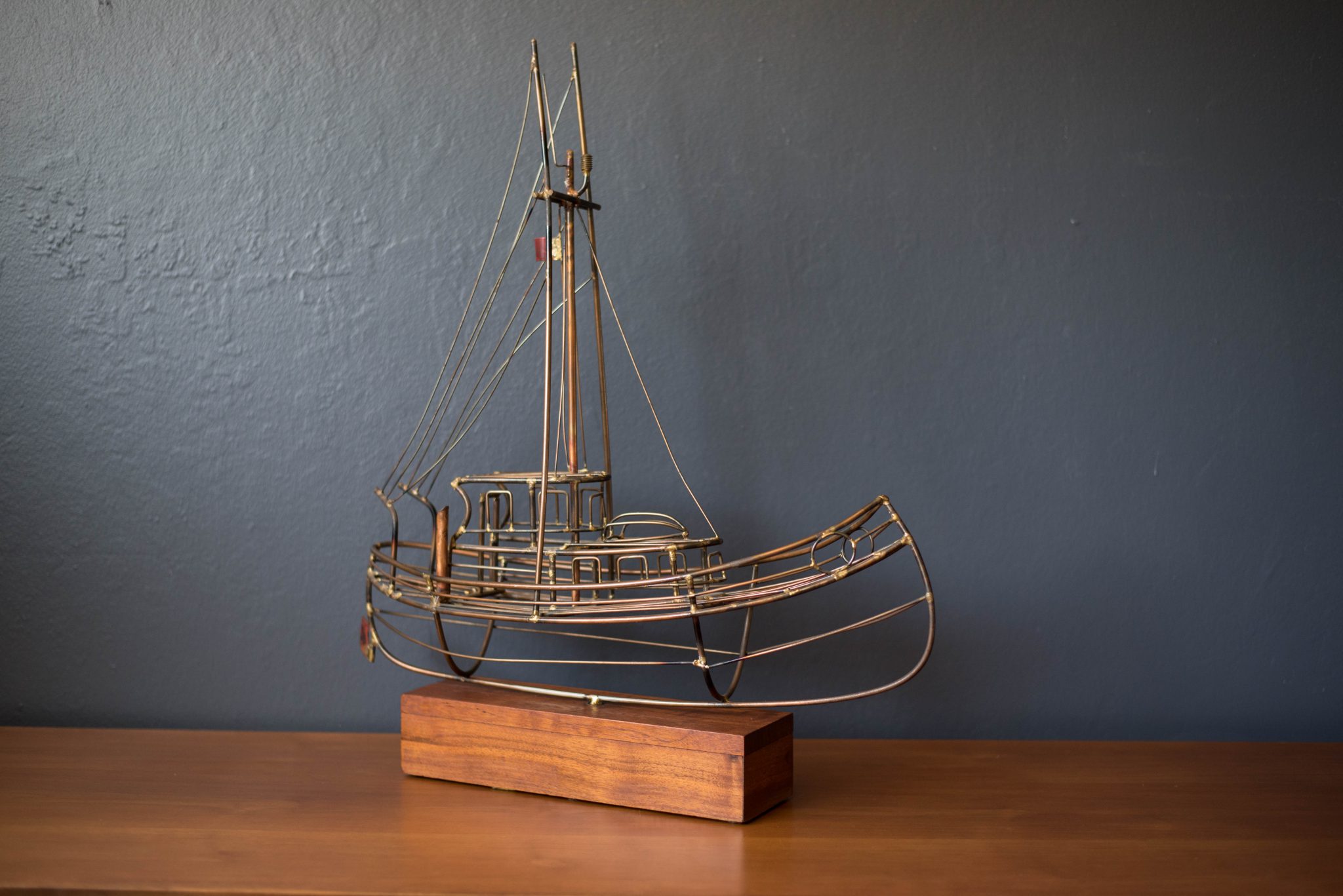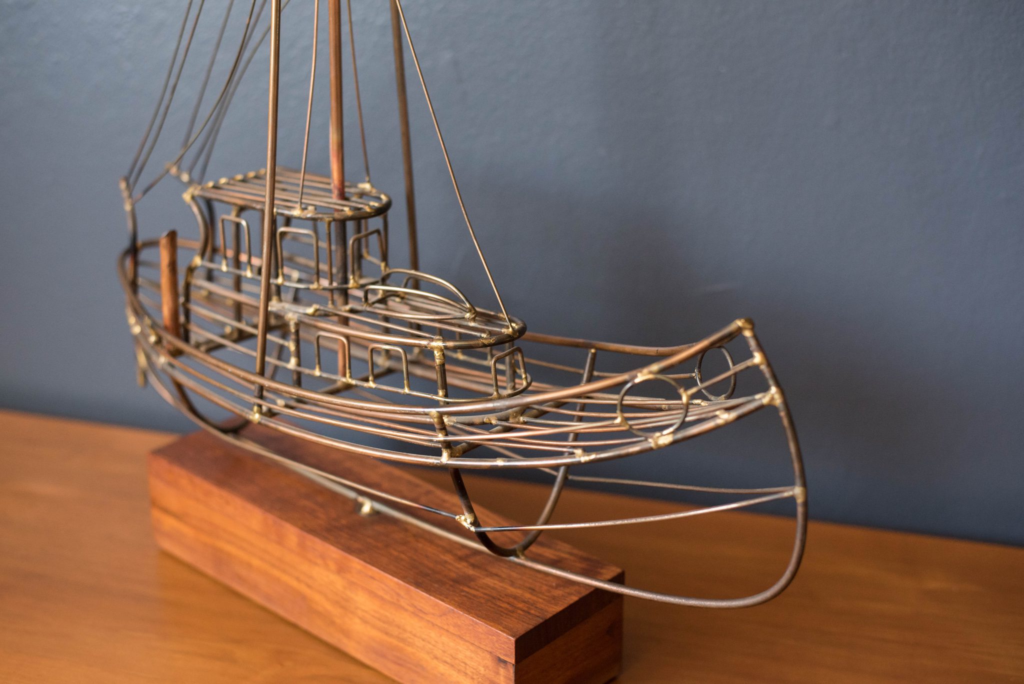 Mid-Century sailboat sculpture in brass, circa 1960s. This piece stands on a walnut base and displays vintage patina.