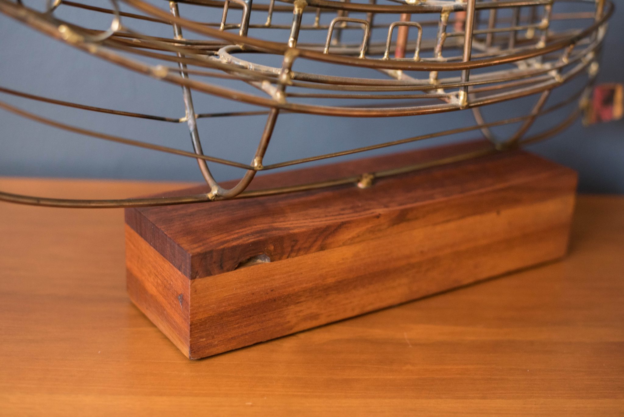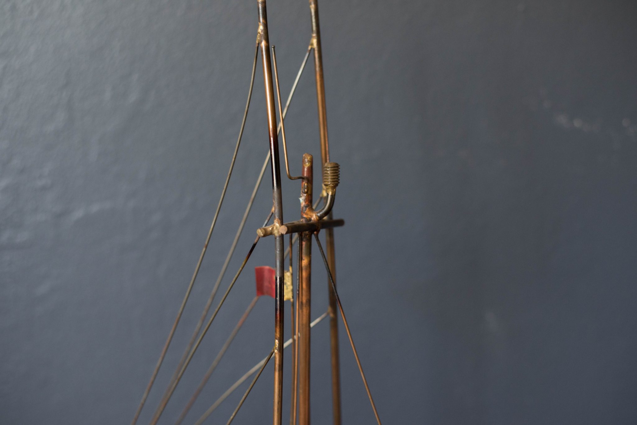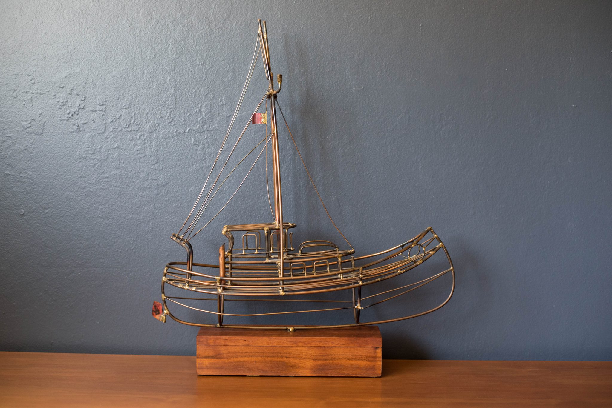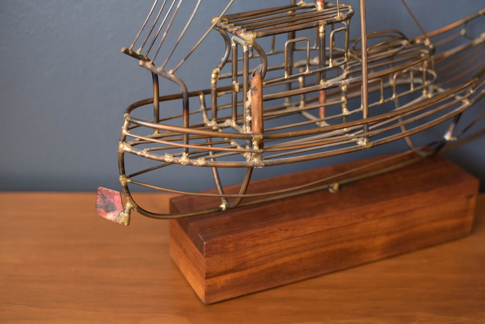 Mid-Century sailboat sculpture in brass, circa 1960s. This piece stands on a walnut base and displays vintage patina.