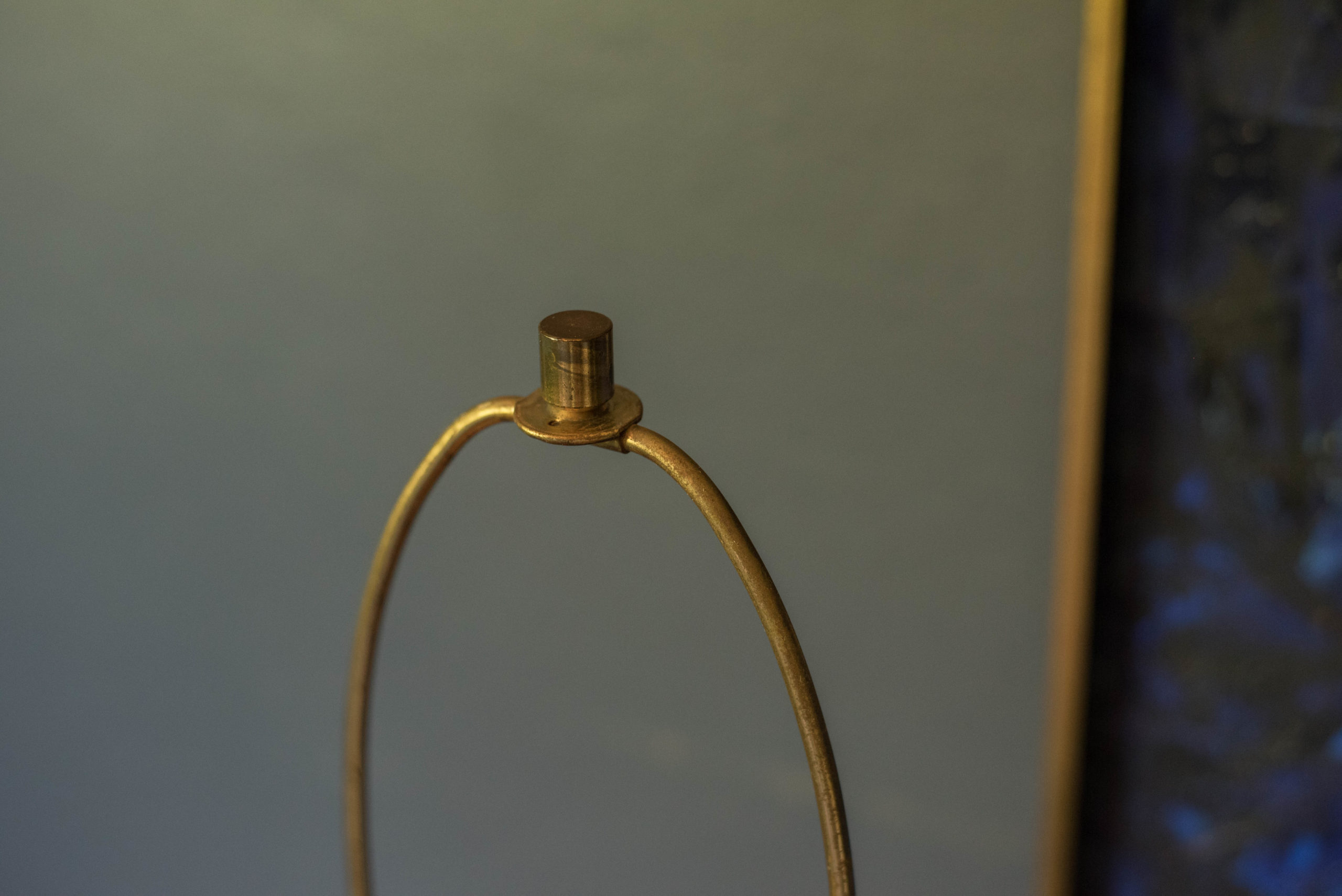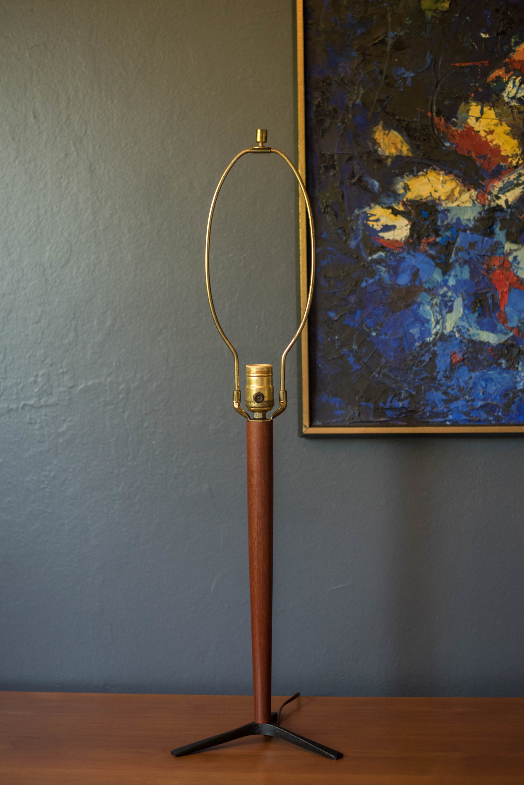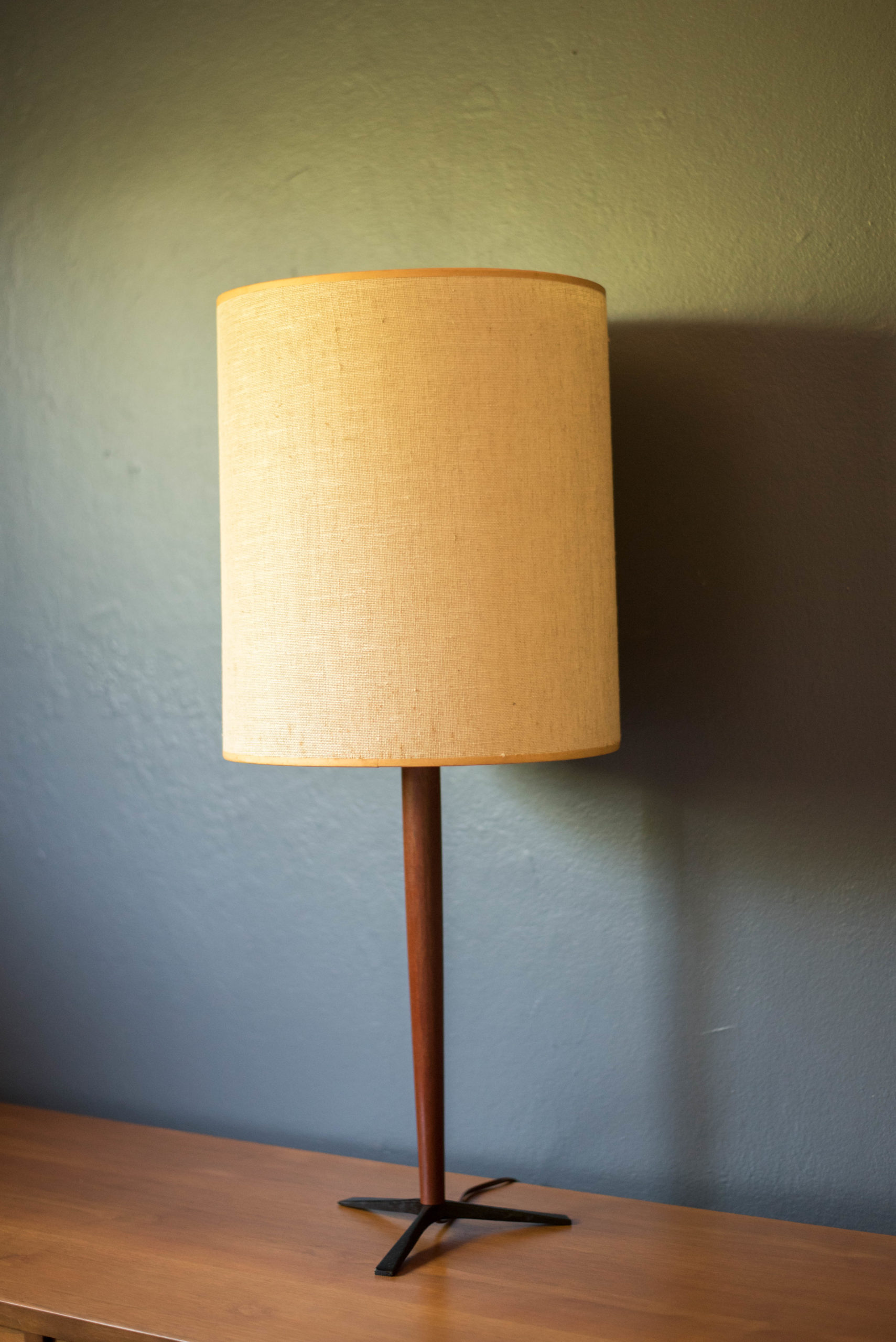 Vintage sculptural accent table lamp in teak circa 1960’s. This unique piece features a weighted black iron tripod base equipped with a three-way switch mechanism. Drum shade is not included.