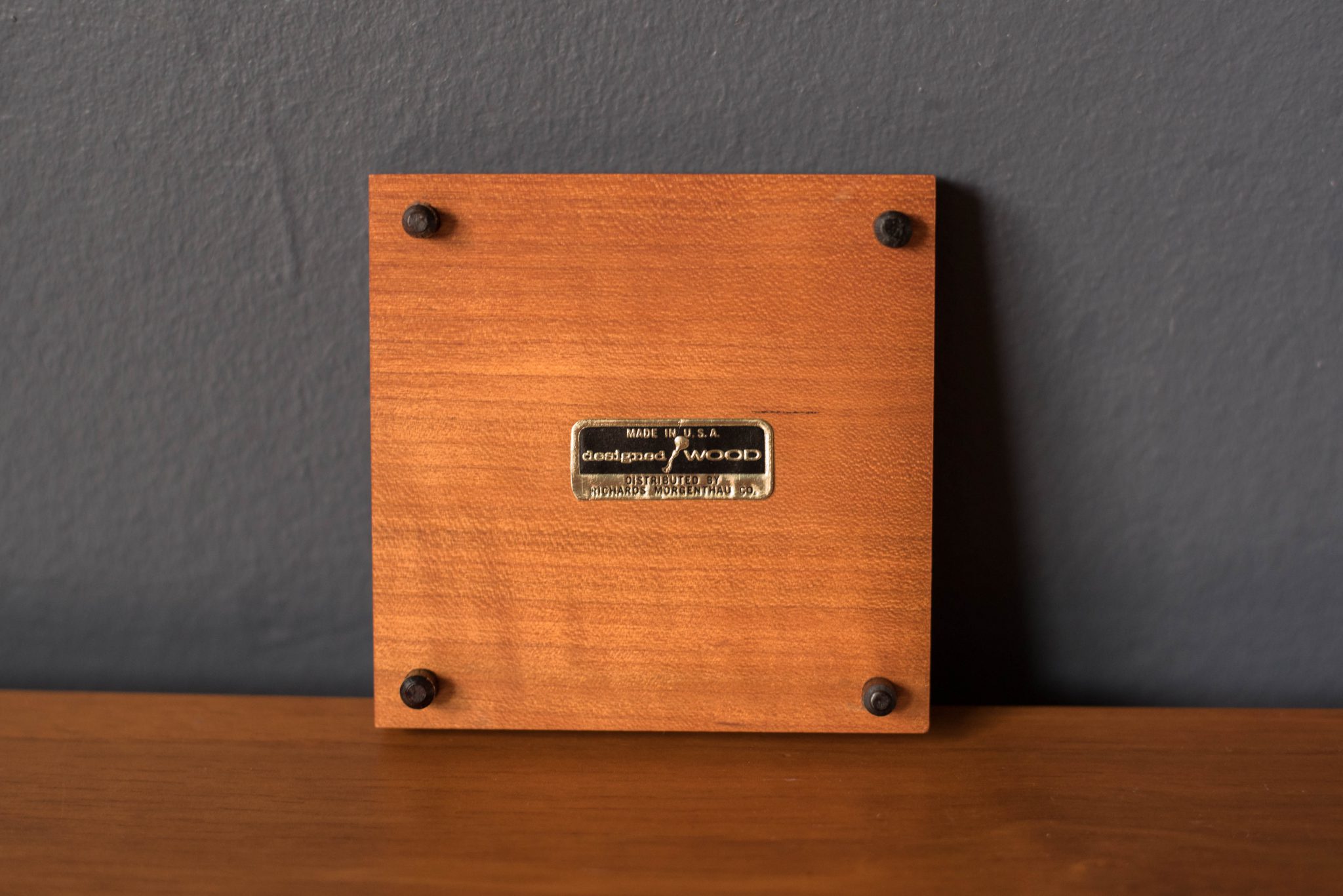 Vintage set of American designed stackable coasters distributed by Richards Morgenthau Co. c. 1950’s. This set includes 4 coasters in walnut, oak, cherry, and rosewood.