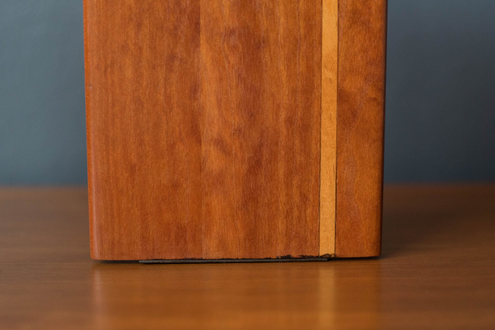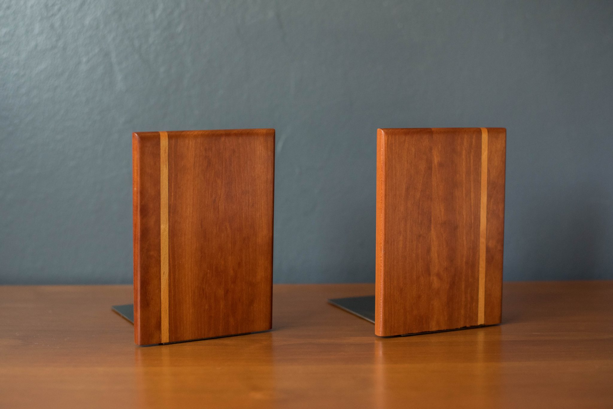 Vintage solid wood studio craft bookends, circa 1960s. This unique pair is made of cherrywood with maple inlay. Perfect to display with any modern or contemporary decor. Price is for the pair.