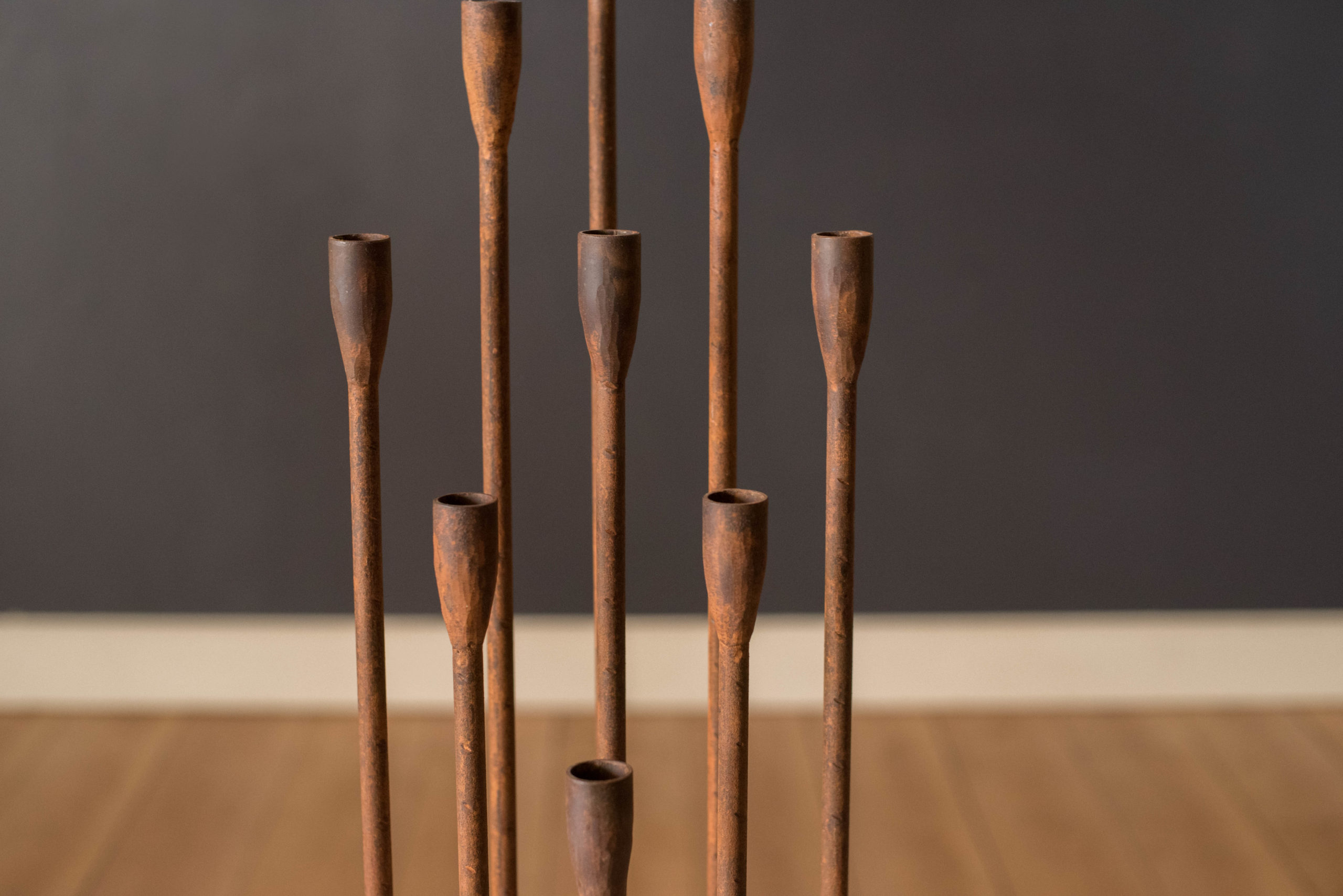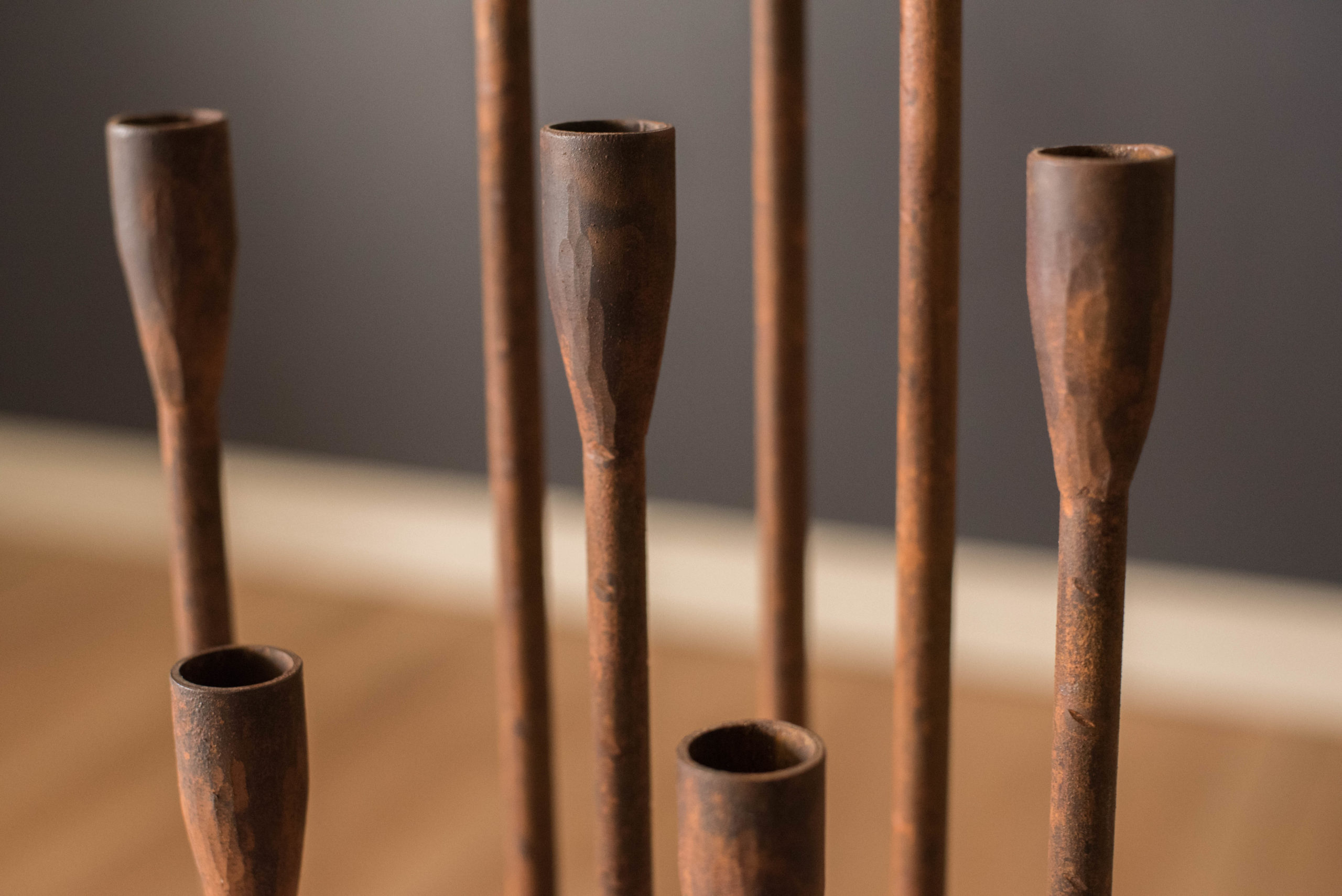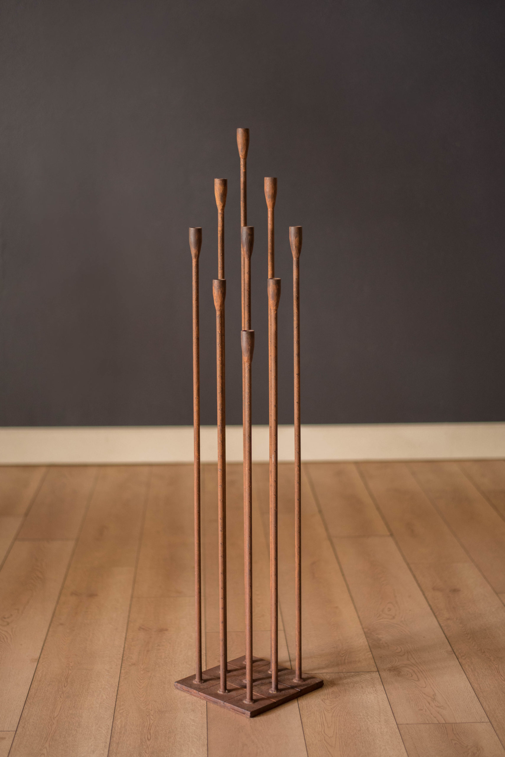 Vintage tall floor standing candelabra circa 1960’s. This decorative statement piece adds depth and character to any space constructed of weighted cast iron. Displays plenty of patina and vintage charm including nine candle holders that fit 3/4″ taper candles. Perfect to use indoor or outdoor and complements well with Mid Century Danish Modern, Brutalist, or Industrial Decor. In good condition with wear such as the patina. See photos.