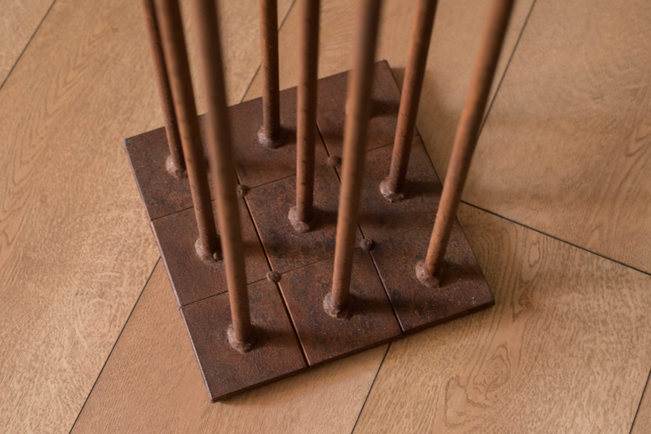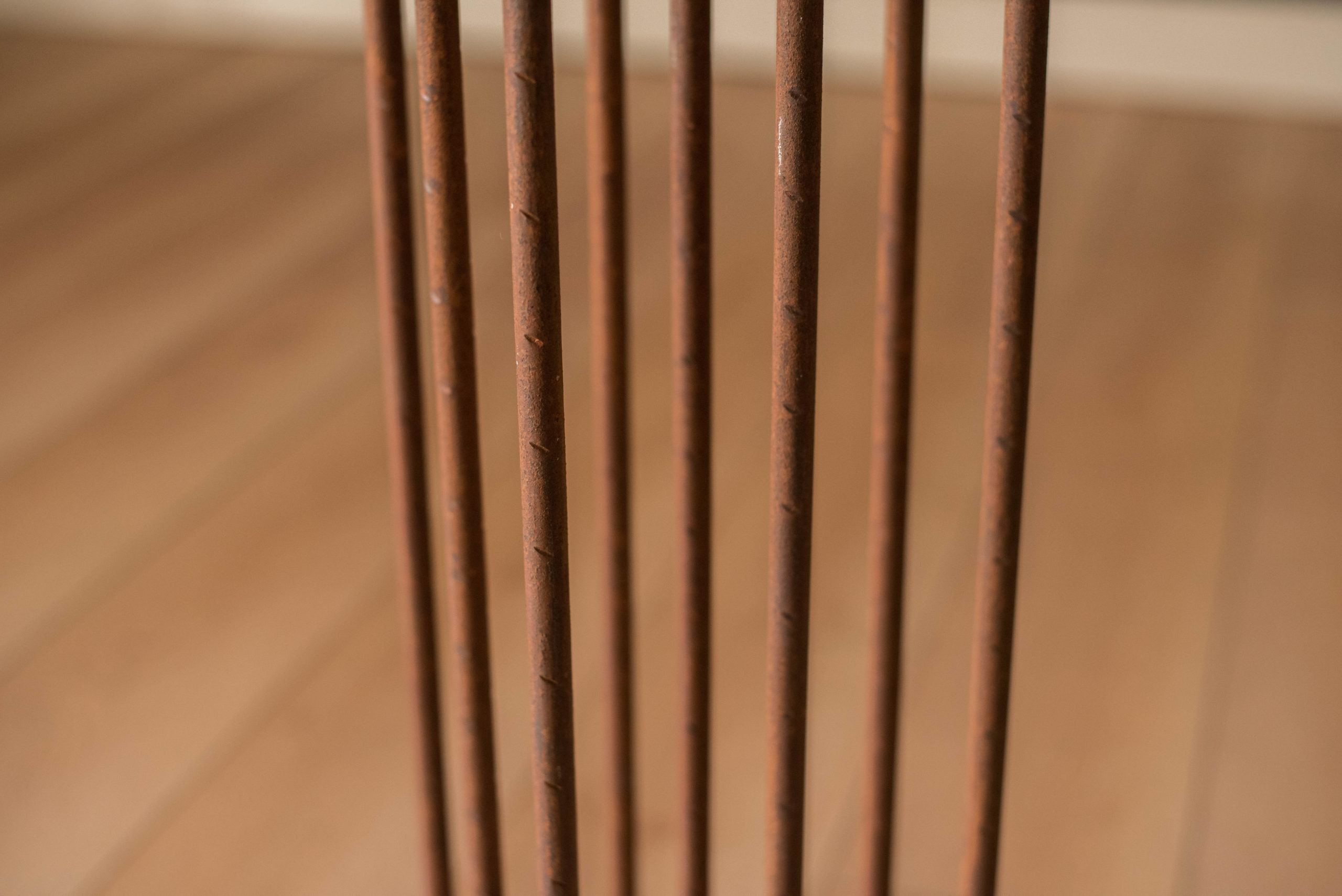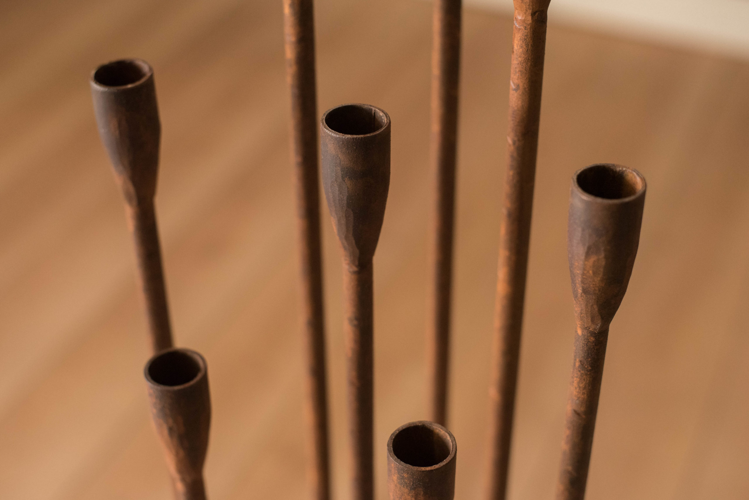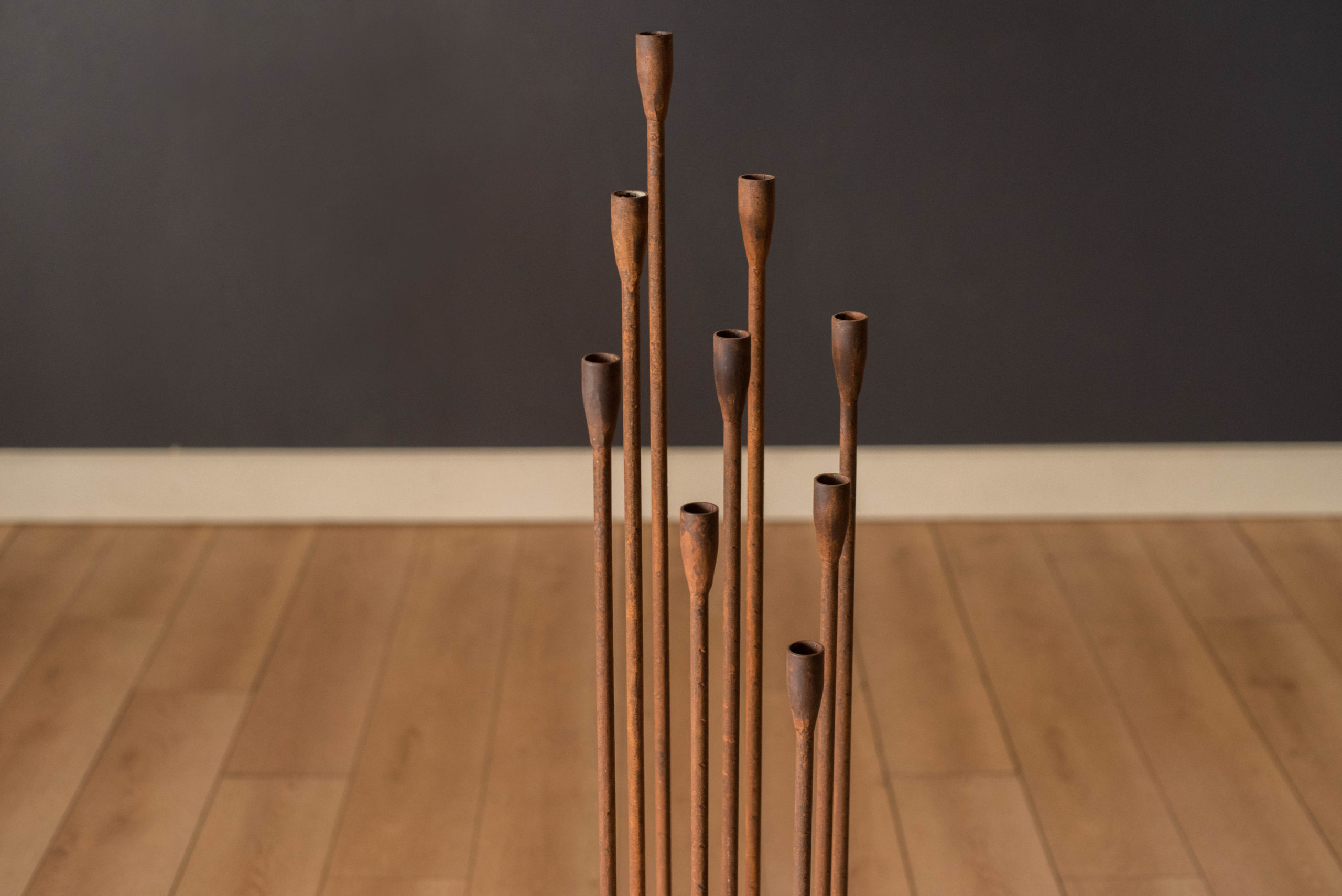 Vintage tall floor standing candelabra circa 1960’s. This decorative statement piece adds depth and character to any space constructed of weighted cast iron. Displays plenty of patina and vintage charm including nine candle holders that fit 3/4″ taper candles. Perfect to use indoor or outdoor and complements well with Mid Century Danish Modern, Brutalist, or Industrial Decor. In good condition with wear such as the patina. See photos.