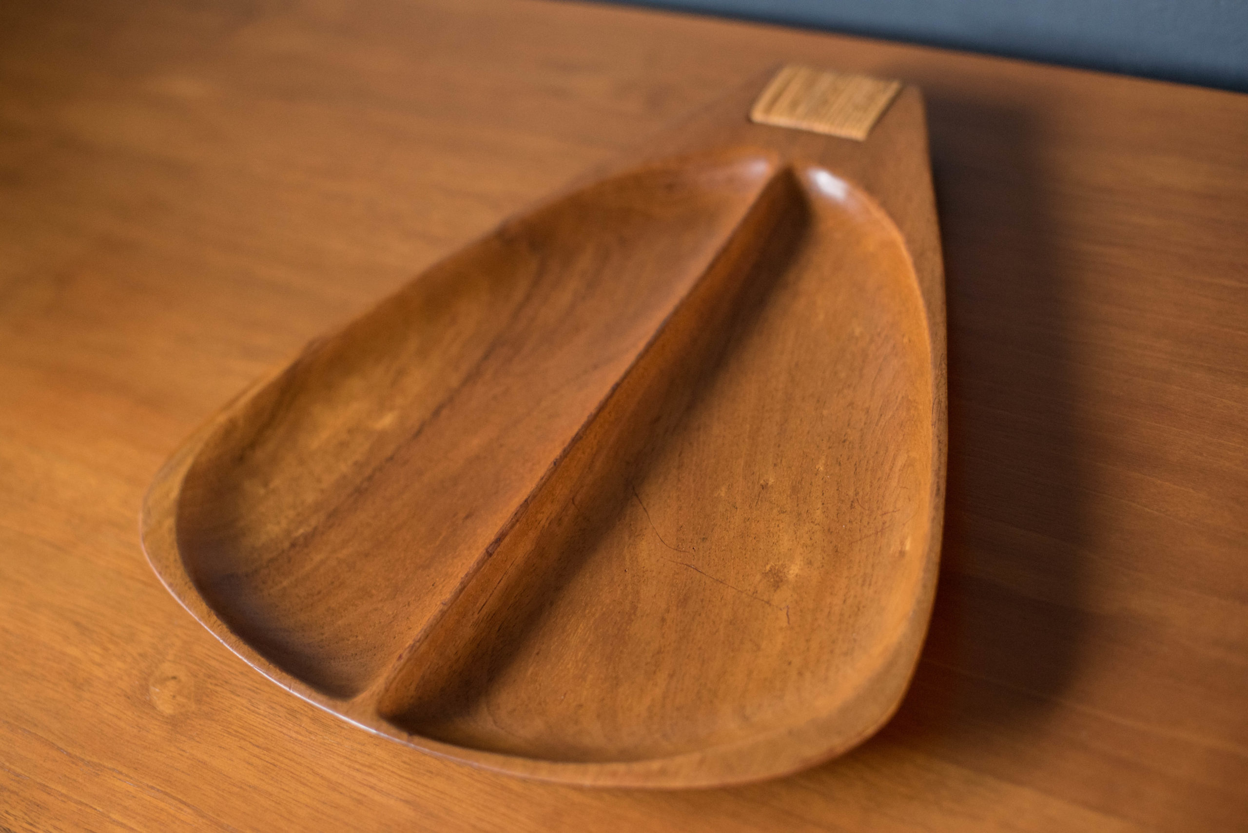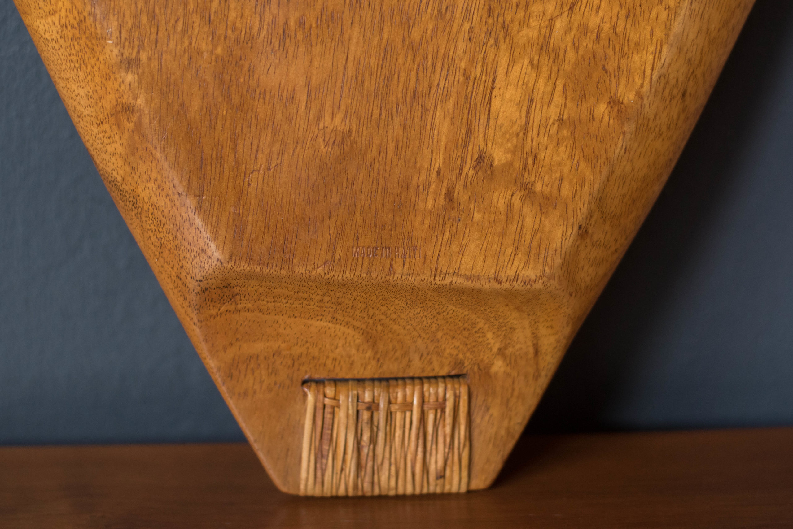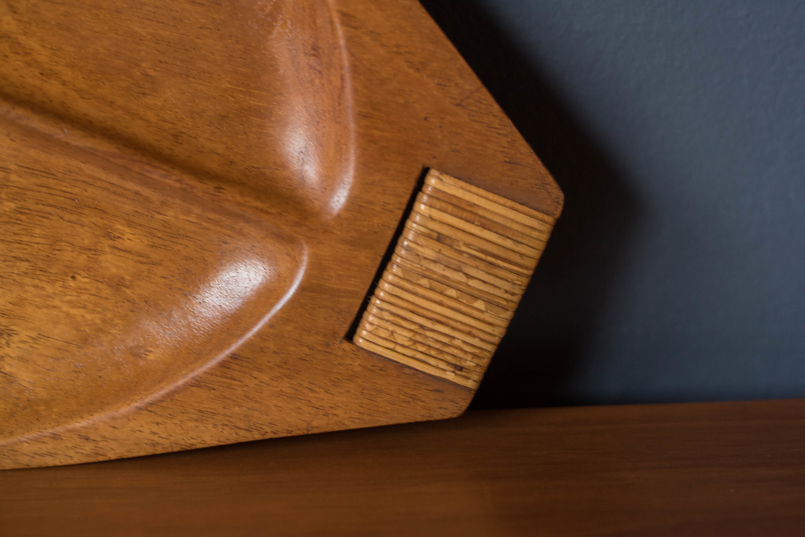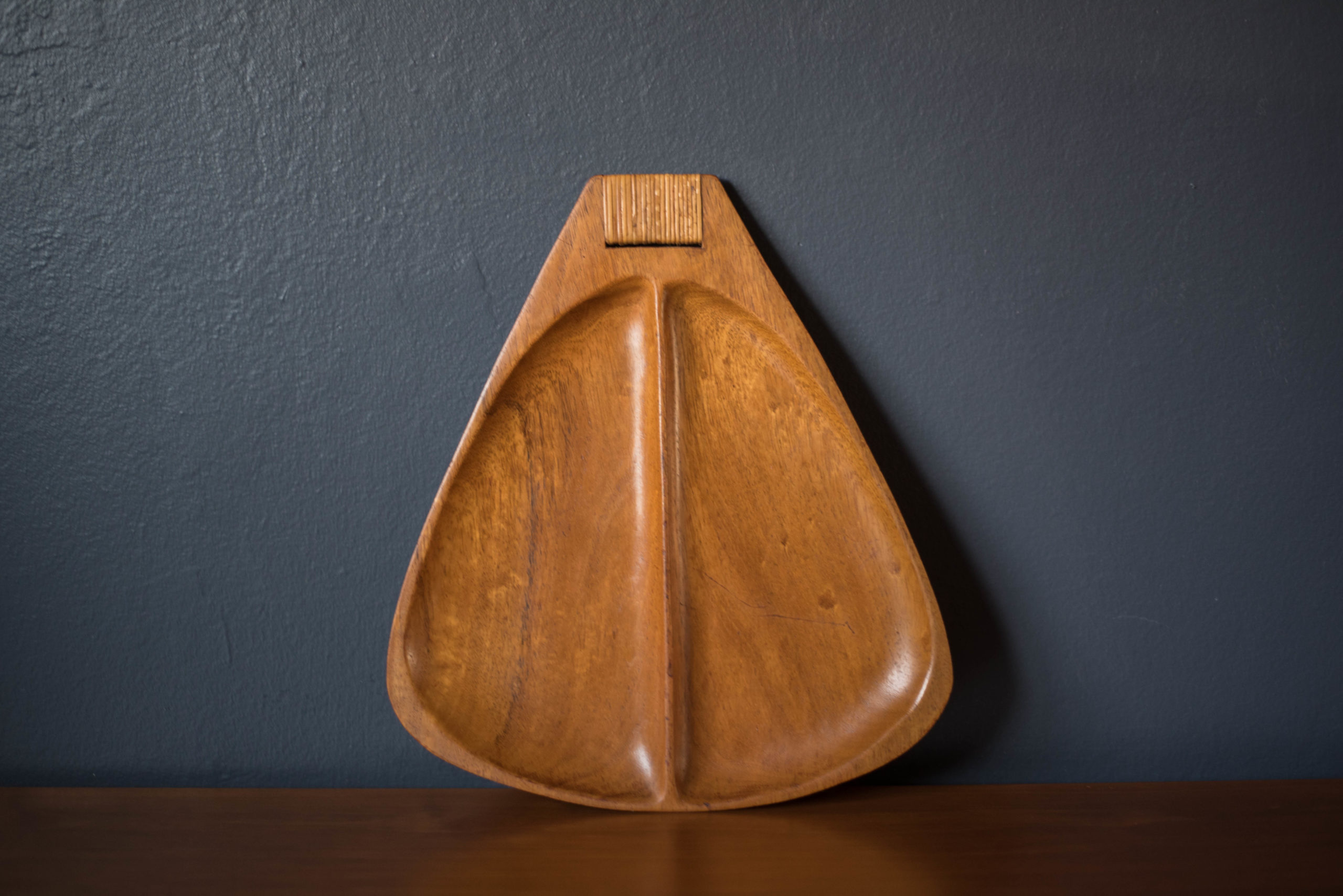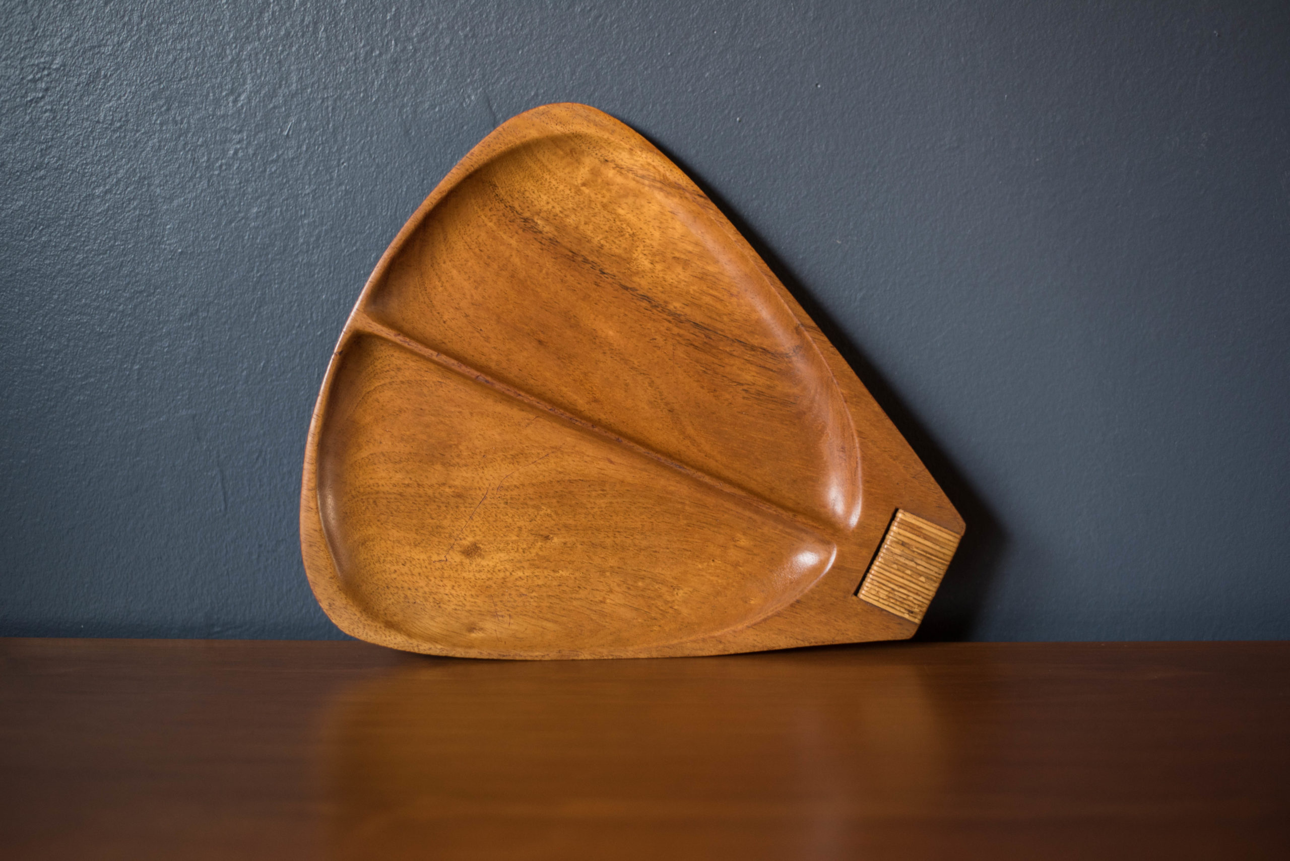 Vintage serving platter tray designed by Arthur Umanoff for Raymor, circa 1960’s. This solid piece is made out of Taverneau wood and features a woven reed handle.
