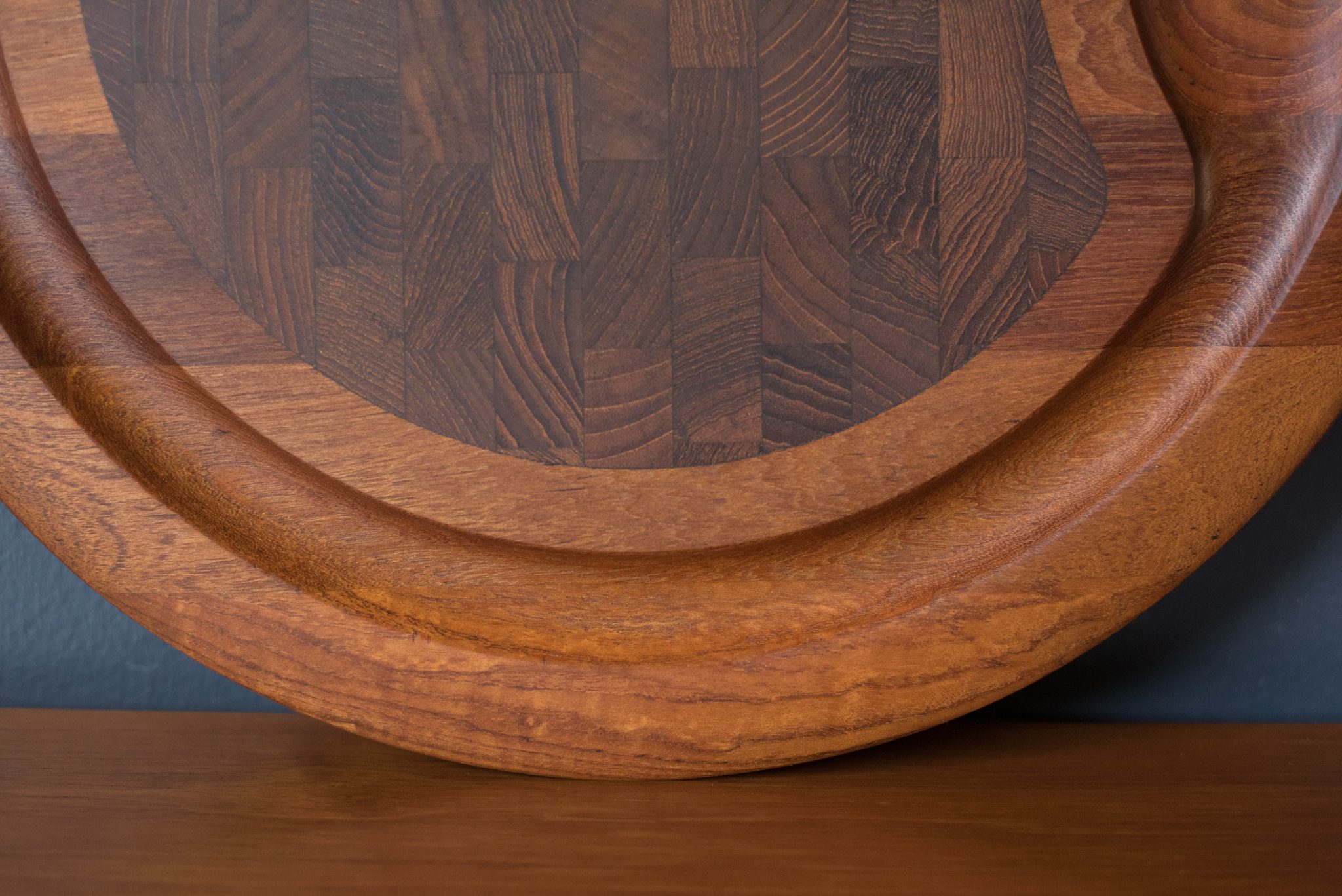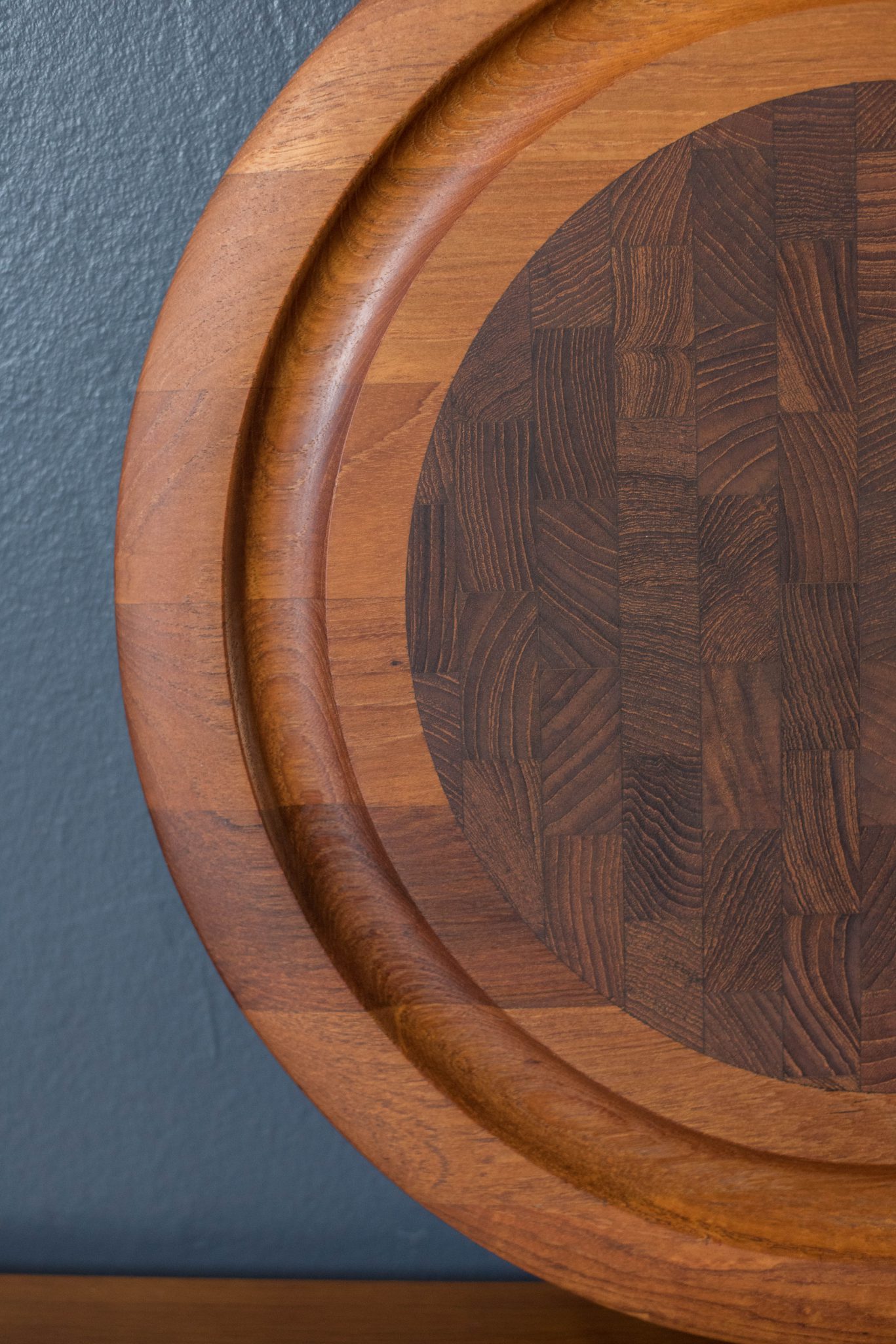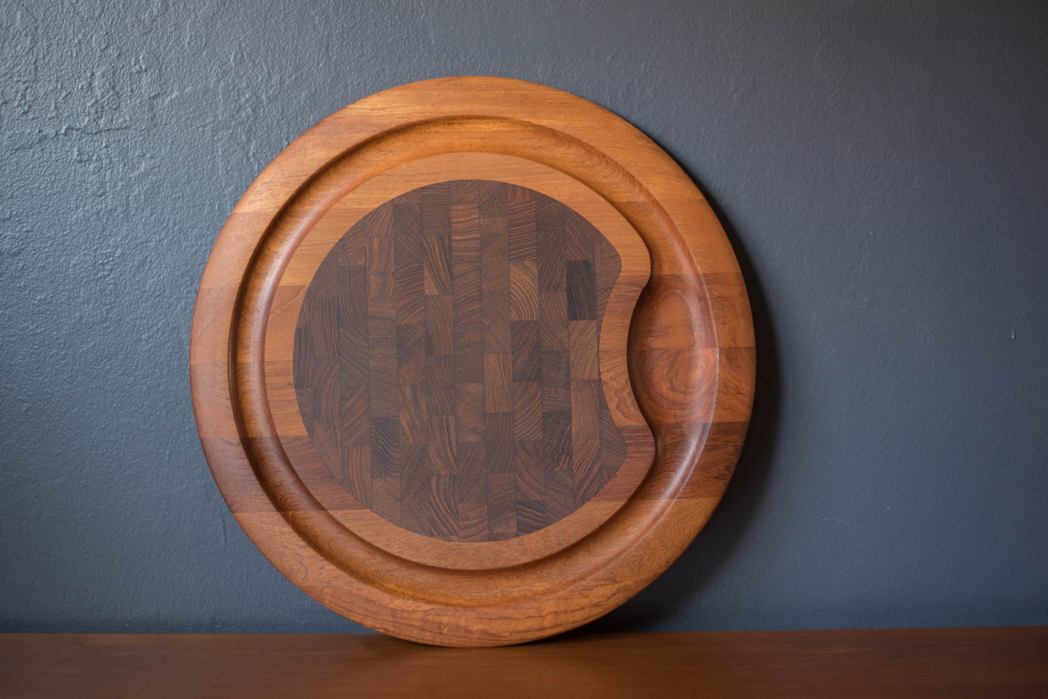 Vintage Danish round cutting board tray in teak designed by Jens Quistgaard for Dansk. This collectible piece is crafted of thick solid planked teak with deep grooves intended to use as a prep work board and serving dish. Features a hardwood end grain center useful for cutting or can be displayed as a decorative accent.