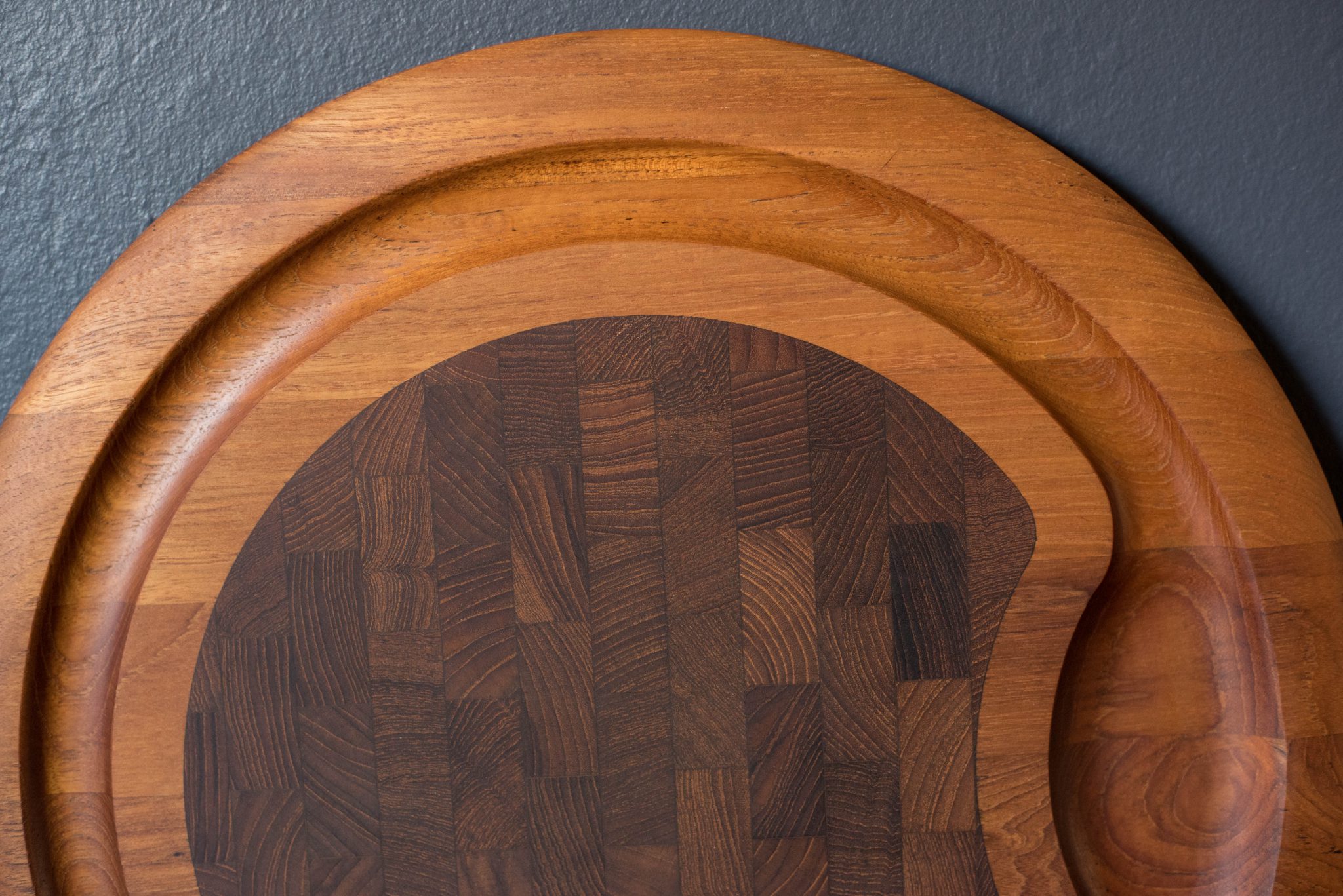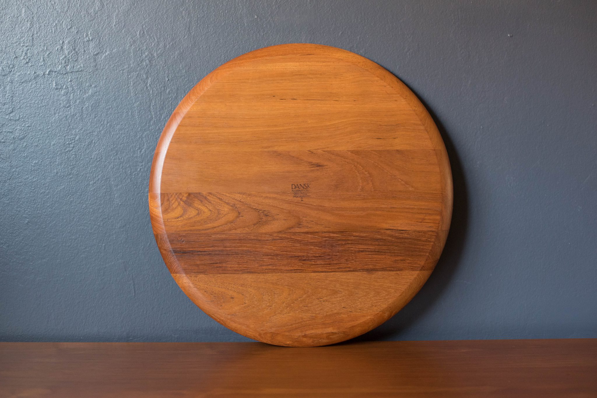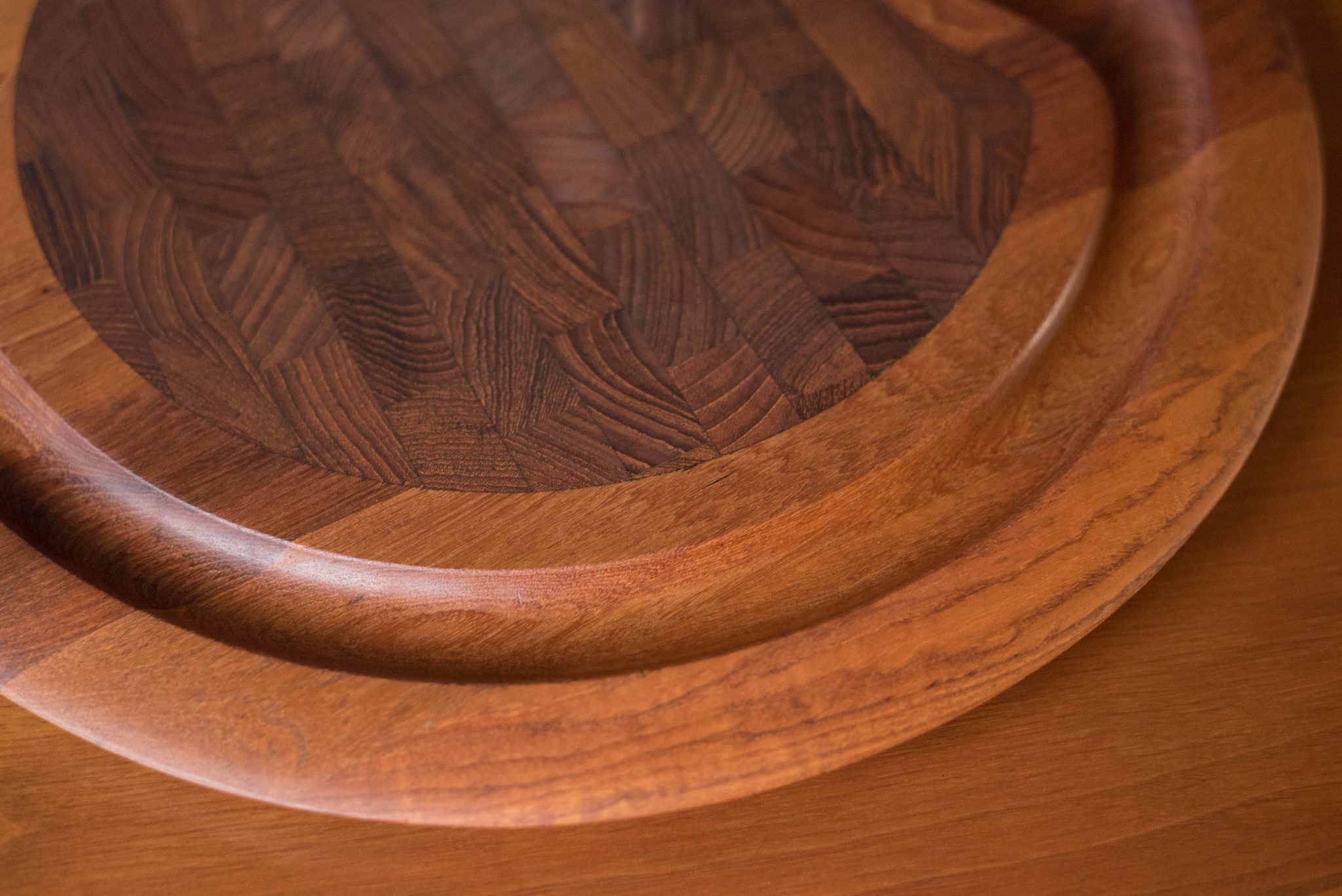Vintage Danish round cutting board tray in teak designed by Jens Quistgaard for Dansk. This collectible piece is crafted of thick solid planked teak with deep grooves intended to use as a prep work board and serving dish. Features a hardwood end grain center useful for cutting or can be displayed as a decorative accent.
