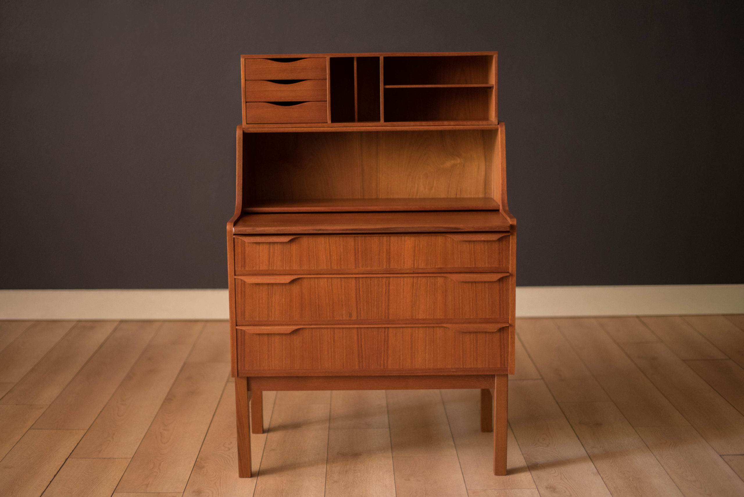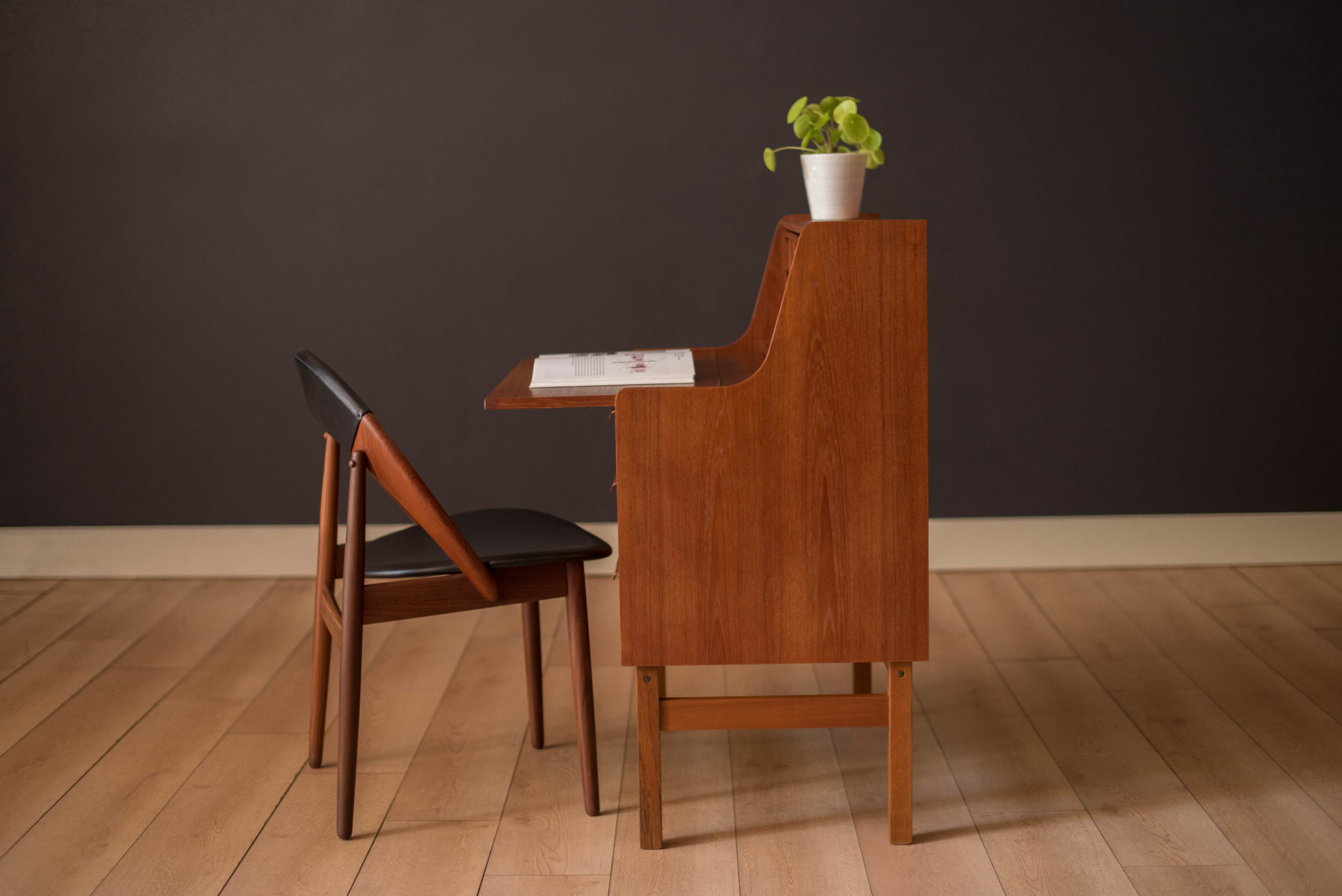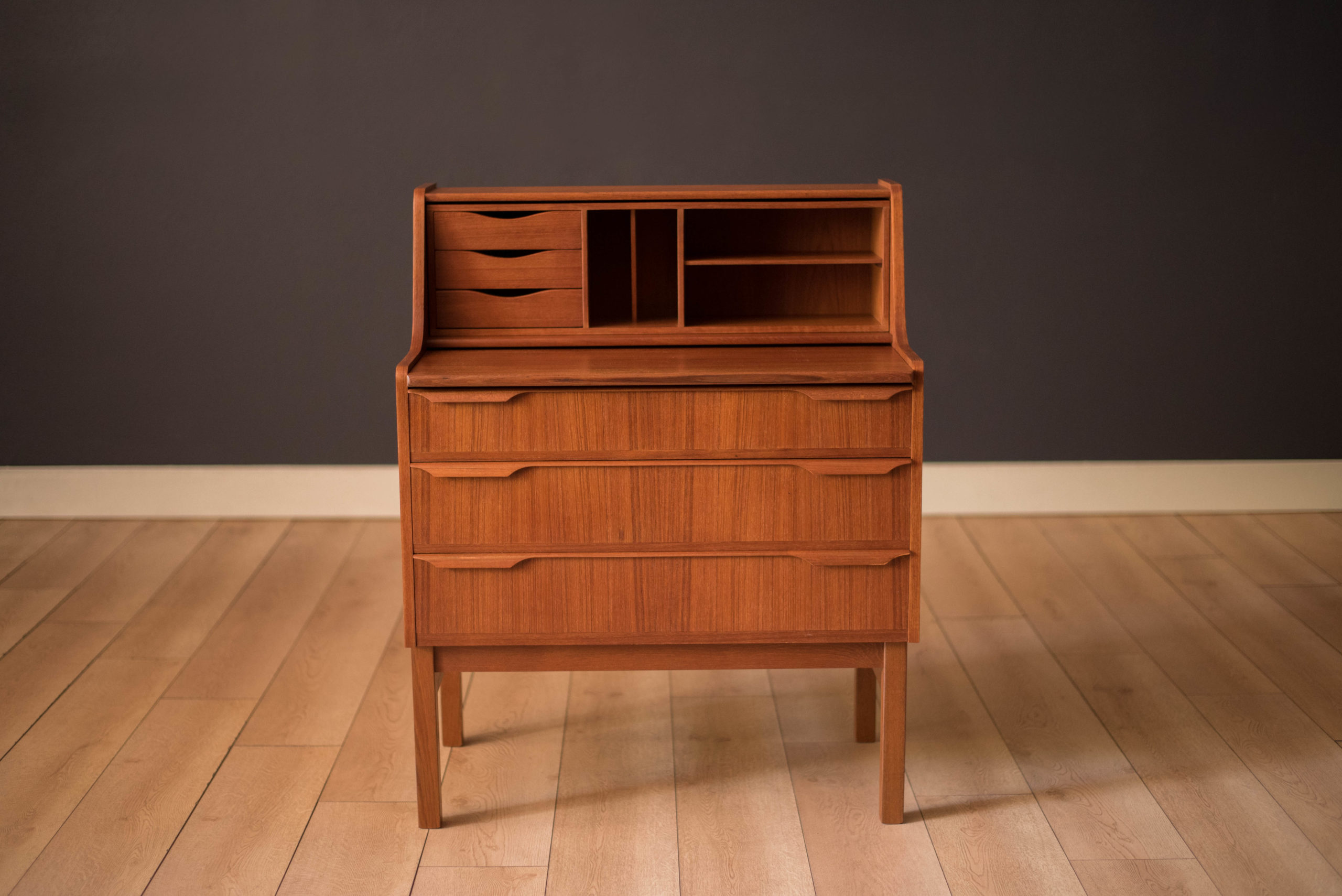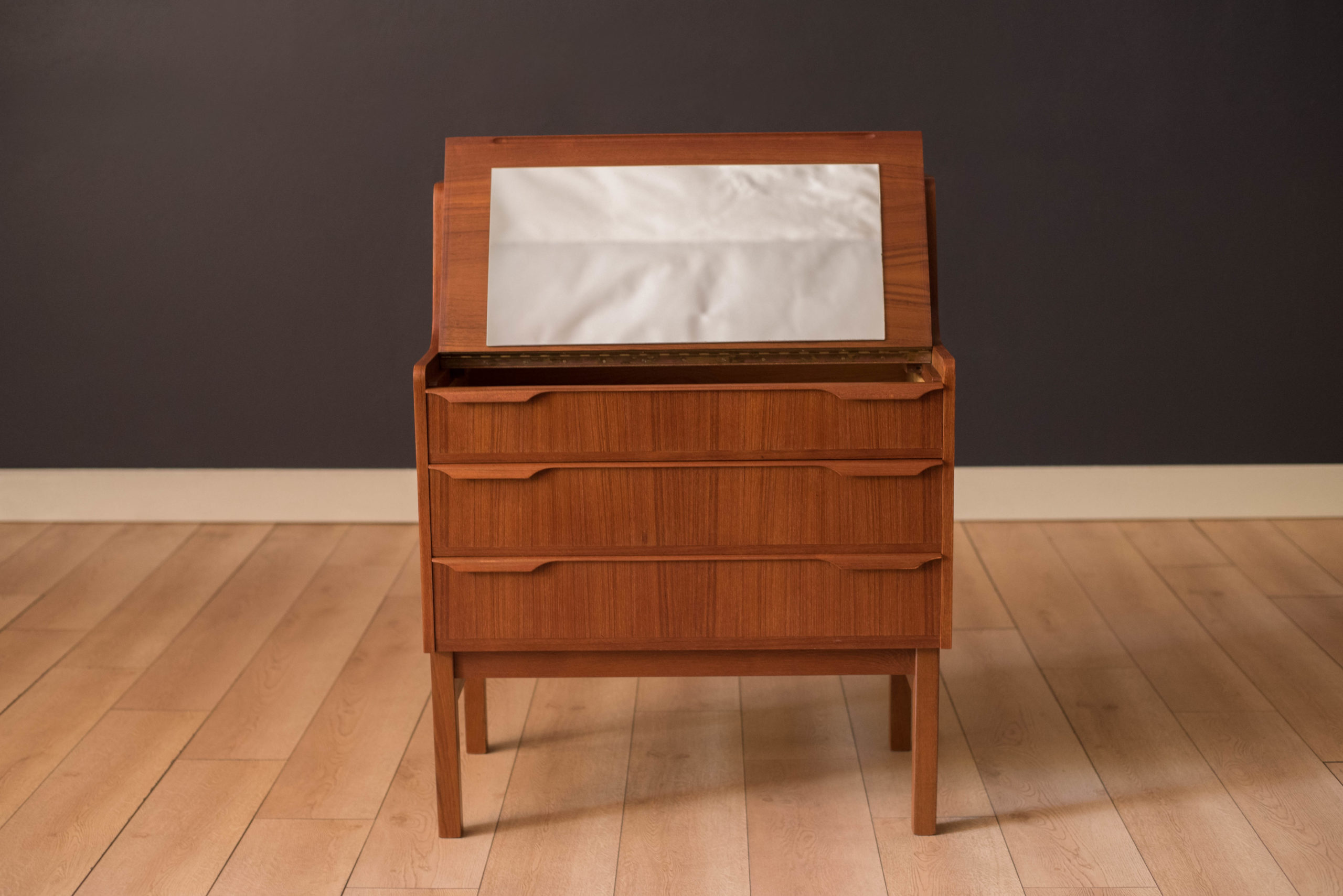 Vintage secretary desk with chest of drawers in teak manufactured by Trekanten, Denmark. Features a hidden mirror vanity slide out desk to maximize space and three dovetailed storage drawers with sculpted pulls. This versatile piece includes a removable organizing cubby space equipped with shelving and three additional teak drawers.