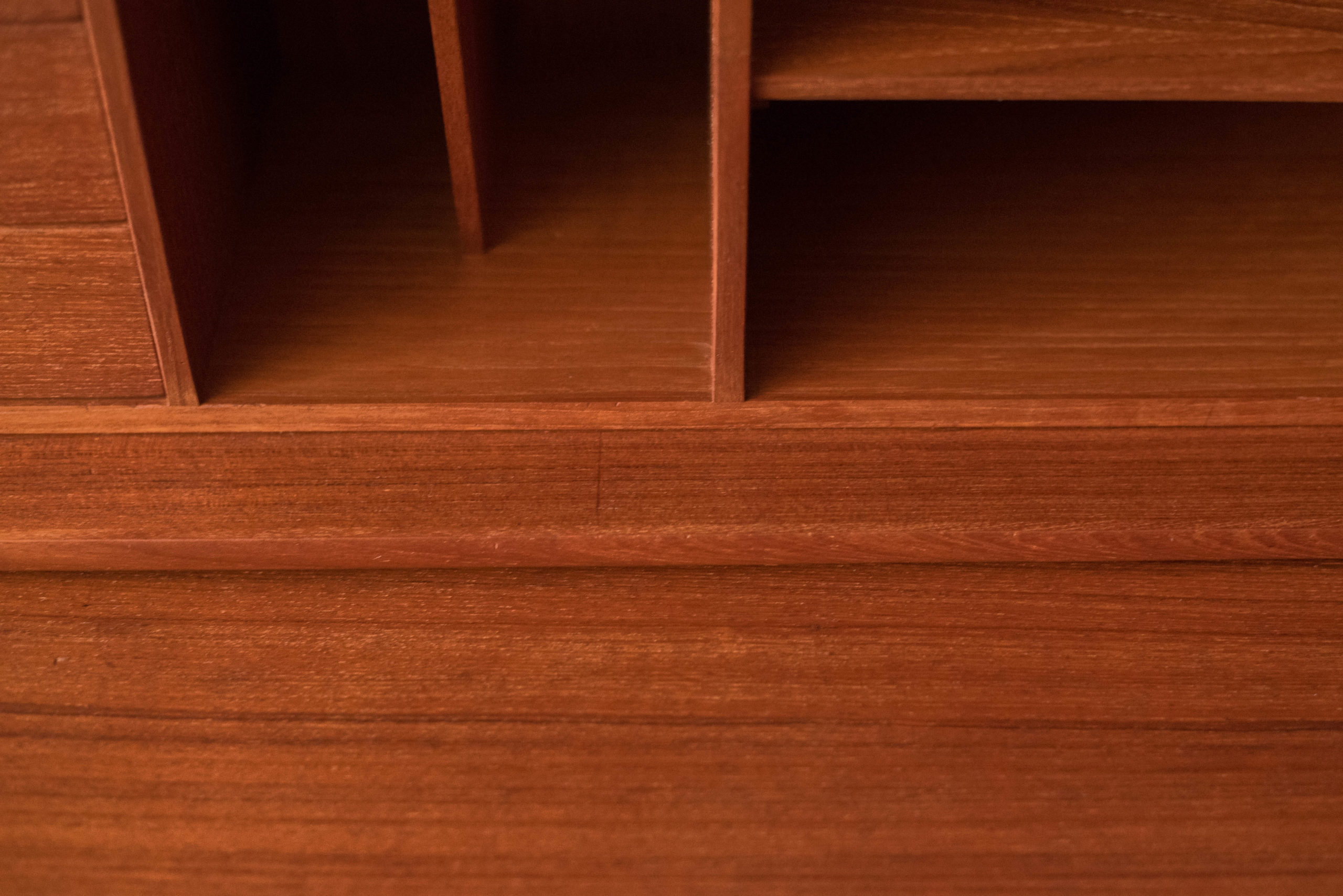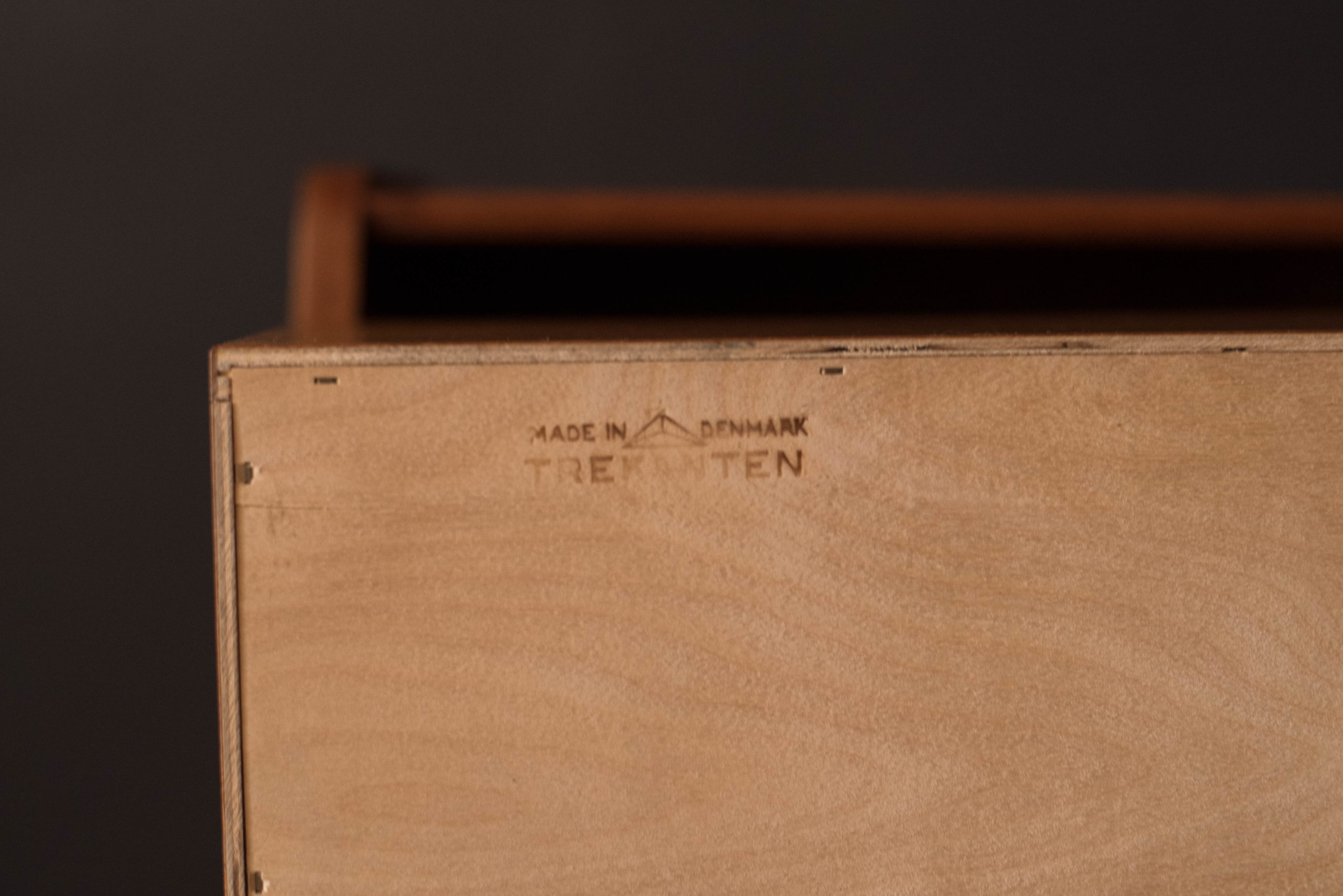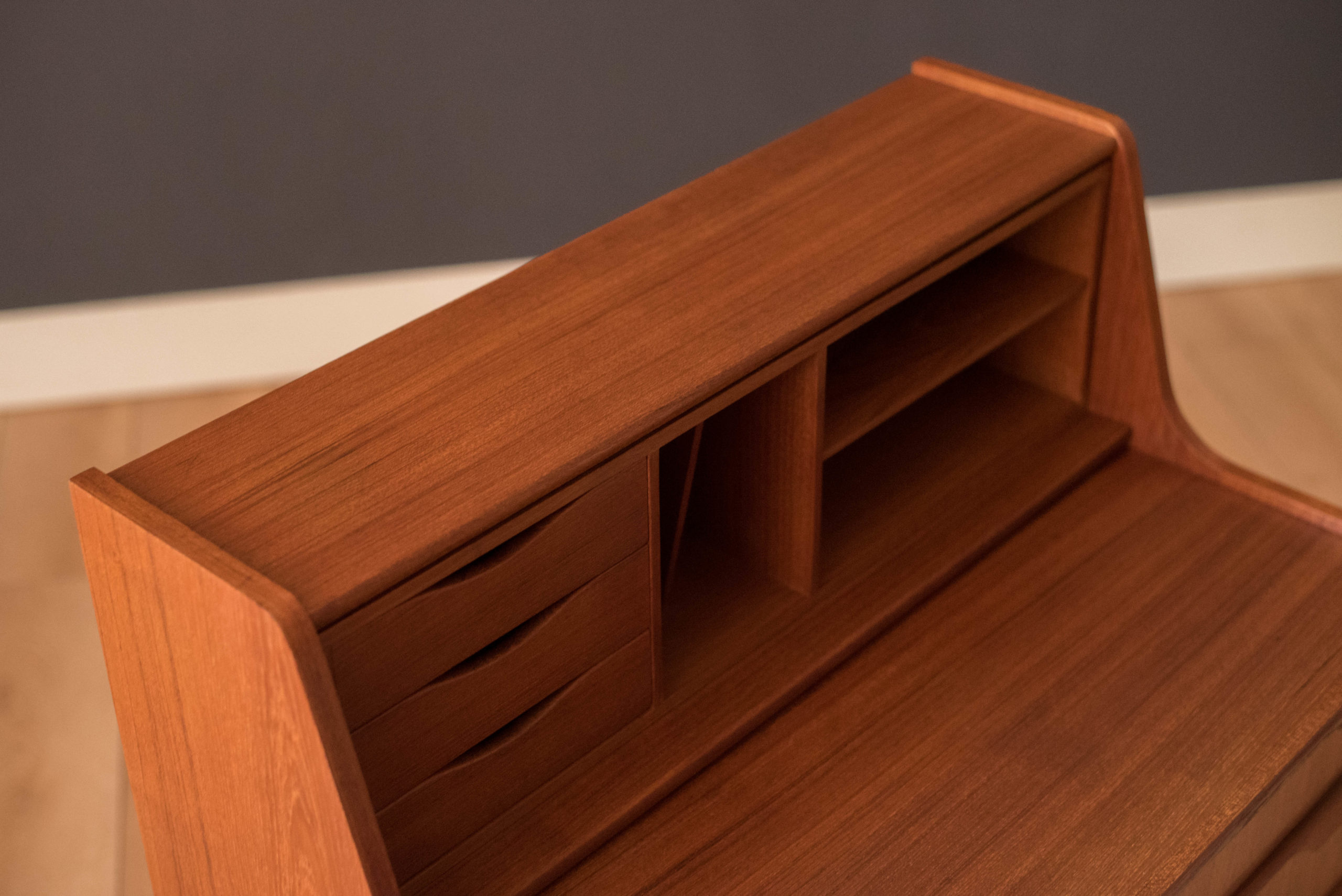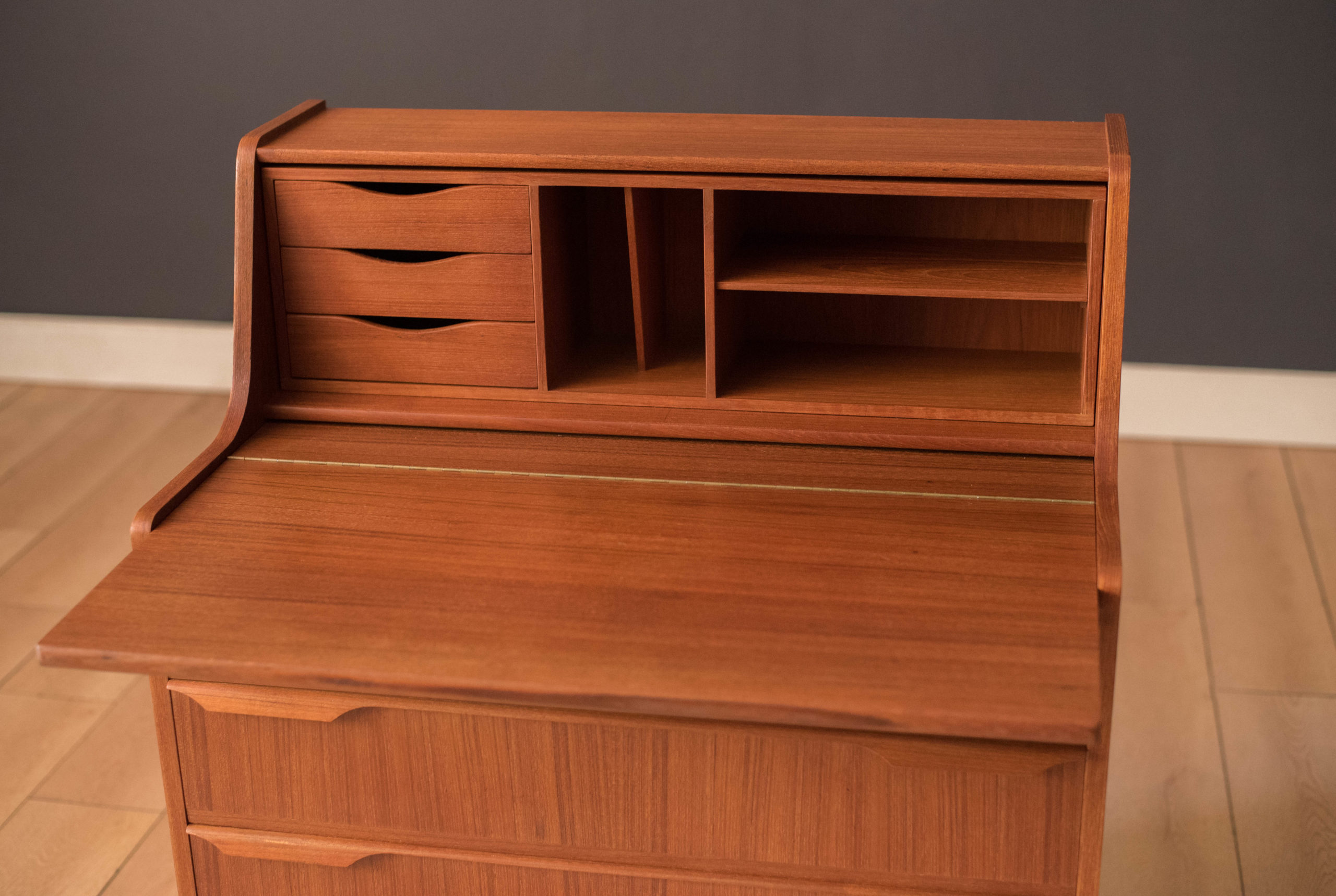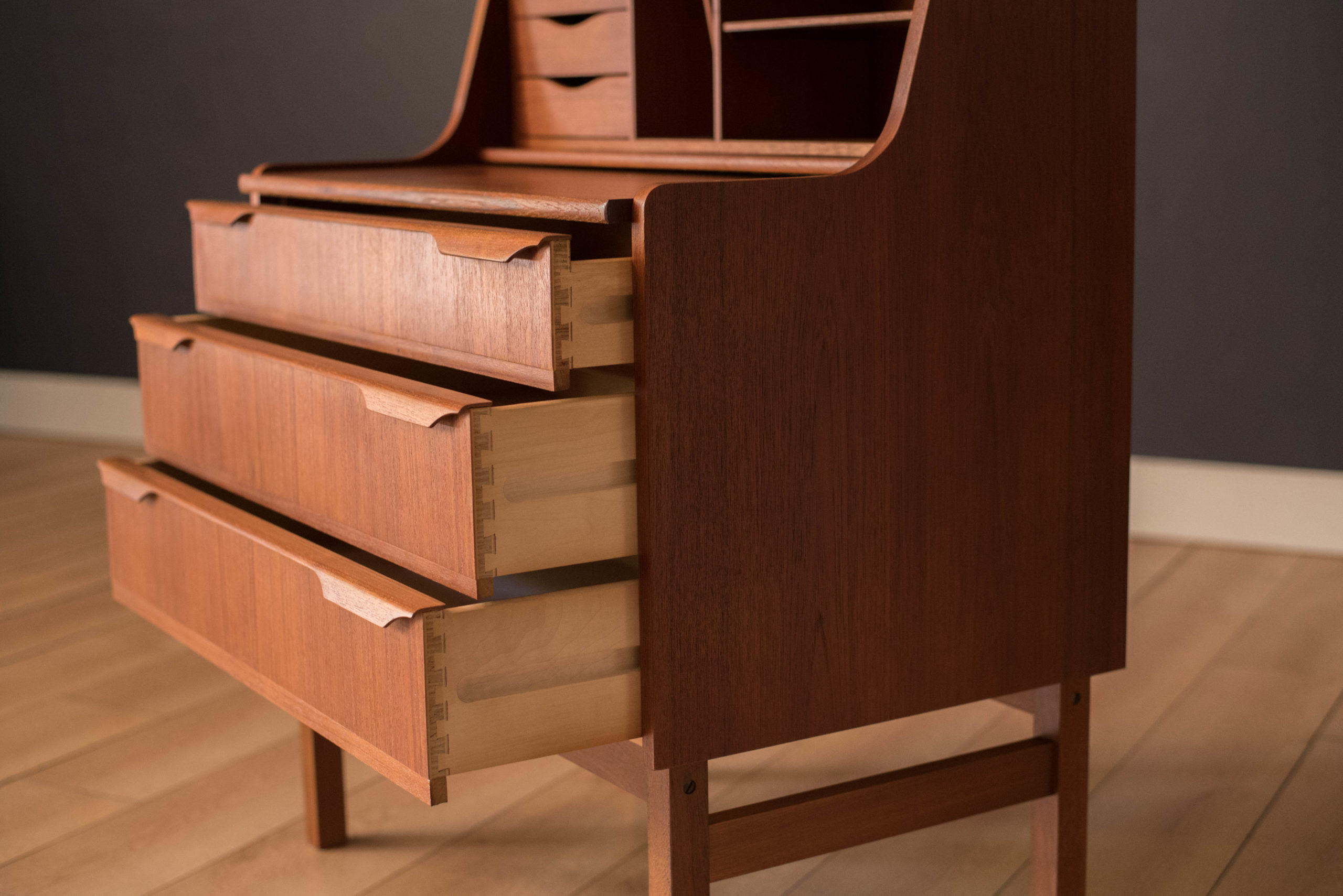 Vintage secretary desk with chest of drawers in teak manufactured by Trekanten, Denmark. Features a hidden mirror vanity slide out desk to maximize space and three dovetailed storage drawers with sculpted pulls. This versatile piece includes a removable organizing cubby space equipped with shelving and three additional teak drawers.
