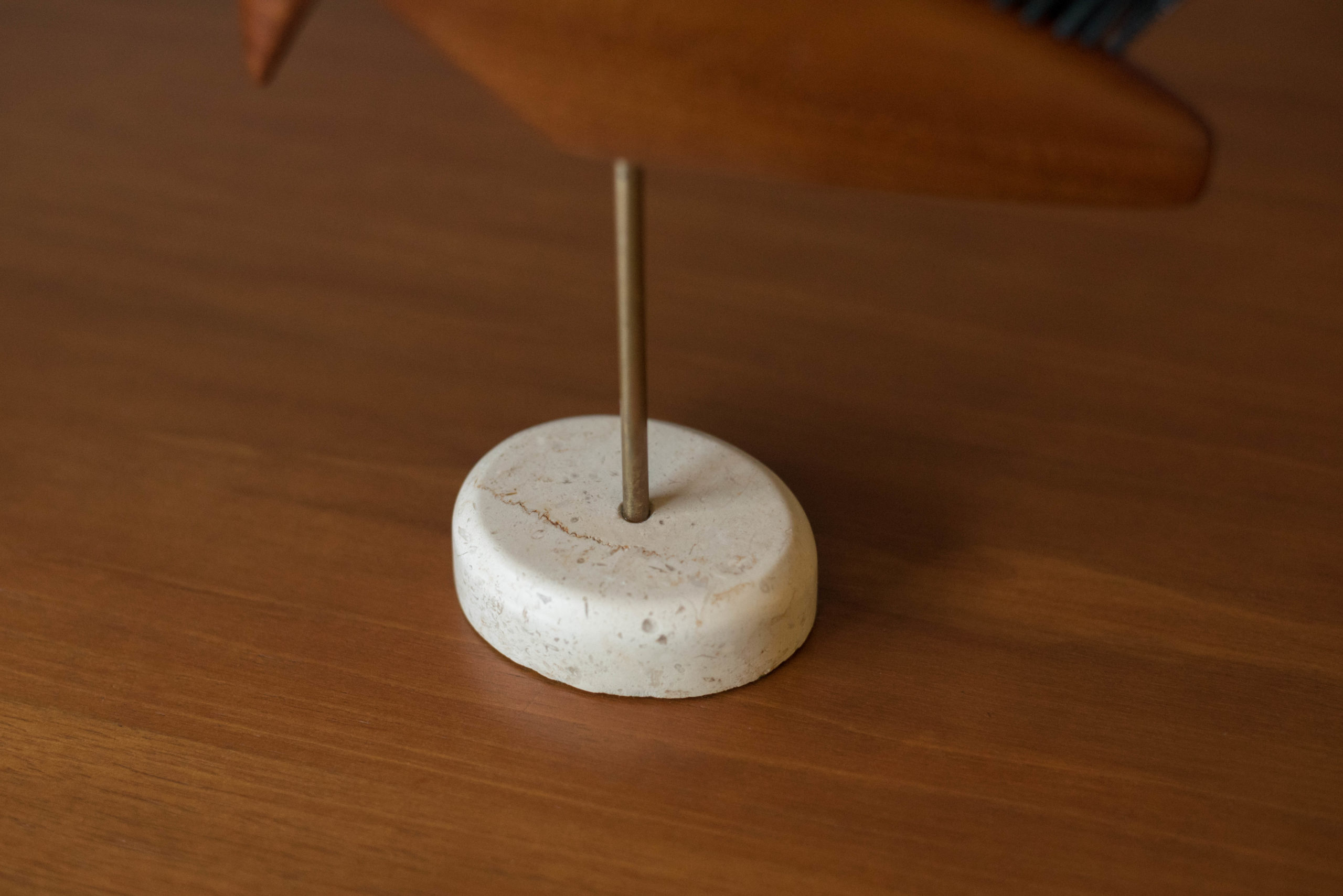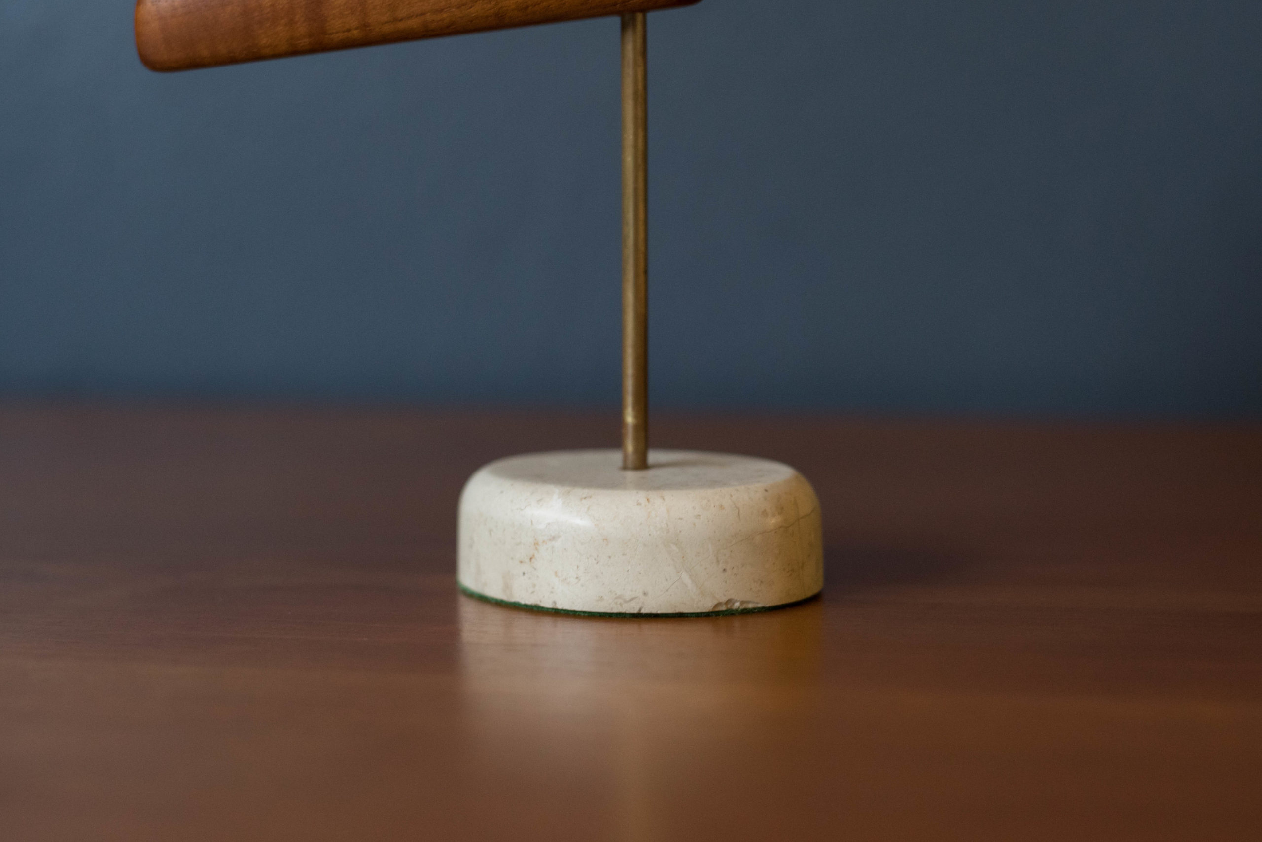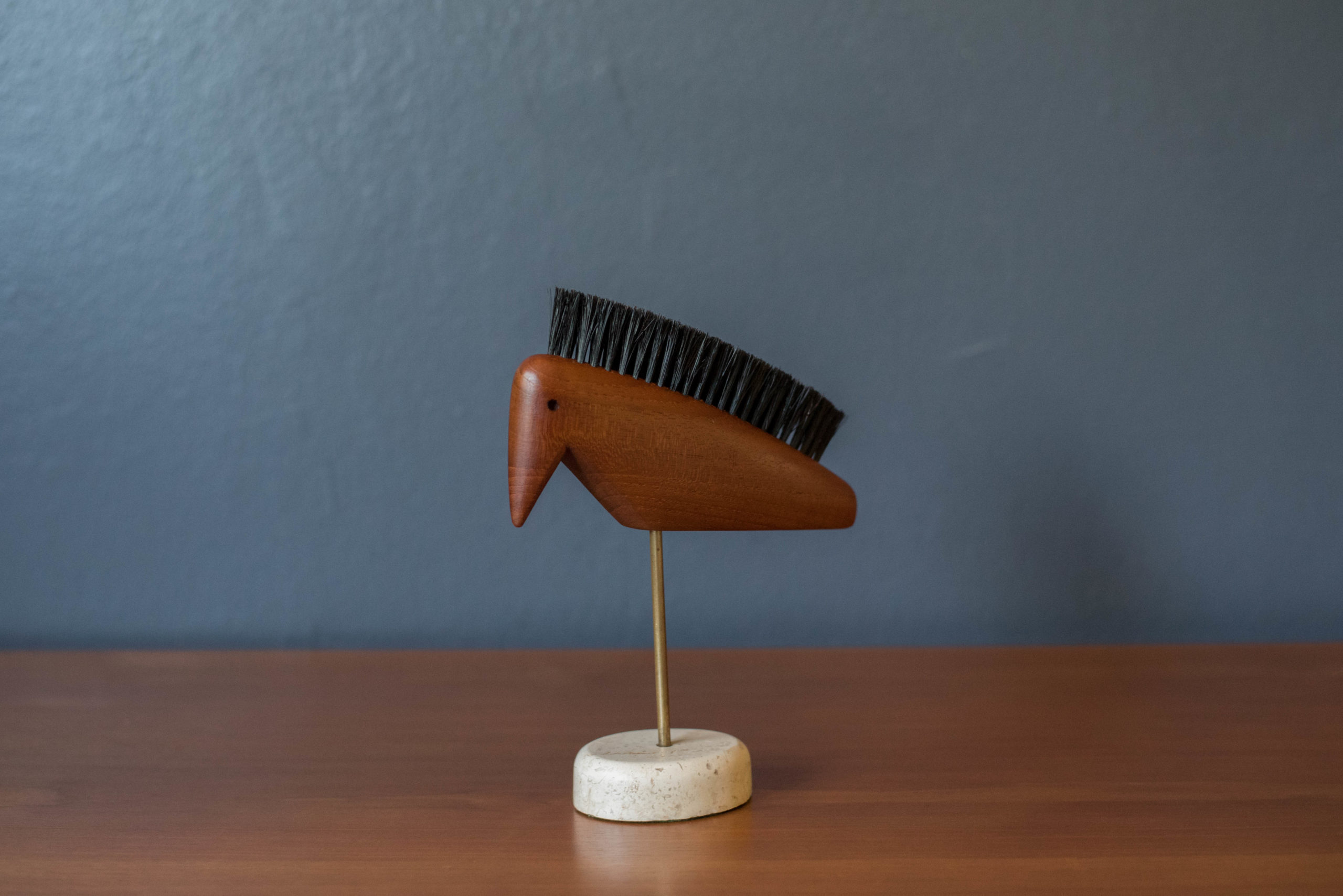Vintage Danish modern abstract animal bird shoe brush in teak, circa 1960’s. This piece has been very well kept and includes the hair bristles for cleaning. Sculpture is displayed on a travertine stone base. In good condition with wear such as small chip on the stone base. See photos.
