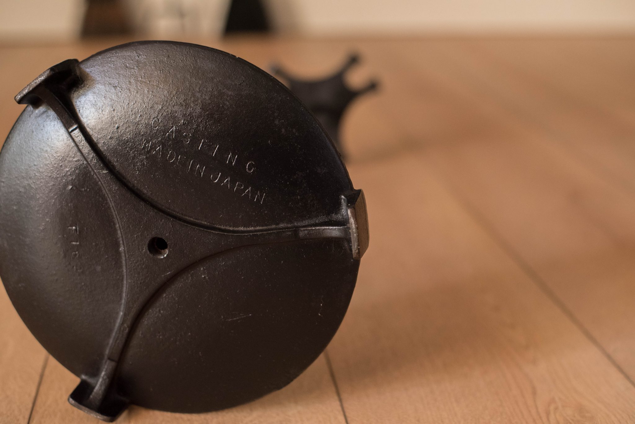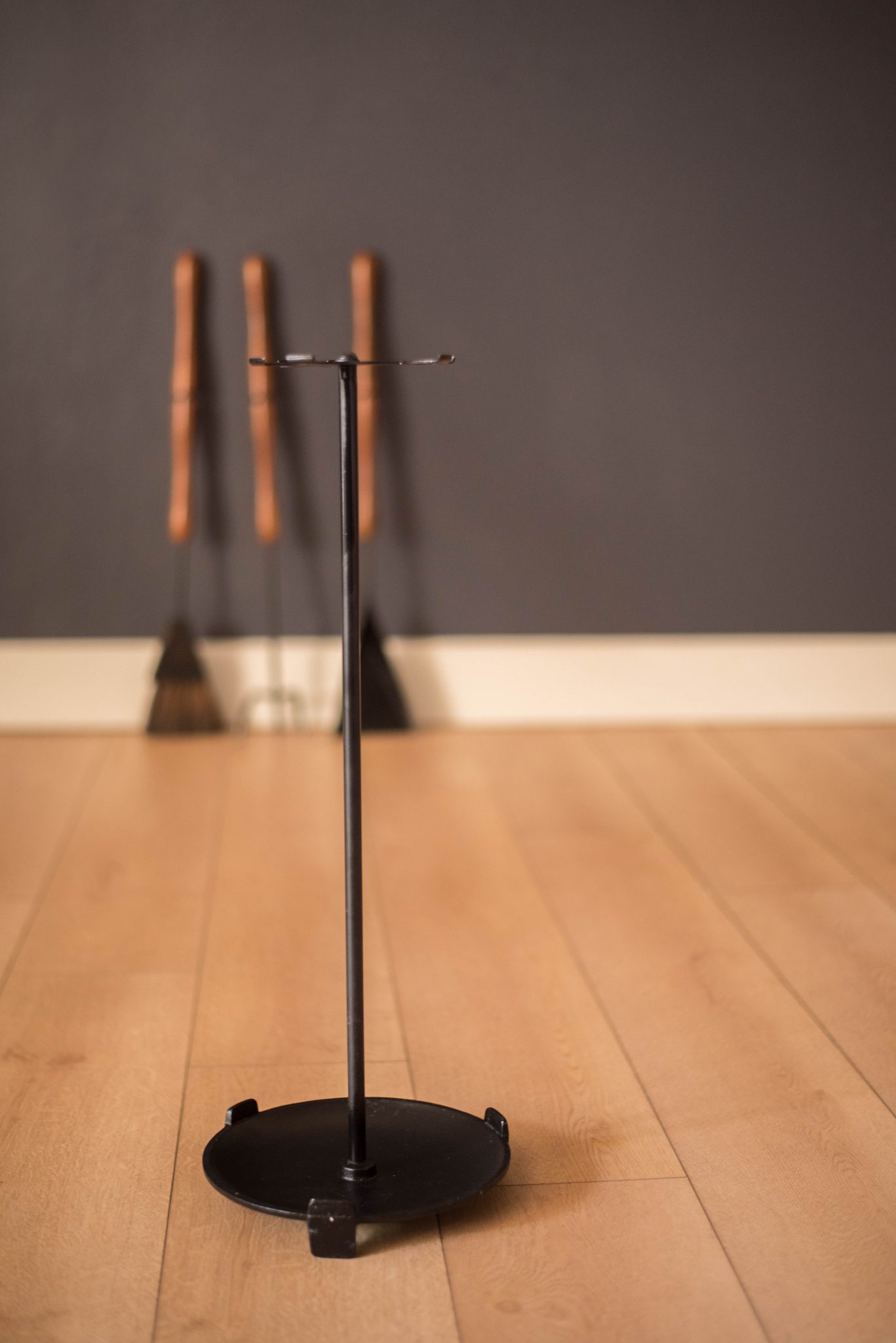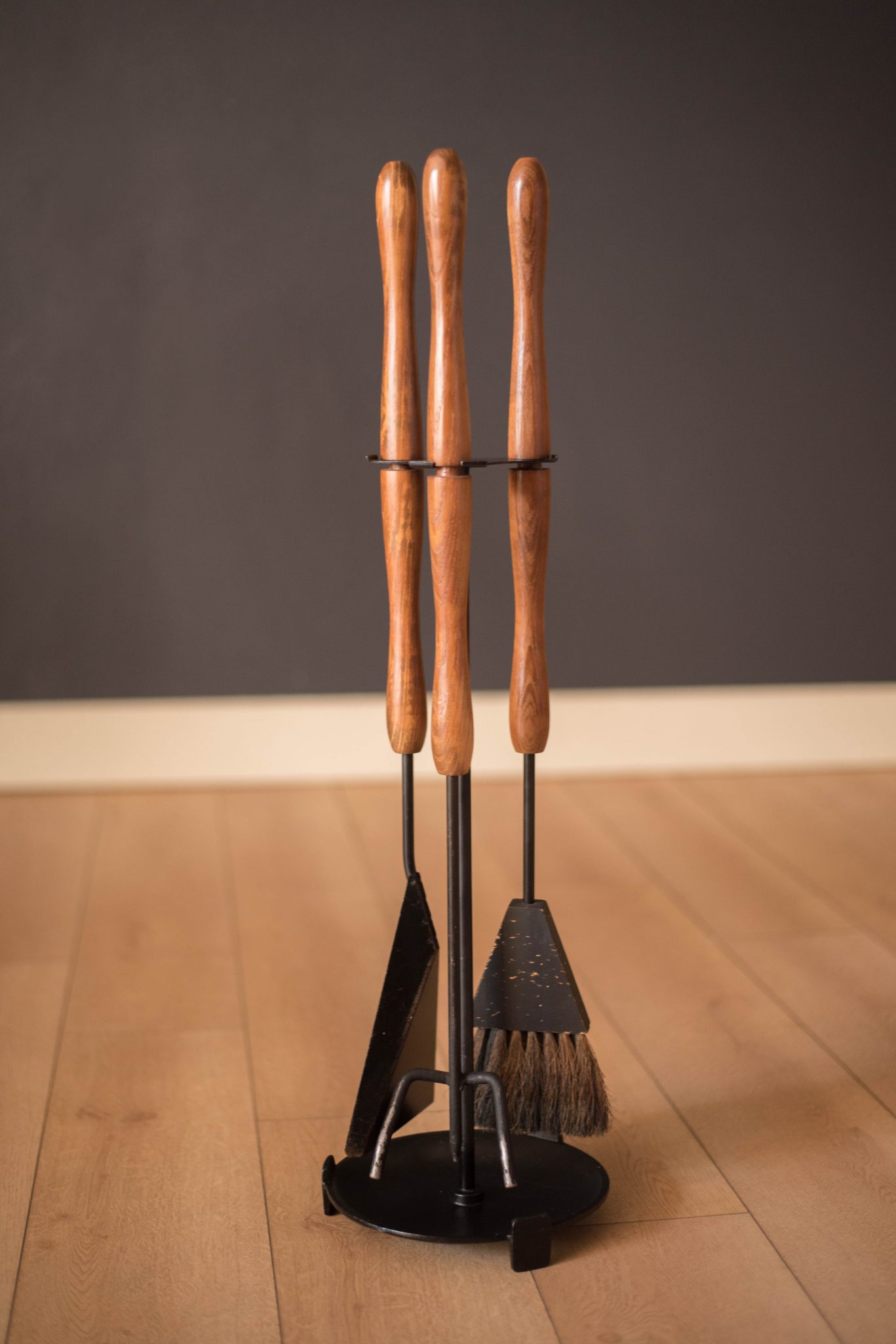 Vintage 3-piece fireplace tool set and floor stand, circa 1960s. This set is made with sculpted wood handles and heavy cast iron marked made in Japan. Includes poker, shovel, brush, and floor stand.