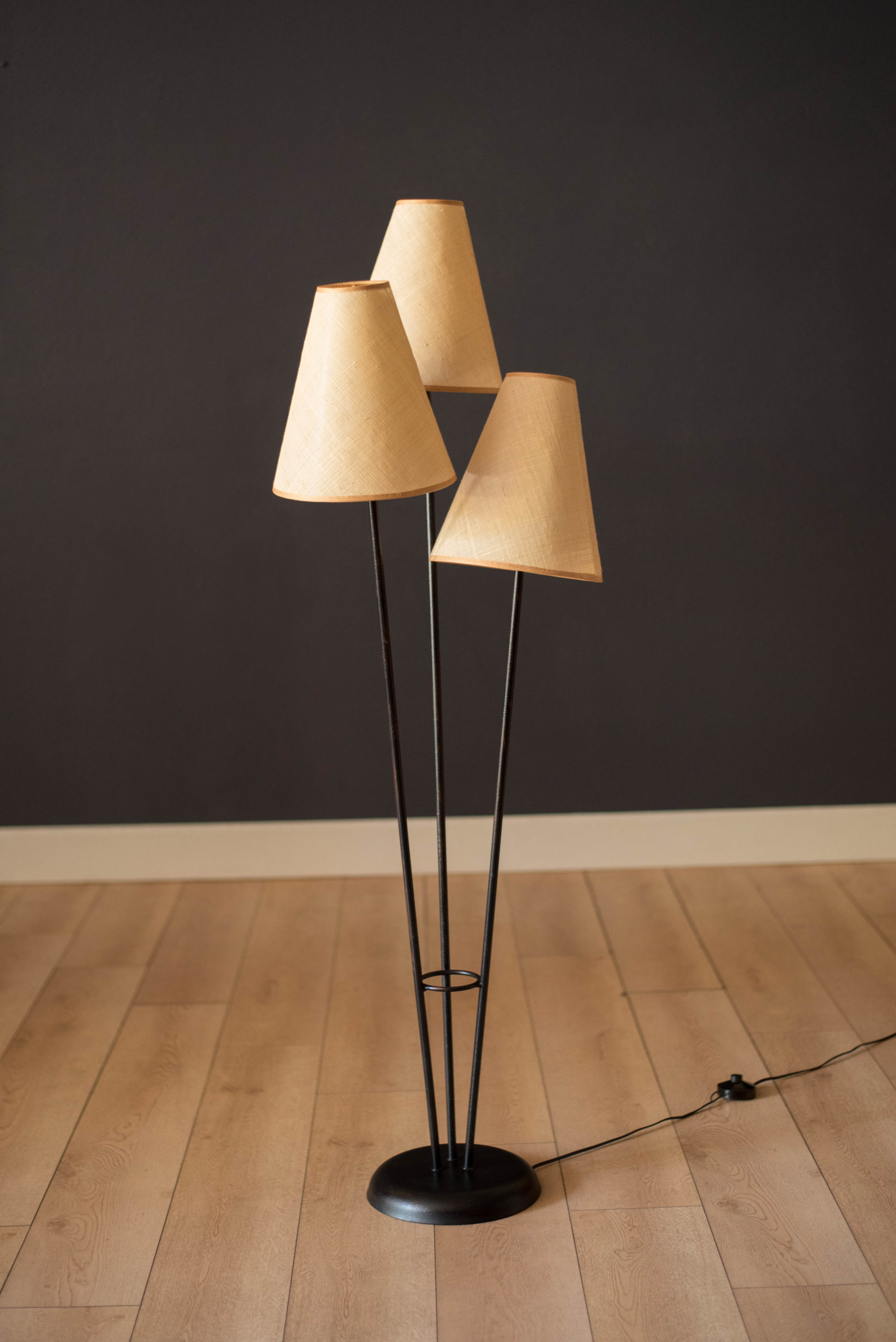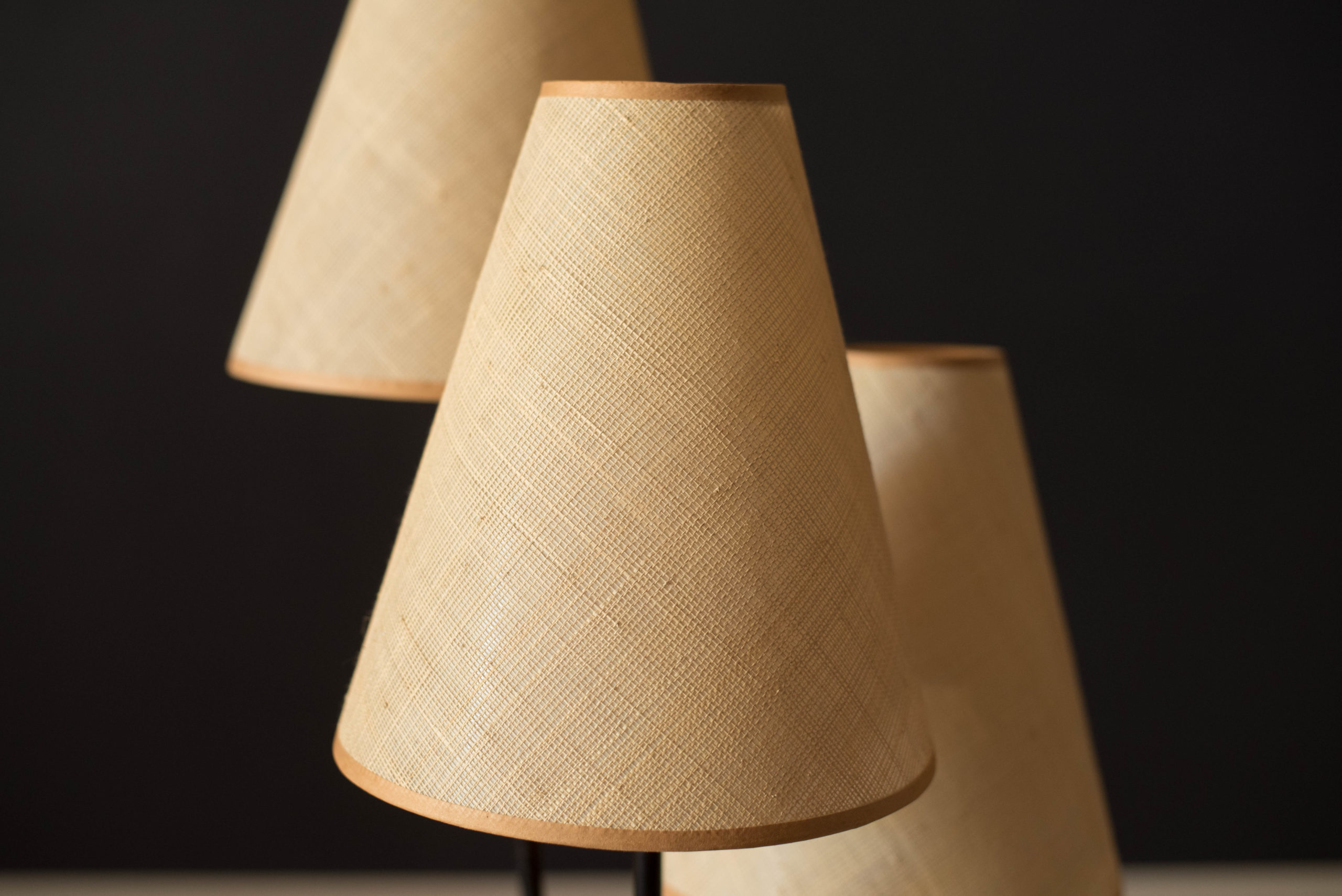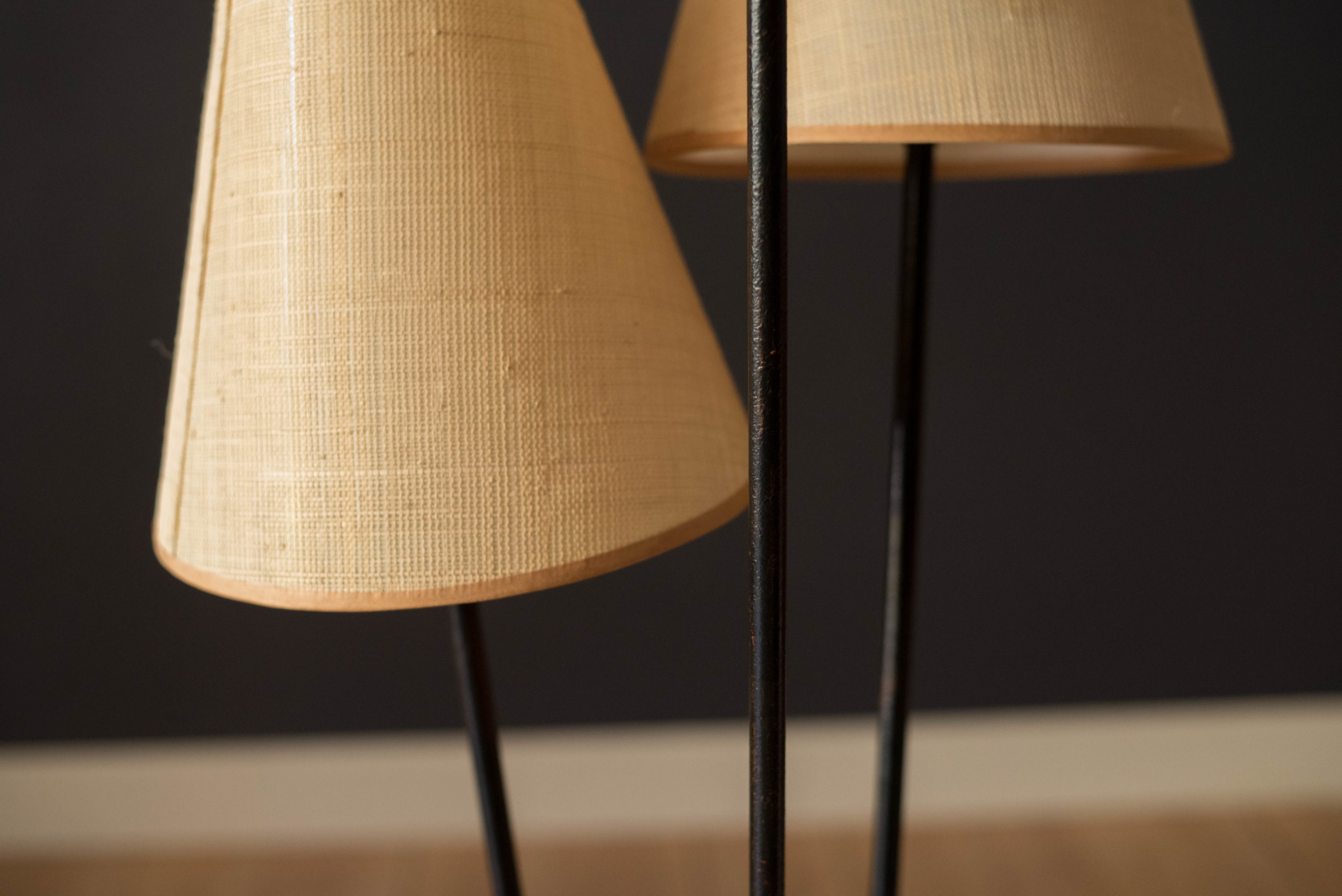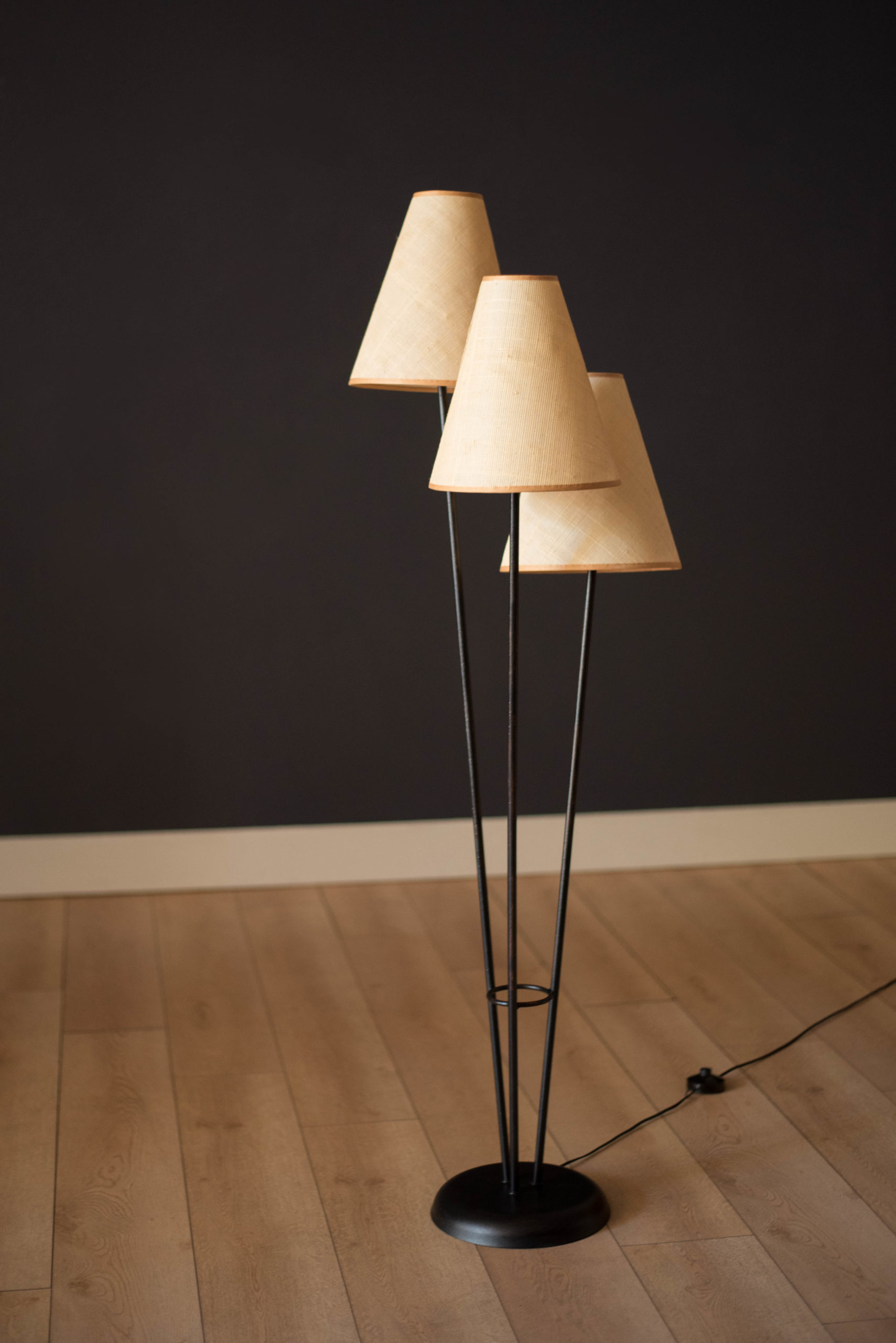 Classic vintage triple light floor lamp circa 1960’s. This unique piece features three tapered natural woven fiber shades that emits a soft warm glow. Supporting base is made out of metal construction finished in a textured black enamel.