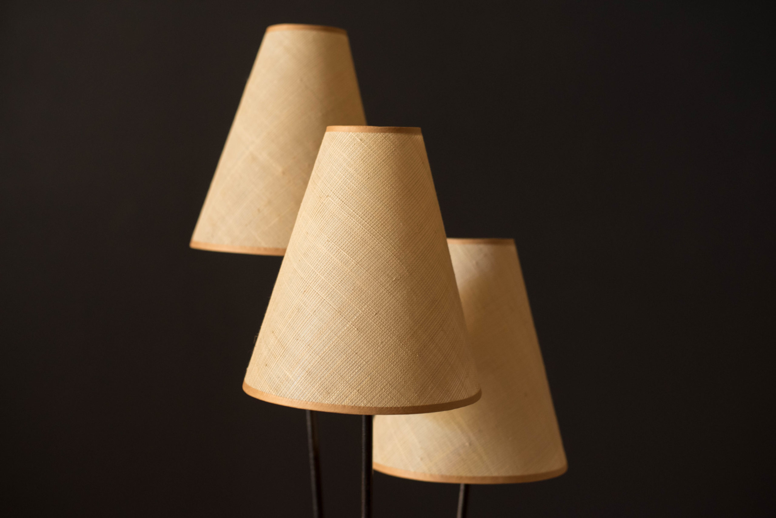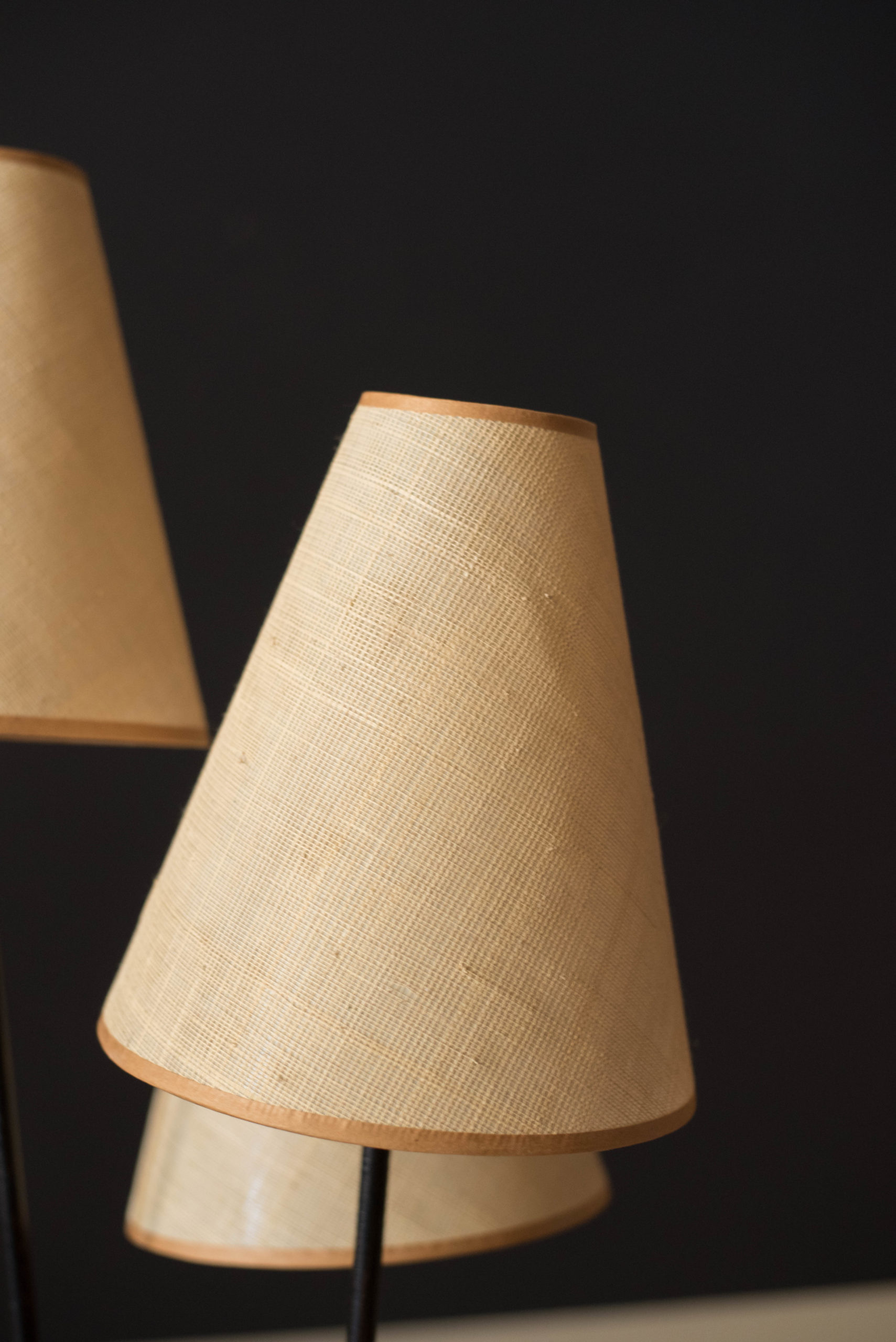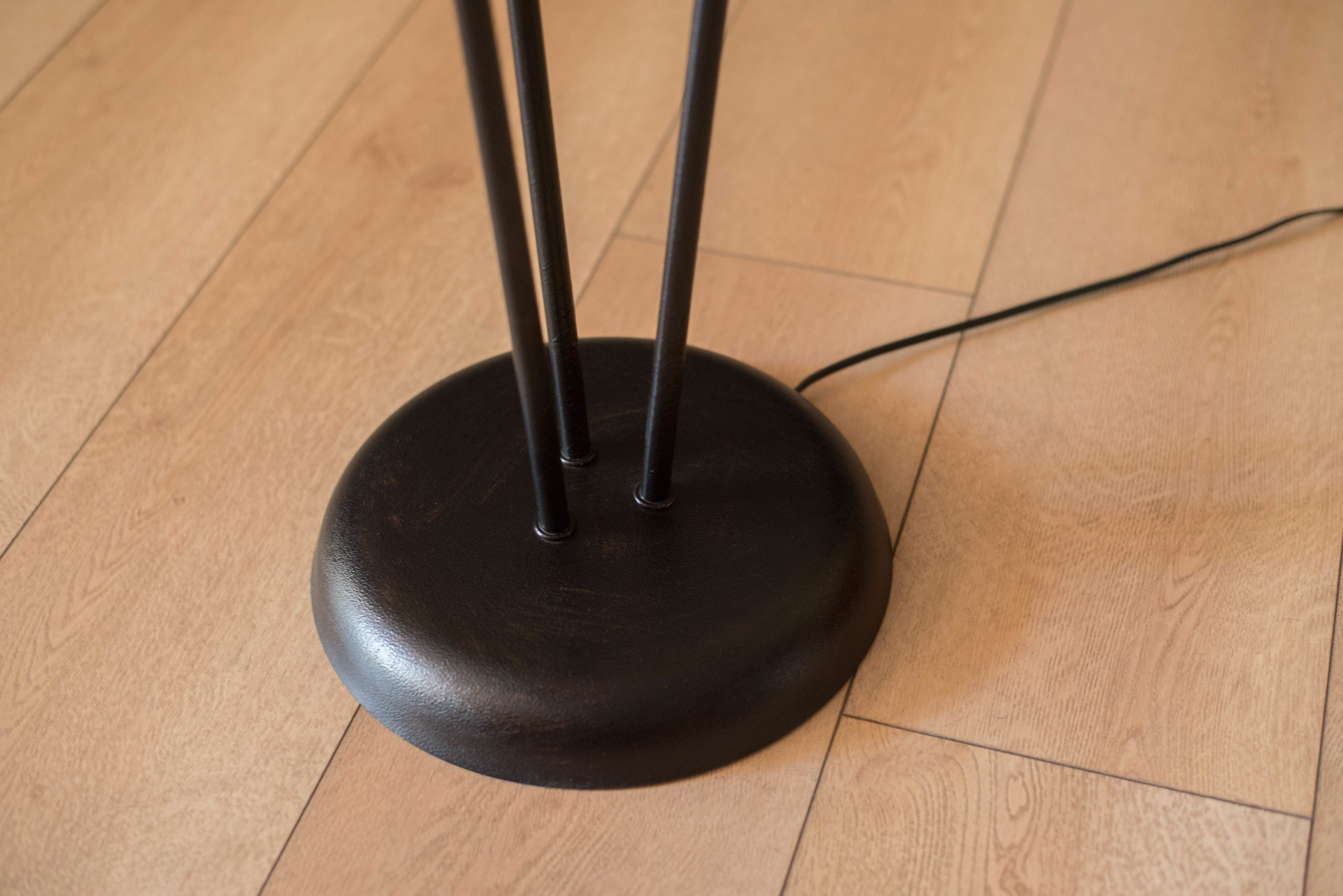Classic vintage triple light floor lamp circa 1960’s. This unique piece features three tapered natural woven fiber shades that emits a soft warm glow. Supporting base is made out of metal construction finished in a textured black enamel.