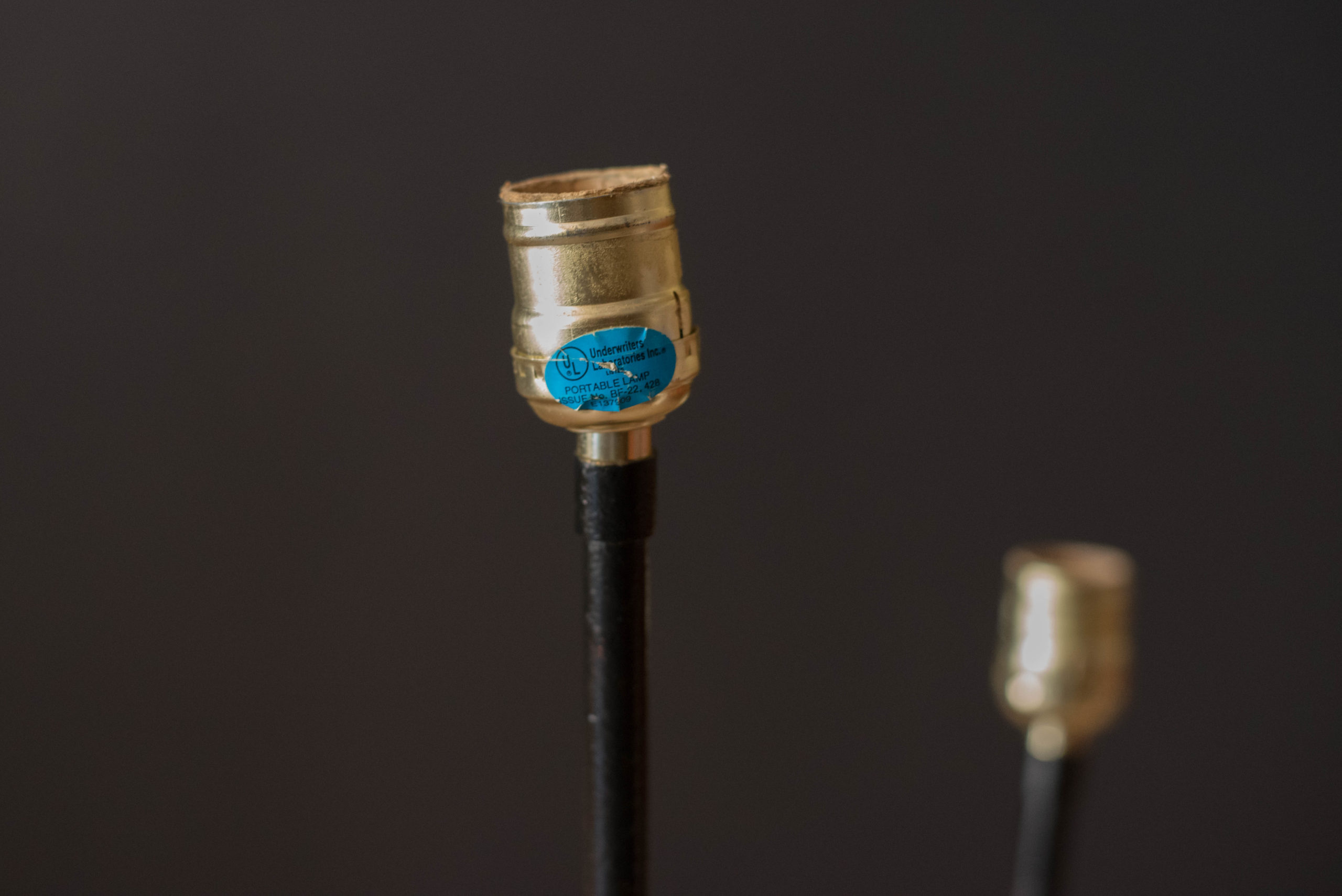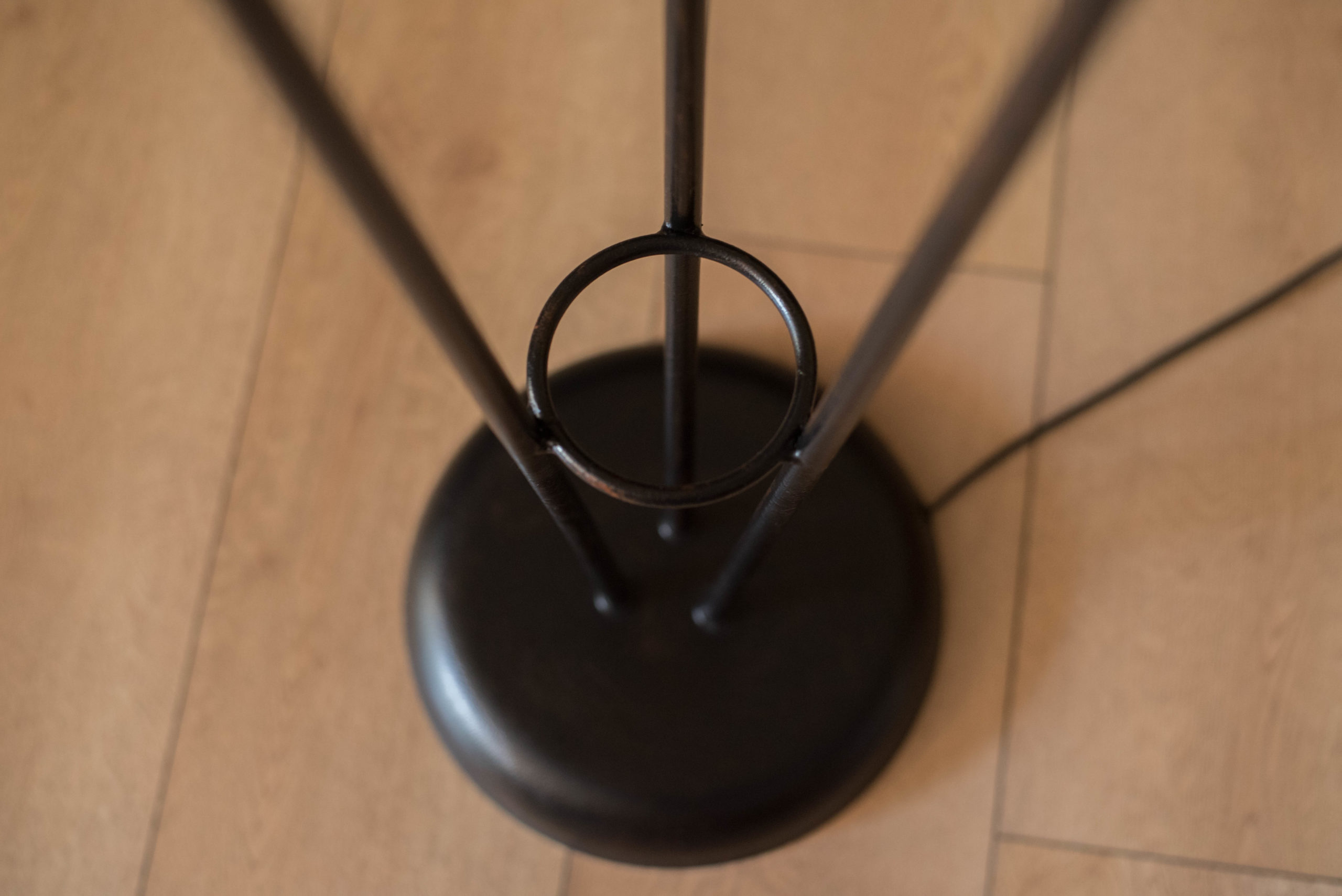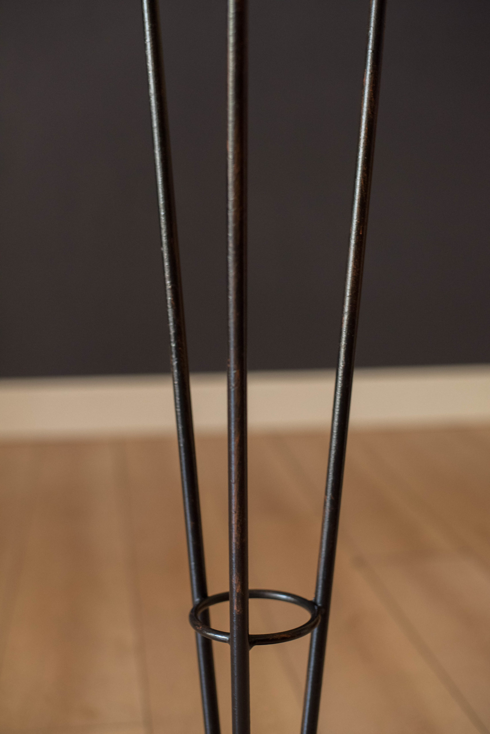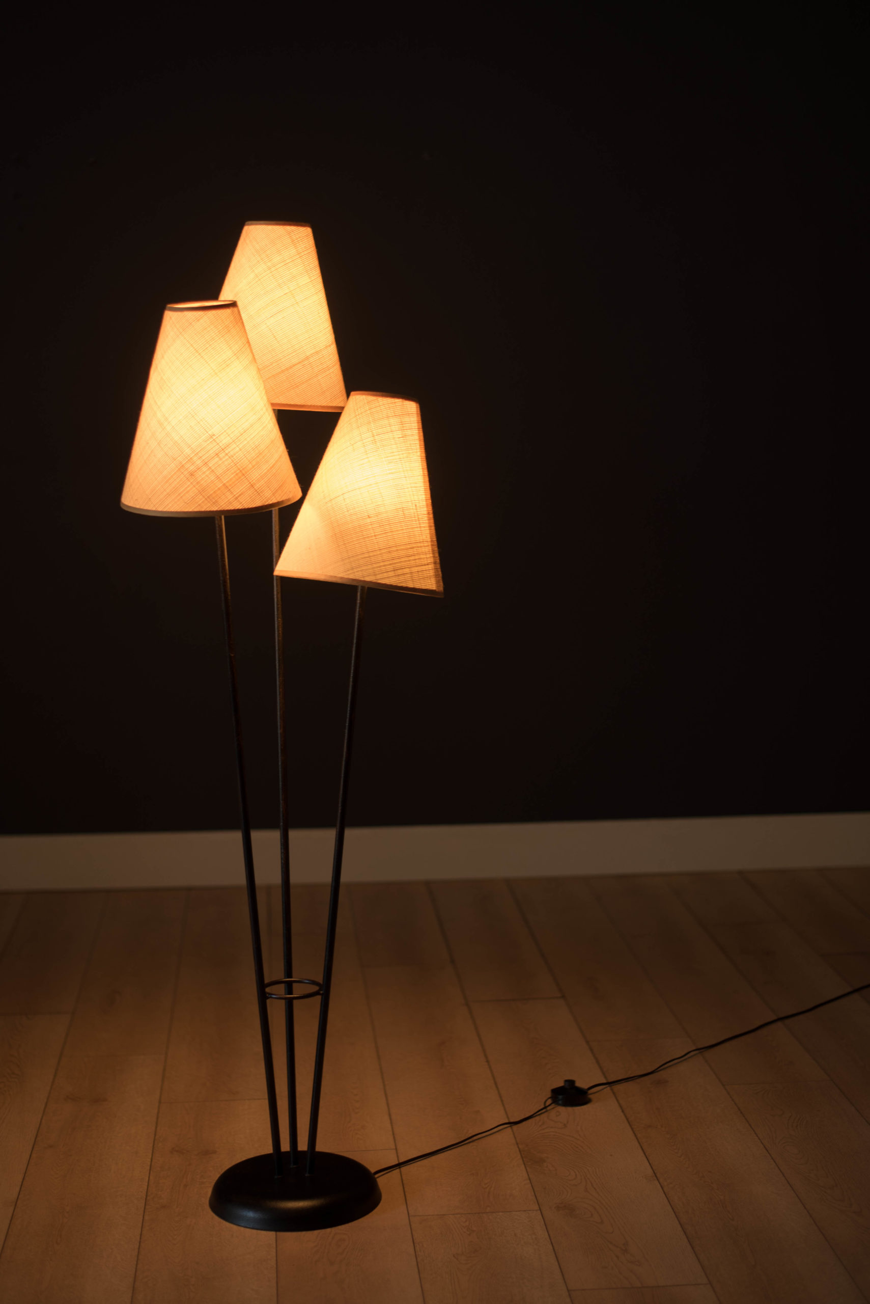 Classic vintage triple light floor lamp circa 1960’s. This unique piece features three tapered natural woven fiber shades that emits a soft warm glow. Supporting base is made out of metal construction finished in a textured black enamel.