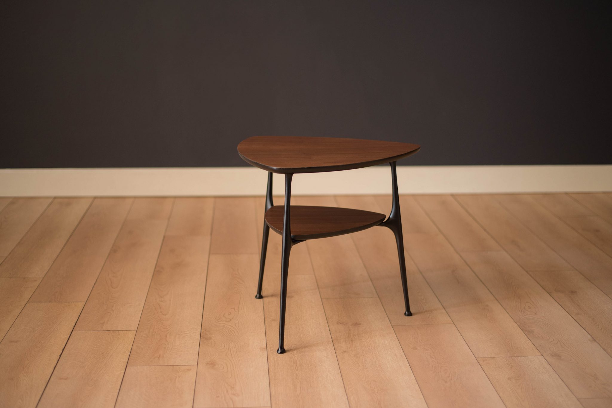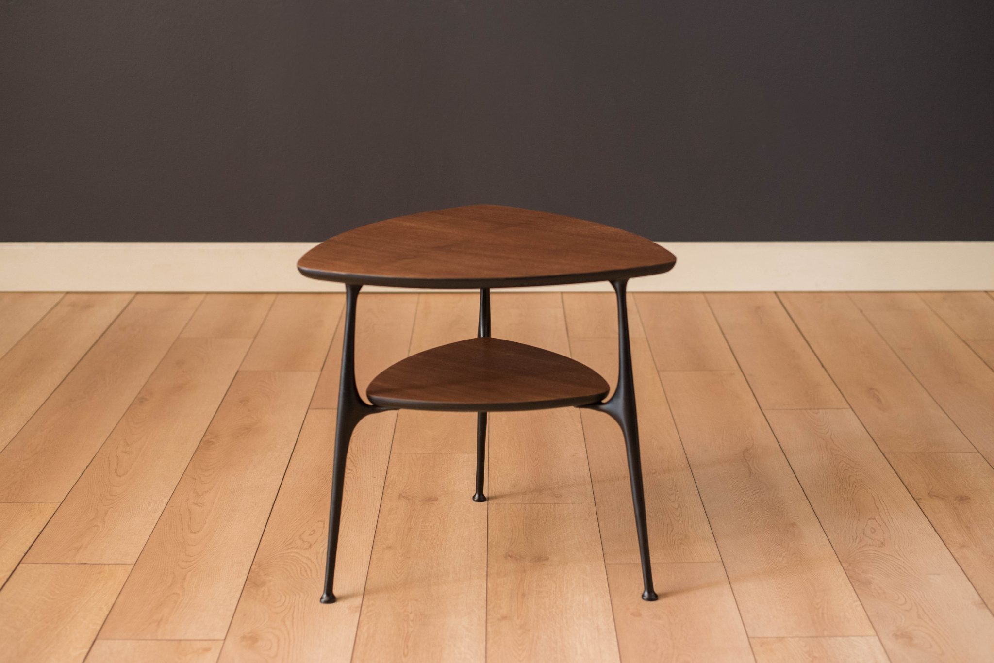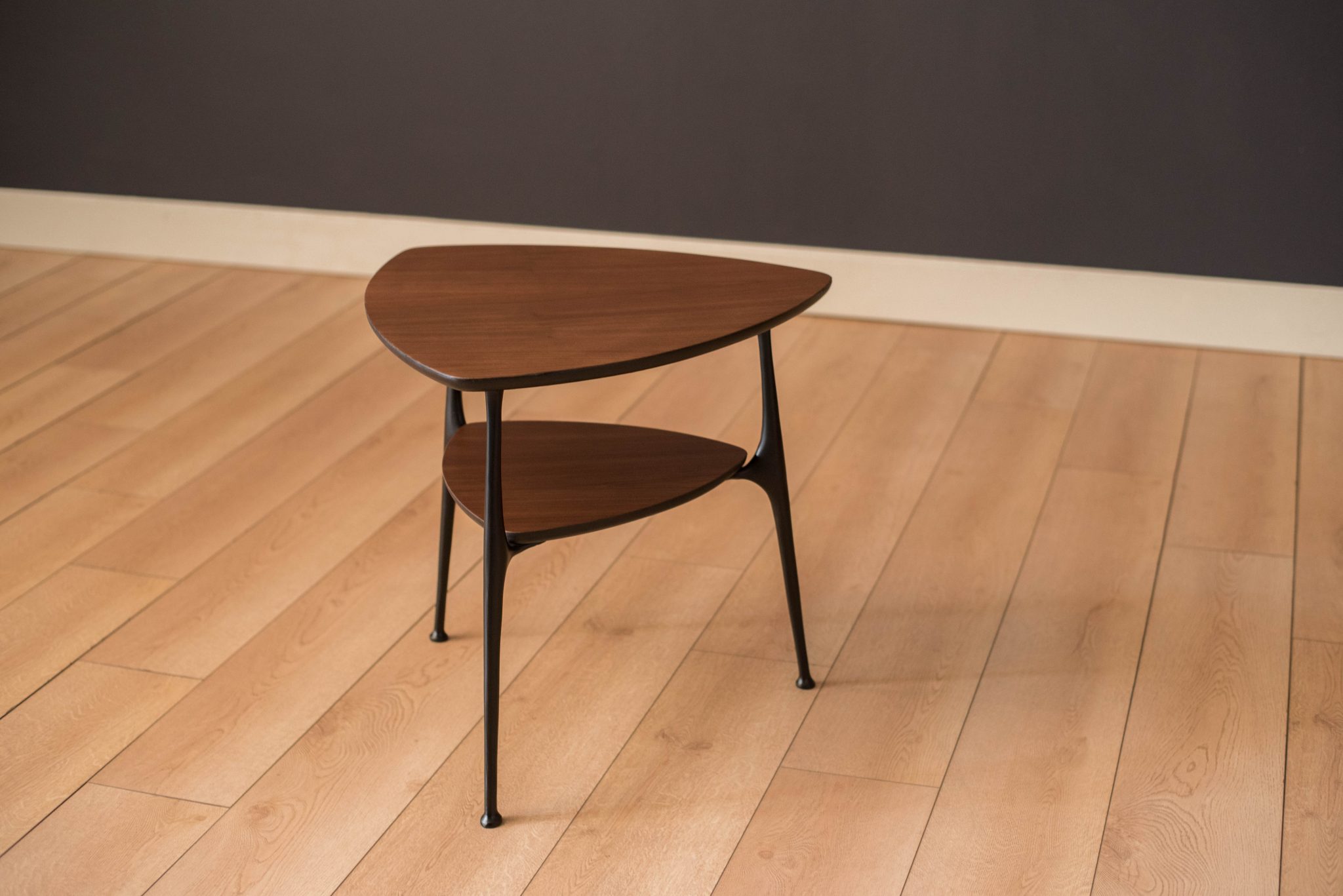 Vintage triangle side table in walnut, circa 1960s. This two-tone piece displays well from all angles and provides an open design that fits in small spaces. Features sturdy contoured cast iron legs and a two-tier walnut top.