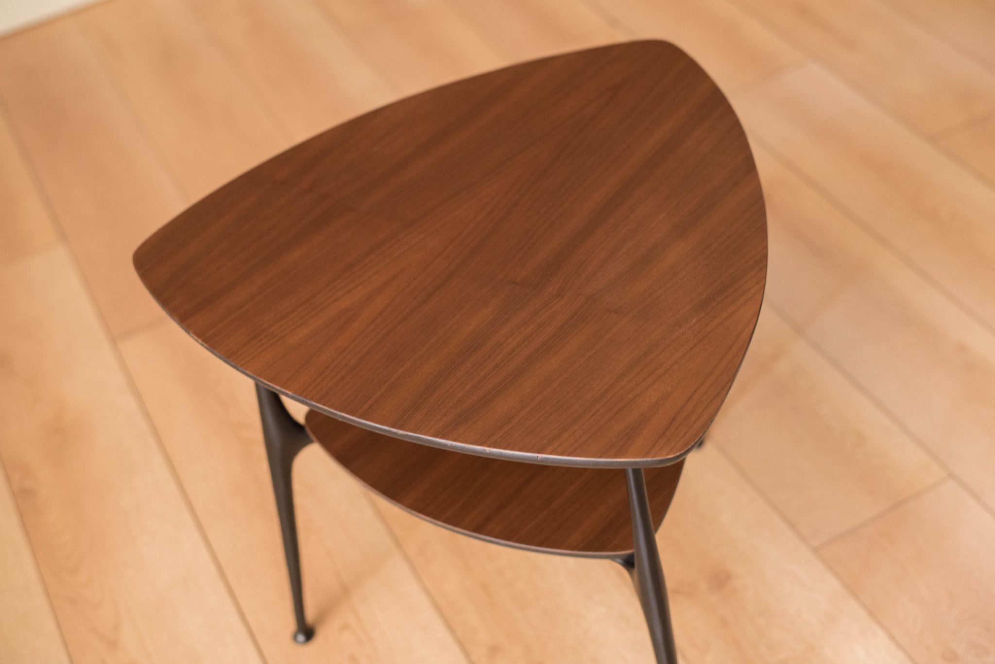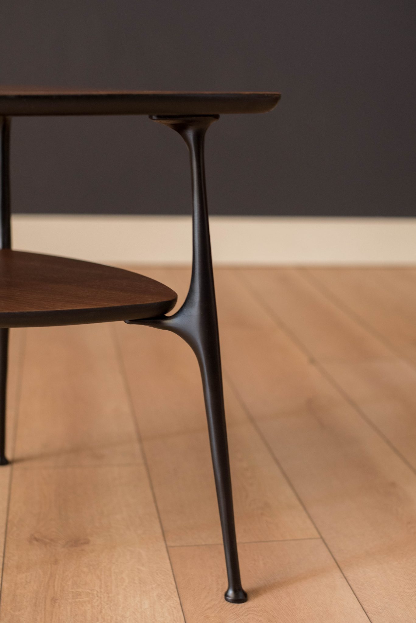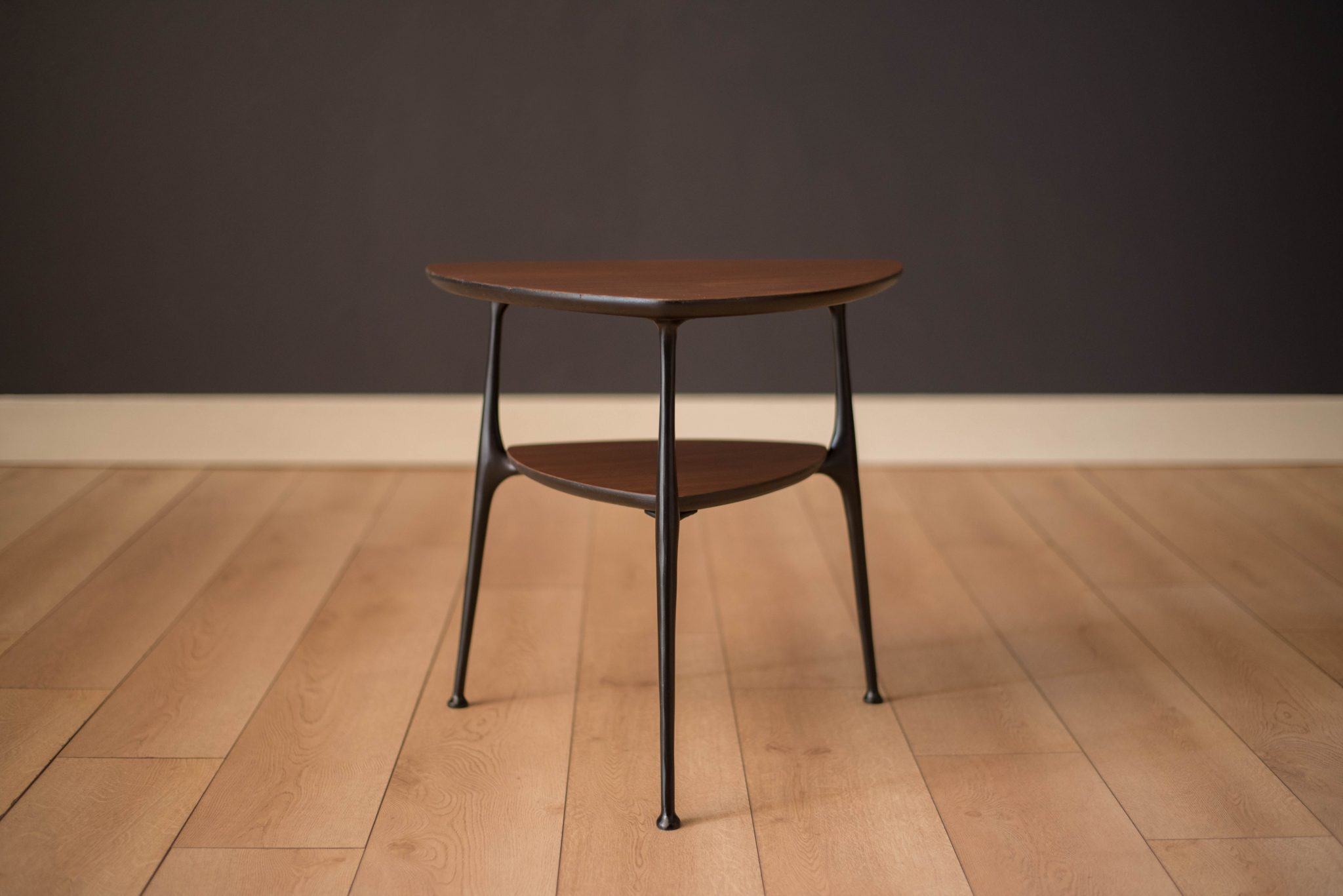 Vintage triangle side table in walnut, circa 1960s. This two-tone piece displays well from all angles and provides an open design that fits in small spaces. Features sturdy contoured cast iron legs and a two-tier walnut top.
