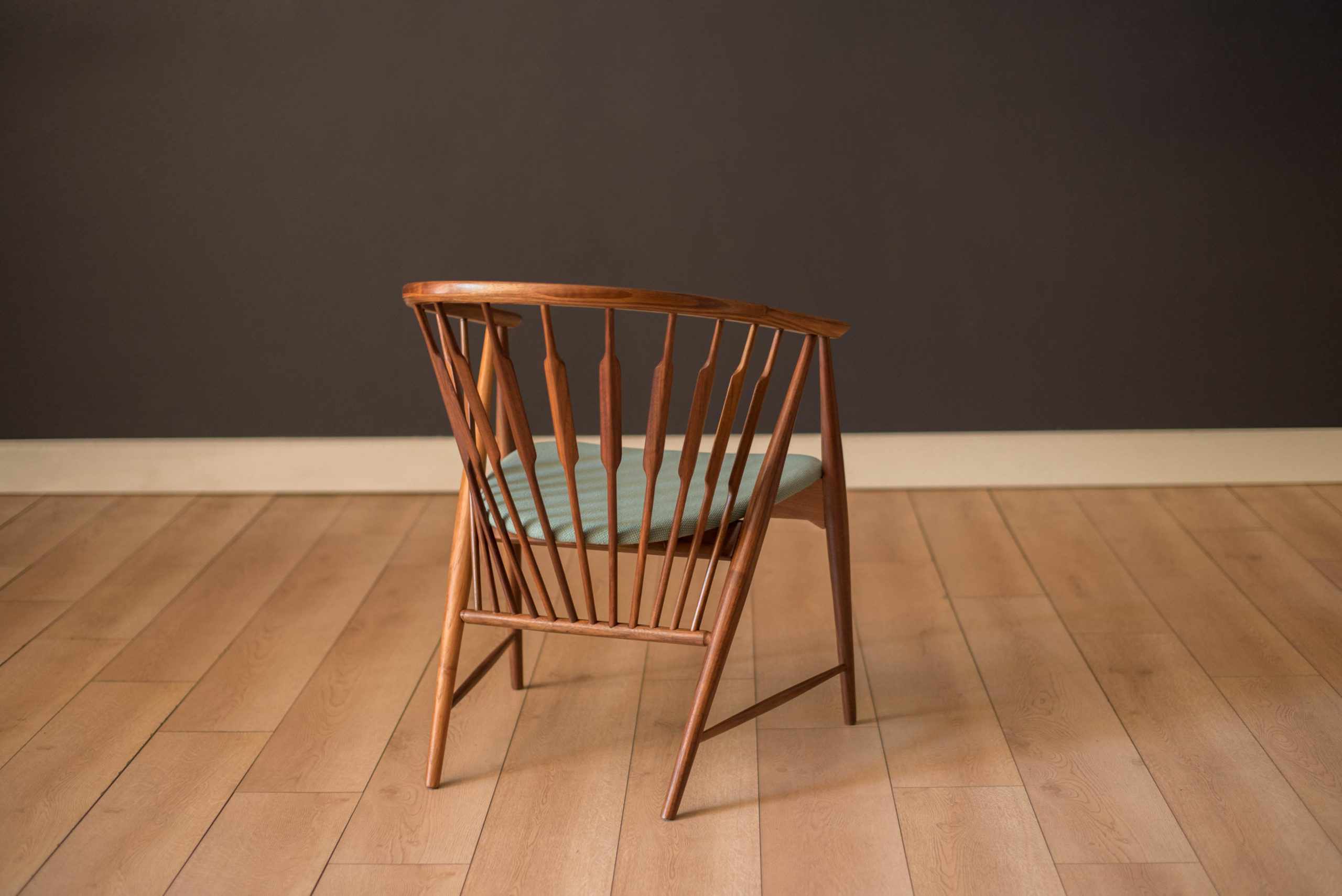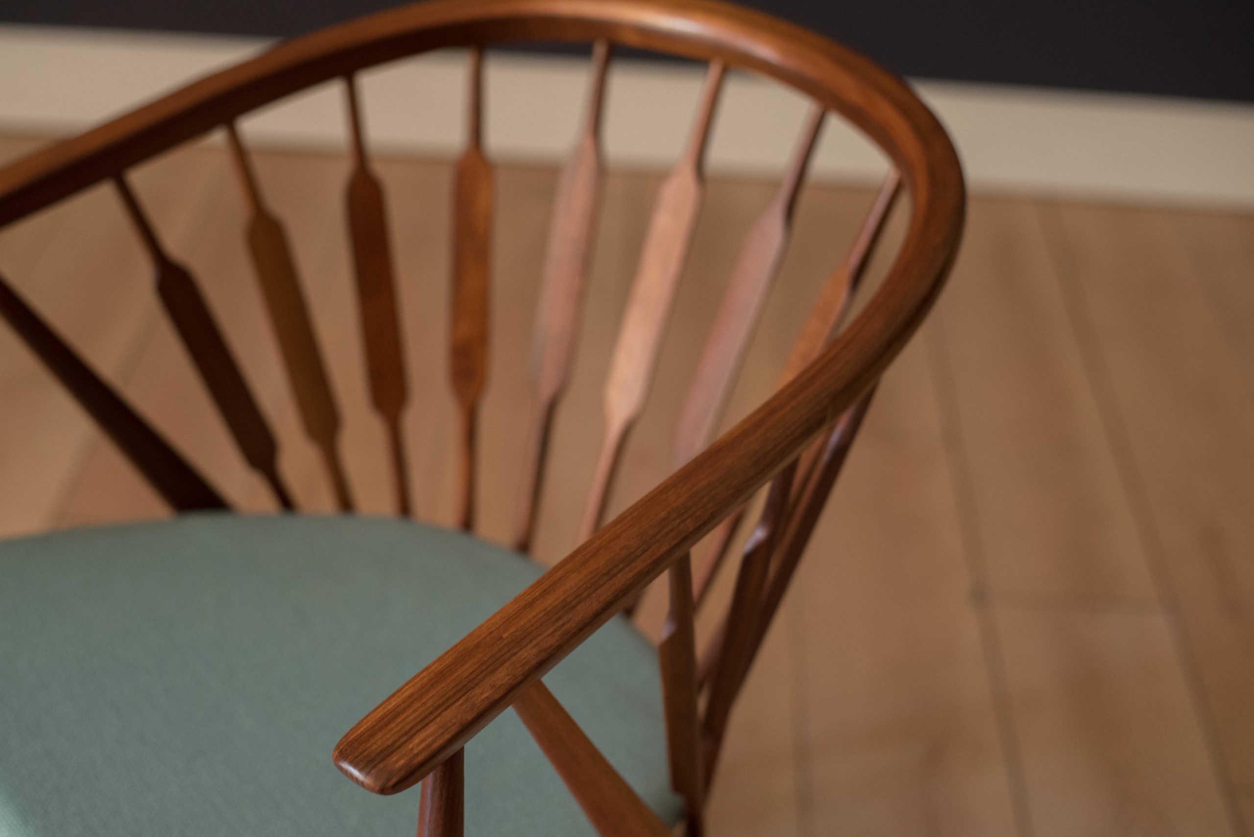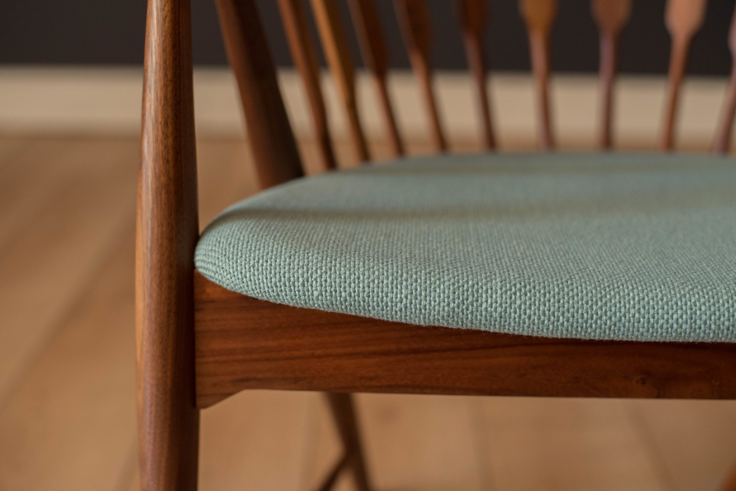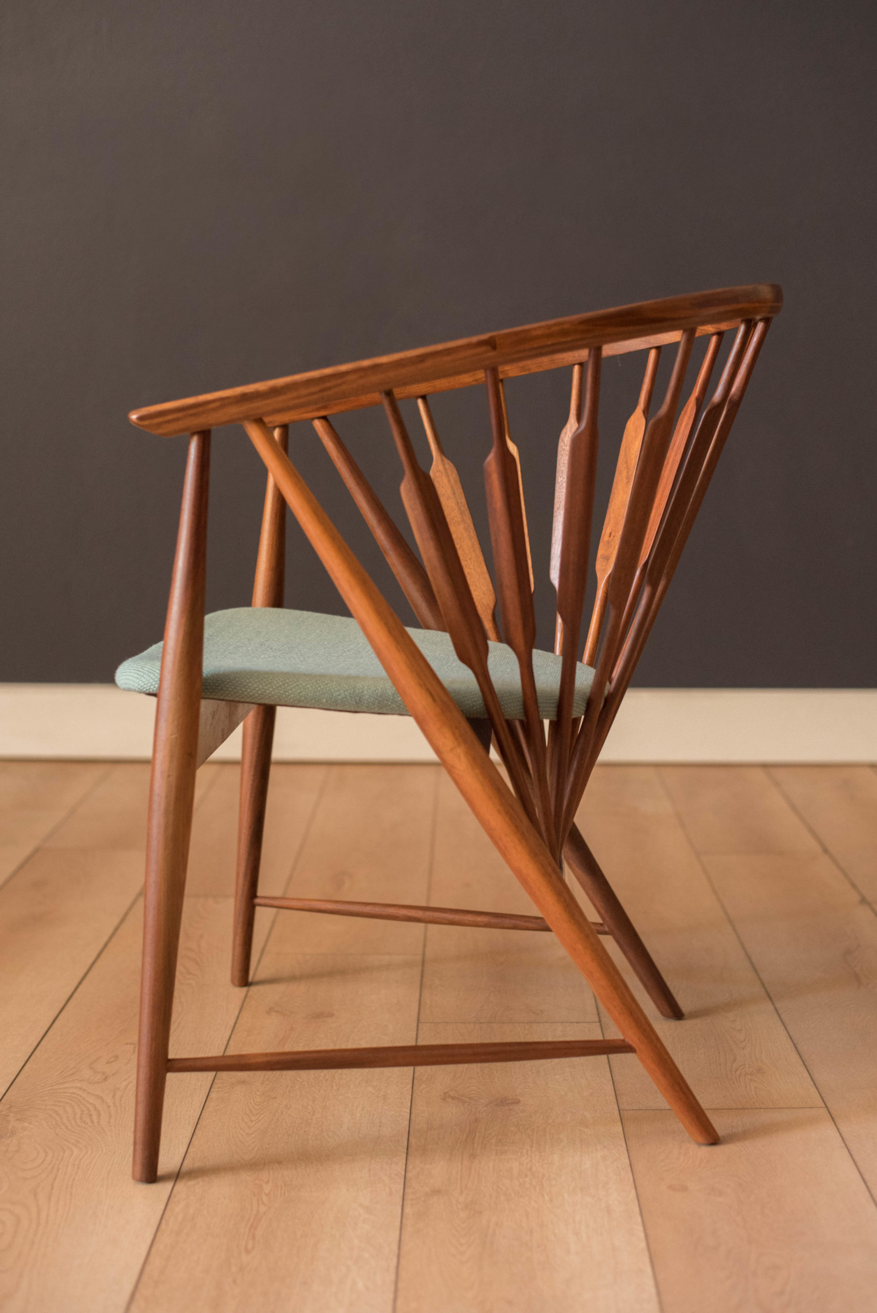 Mid-Century Modern armchair designed by Kipp Stewart and Stewart McDougall for Drexel Declaration. This piece is made of sculpted solid walnut and showcases from all angles. Functions as a captain’s dining chair or lounge armchair. Newly reupholstered in a seafoam green tweed fabric.