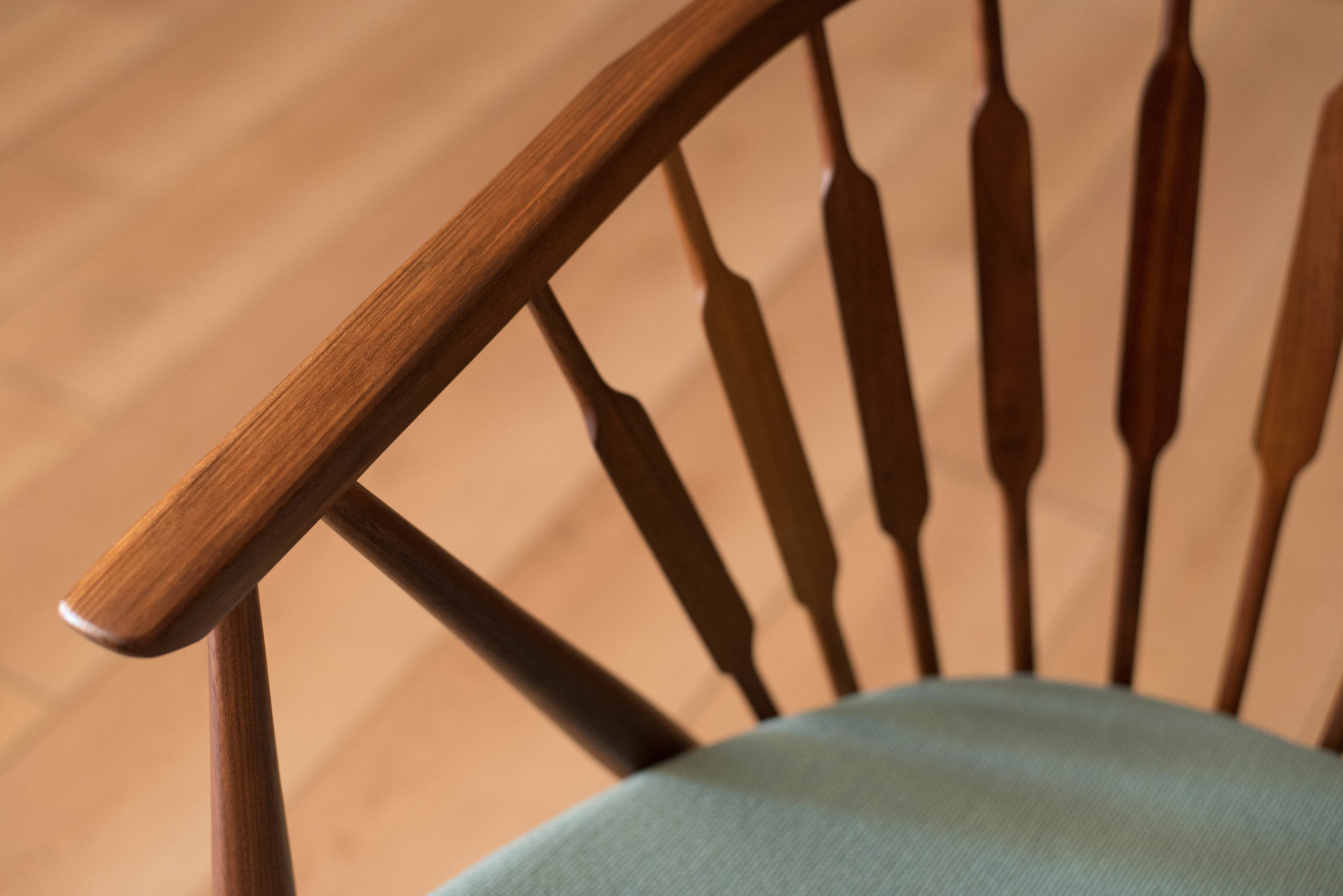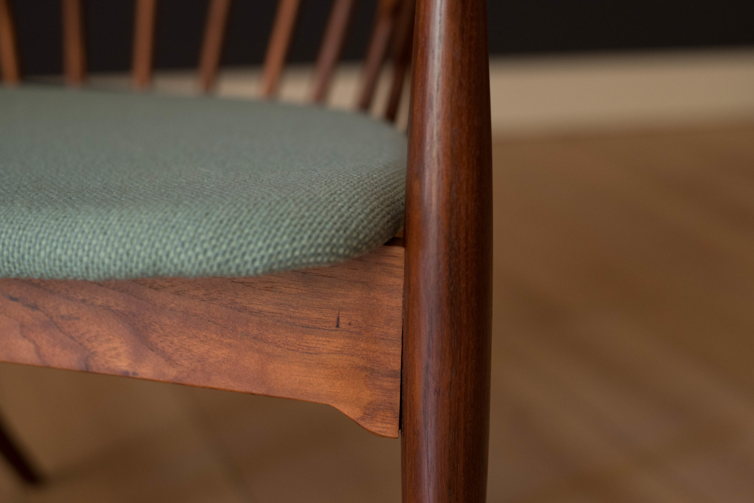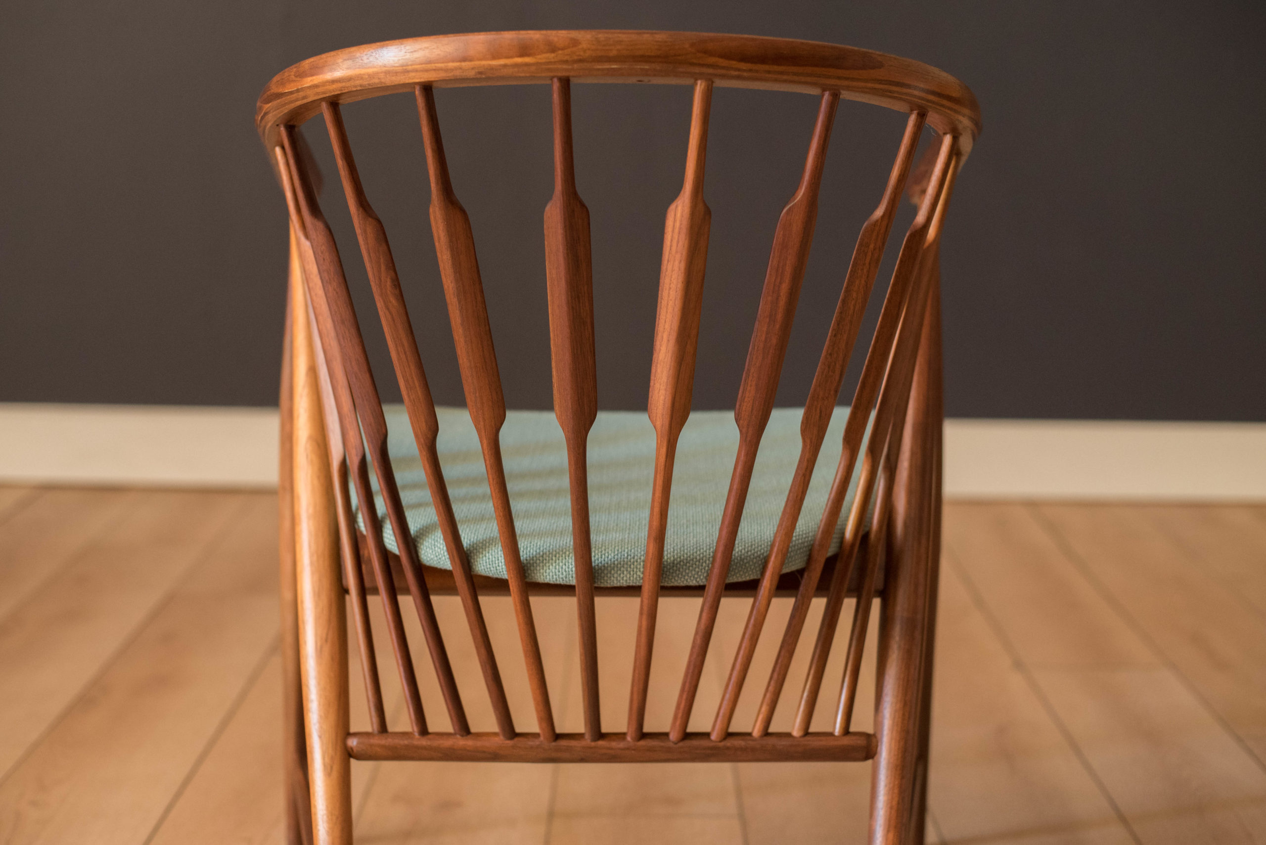 Mid-Century Modern armchair designed by Kipp Stewart and Stewart McDougall for Drexel Declaration. This piece is made of sculpted solid walnut and showcases from all angles. Functions as a captain’s dining chair or lounge armchair. Newly reupholstered in a seafoam green tweed fabric.