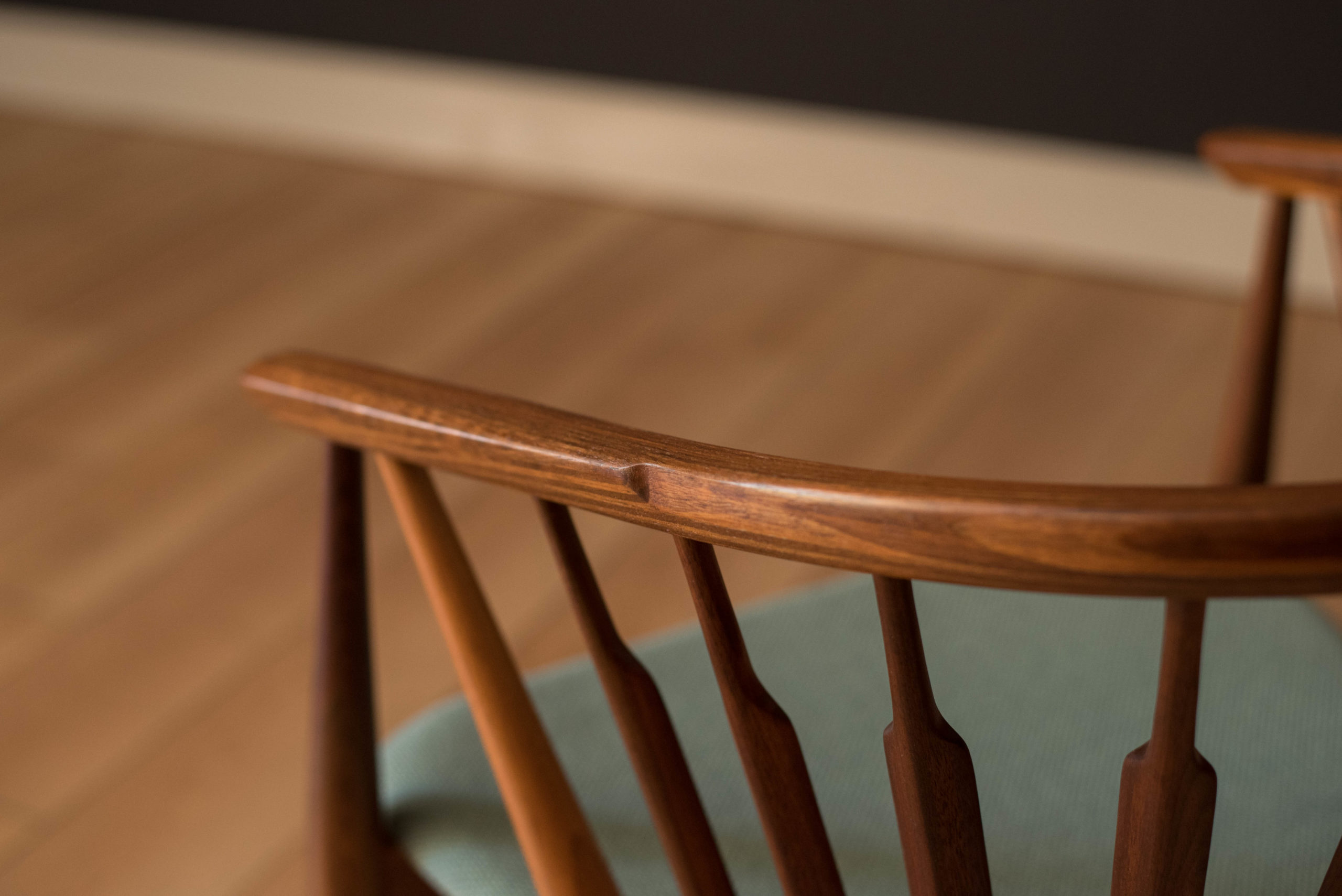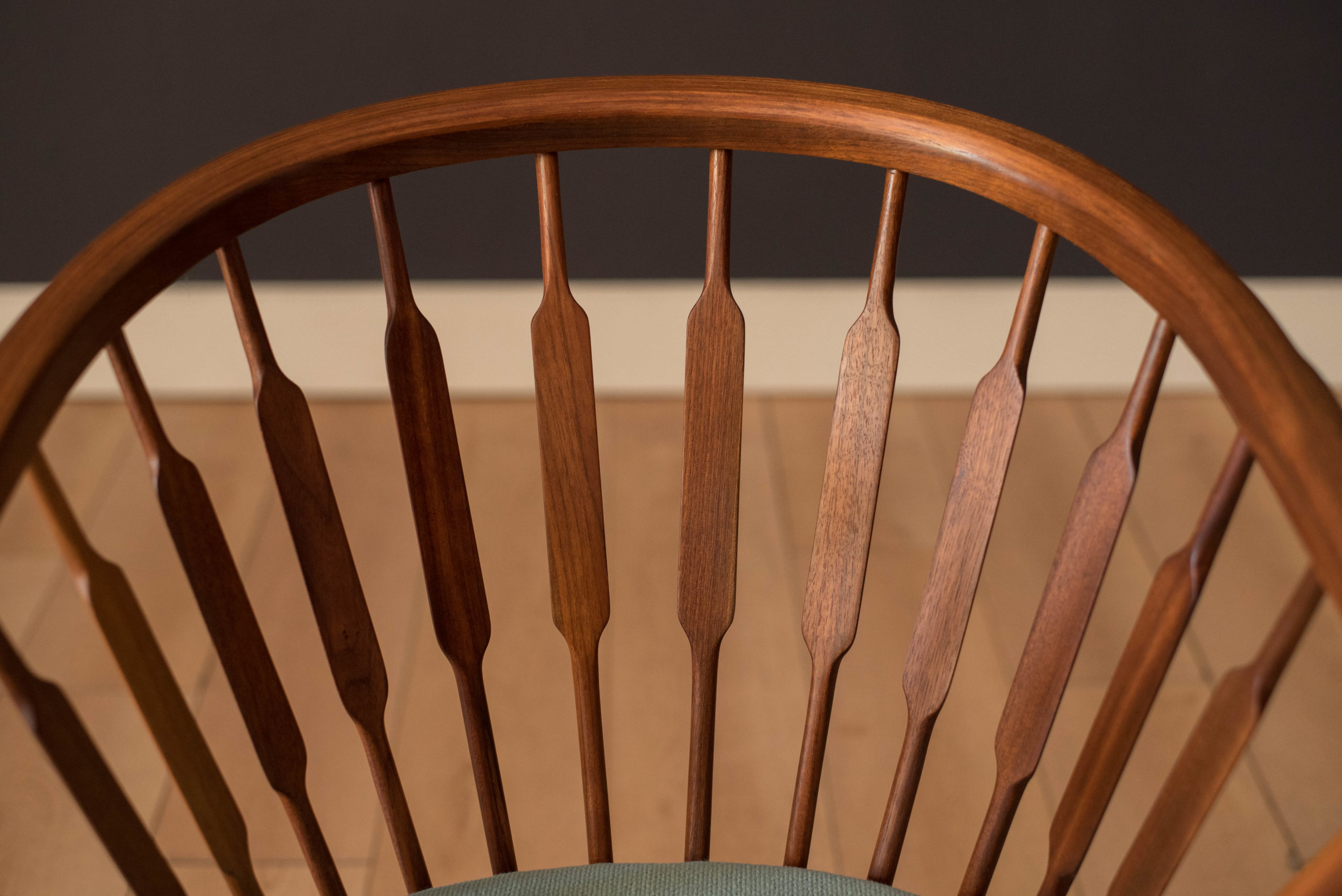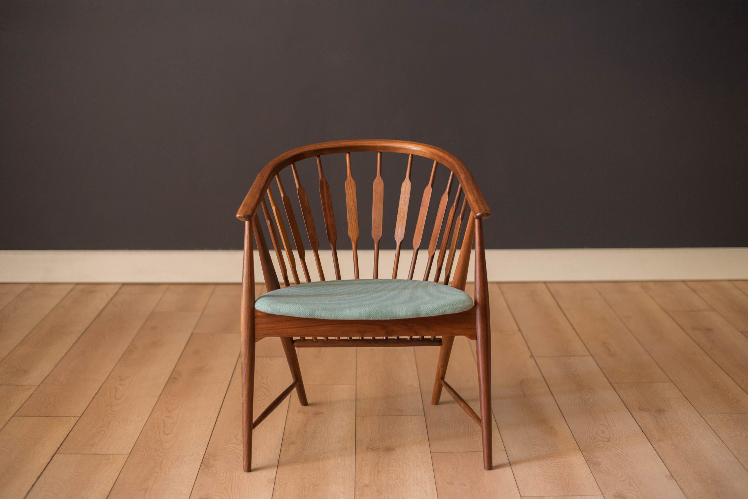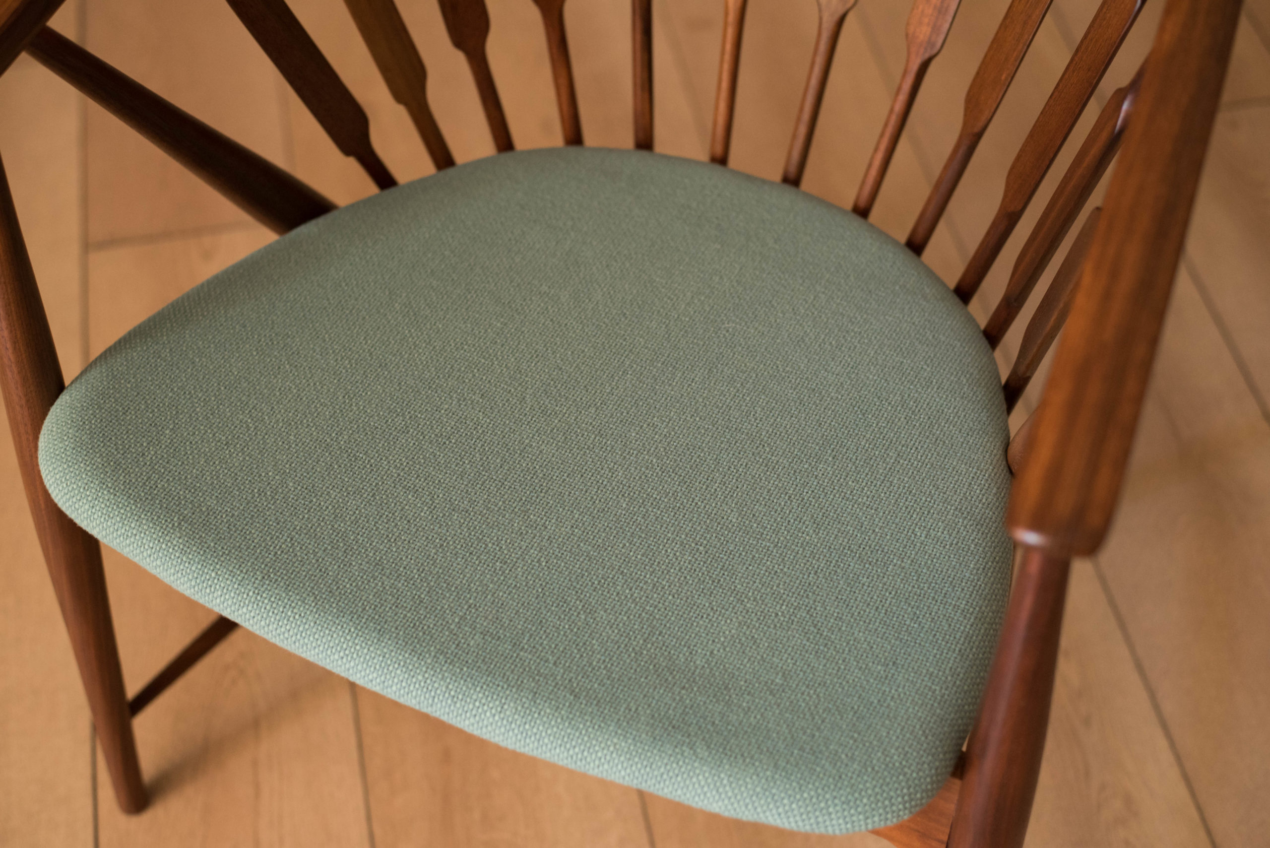 Mid-Century Modern armchair designed by Kipp Stewart and Stewart McDougall for Drexel Declaration. This piece is made of sculpted solid walnut and showcases from all angles. Functions as a captain’s dining chair or lounge armchair. Newly reupholstered in a seafoam green tweed fabric.
