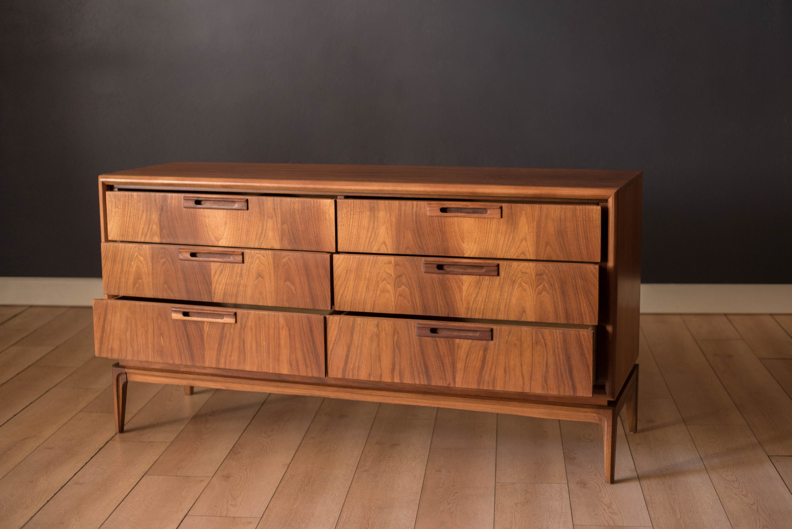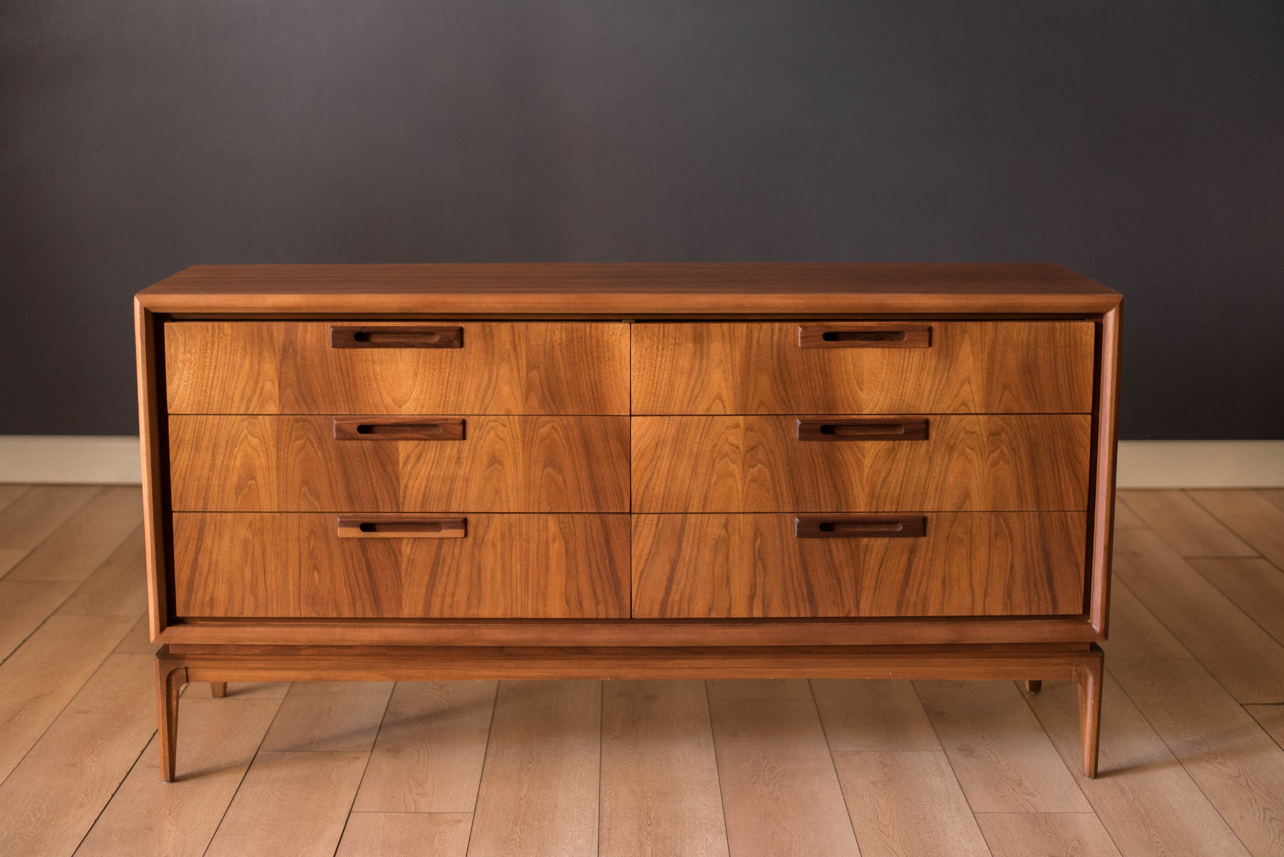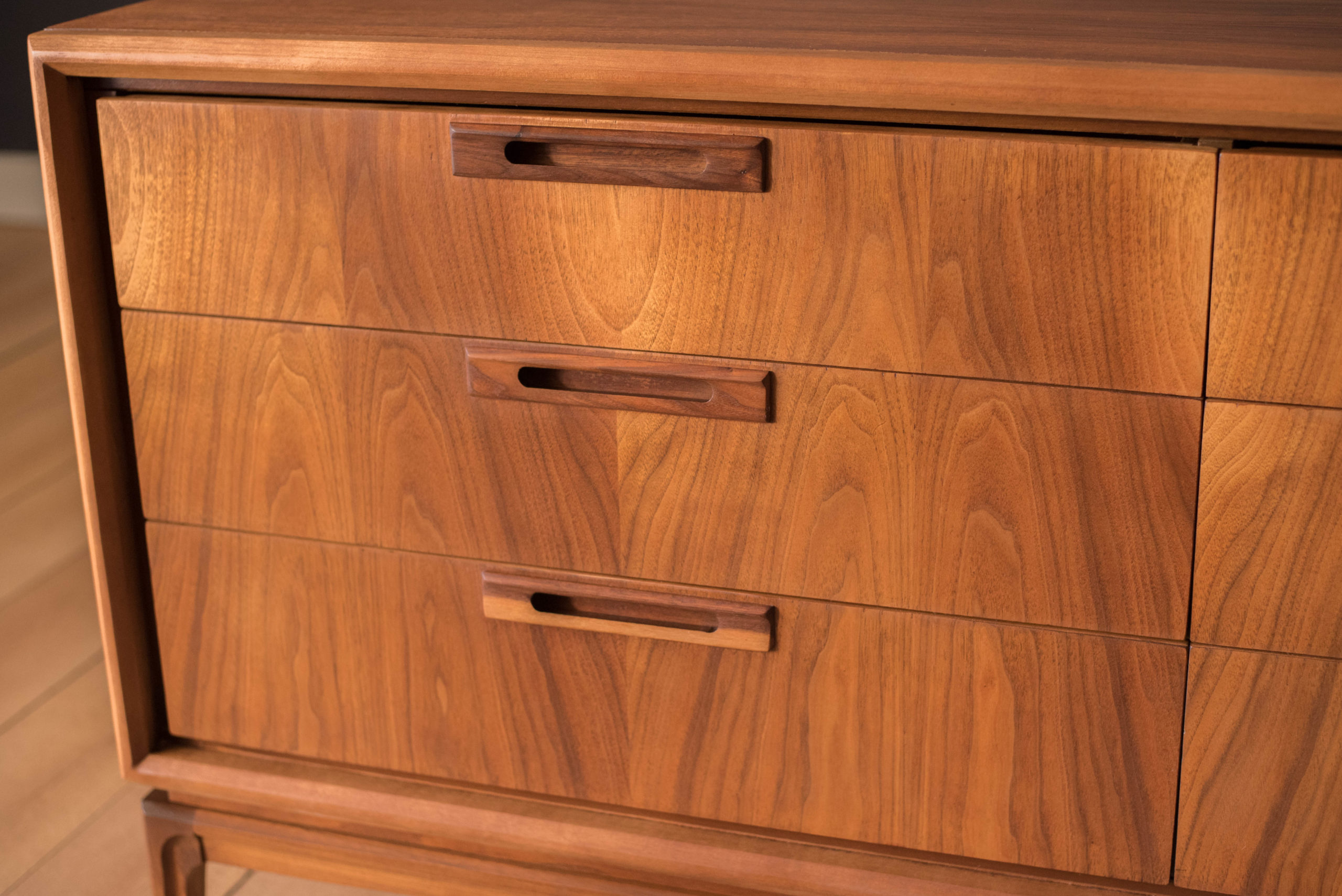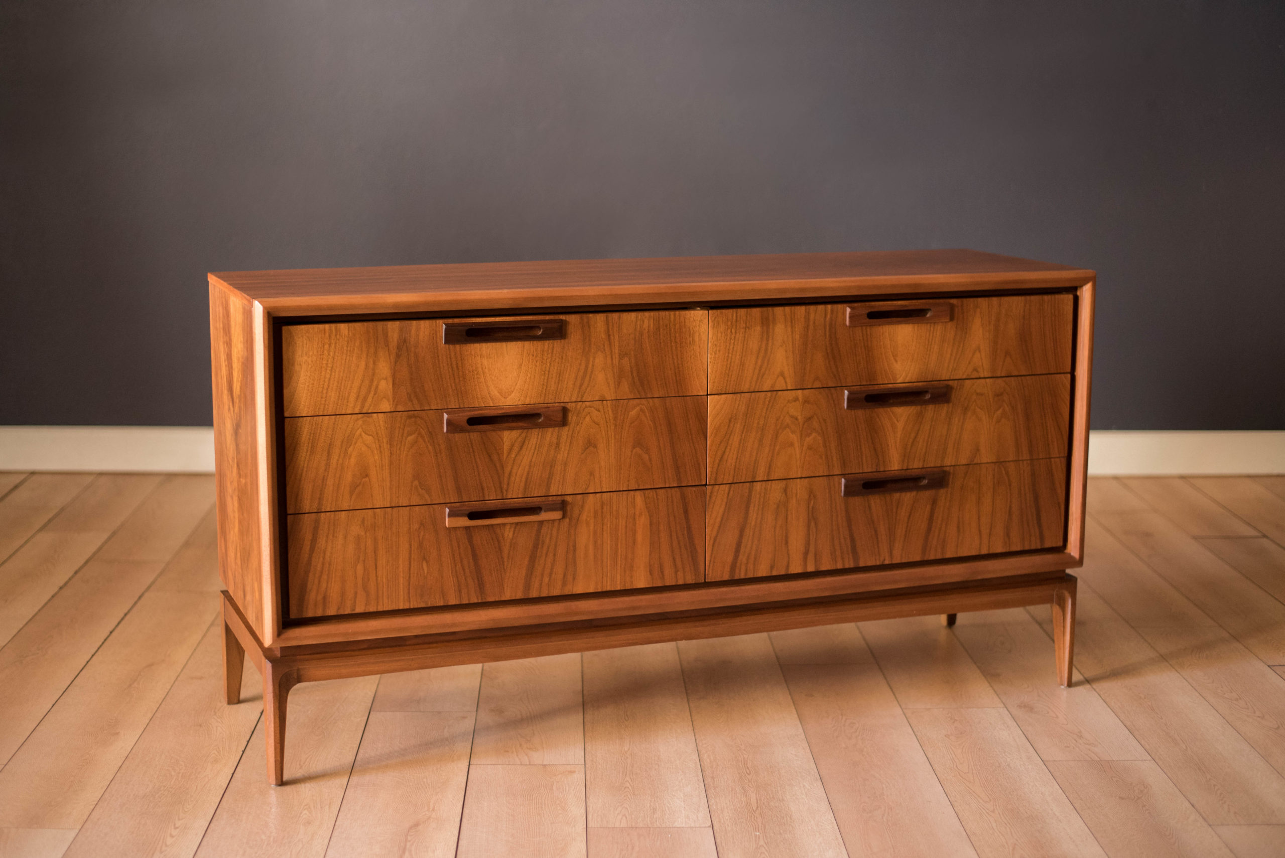 Classic American vintage dresser in walnut manufactured by United Furniture Corporation, c. 1960’s. This piece features sculptural solid wood handles and six dovetailed drawers with deep storage space.