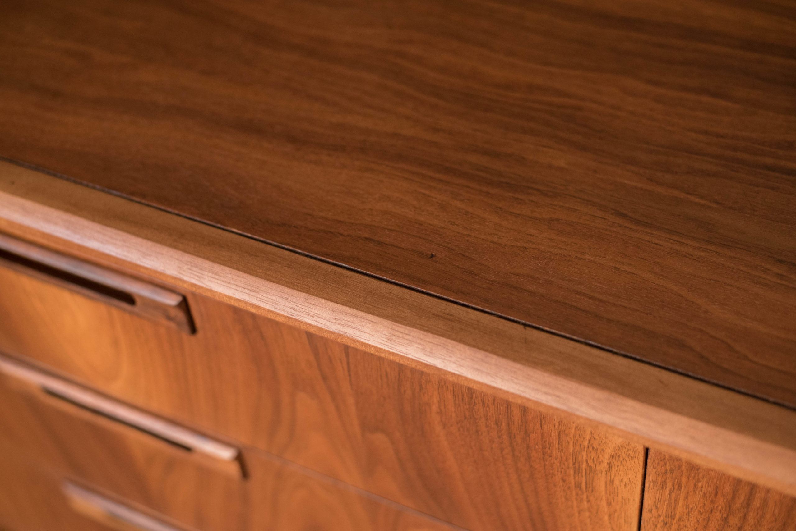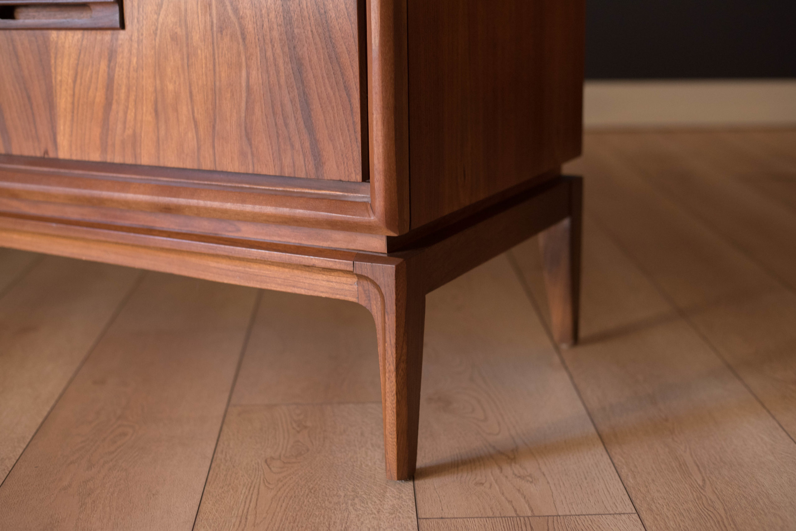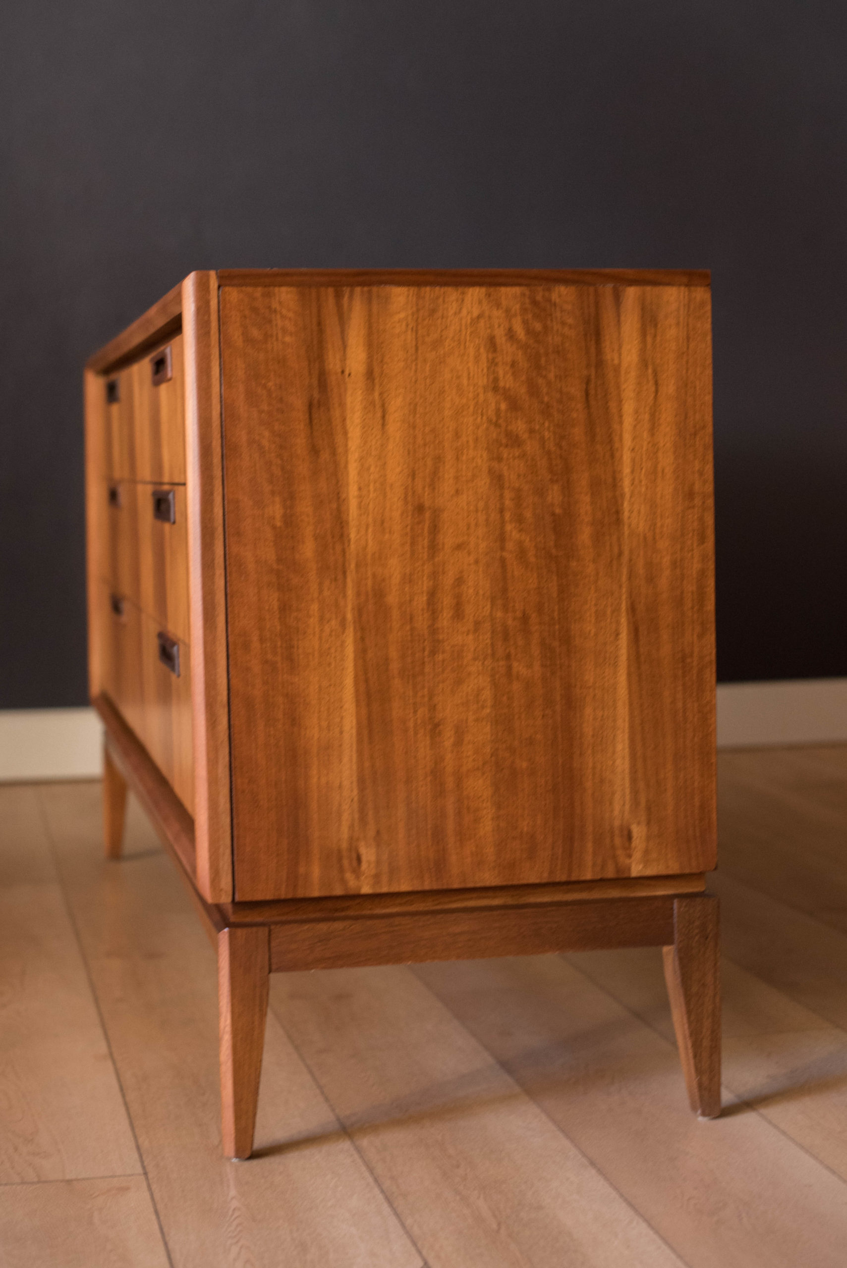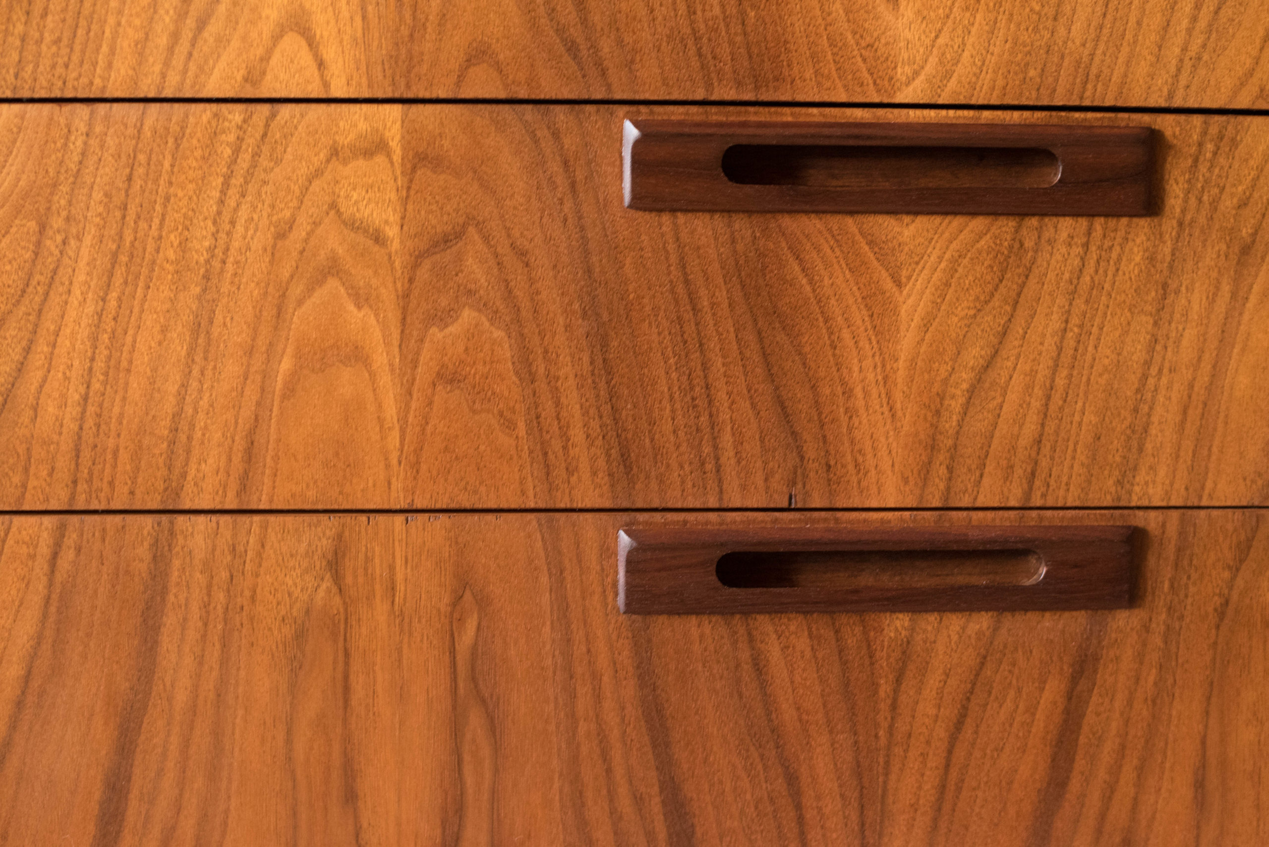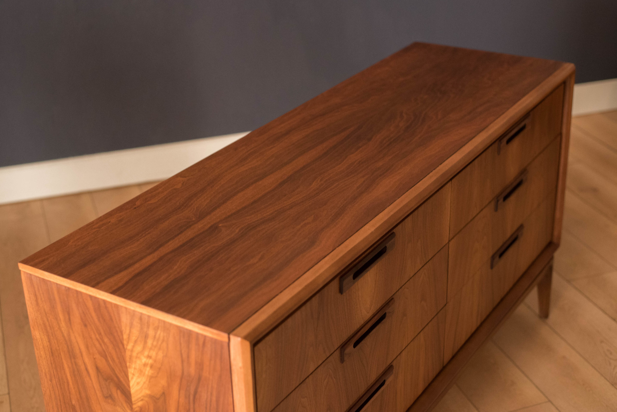 Classic American vintage dresser in walnut manufactured by United Furniture Corporation, c. 1960’s. This piece features sculptural solid wood handles and six dovetailed drawers with deep storage space.