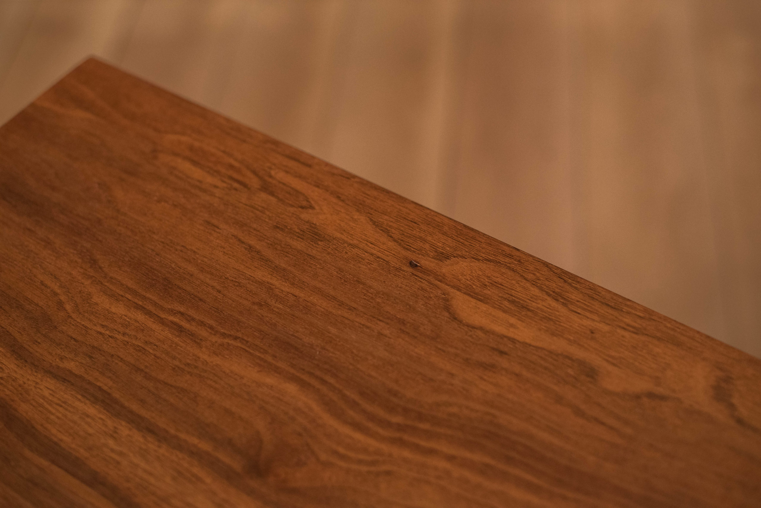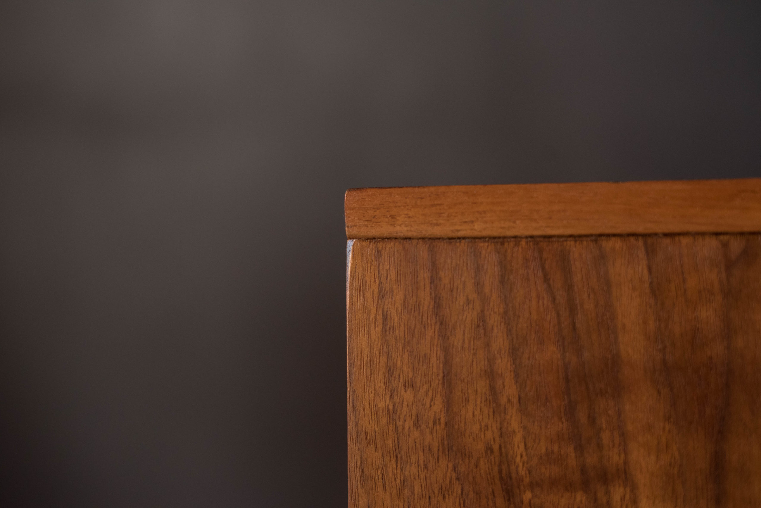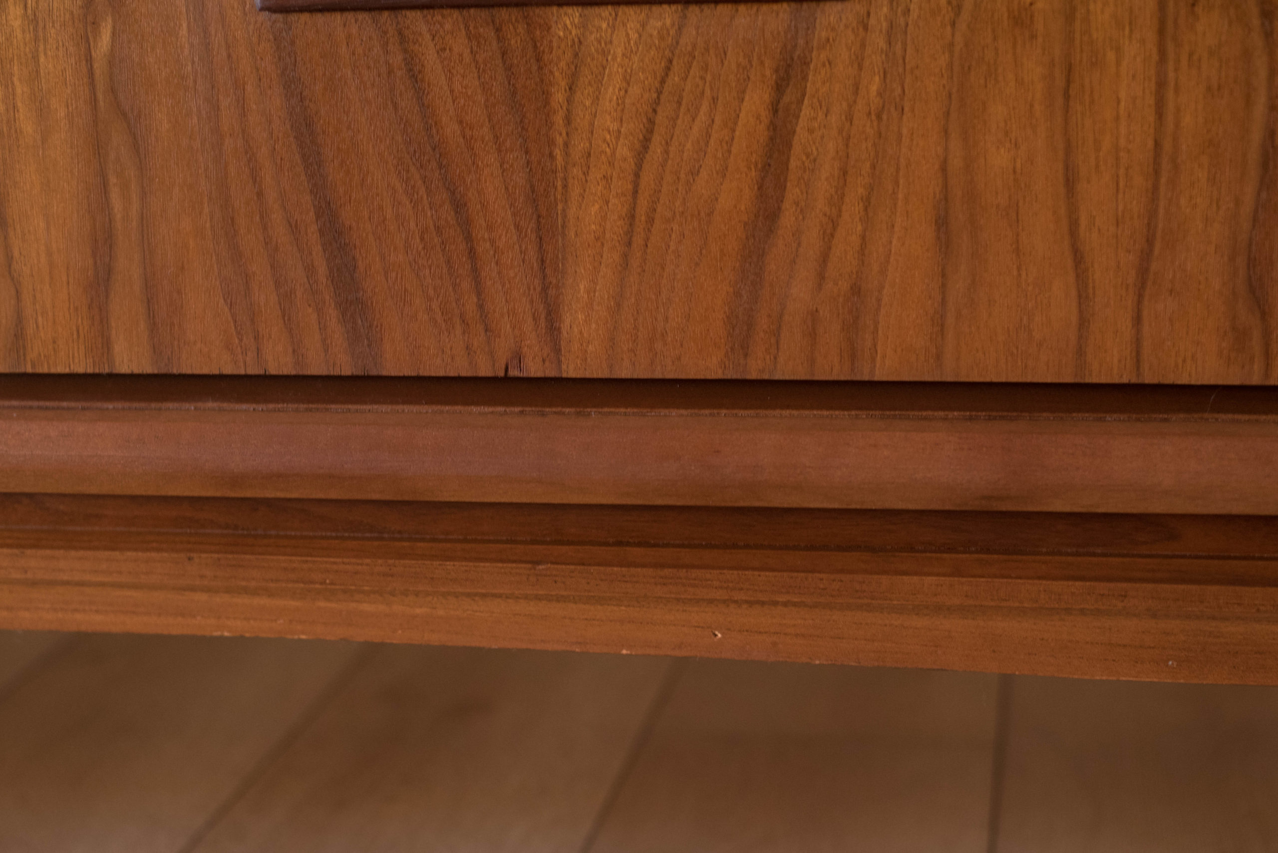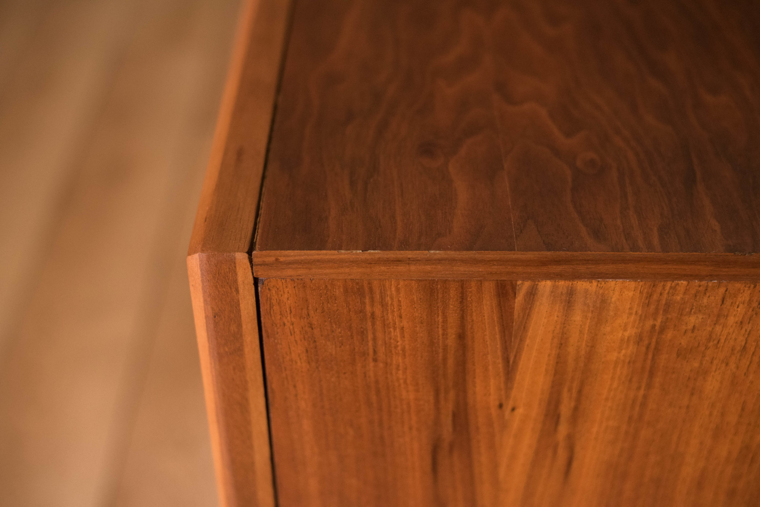 Classic American vintage dresser in walnut manufactured by United Furniture Corporation, c. 1960’s. This piece features sculptural solid wood handles and six dovetailed drawers with deep storage space.