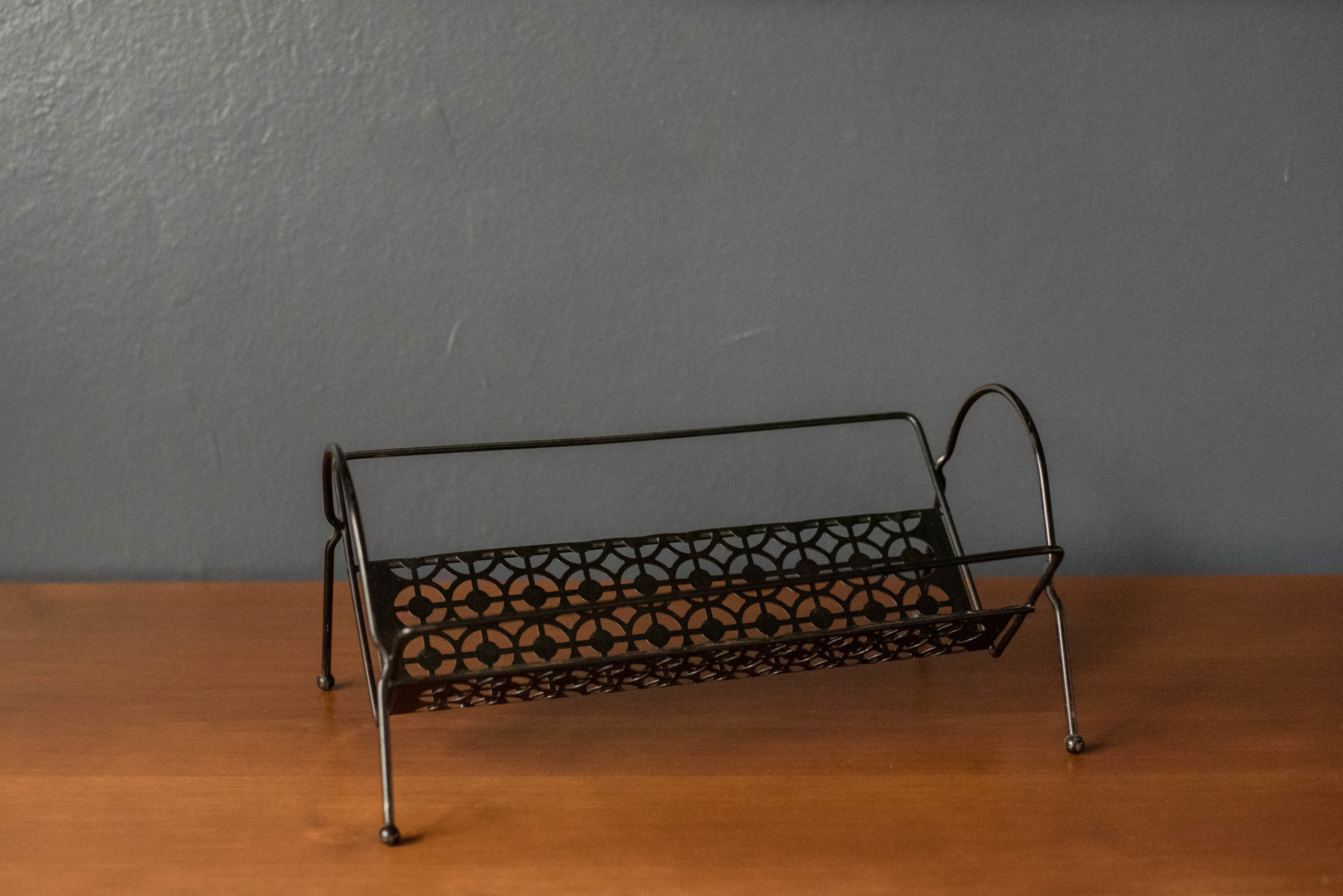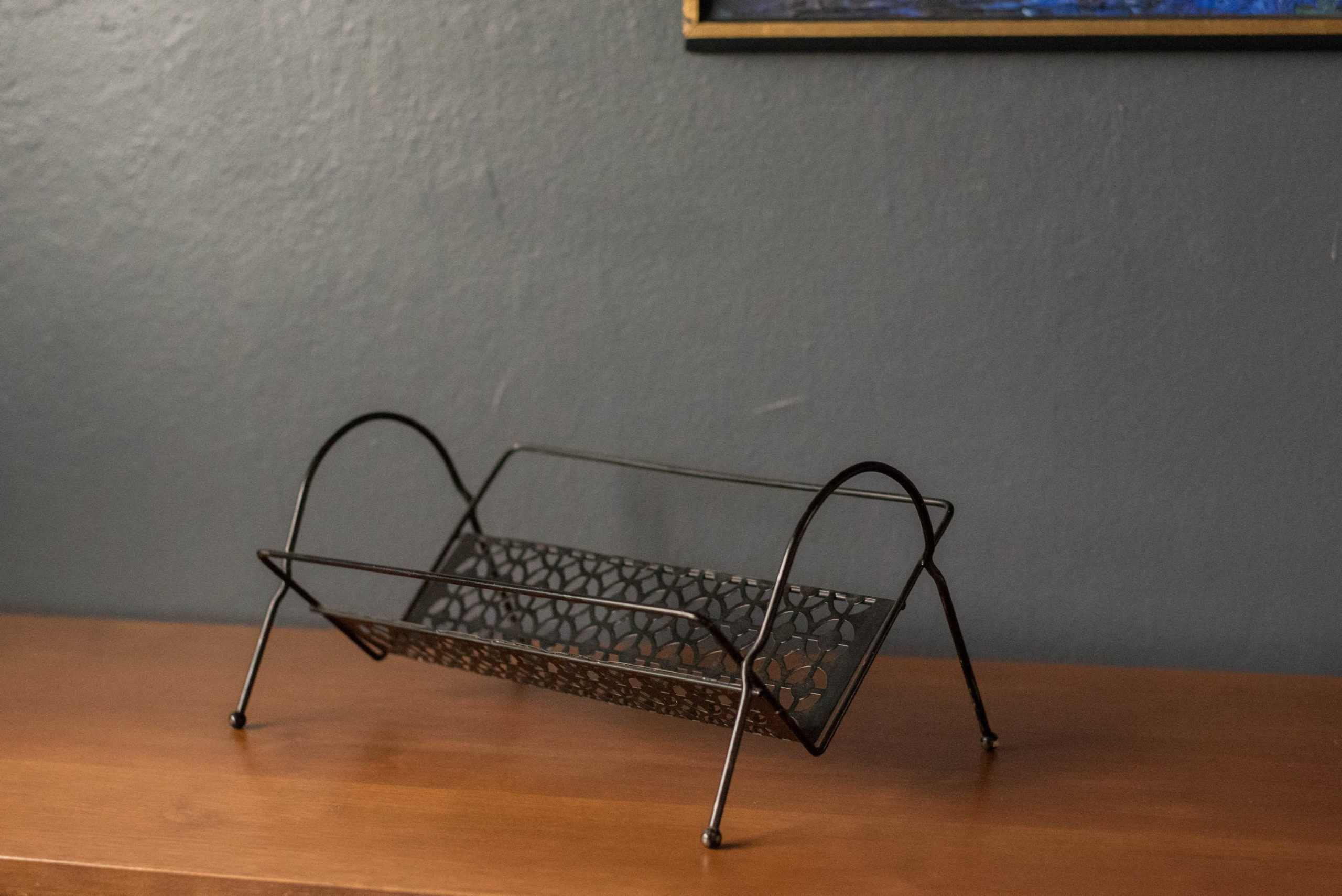 Vintage magazine rack basket holder circa 1960’s. The perfect home decor accessory to organize and display magazines, LP records, or light books. Features a unique design with protective ball feet and is lightweight making it easy to move around. This piece can easily be accessorized on top of a table, desk, or console to enhance your space. In good condition with wear such as patina on the metal.