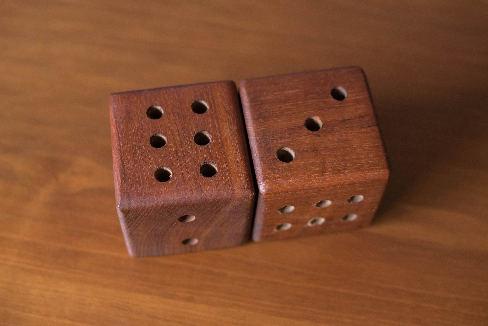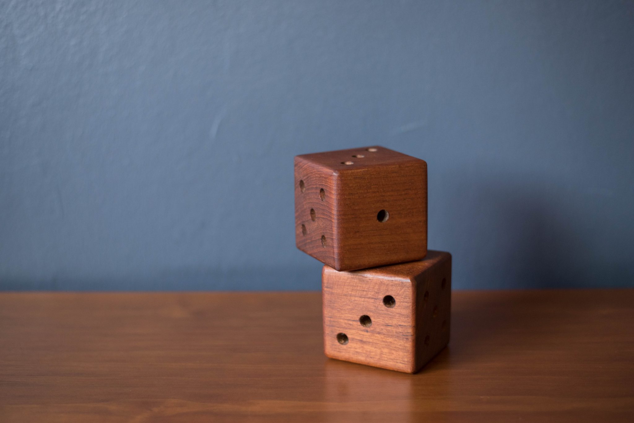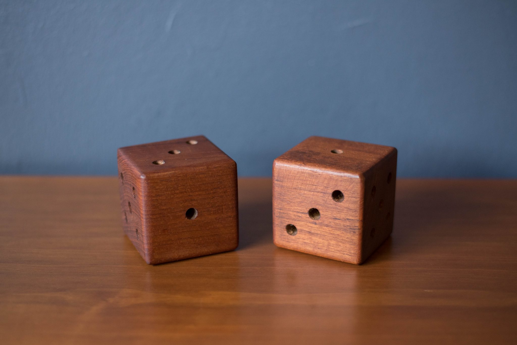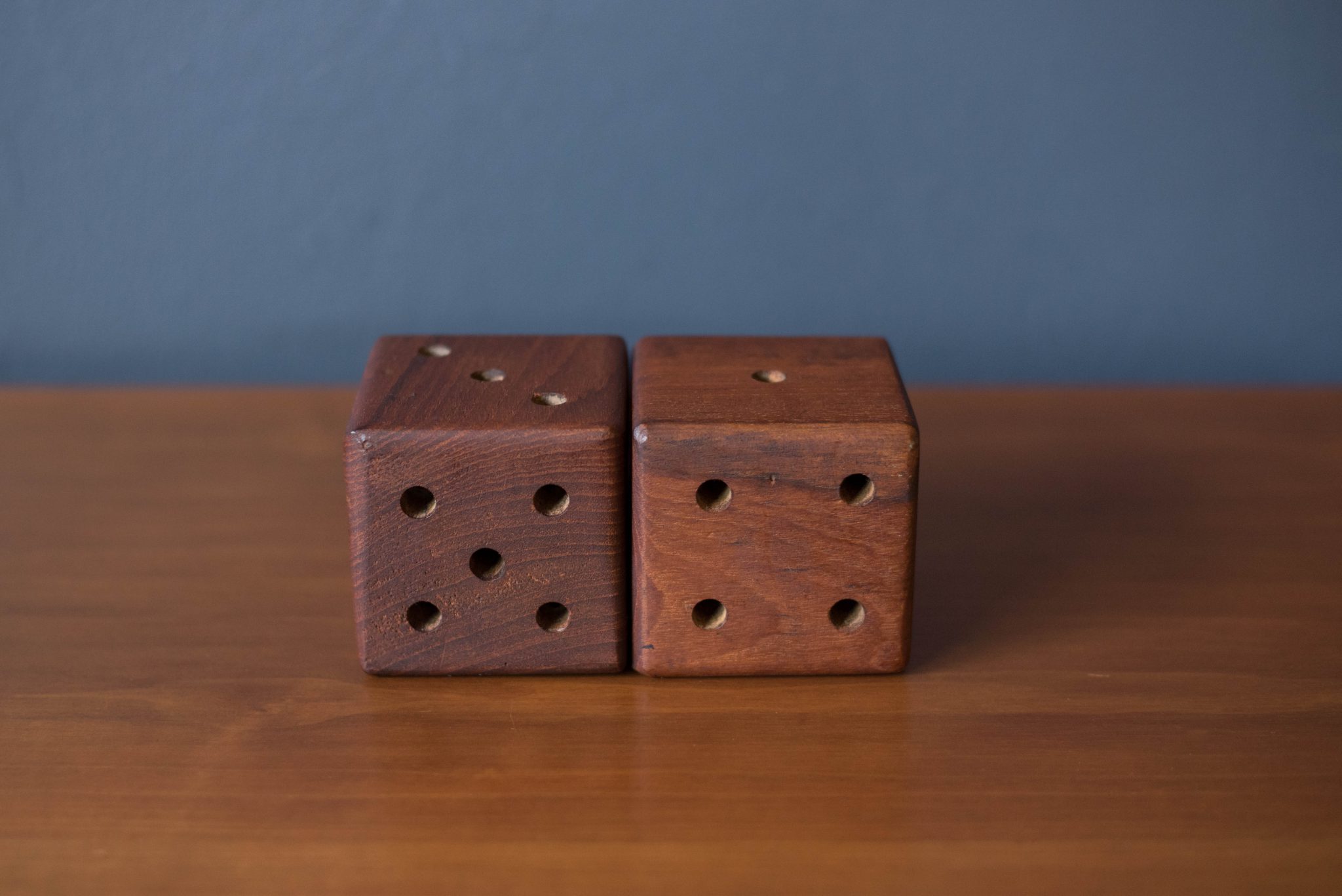 Vintage set of oversized wood dice, circa 1960s. This fun and unique pair is handcrafted in old growth teak and can be accessorized with any modern decor.