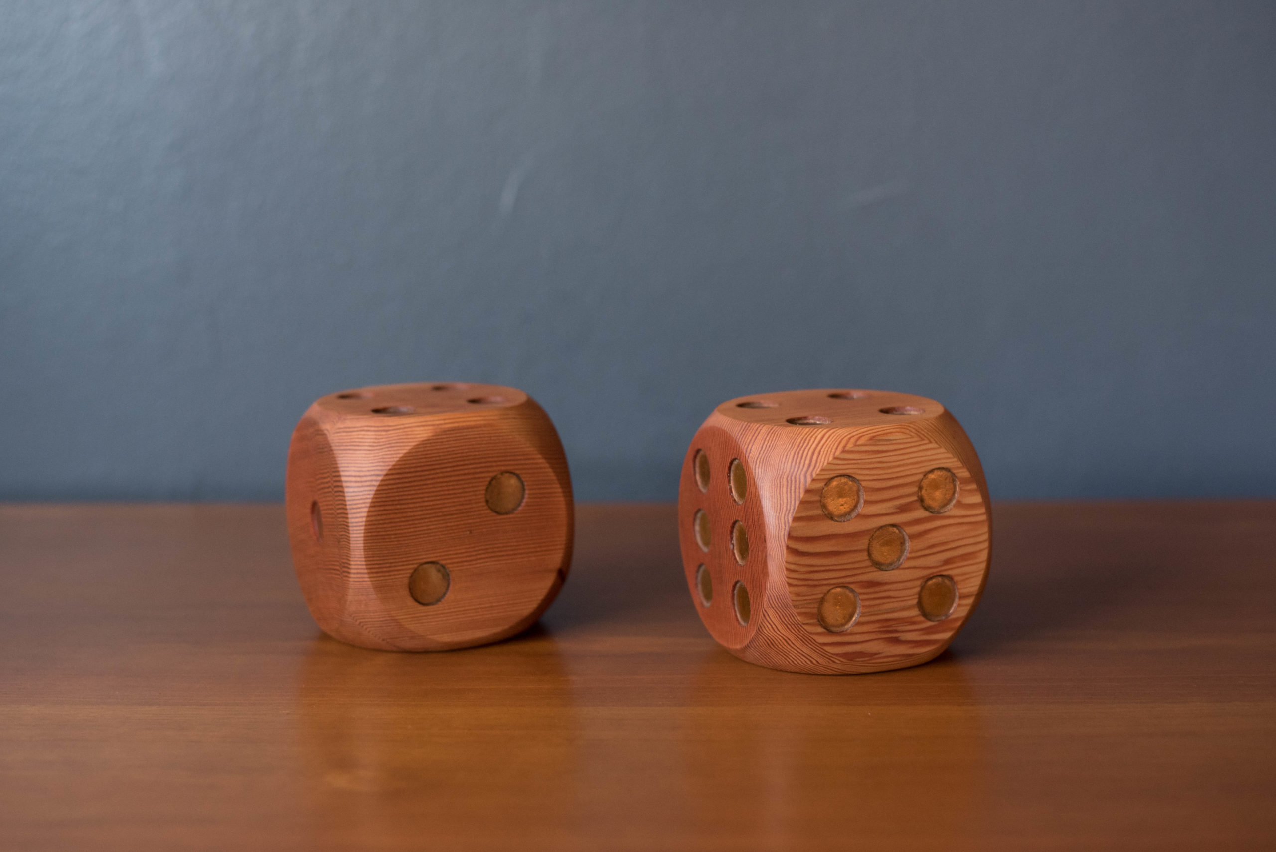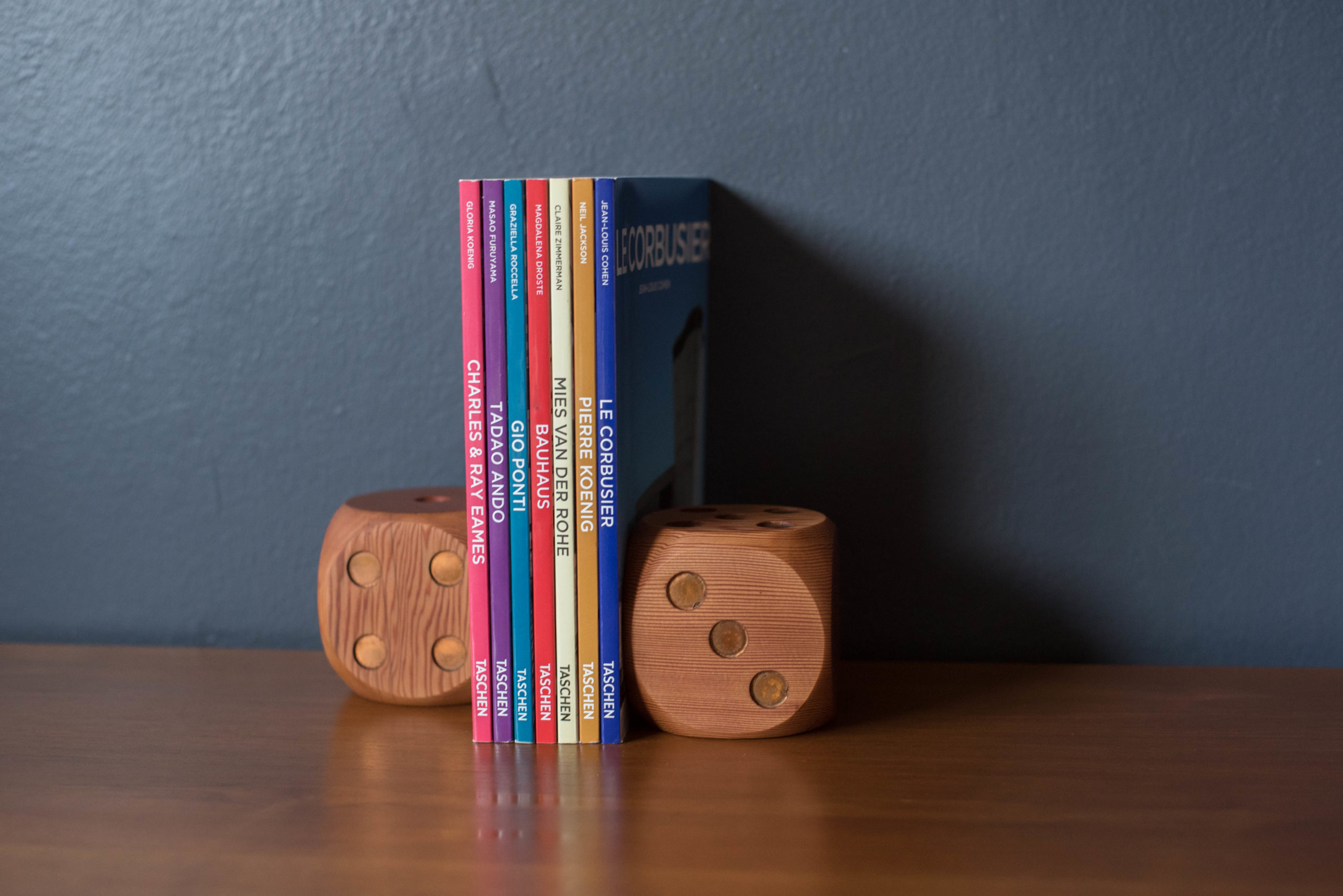 Vintage pair of oversized dice bookends, circa 1970s. This fun and unique pair is crafted in cedar wood and copper. The perfect accessory for any contemporary or modern decor.