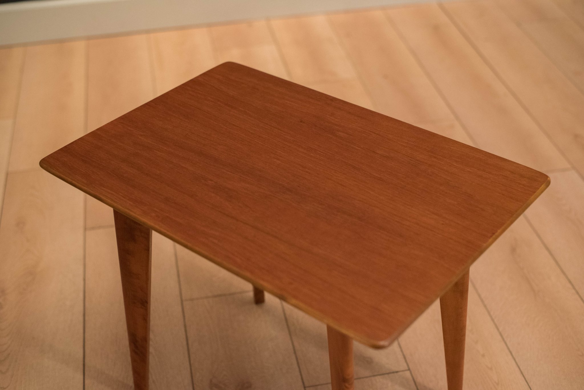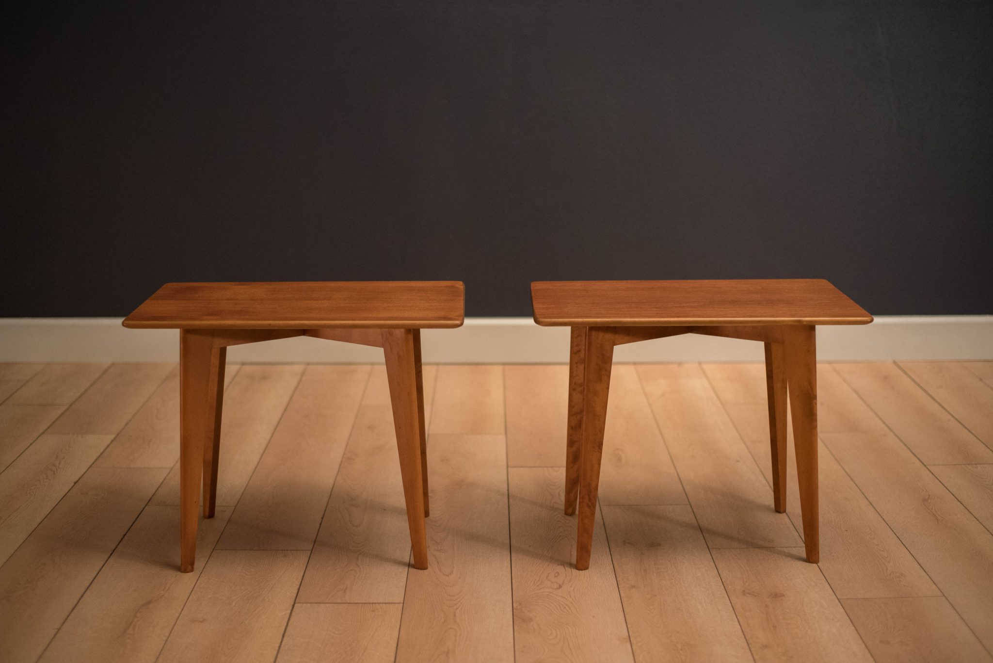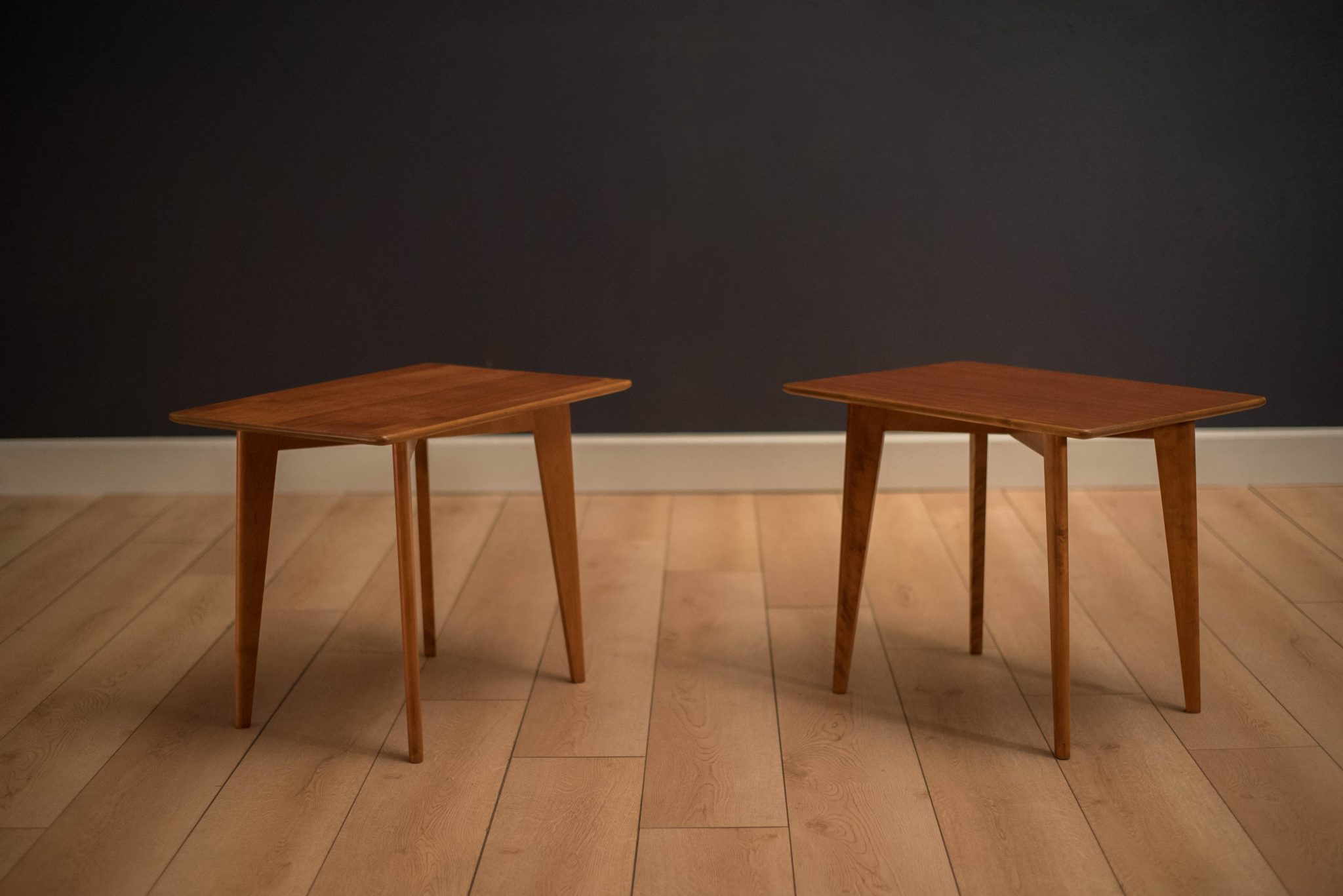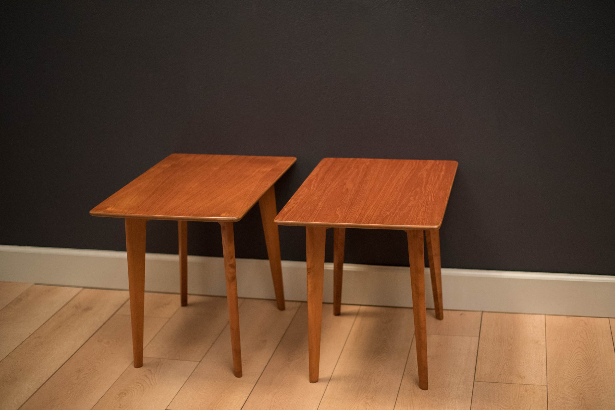 Mid Century matching pair of side tables manufactured by DUX in teak. This set features splayed legs and a rectangular top. Price is for the pair.