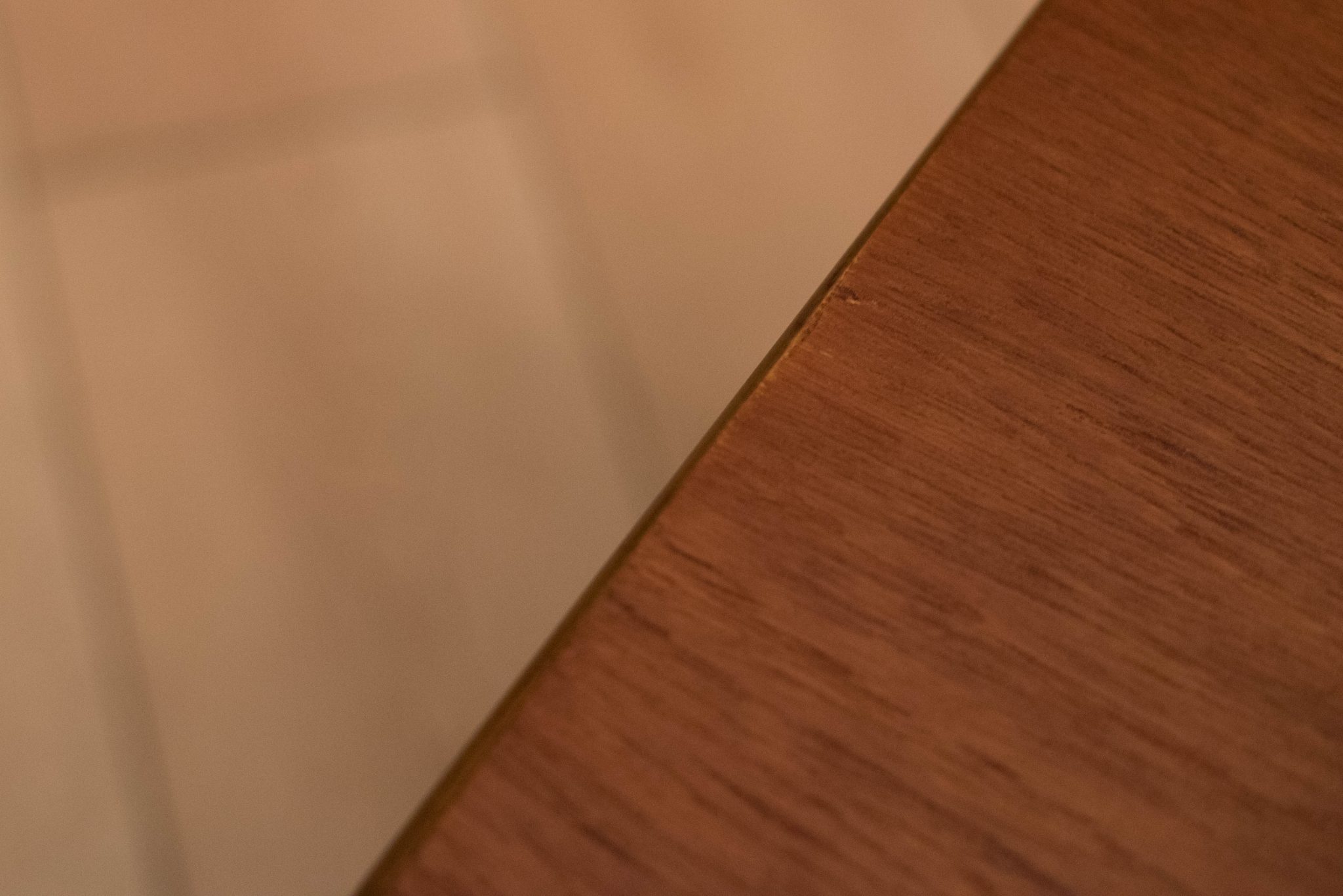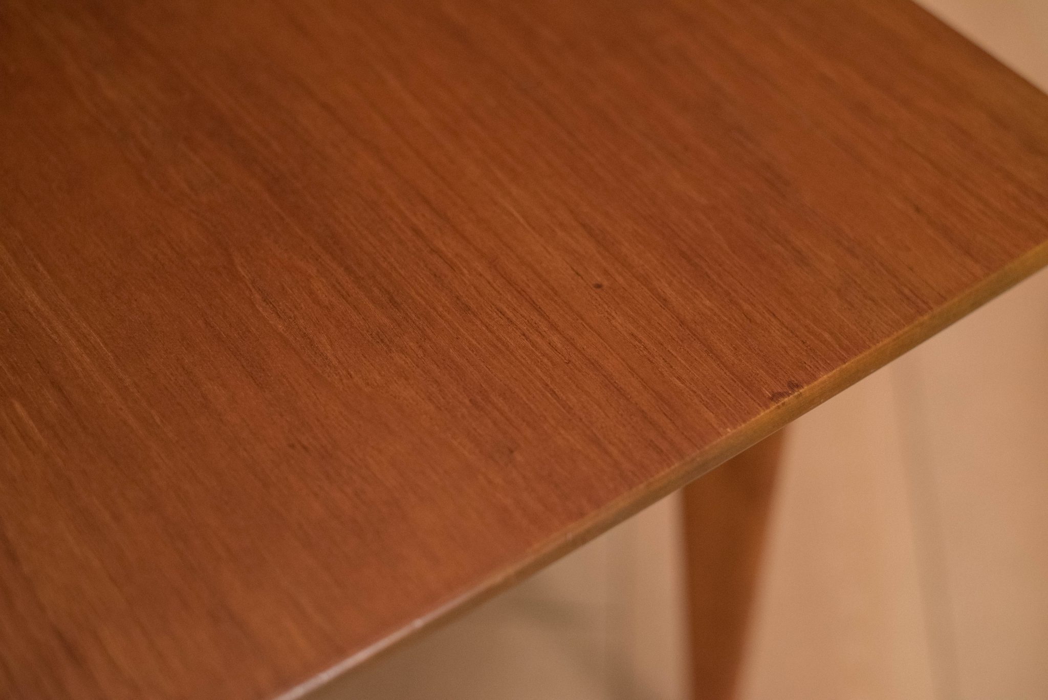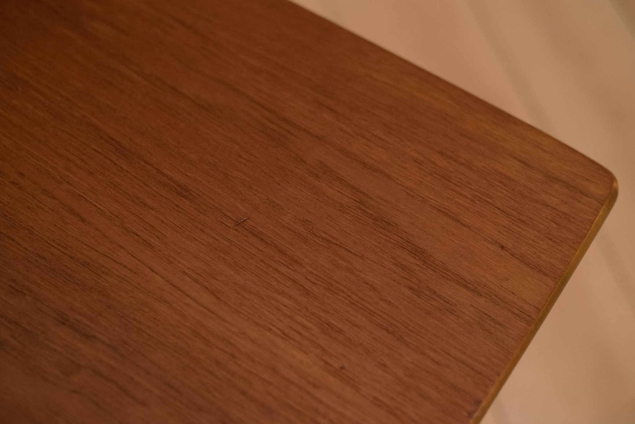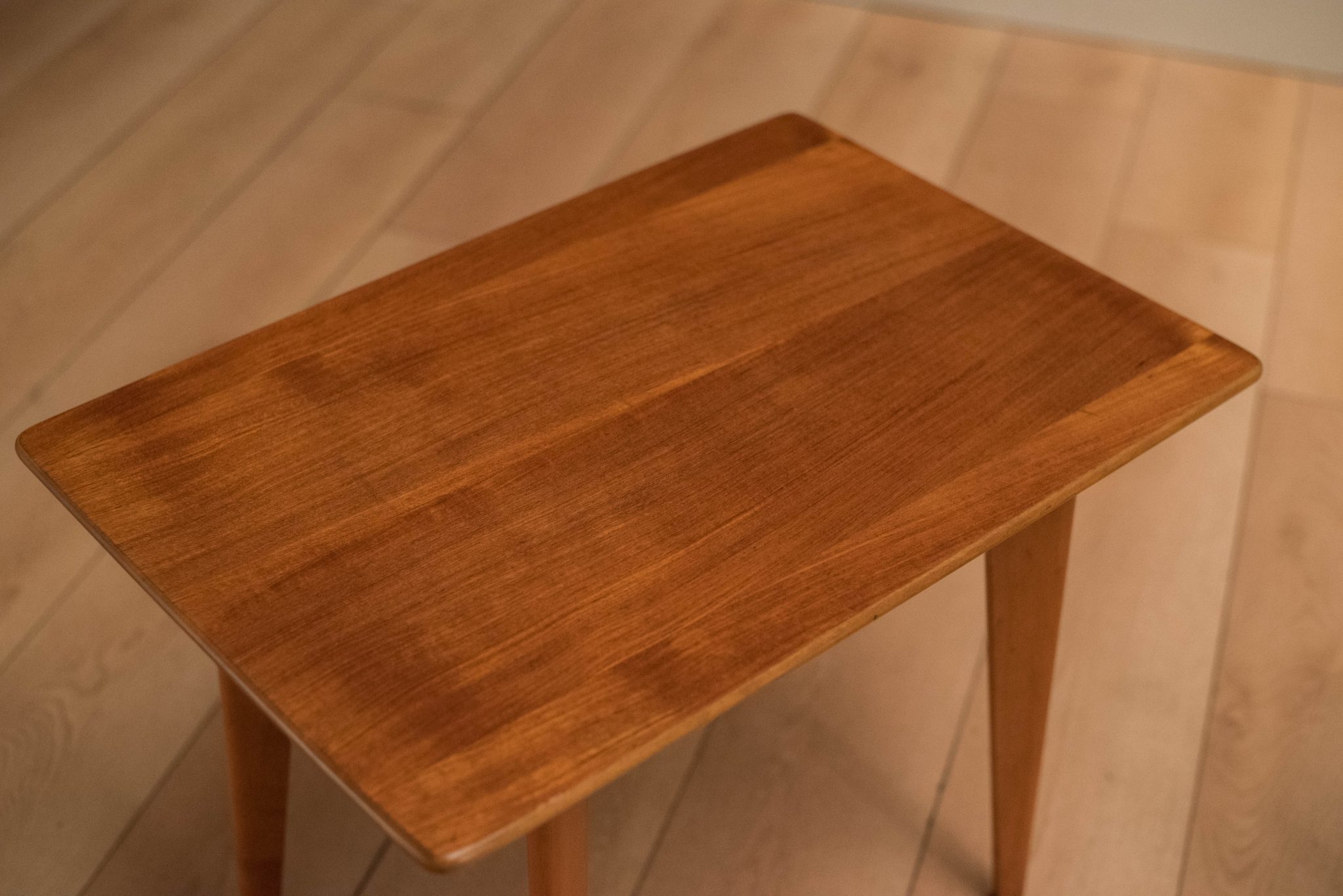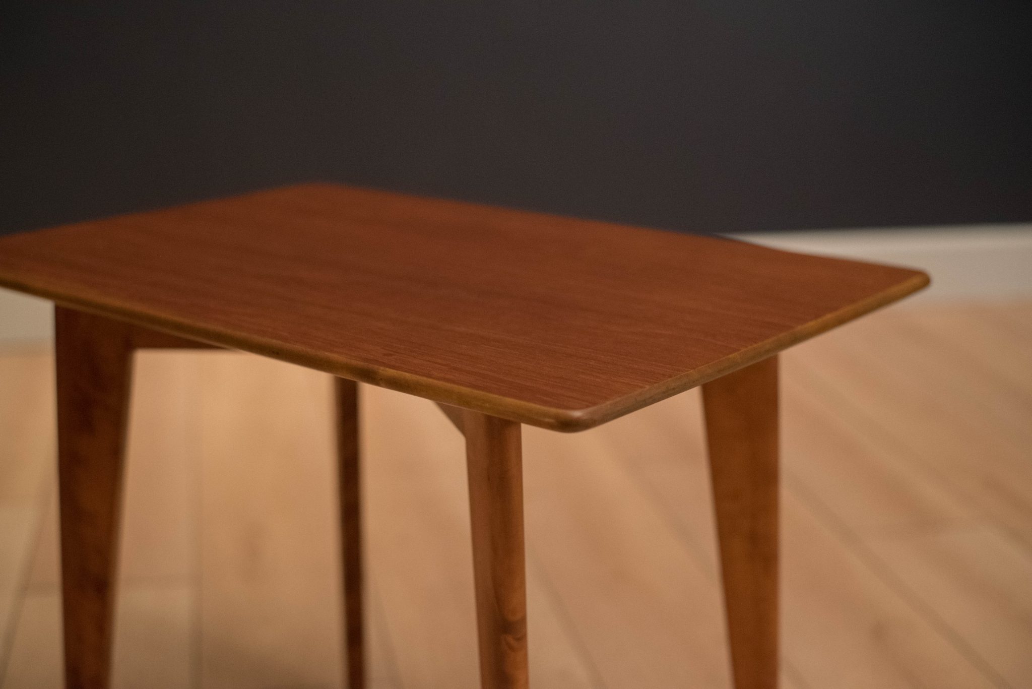 Mid Century matching pair of side tables manufactured by DUX in teak. This set features splayed legs and a rectangular top. Price is for the pair.