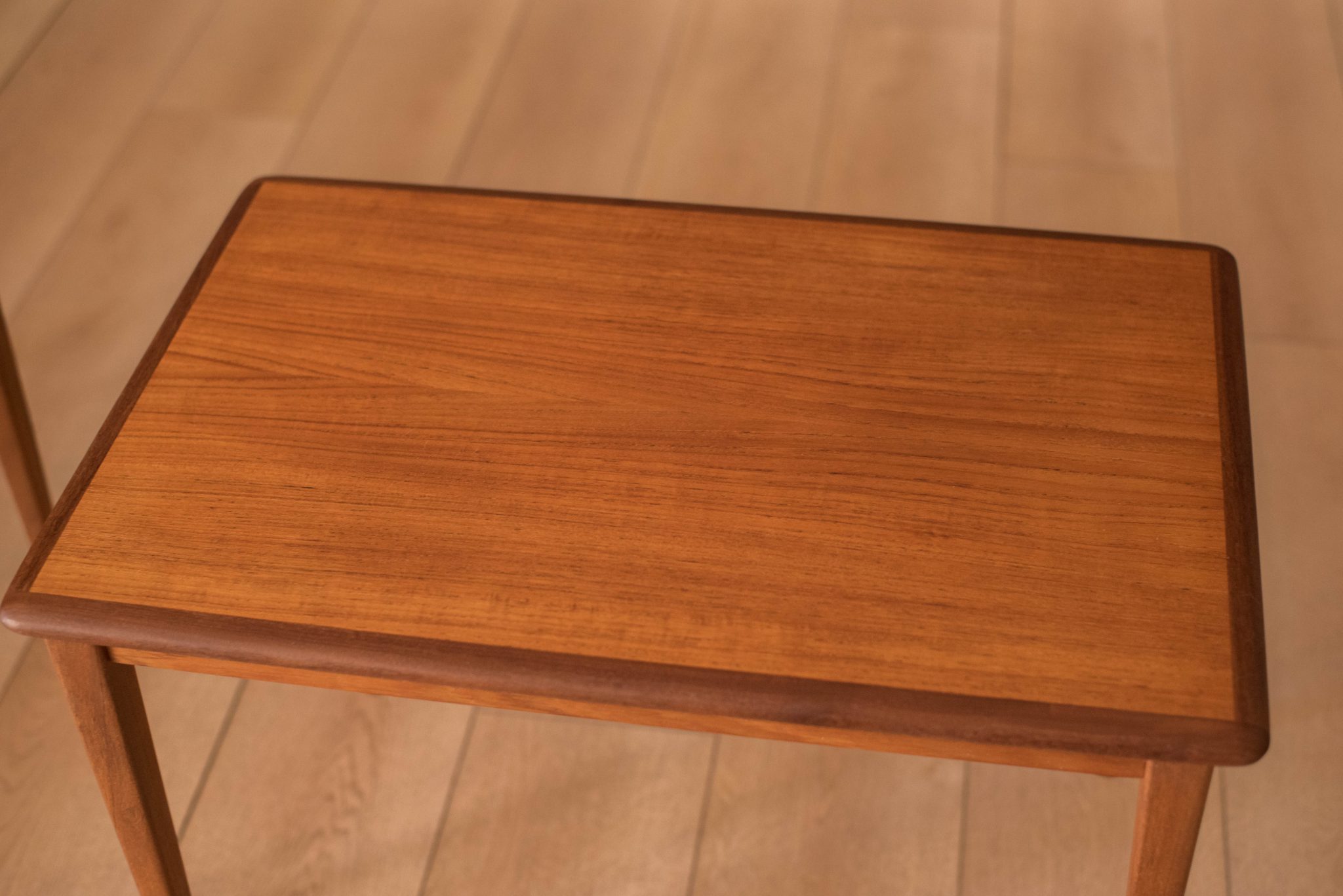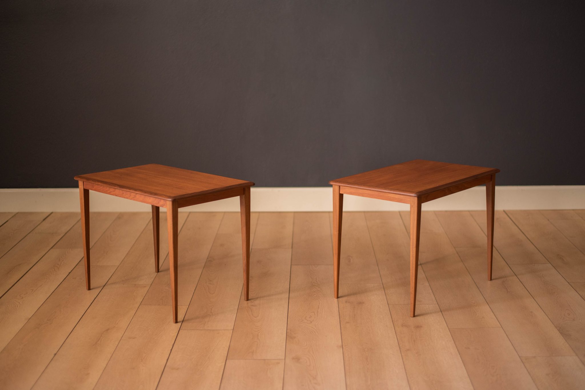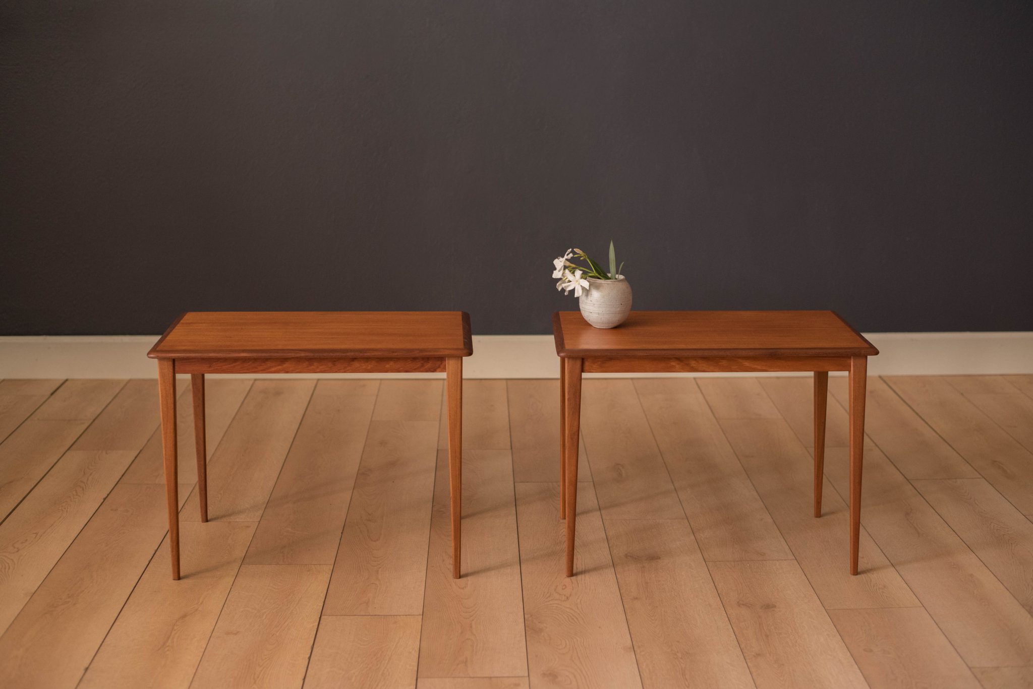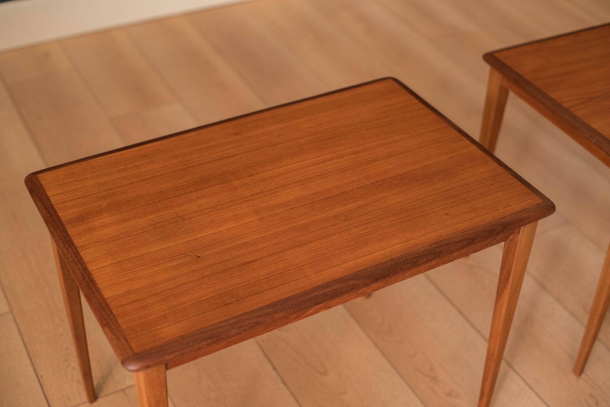 Vintage pair of side tables made in Sweden, circa 1960s. This set features tapered angled legs and teak table tops with contrasting solid afromasia edges.
