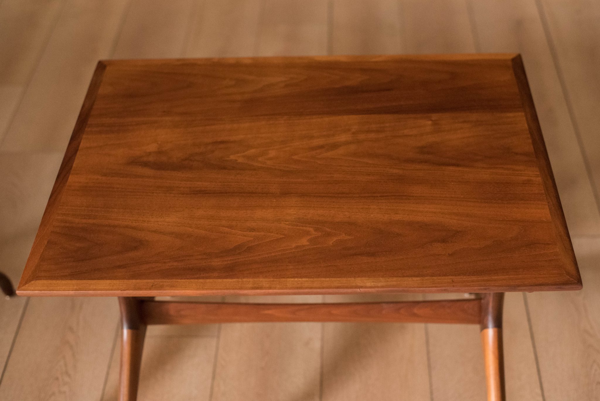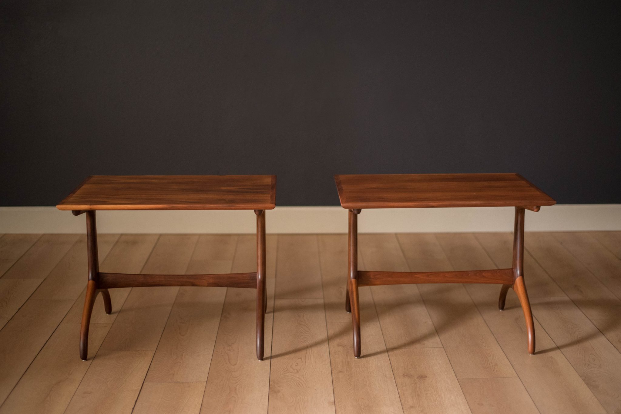 Vintage pair of side tables in walnut by Heritage Henredon, circa 1960s. This classic set features a rectangular shaped top with sculptural wishbone legs. Perfect for any Mid-Century Modern or contemporary decor. Price is for the pair.
