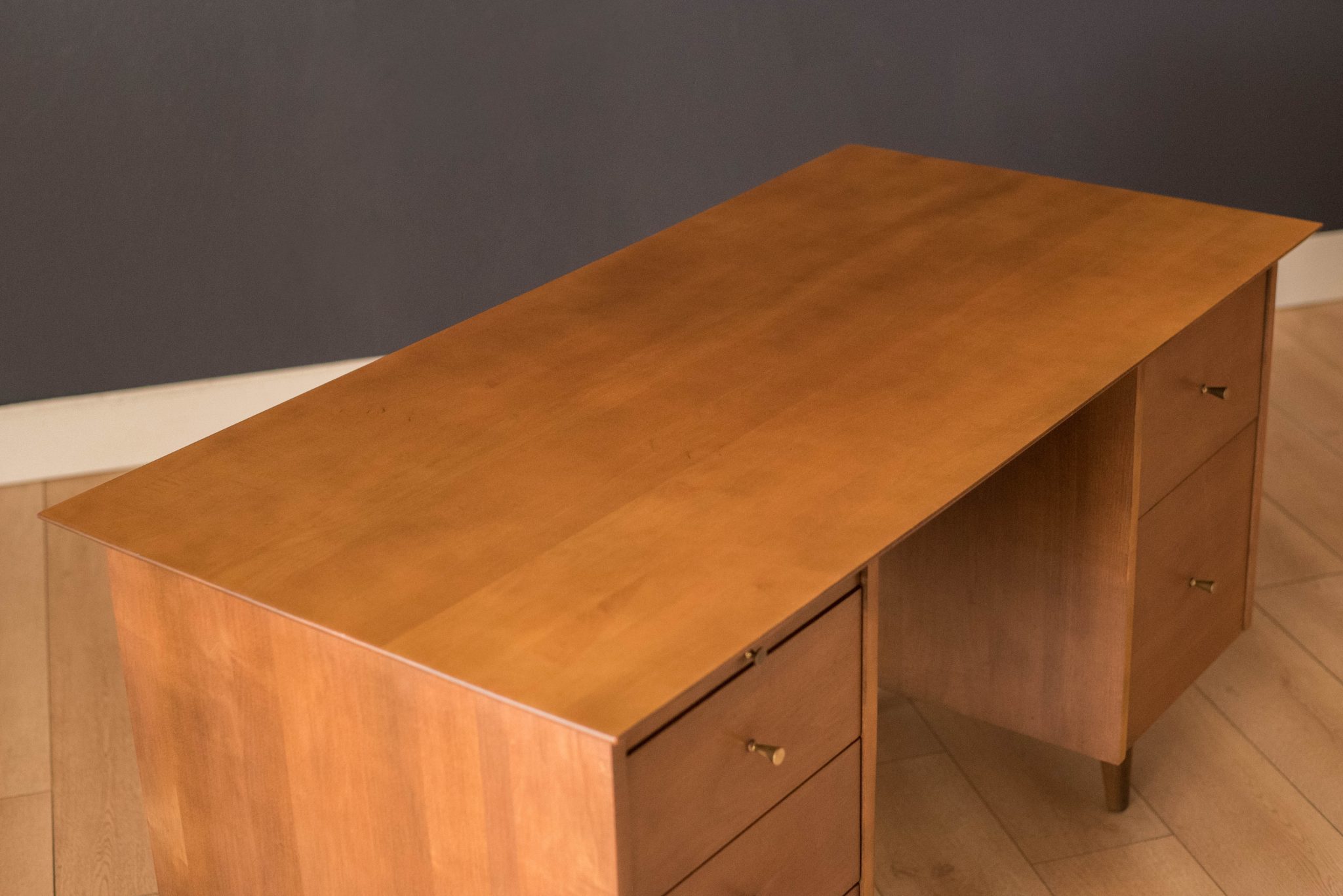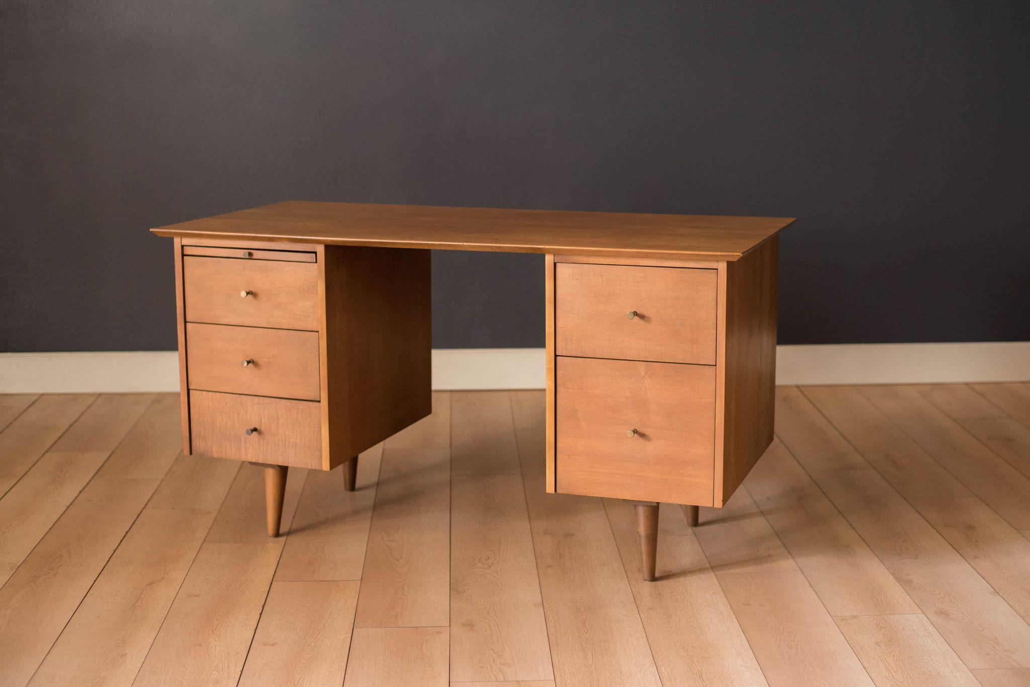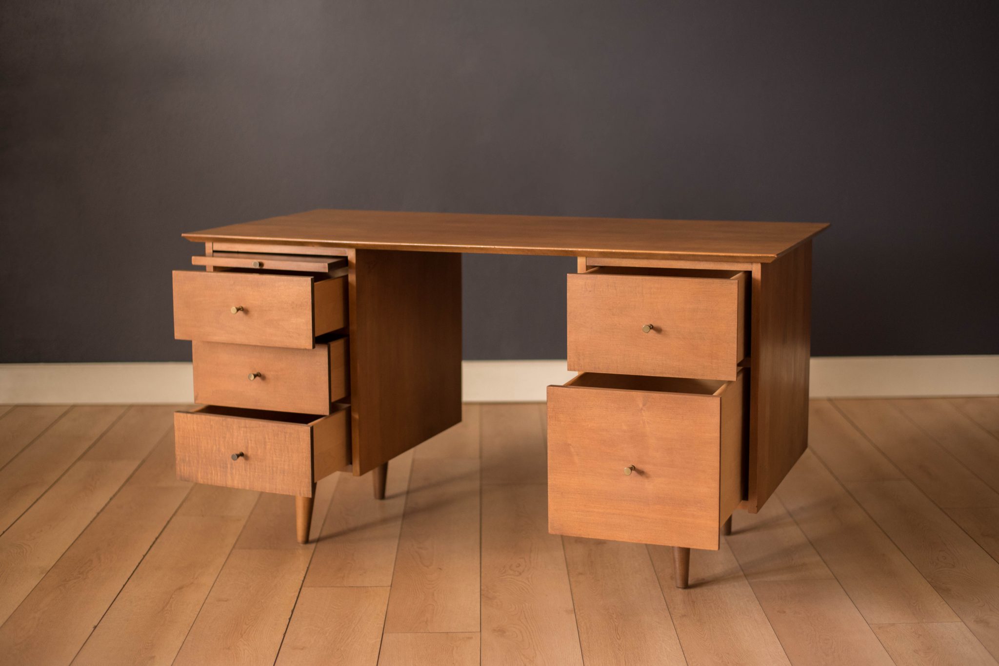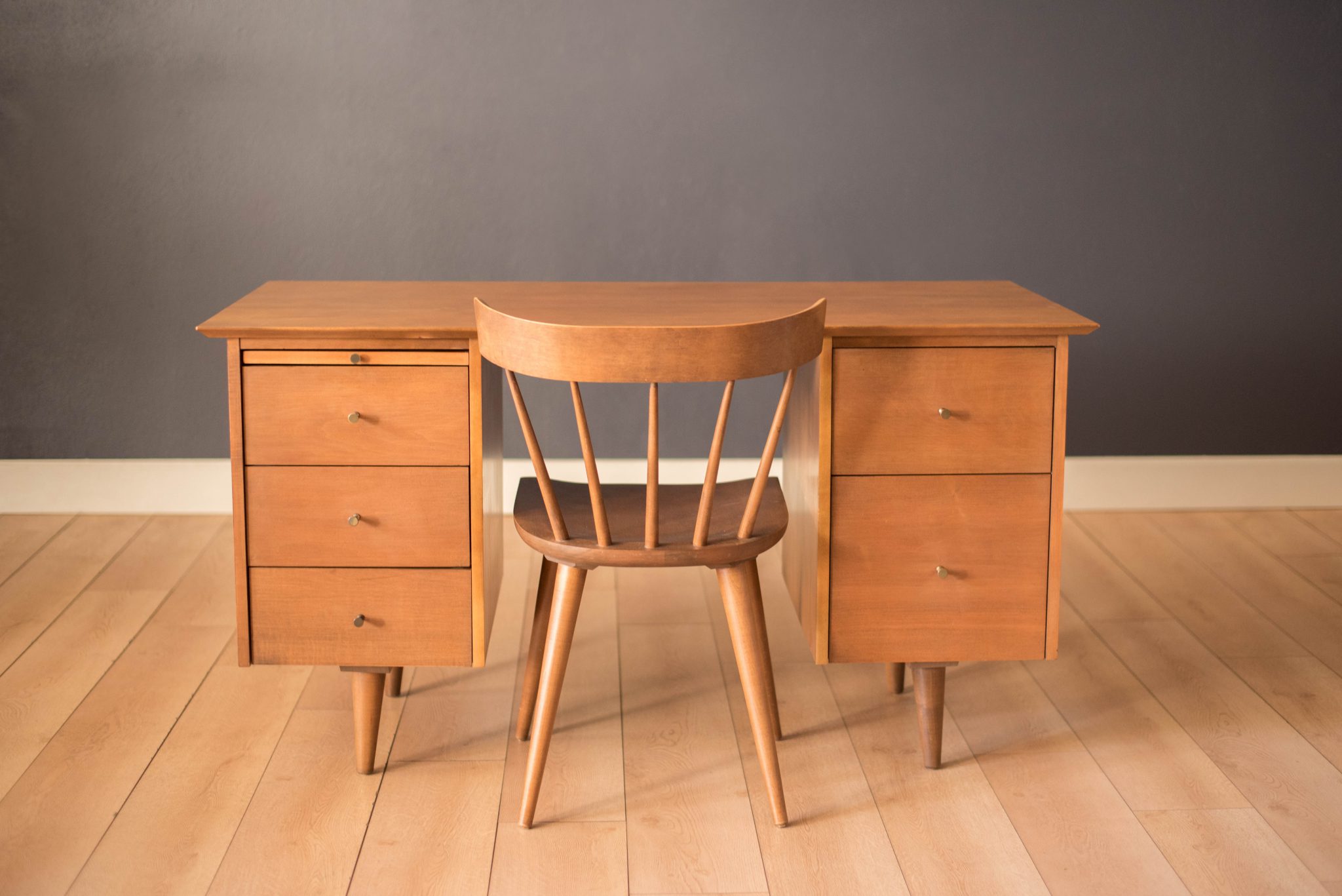 Mid-Century Modern Planner Group desk designed by Paul McCobb for Winchendon. This piece is constructed of solid birch with a natural finish. Offers plenty of storage space equipped with five drawers including a filing cabinet accessorized with the designer’s signature brass pull knobs. Features an additional slide out writing surface and is finished on the backside.