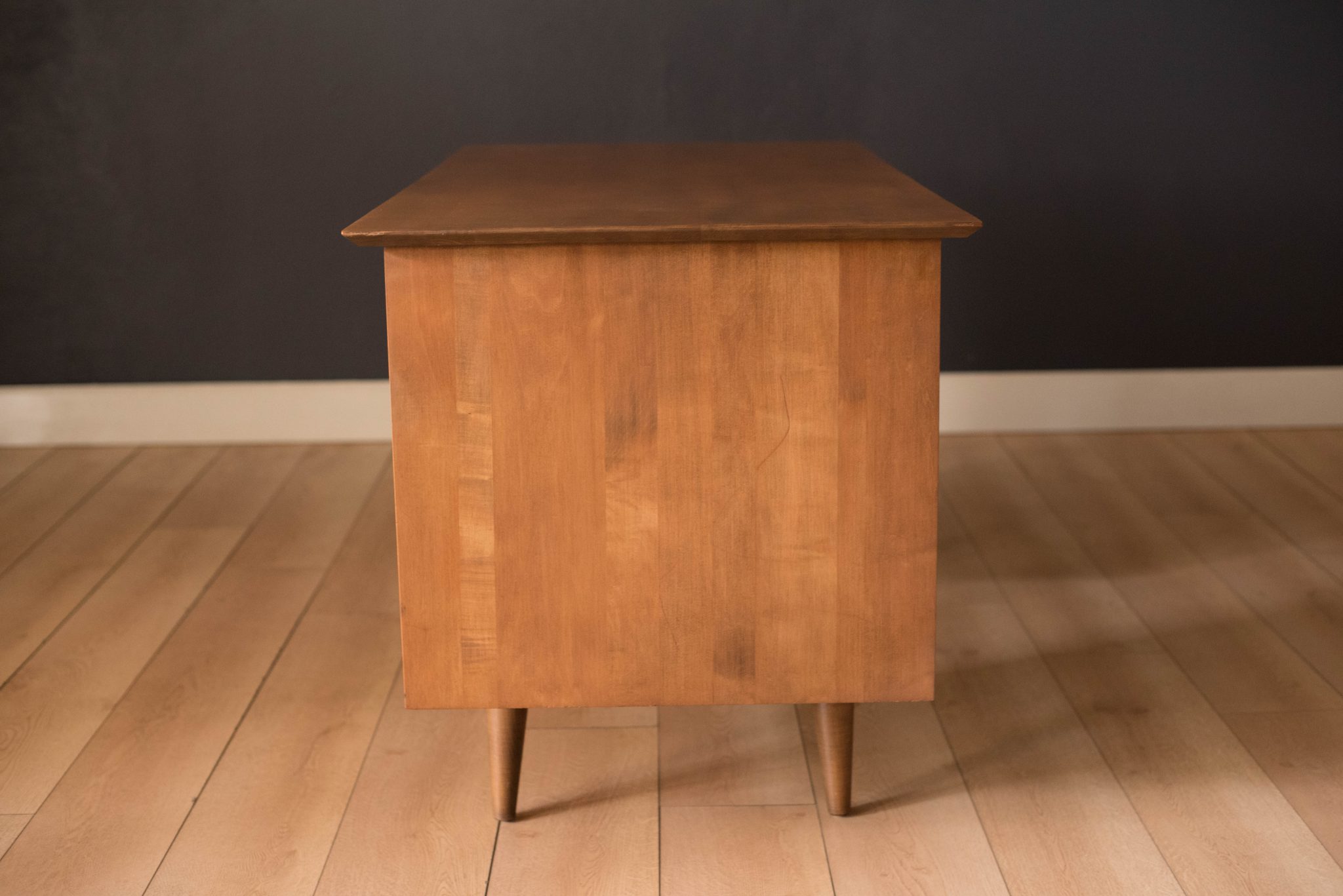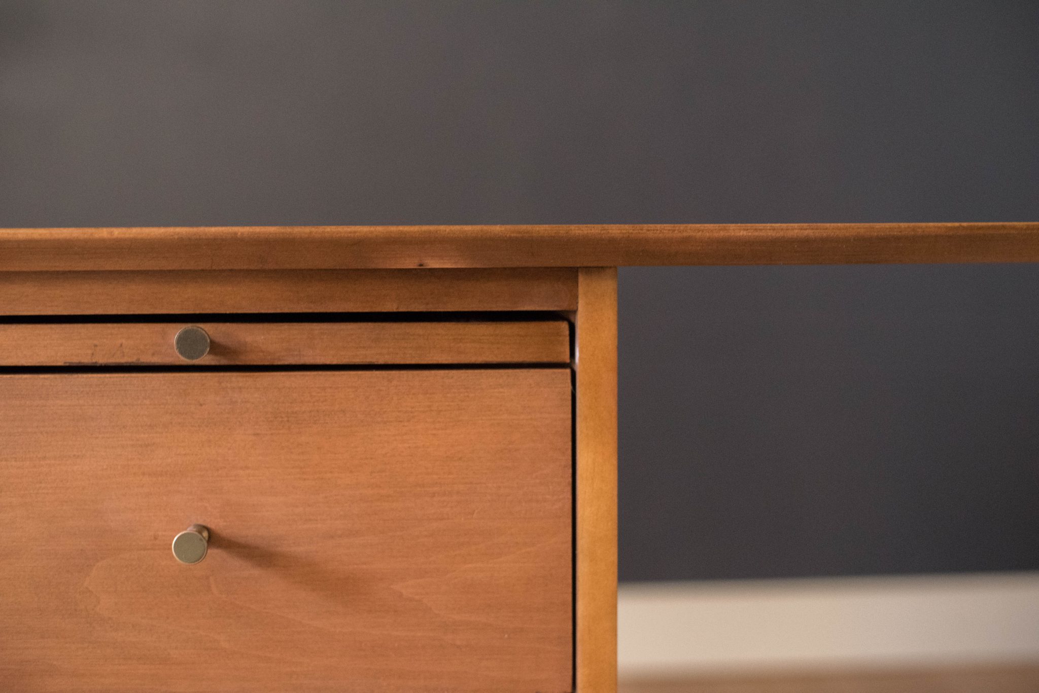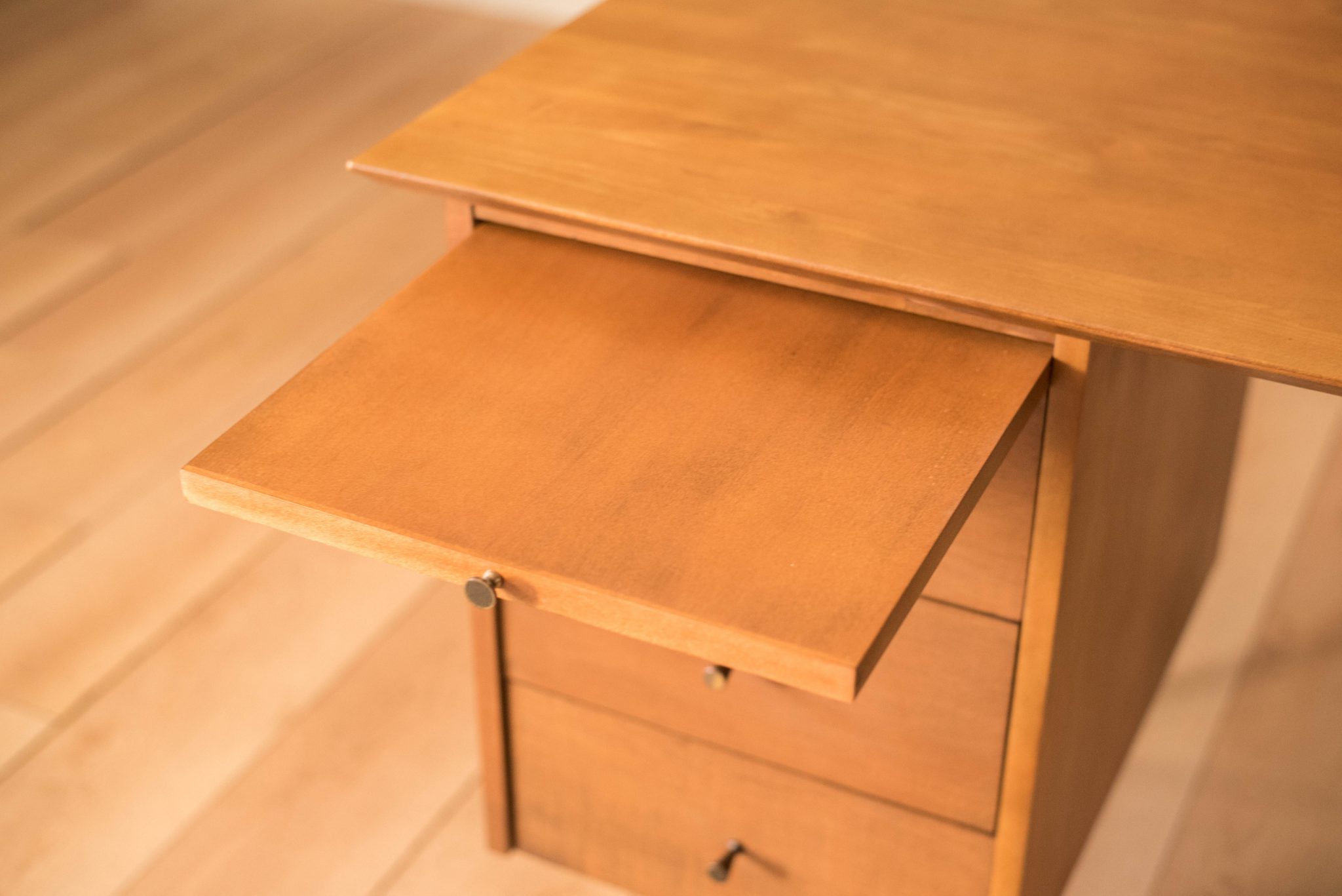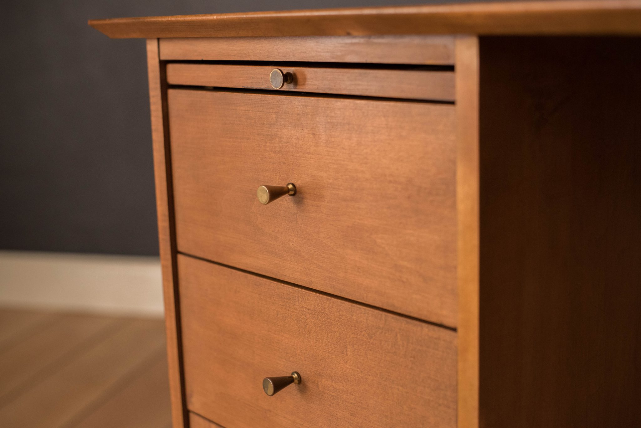 Mid-Century Modern Planner Group desk designed by Paul McCobb for Winchendon. This piece is constructed of solid birch with a natural finish. Offers plenty of storage space equipped with five drawers including a filing cabinet accessorized with the designer’s signature brass pull knobs. Features an additional slide out writing surface and is finished on the backside.