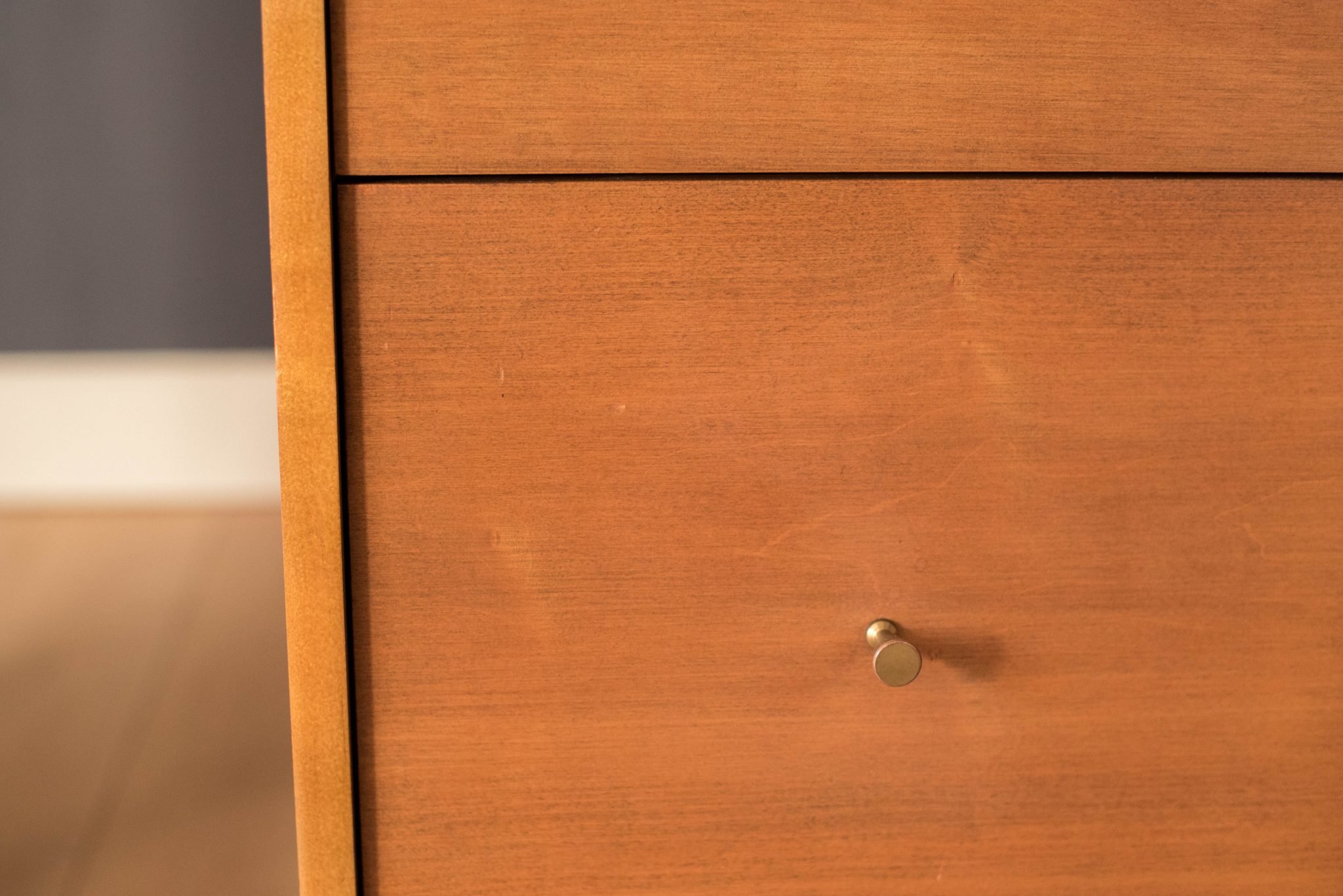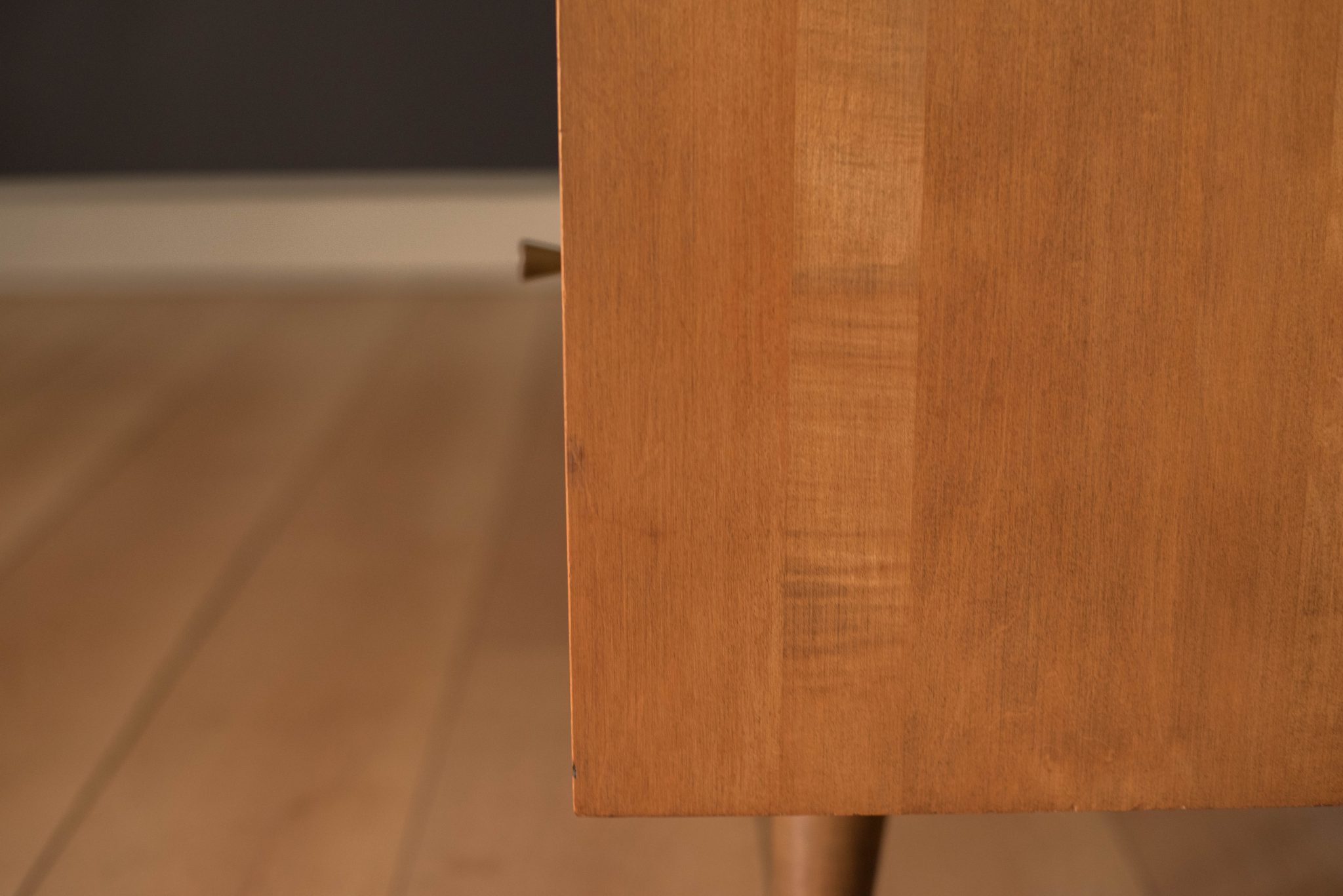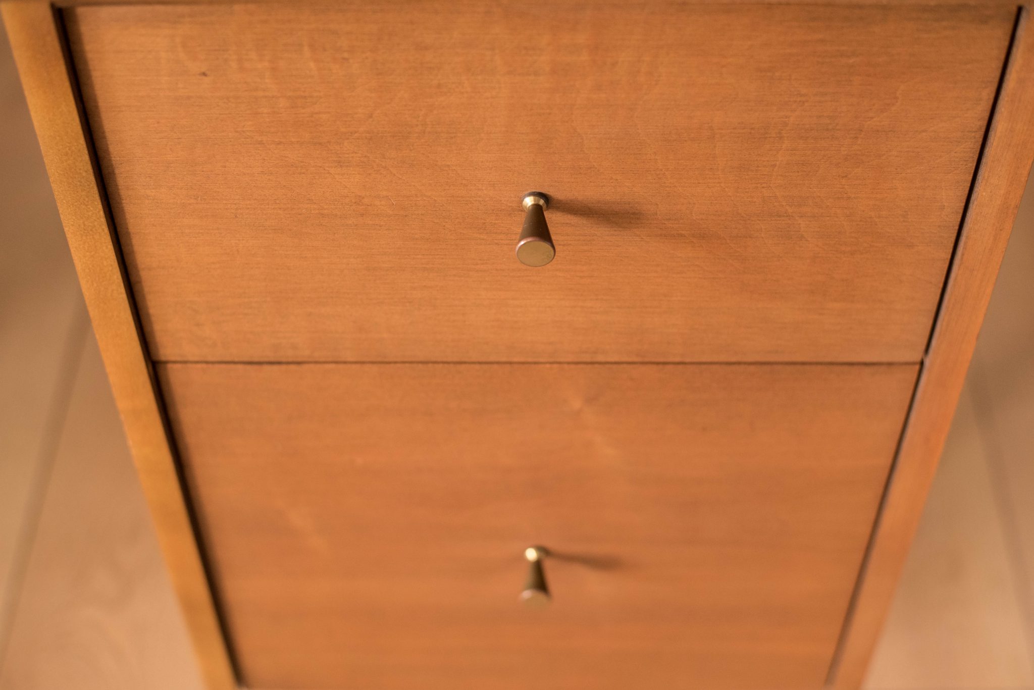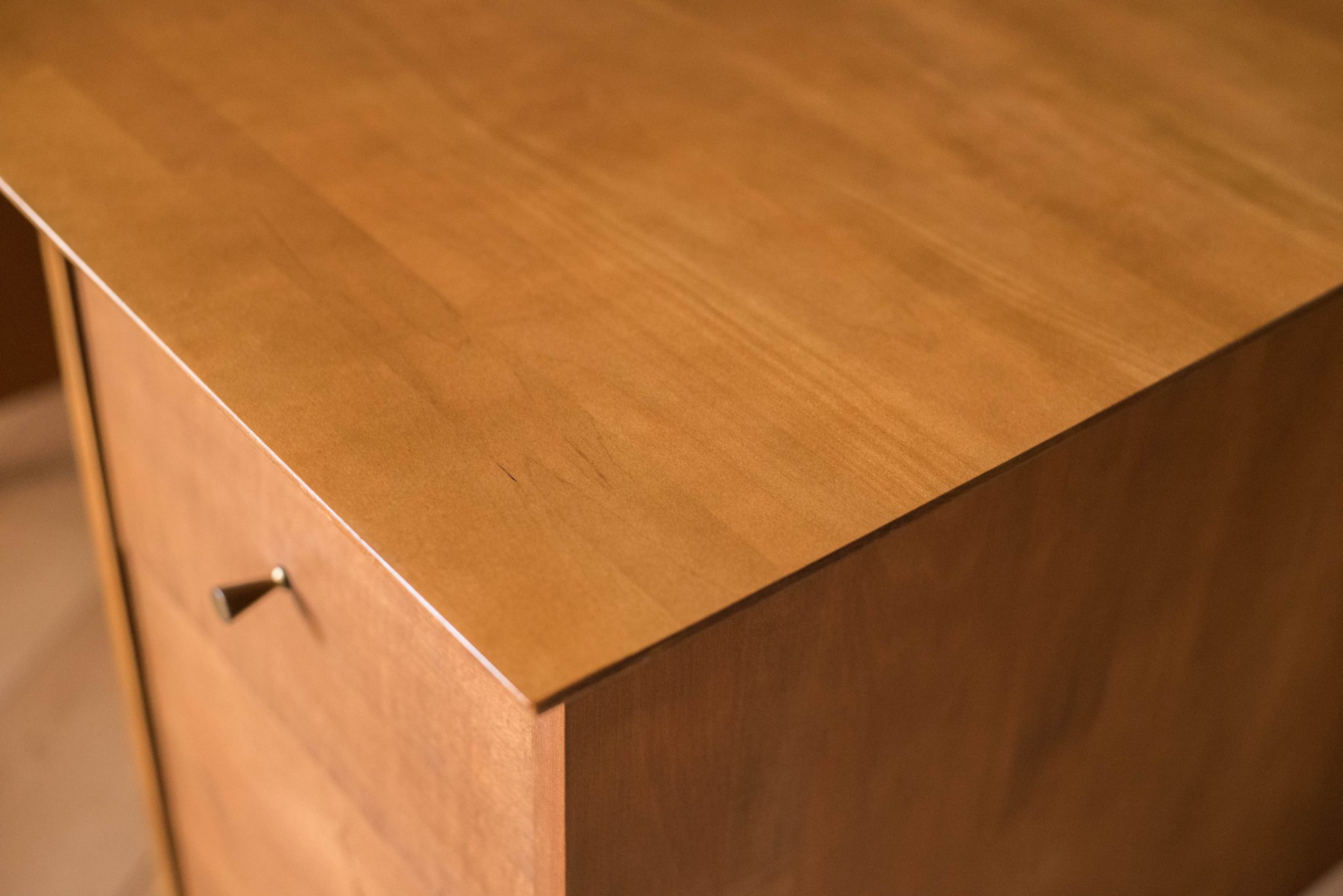 Mid-Century Modern Planner Group desk designed by Paul McCobb for Winchendon. This piece is constructed of solid birch with a natural finish. Offers plenty of storage space equipped with five drawers including a filing cabinet accessorized with the designer’s signature brass pull knobs. Features an additional slide out writing surface and is finished on the backside.
