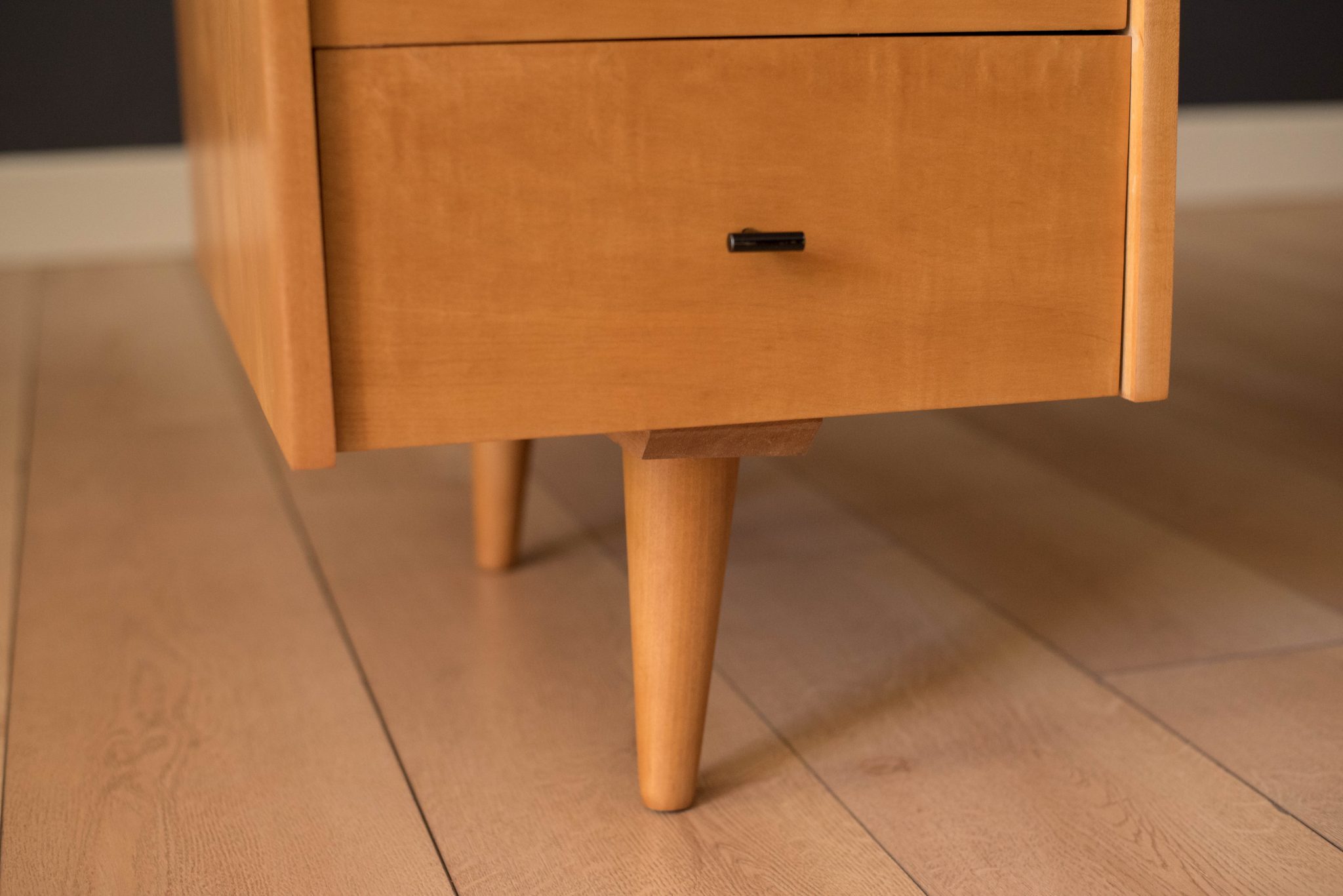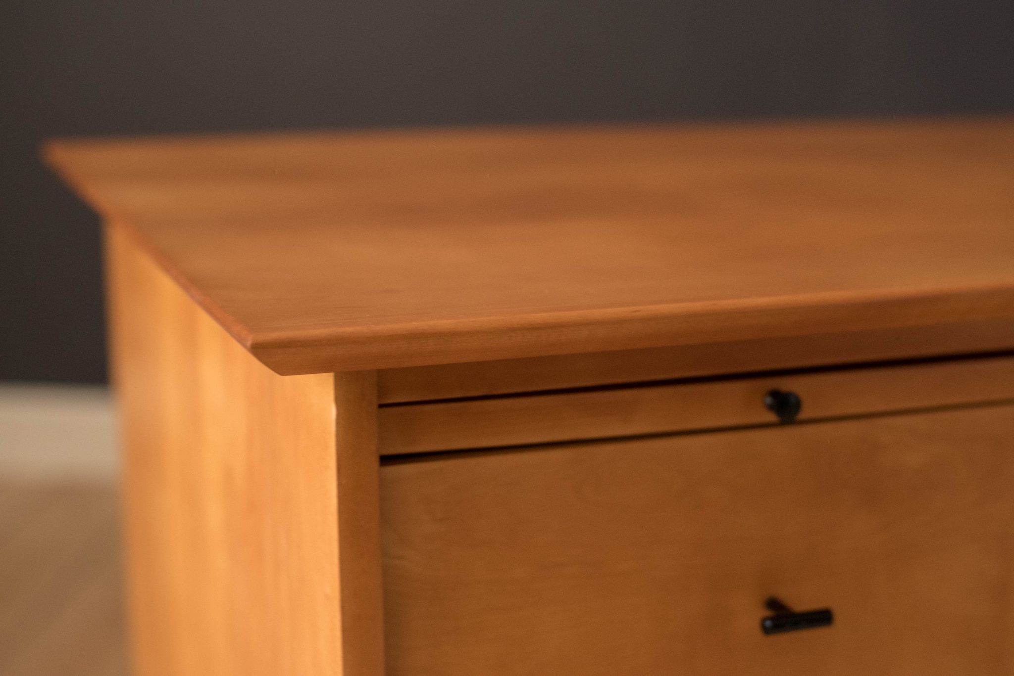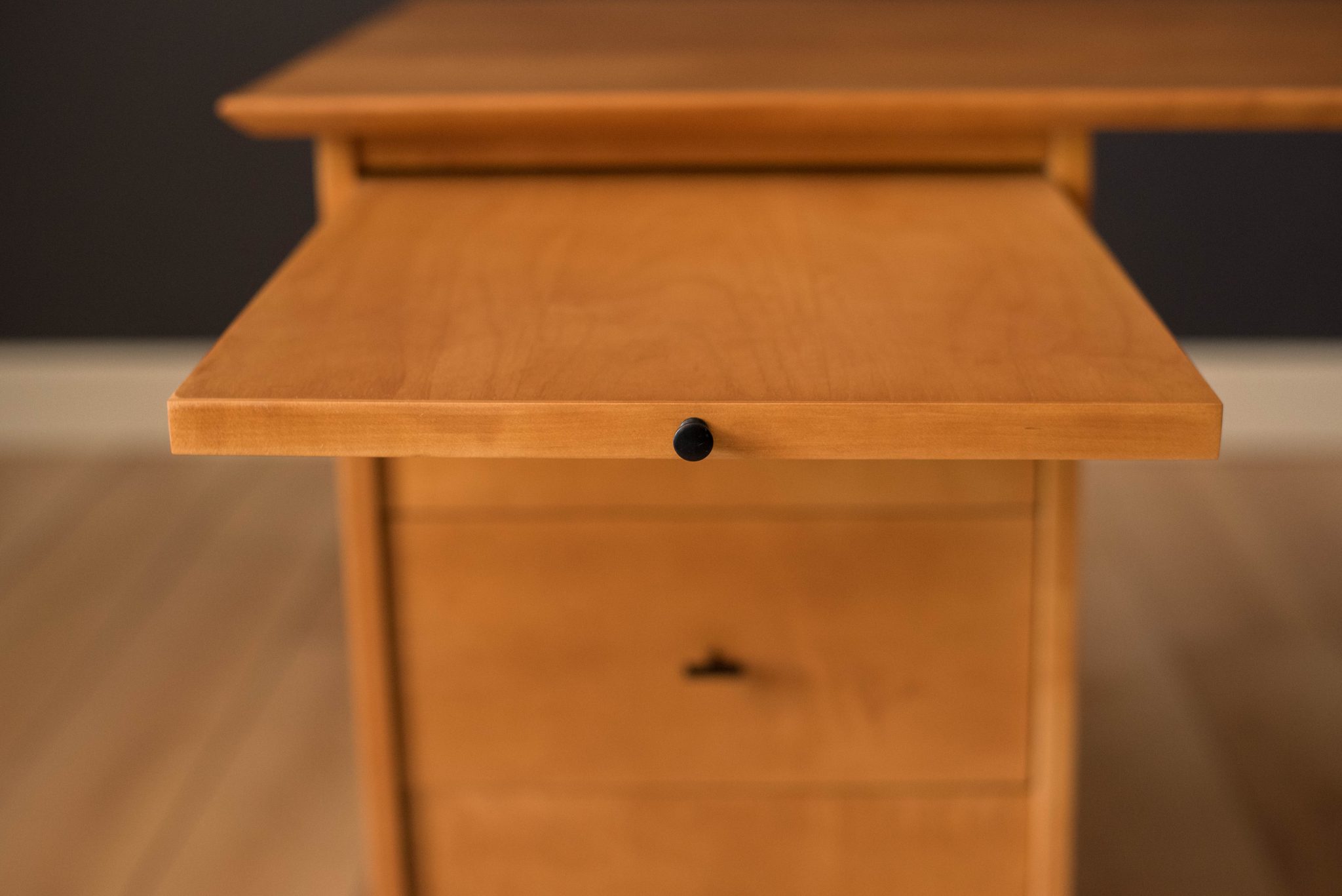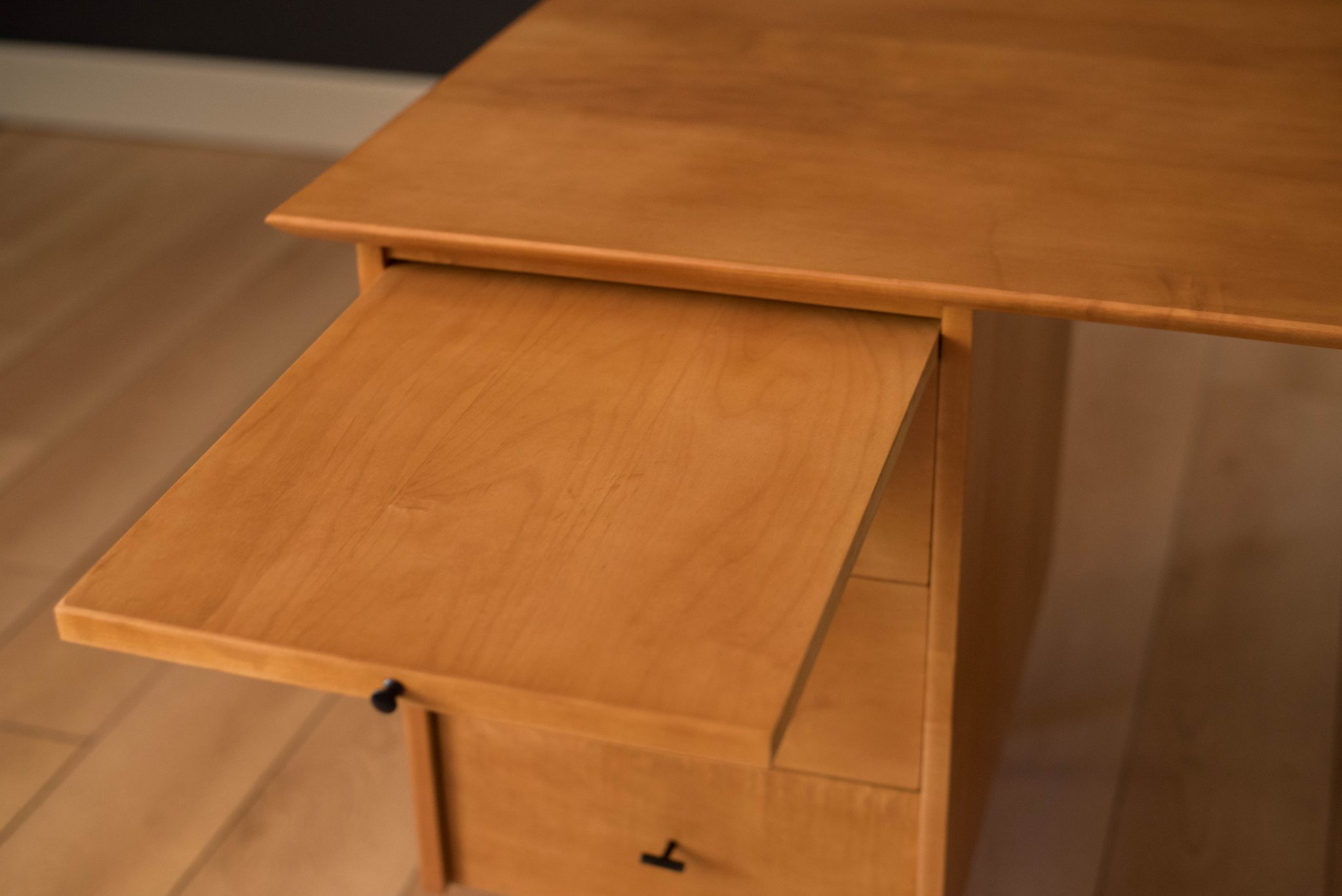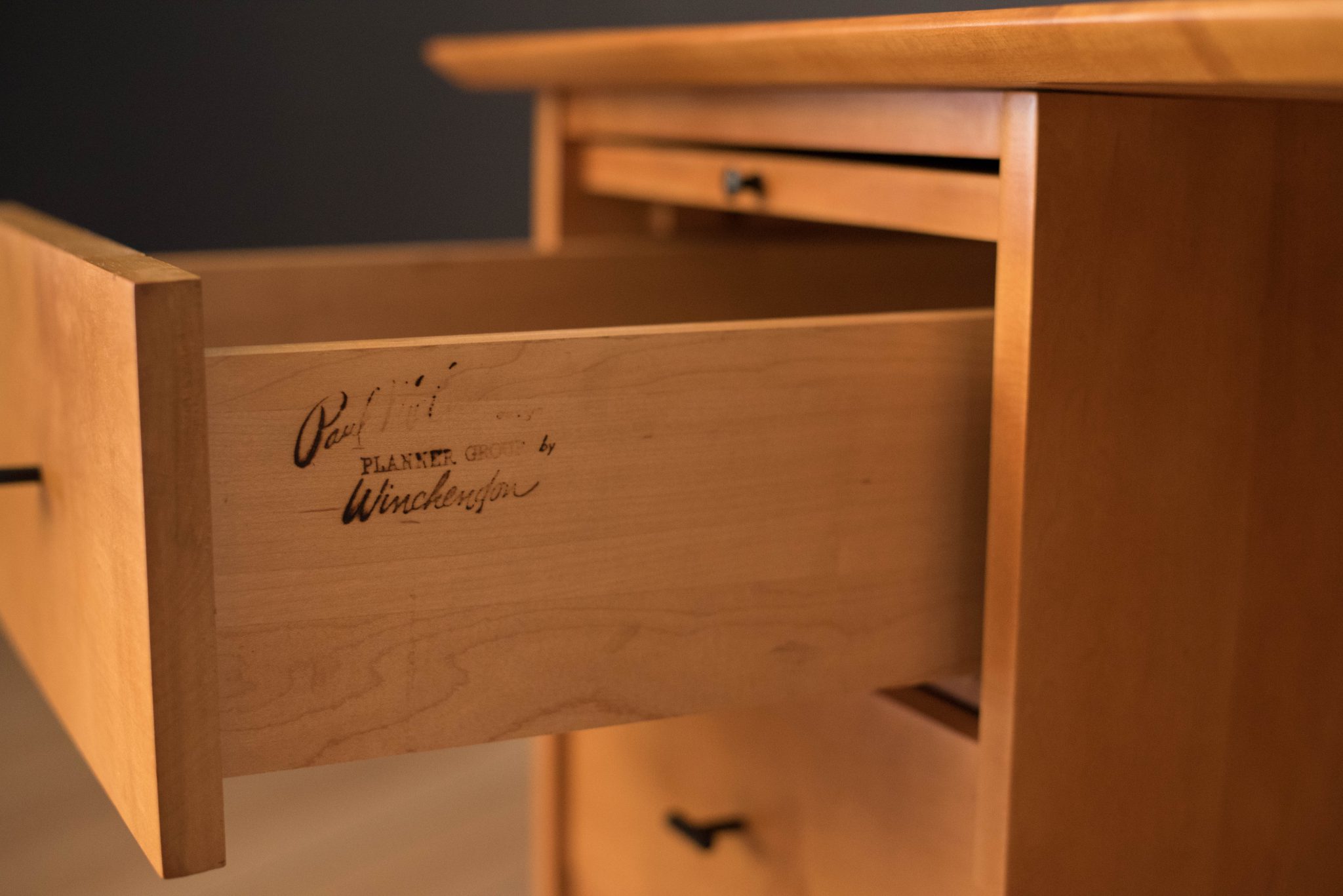 Mid-Century Modern Planner Group desk designed by Paul McCobb for Winchendon. This piece is constructed of solid birch with a natural finish. Offers plenty of storage space equipped with five drawers including a filing cabinet accessorized with black T-pulls. Features an additional slide out writing surface and is finished on the backside.