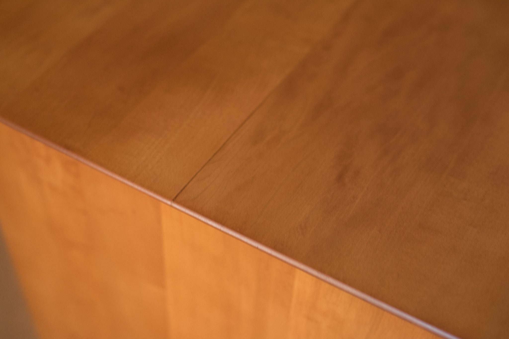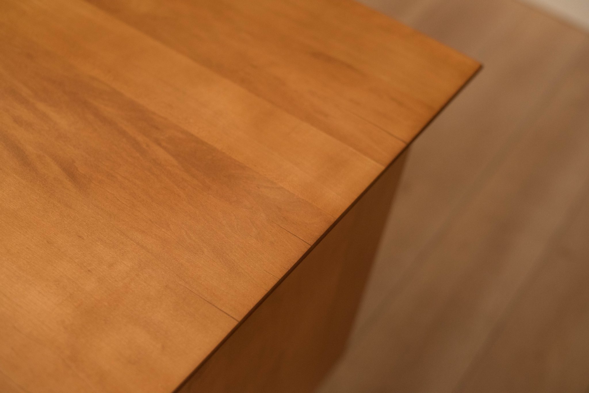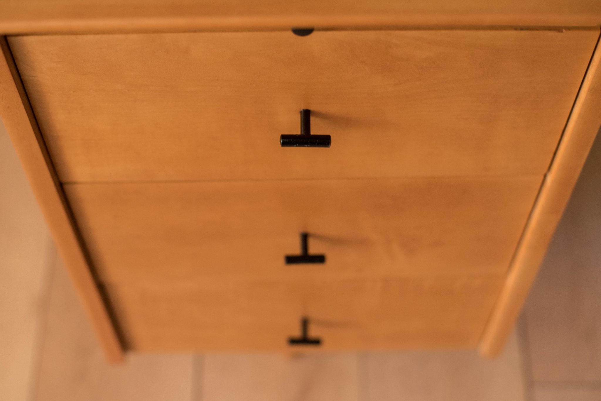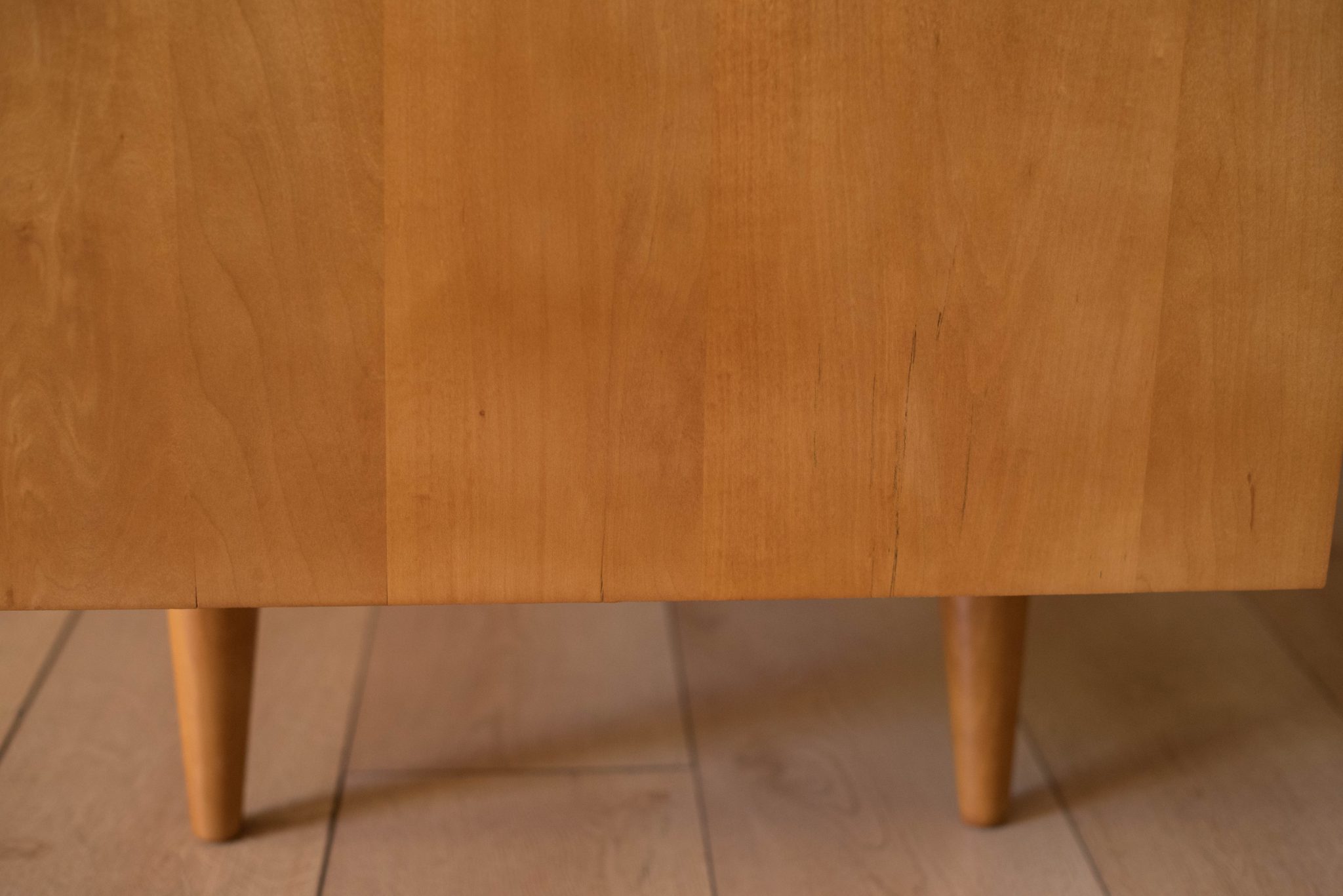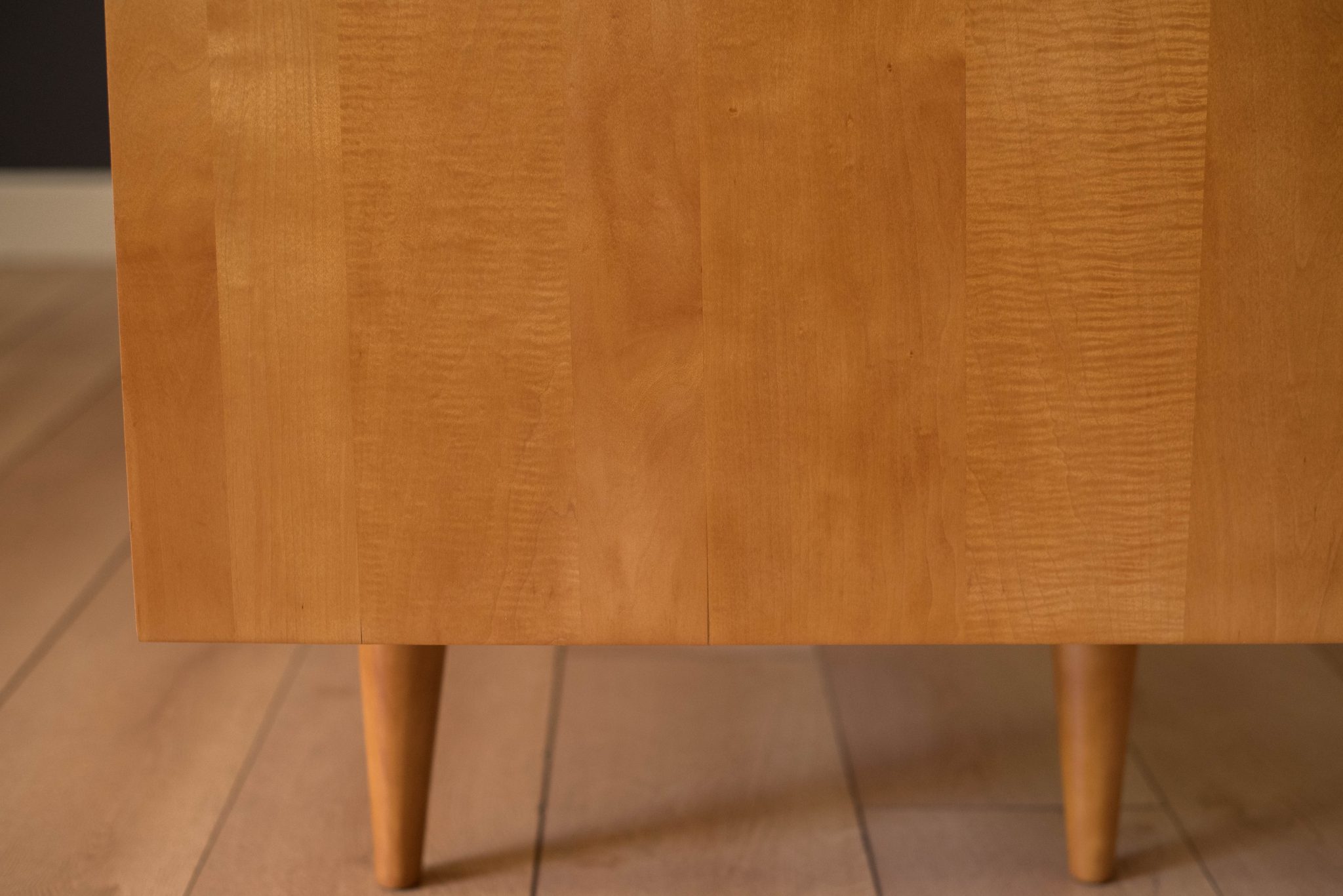 Mid-Century Modern Planner Group desk designed by Paul McCobb for Winchendon. This piece is constructed of solid birch with a natural finish. Offers plenty of storage space equipped with five drawers including a filing cabinet accessorized with black T-pulls. Features an additional slide out writing surface and is finished on the backside.
