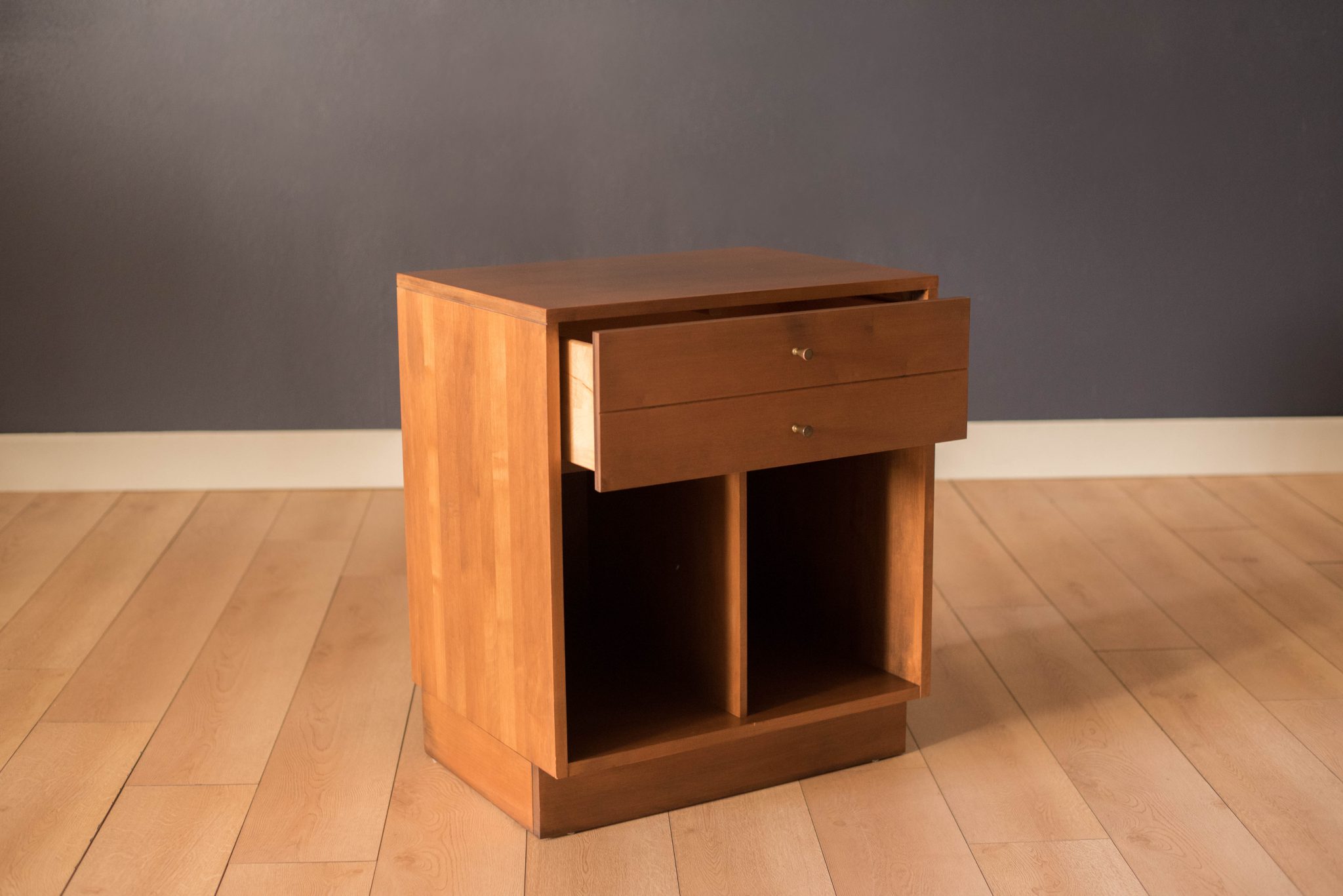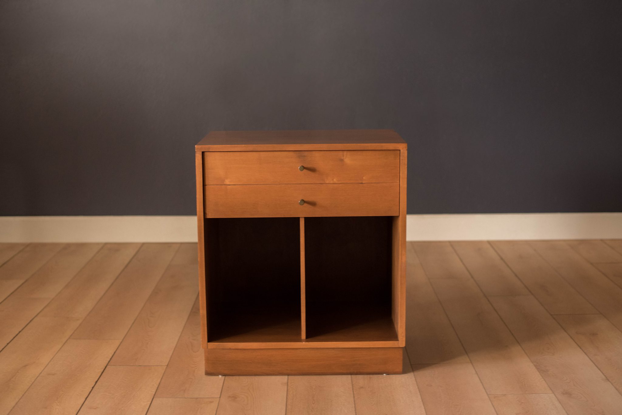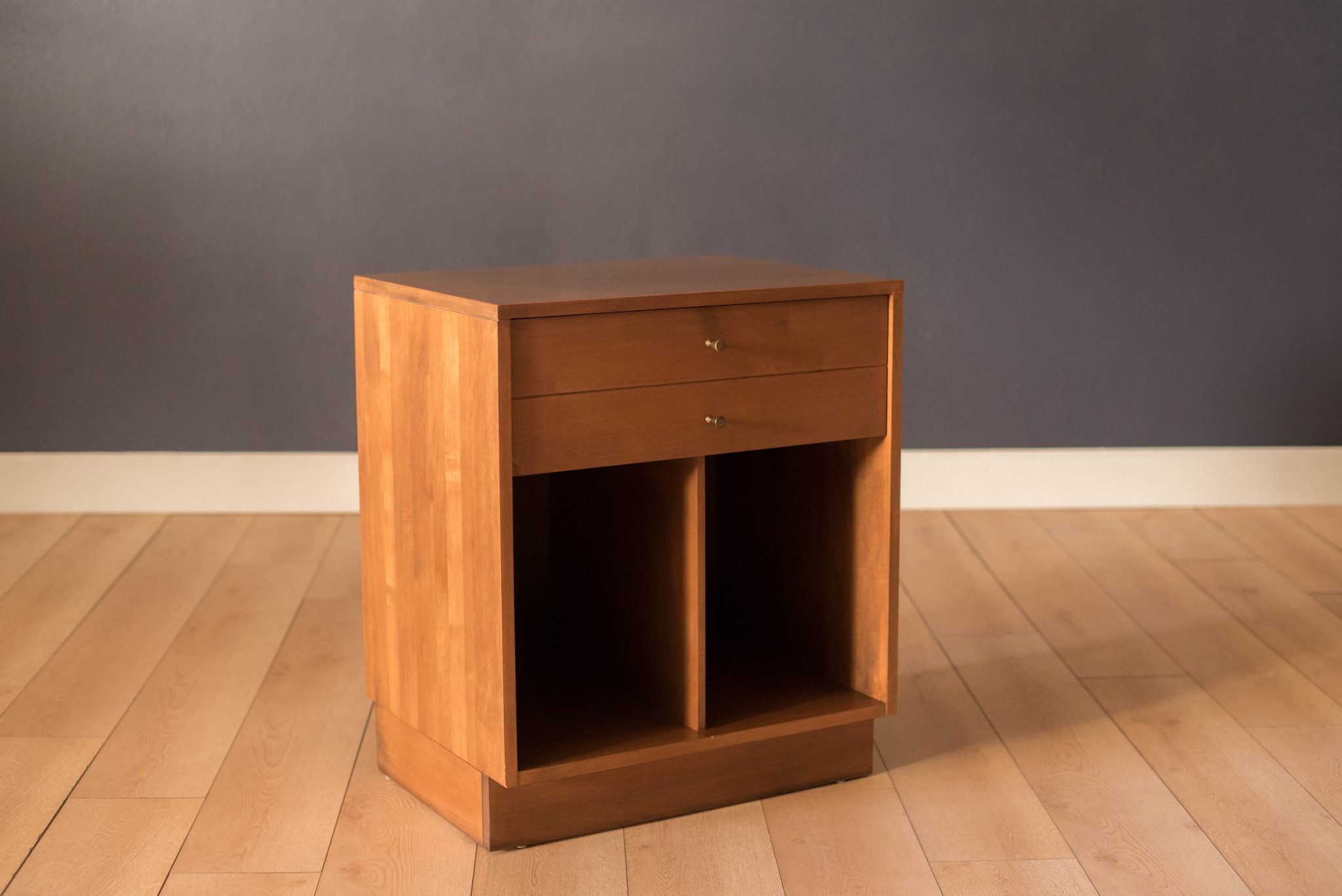 Vintage Planner Group nightstand designed by Paul McCobb for Winchendon Furniture Company. This piece is constructed of solid planked maple wood including one deep drawer fitted with signature brass conical pulls. Originally intended to hold LP’s for record storage, this cabinet can also function as a bedside table or living room side table.