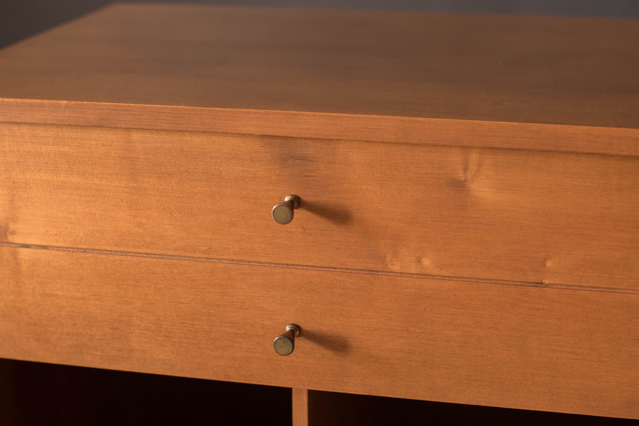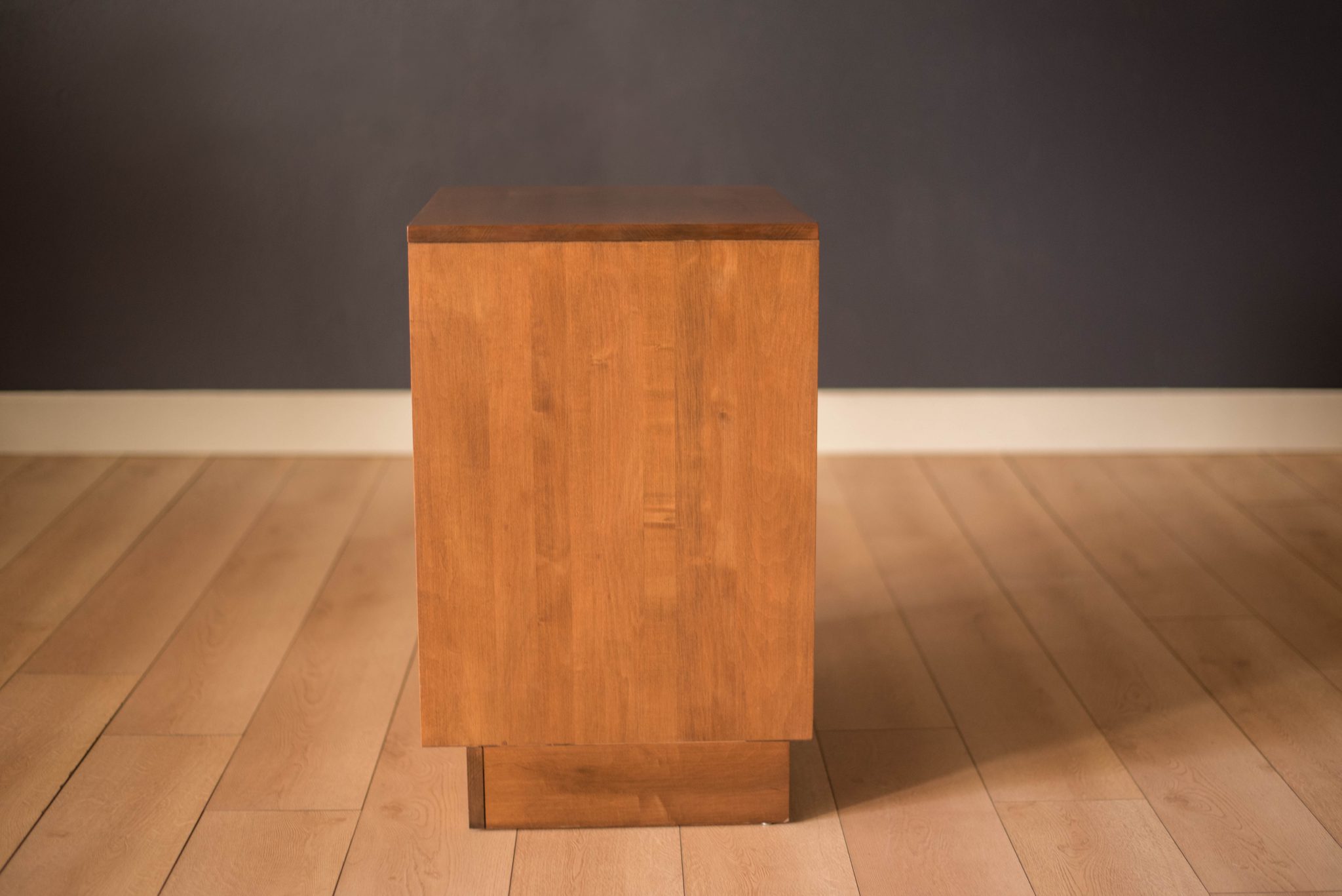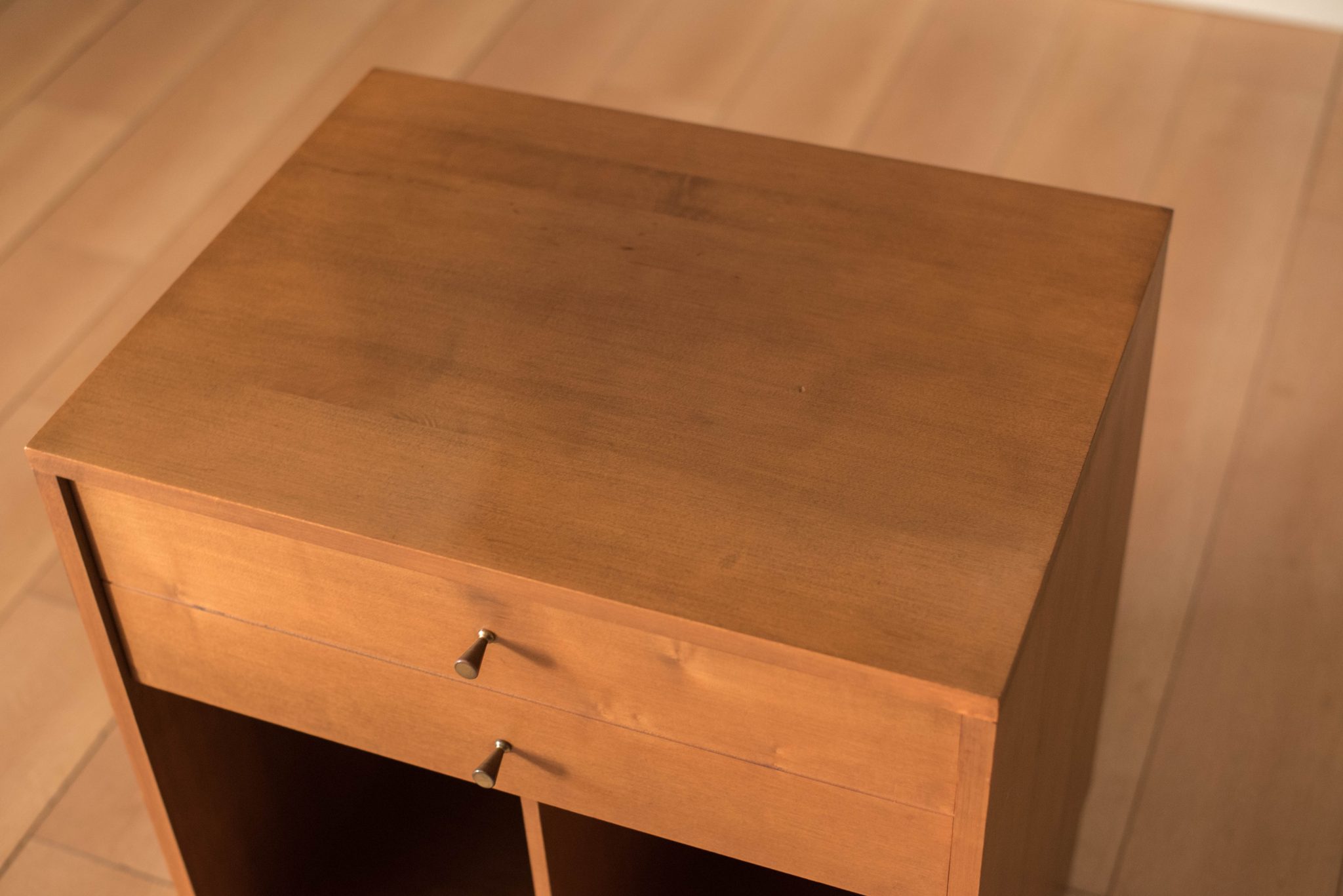 Vintage Planner Group nightstand designed by Paul McCobb for Winchendon Furniture Company. This piece is constructed of solid planked maple wood including one deep drawer fitted with signature brass conical pulls. Originally intended to hold LP’s for record storage, this cabinet can also function as a bedside table or living room side table.