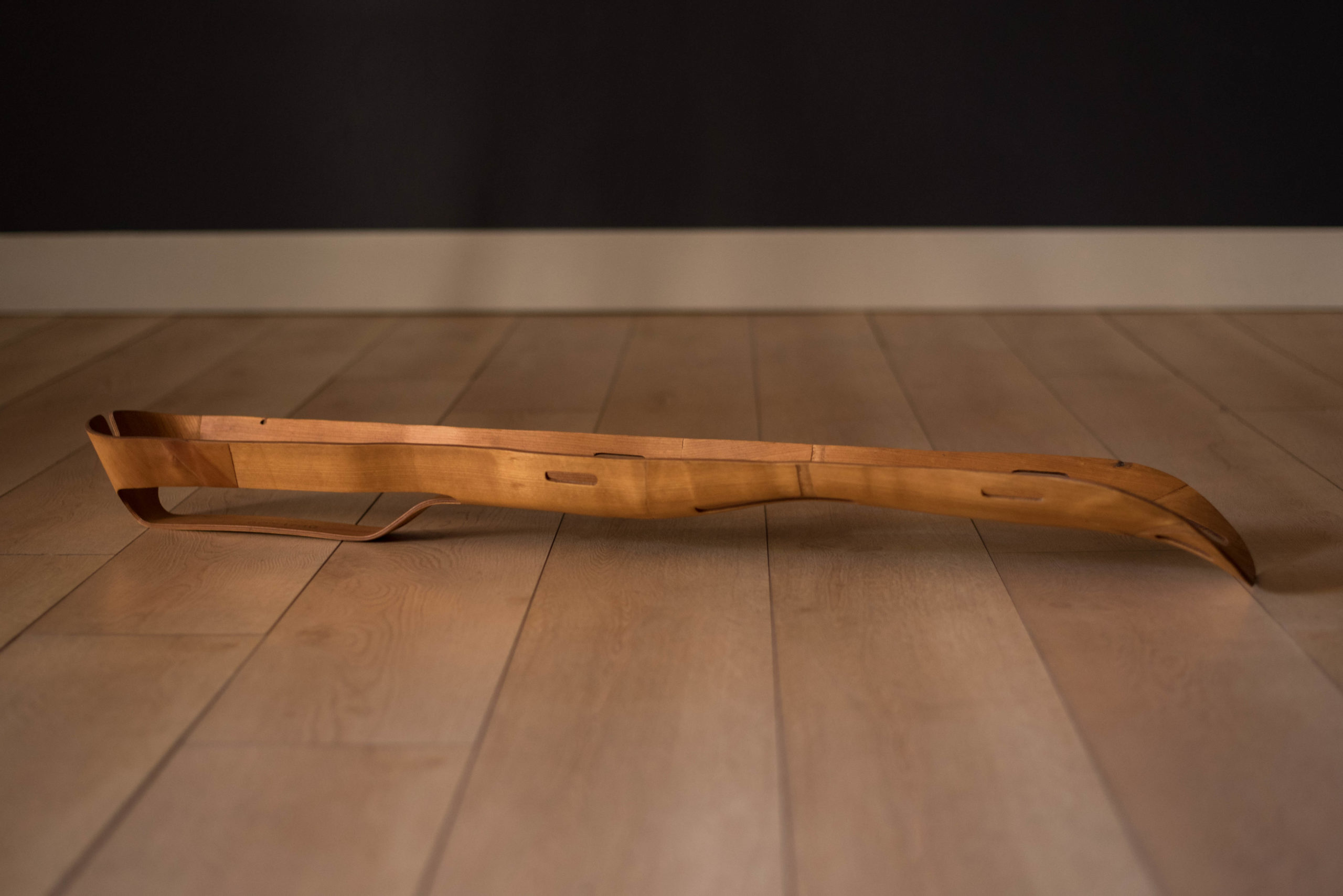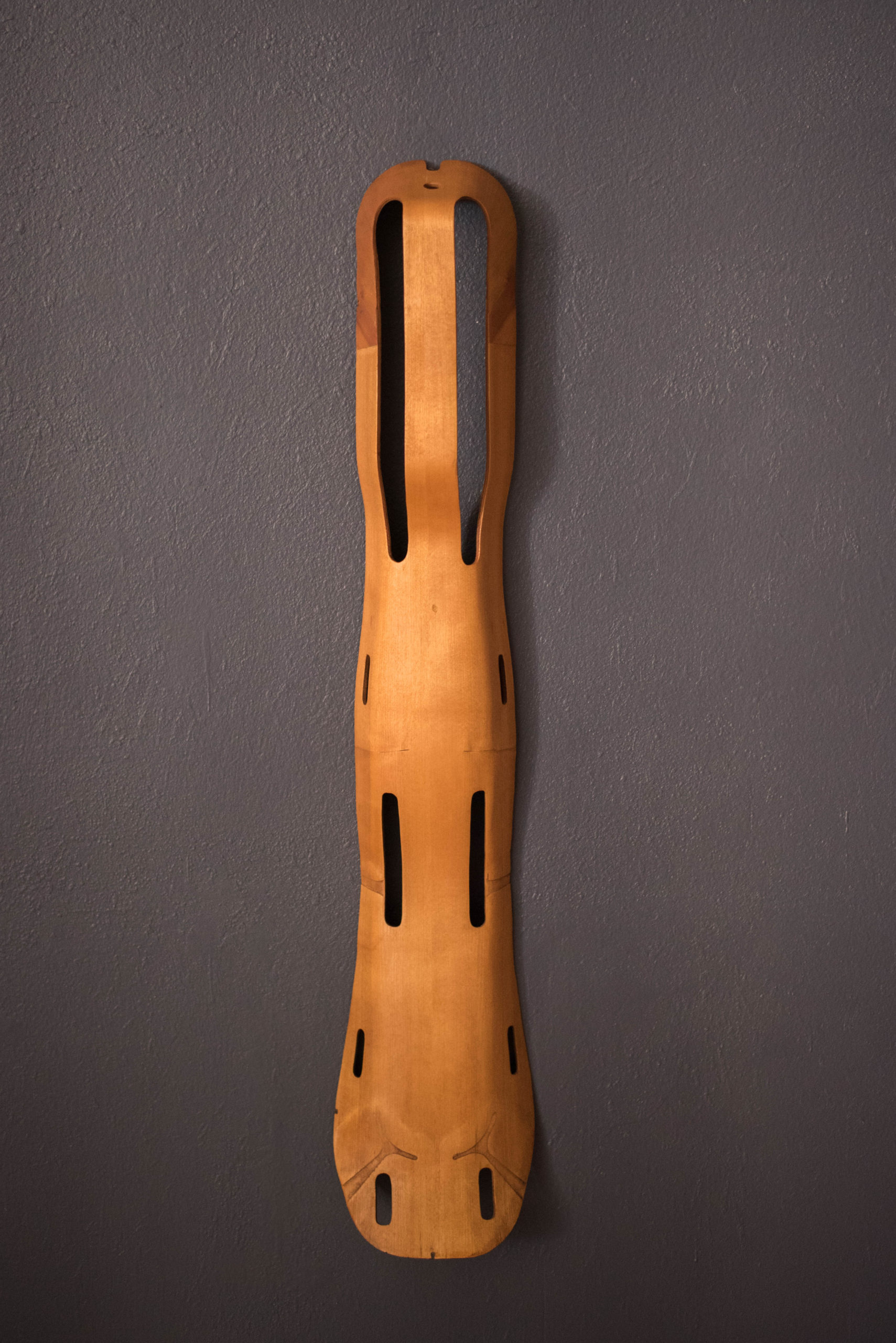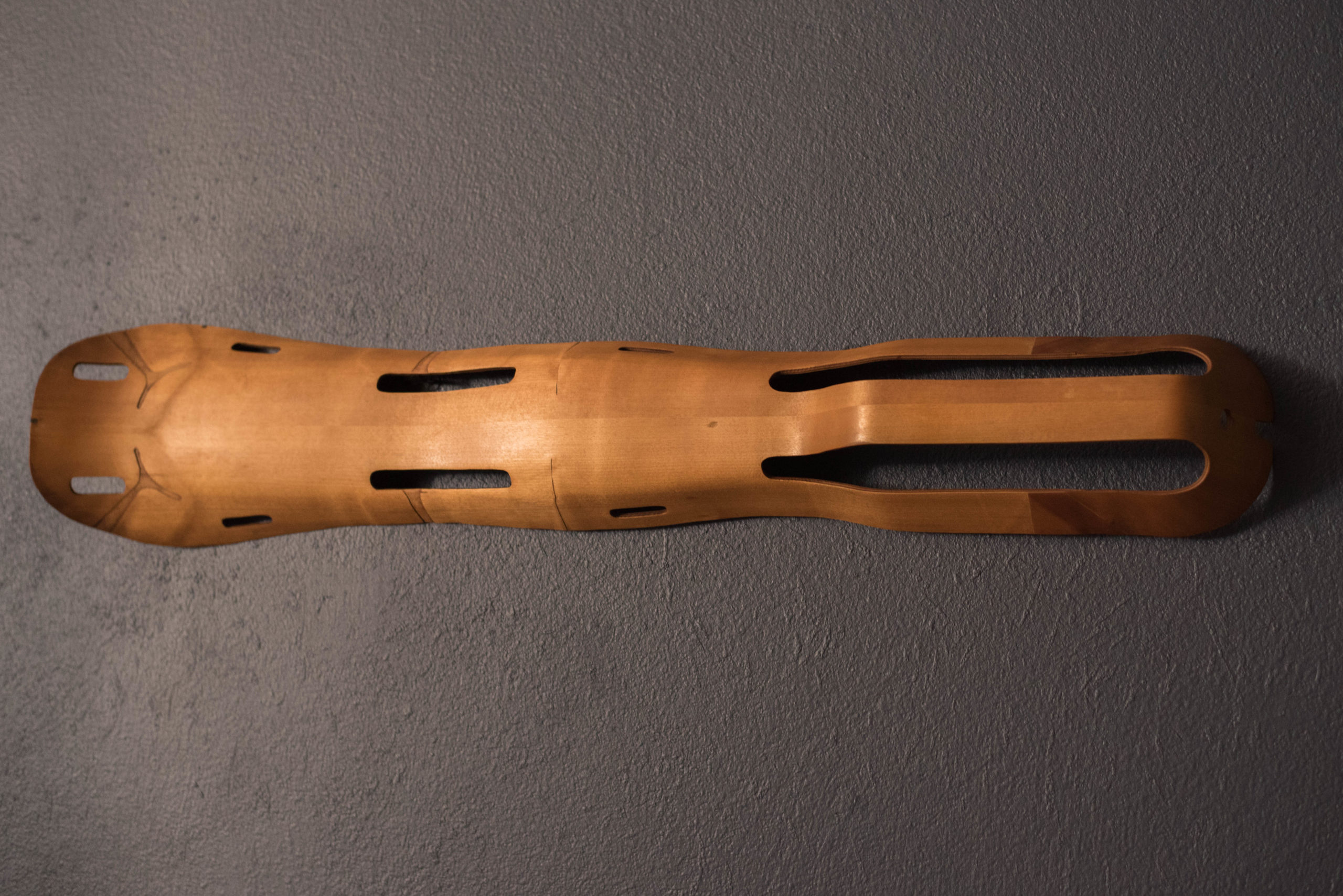 Mid century WWII leg splint created by Charles and Ray Eames for Evans Products Company, 1943. Specifically designed for the US Navy, this iconic piece of history is sculpturally crafted in one piece using molded plywood and birch material. Marked model no. S2-1790. Makes for an eye catching wall art sculpture that can be mounted vertically or horizontally.